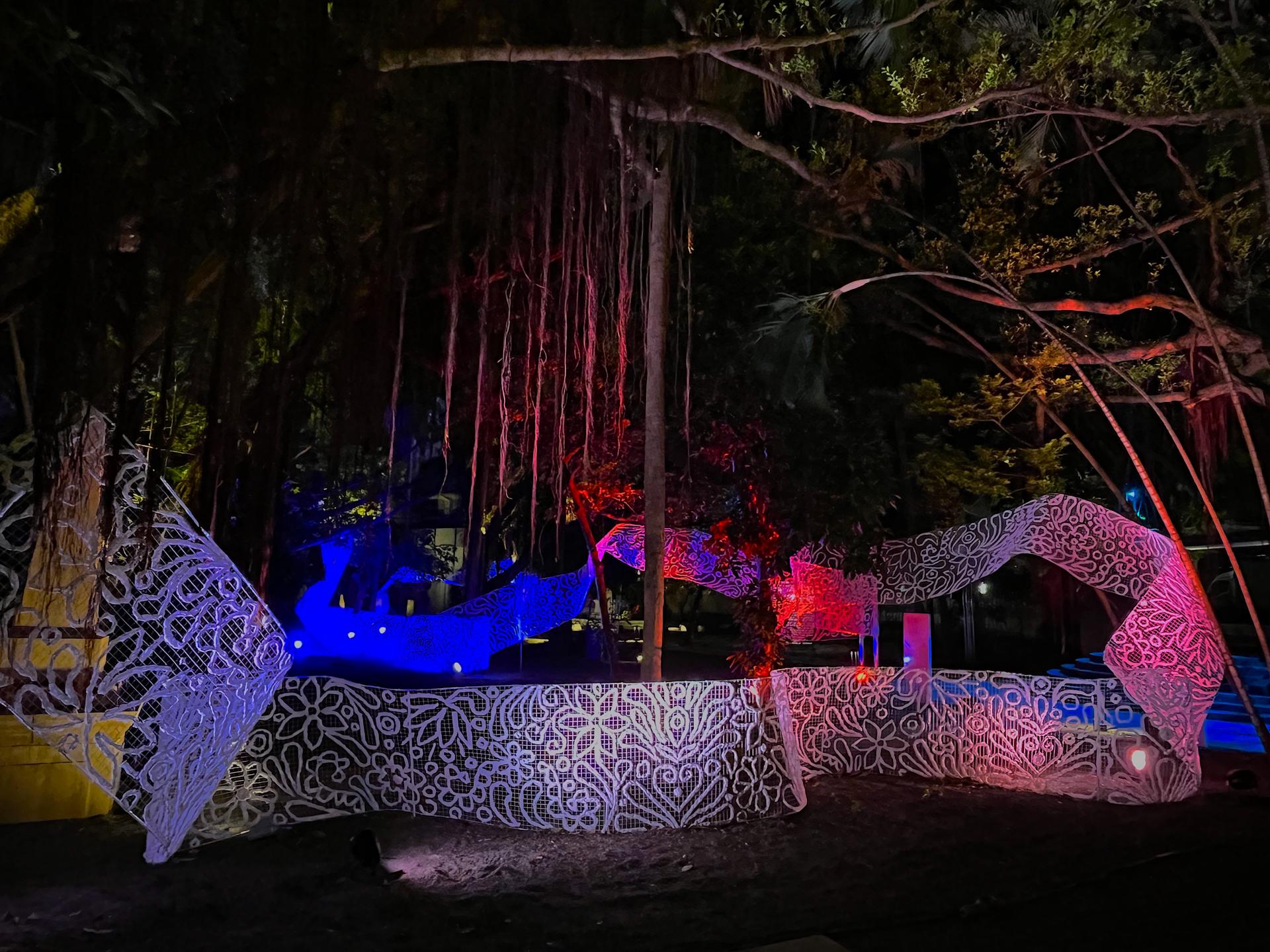 At the same time, we also found that since the 18th and early 19th centuries, French soldiers often carried lace-decorated fabrics into the battlefield. The most popular of which are "poignets en dentelle" and "collier en dentelle". Some of these delicate lace cloths are precious keepsakes left by their lovers or wives. Therefore, we create woven decorations like this into large outdoor artworks that are 75 meters long, using the flow of light to present the rhythm and life energy of these patterns.
