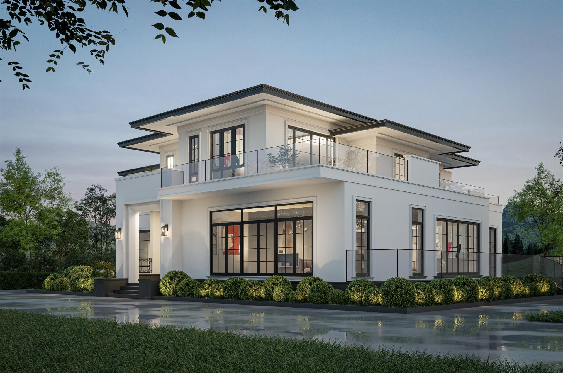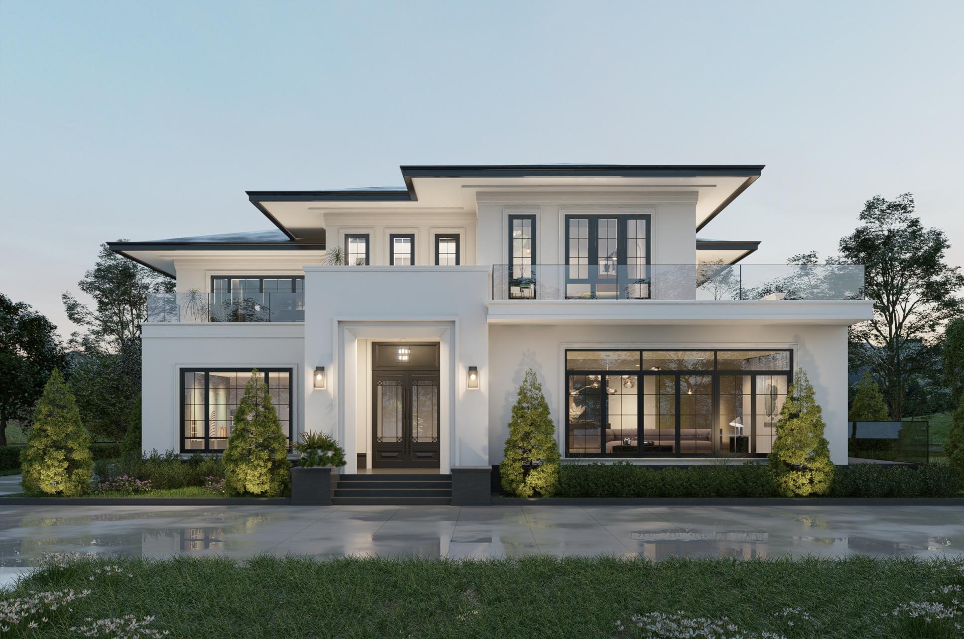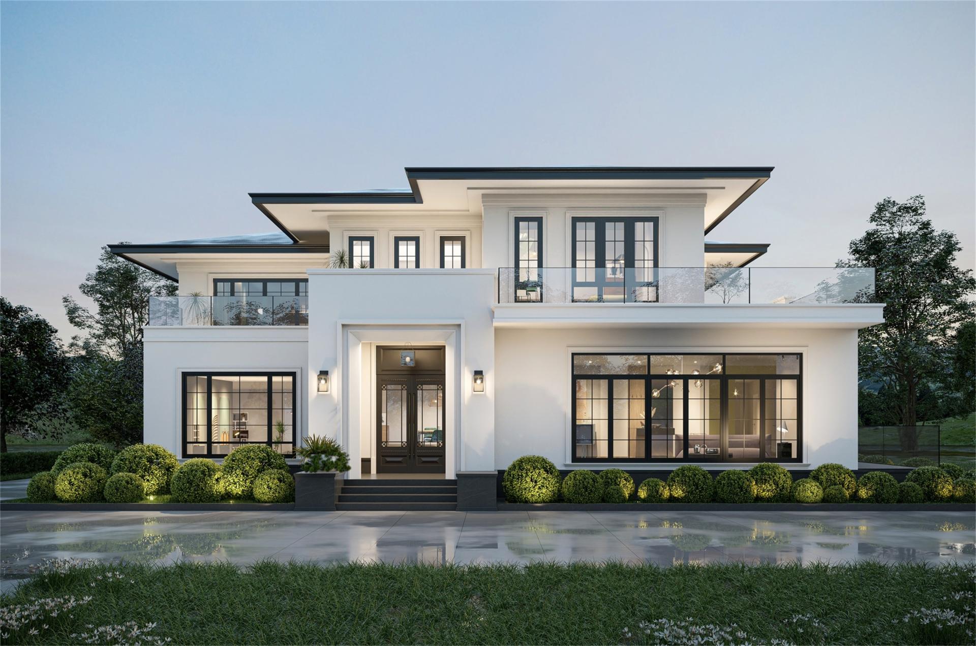 The facade, adorned with pure white paint, is accentuated by clean geometric lines and large lattice windows. This combination redefines the building's modern aesthetic, establishing a clear visual hierarchy and an overall atmospheric quality, and emphasizing the impact of clean lines and the interplay of light and shadow.