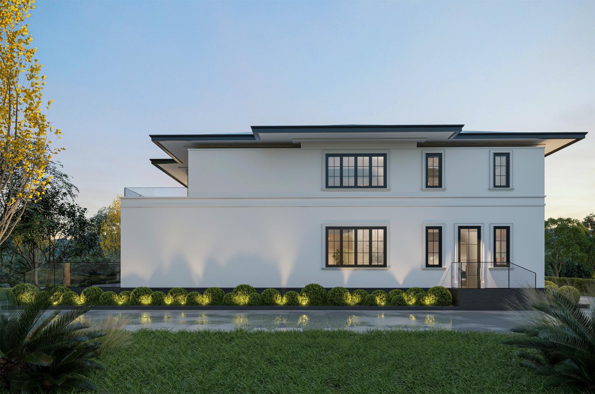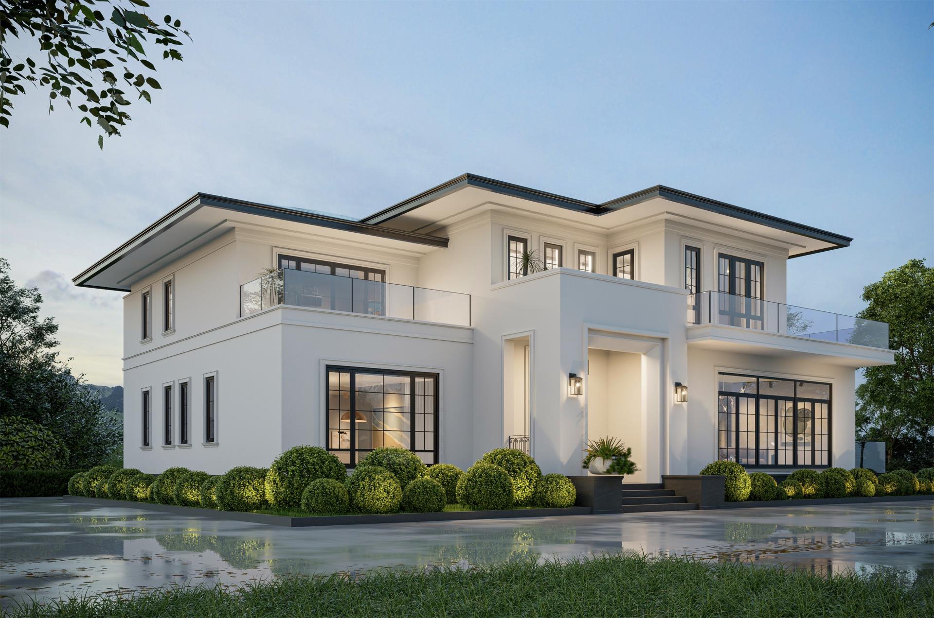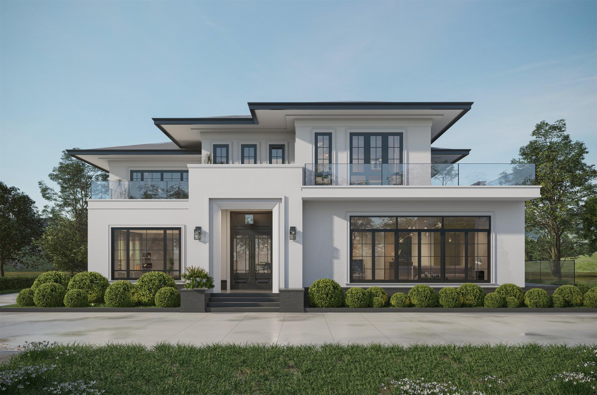 The facade, adorned with pure white paint, is accentuated by clean geometric lines and large lattice windows. This combination redefines the building's modern aesthetic, establishing a clear visual hierarchy and an overall atmospheric quality, and emphasizing the impact of clean lines and the interplay of light and shadow.