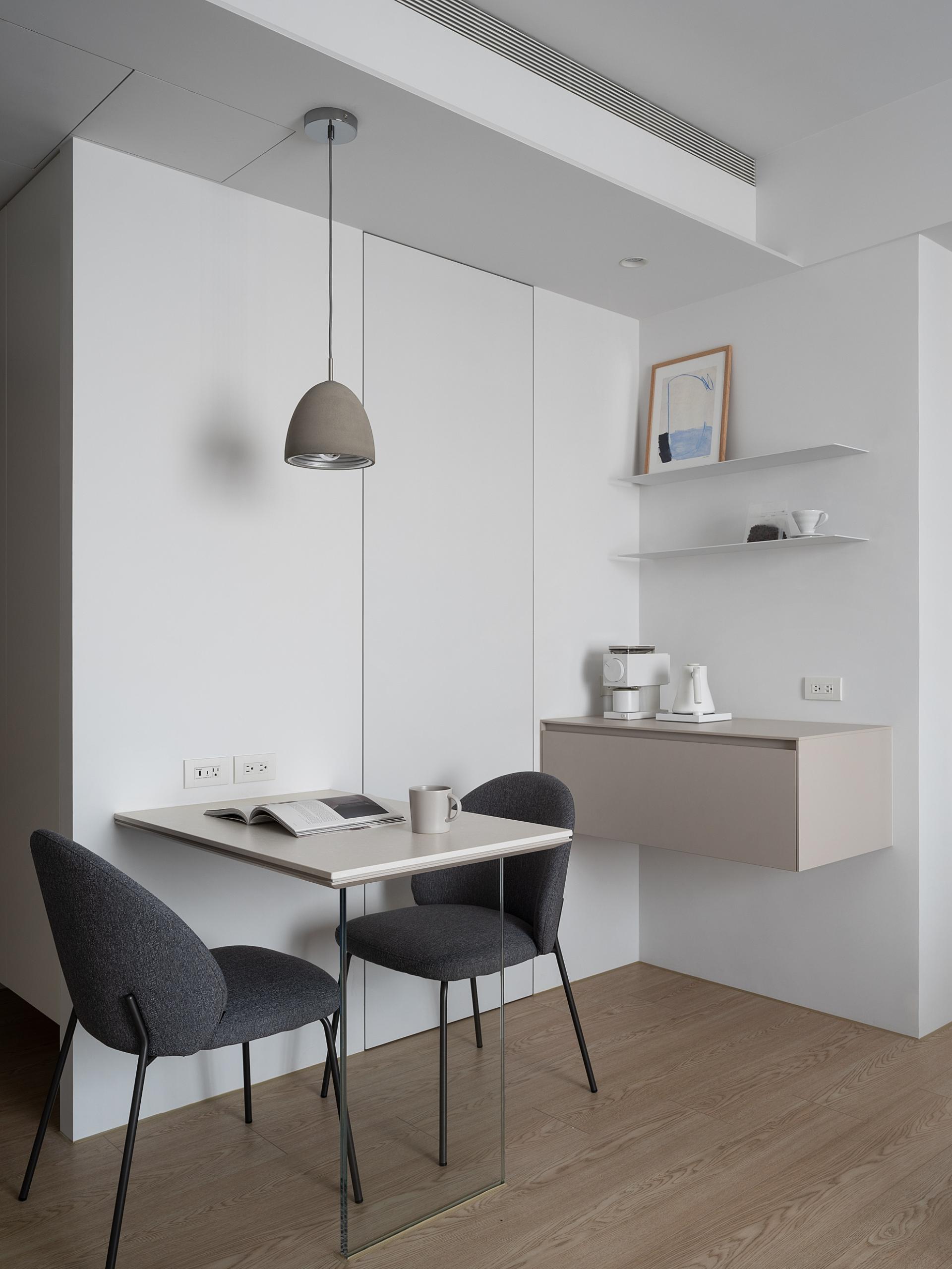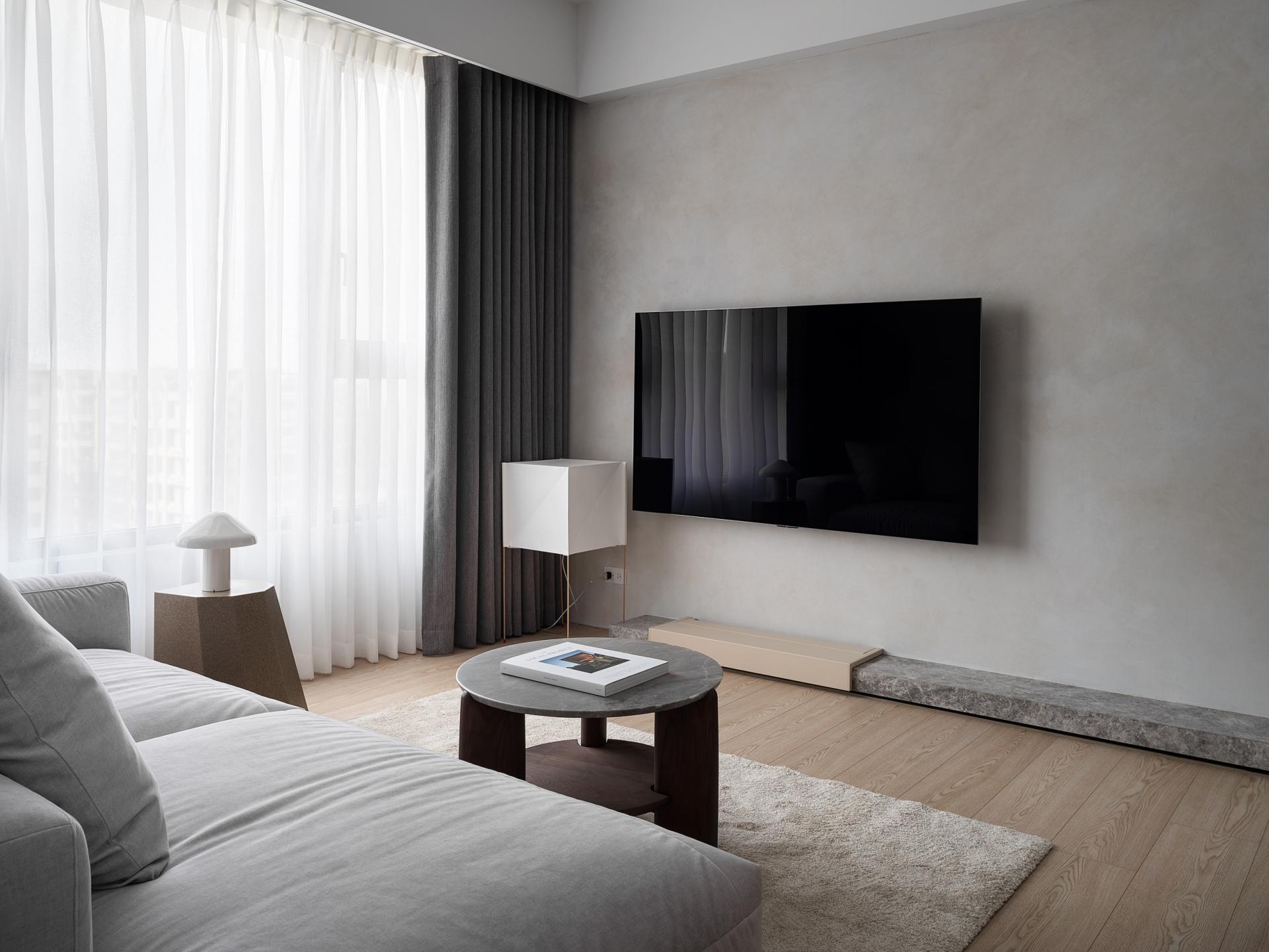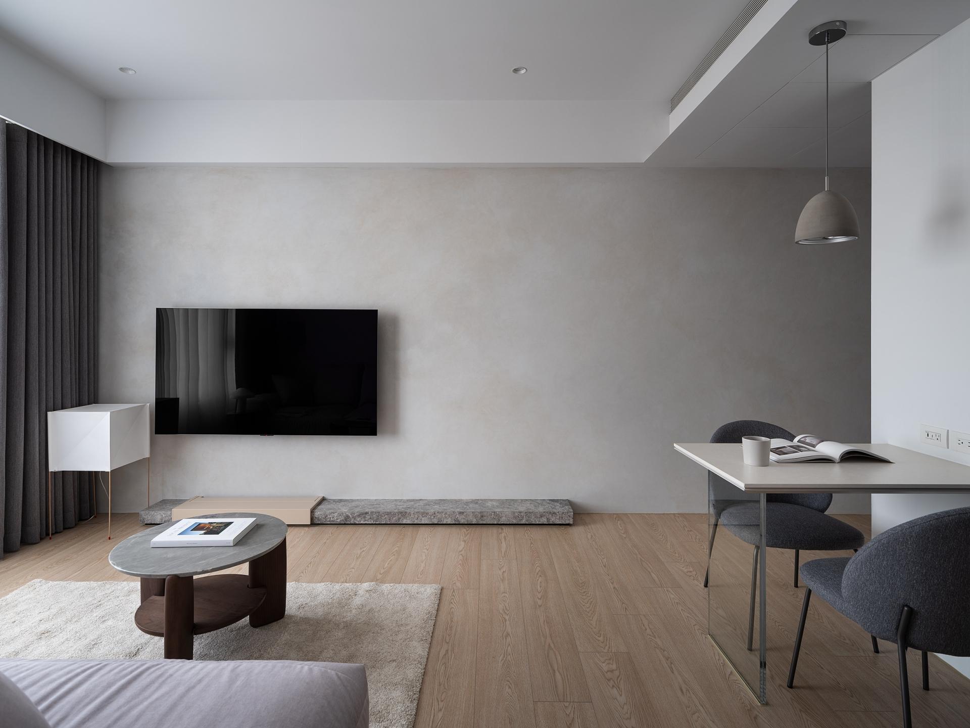 客餐廳,電視牆採用特殊塗料延伸至玄關門片,視覺上拉大整體尺度,低矮的電視平台進一步增添空間的寬闊感。餐桌桌腳以透明玻璃打造,減少視覺阻隔,使空間顯得更加通透且輕盈。