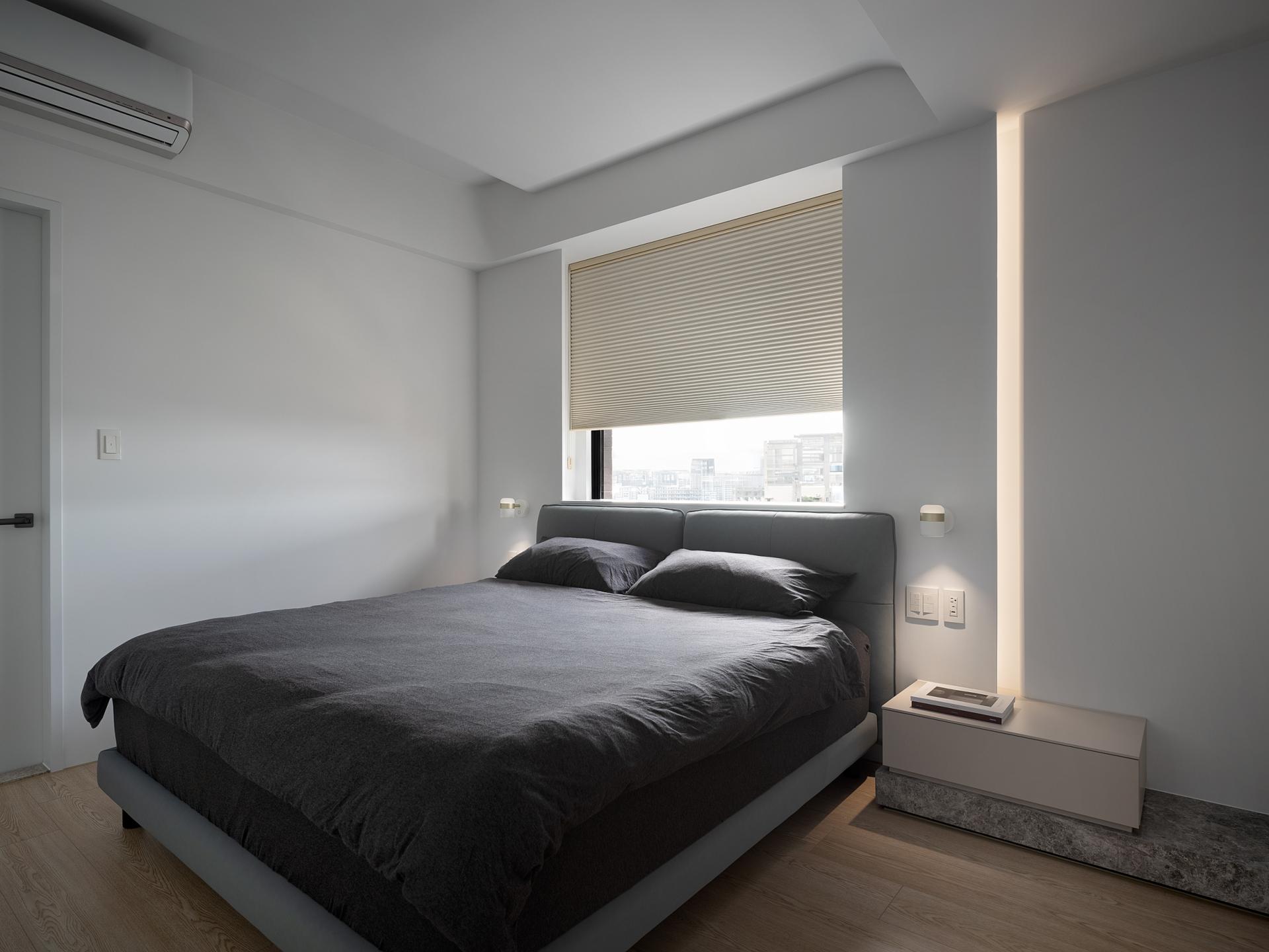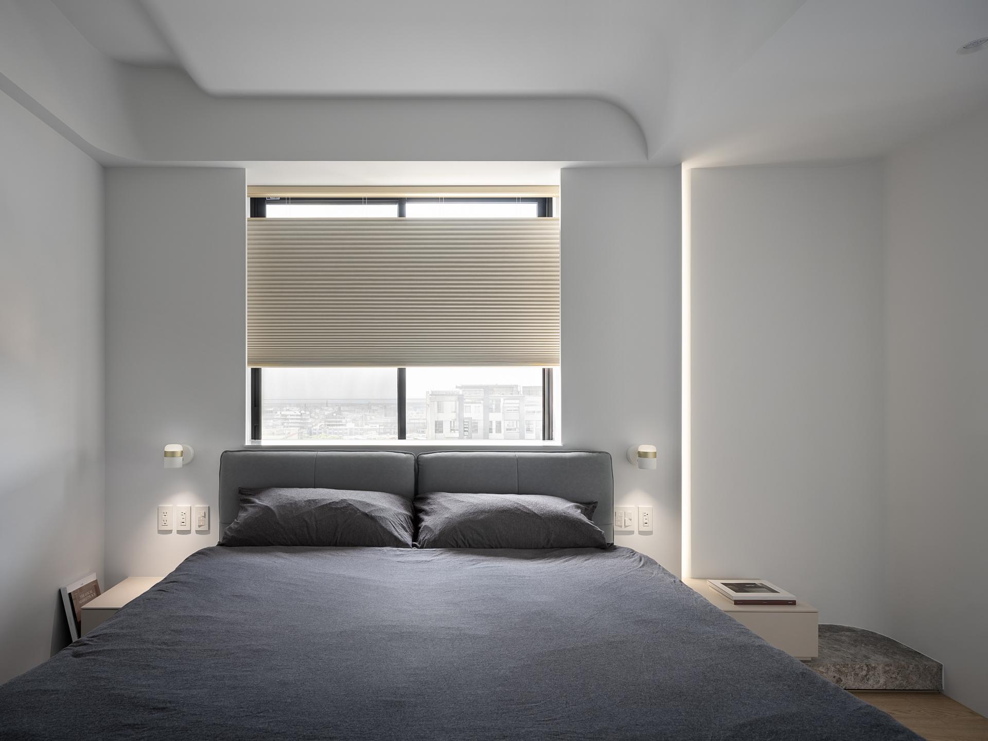 臥房中天花板與牆面的圓弧造型營造出柔和舒緩的氛圍,床頭牆面加了小巧思,如同翻開的書頁般的造型,垂直光源隱藏於其中,柔和的燈光自牆面泛出,不僅不刺眼,亦成為空間的靈魂點綴。