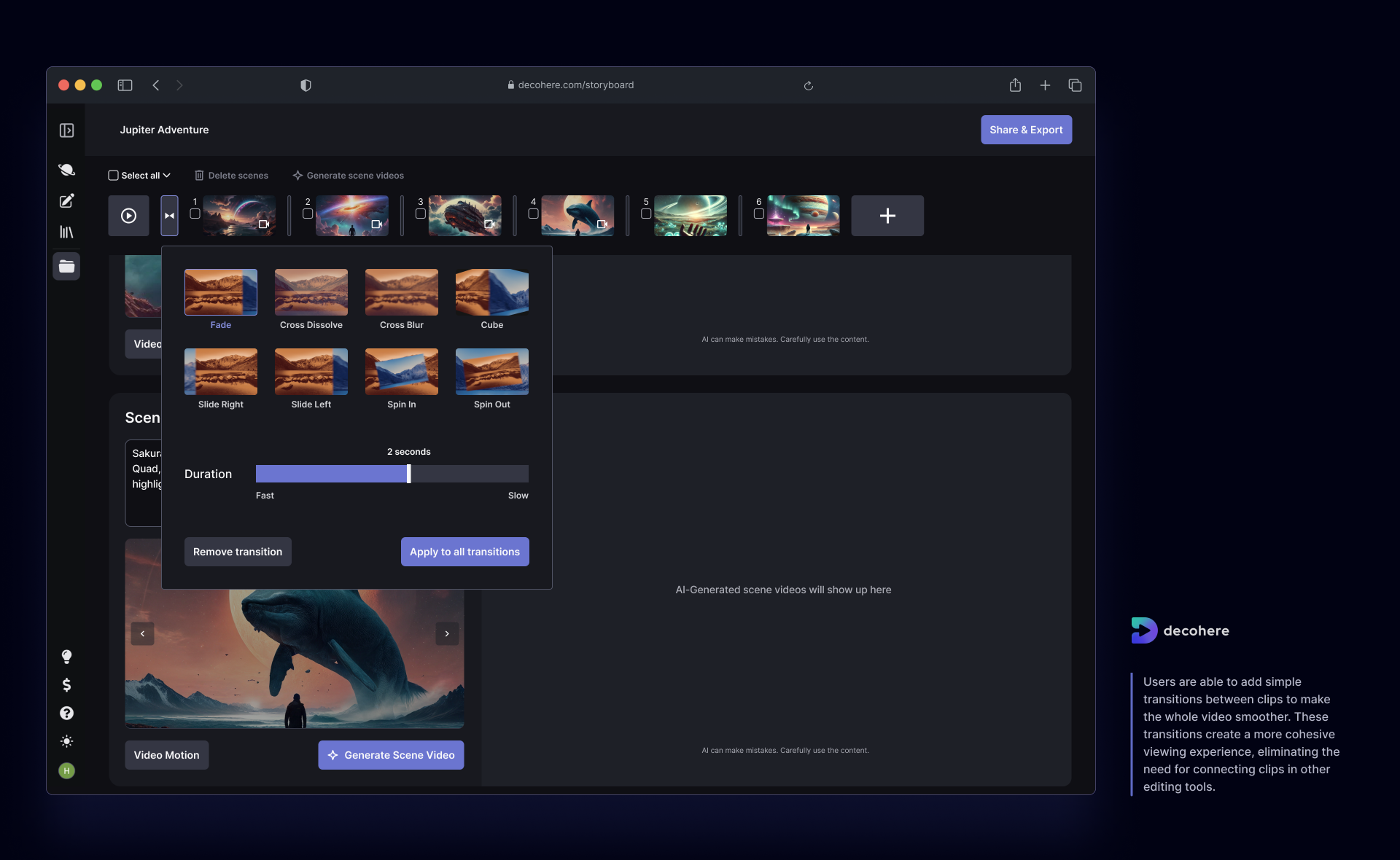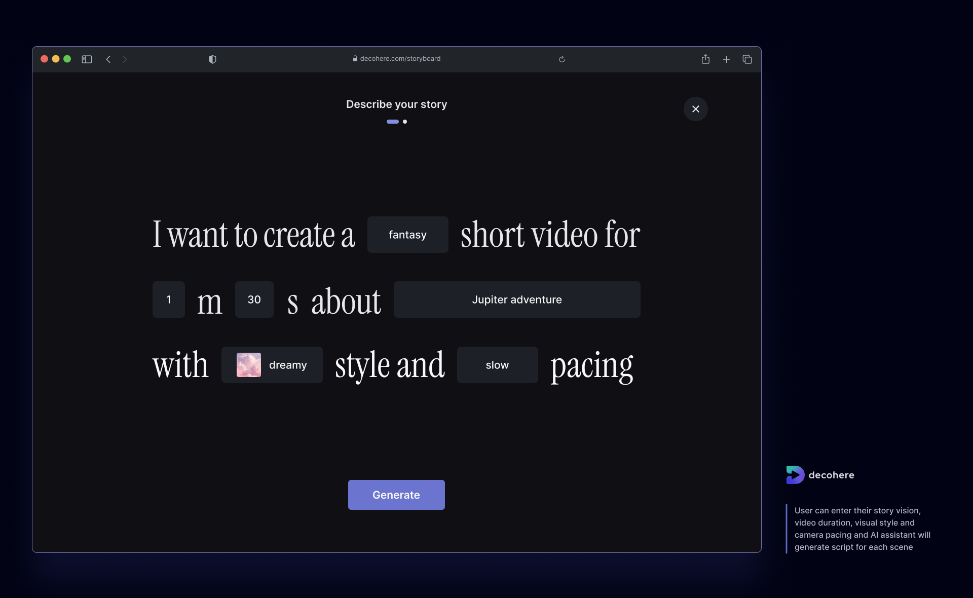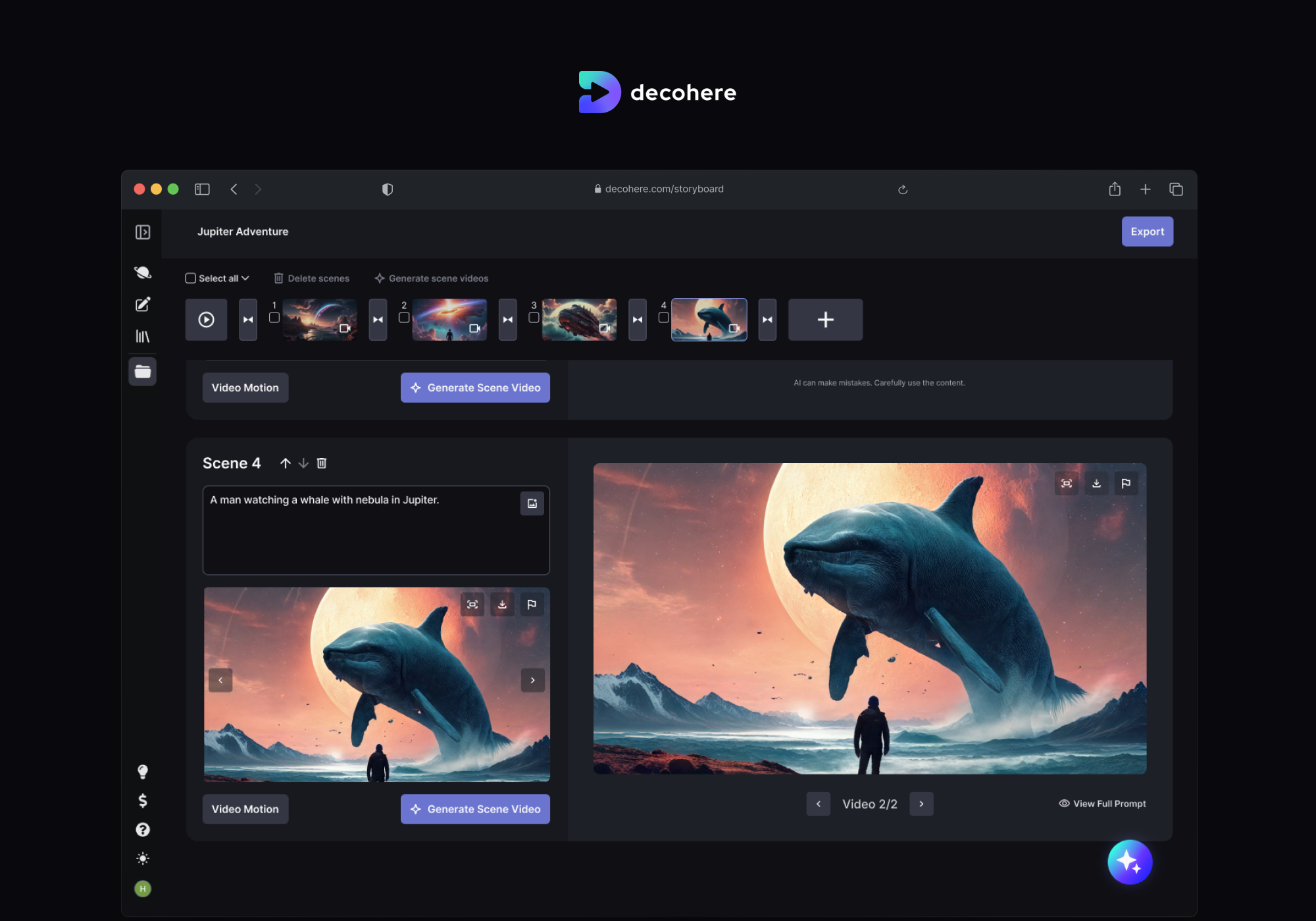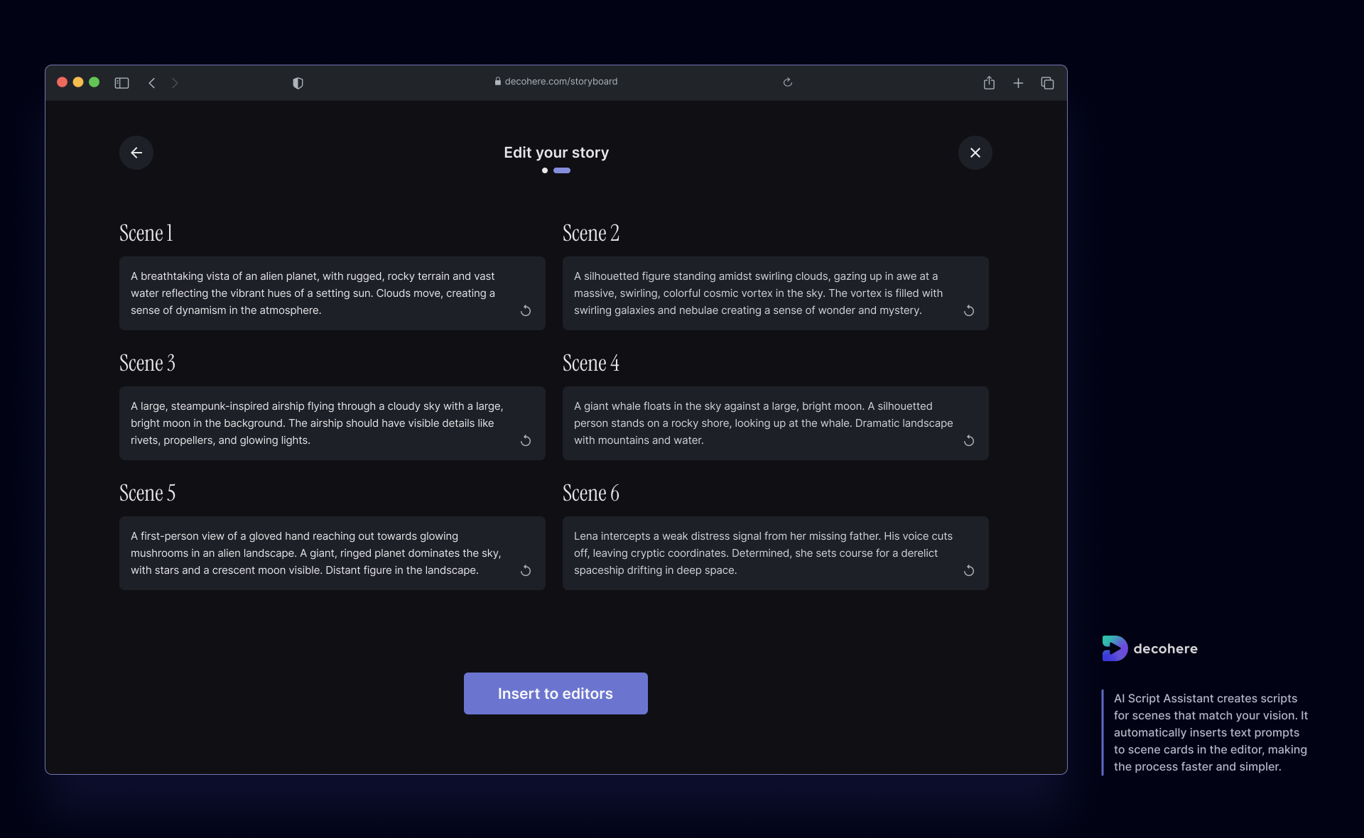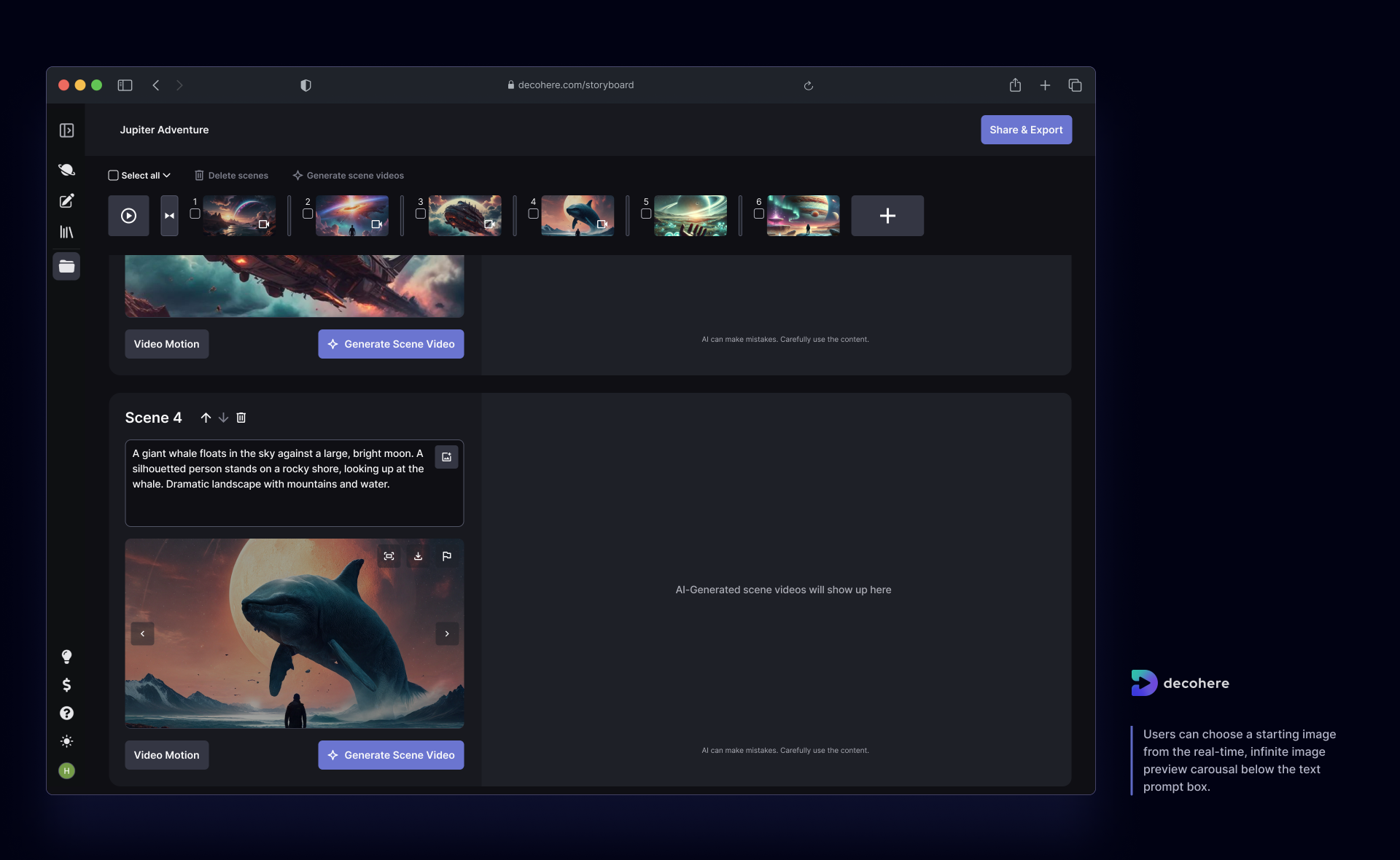 A key design innovation was the AI Script Assistant which enhances the experience by offering contextual guidance on prompt refinement, helping users craft more effective inputs for scene generation. By integrating smart suggestions and real-time feedback, this tool empowers creators to achieve higher-quality outputs with minimal trial and error.