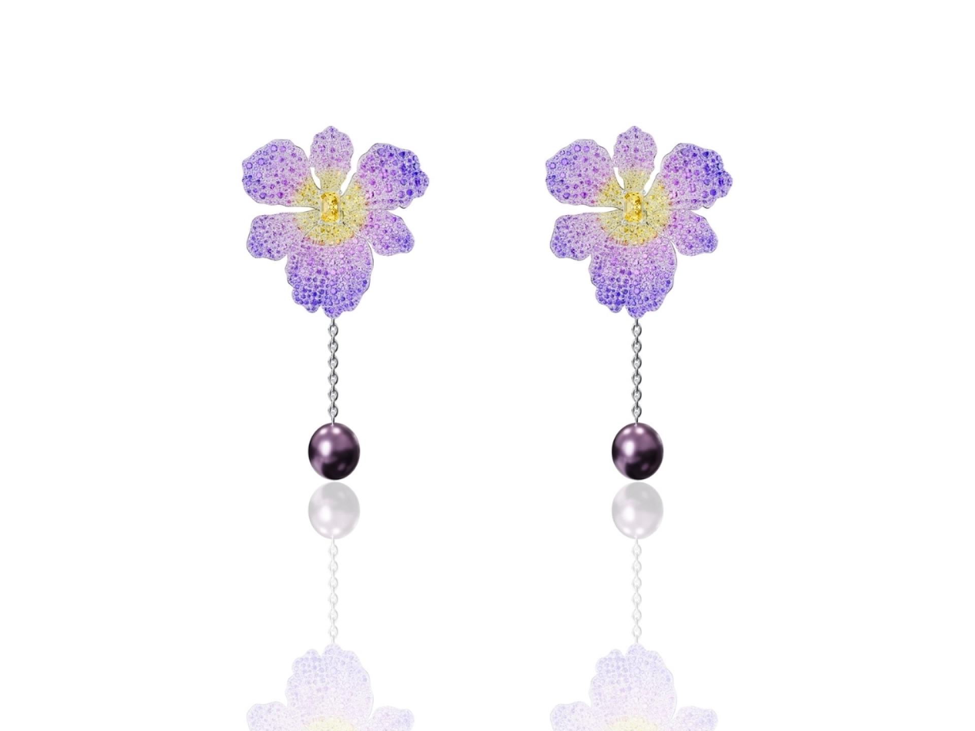 The earrings feature freshwater purple pearls as their centerpiece, framed by a dazzling mix of pavé-set gemstones in complementary hues. The interplay of colors and sizes creates a dynamic yet balanced design, reflecting the delicate complexity of the iris flower.
