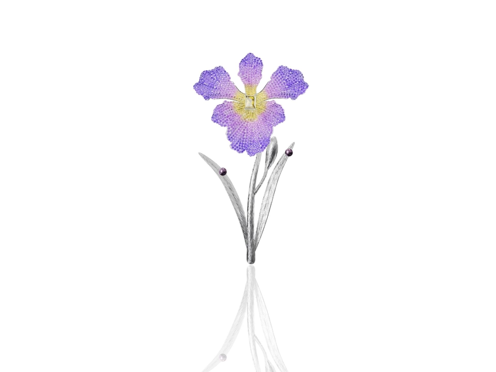 The brooch blends intricate platinum settings with a mix of pavé-set gemstones in deep purples, soft lilacs, and vivid yellows. The arrangement of the stones enhance the lifelike quality of the design, emphasizing the natural beauty and vibrancy of the iris.