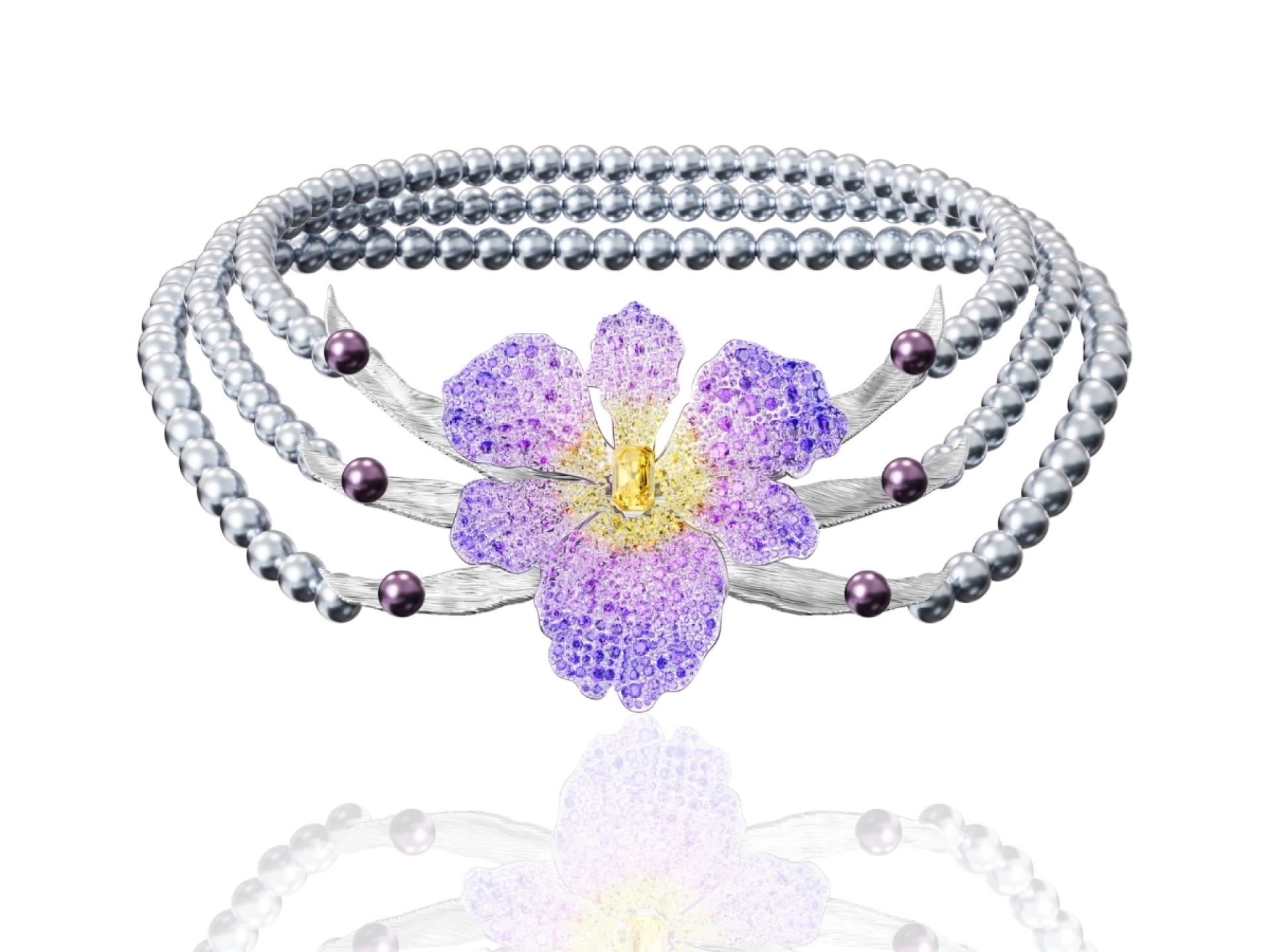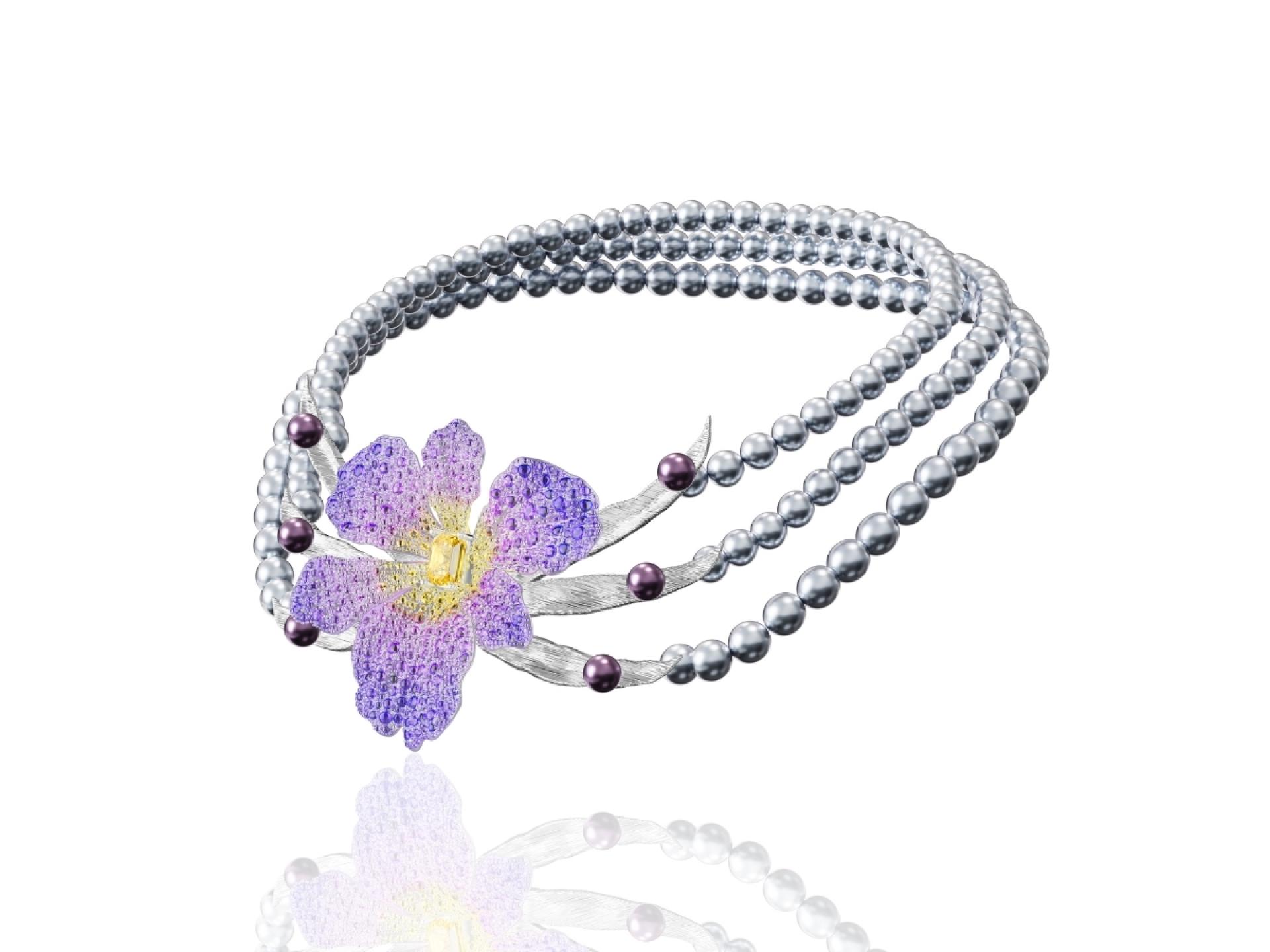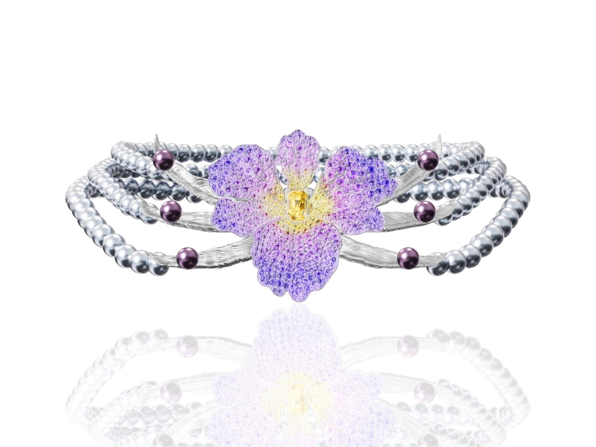 The necklace is adorned with luminous gray-white Tahitian pearls, exuding a soft radiance that anchors the design. The central section features colored gemstones in rich and delicate shades of purple and yellow, elegantly arranged in a pavé setting and accented with stones of varying sizes. This thoughtful composition mimics the organic texture of iris petals, adding depth and dimension to the piece. Complementing the central flower, six outstretched leaves crafted in intricate detail provide a striking contrast to the petals. Freshwater purple pearls placed on the leaves add an extra layer of charm and playfulness, enhancing the natural beauty of the design.