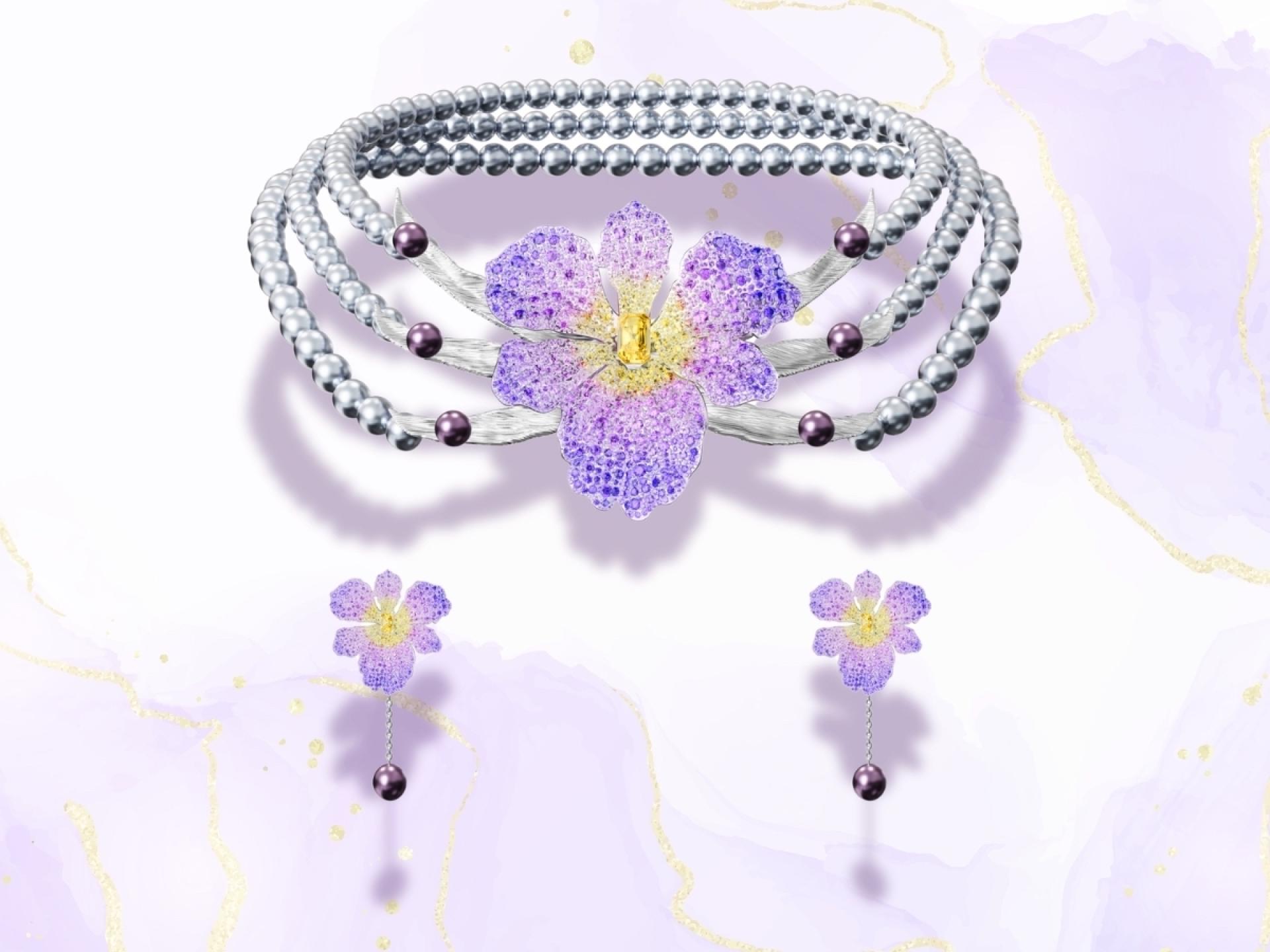 This jewelry set celebrates the iris flower’s symbolism of admiration, hope, and wisdom through its innovative use of materials and artistic craftsmanship. The pavé setting and varied stone sizes create a harmonious blend of texture and sparkle, while the pearls and platinum add a touch of timeless sophistication. Whether worn as a set or as individual pieces, this collection embodies the elegance and beauty of nature, making it perfect for both special occasions and daily wear.