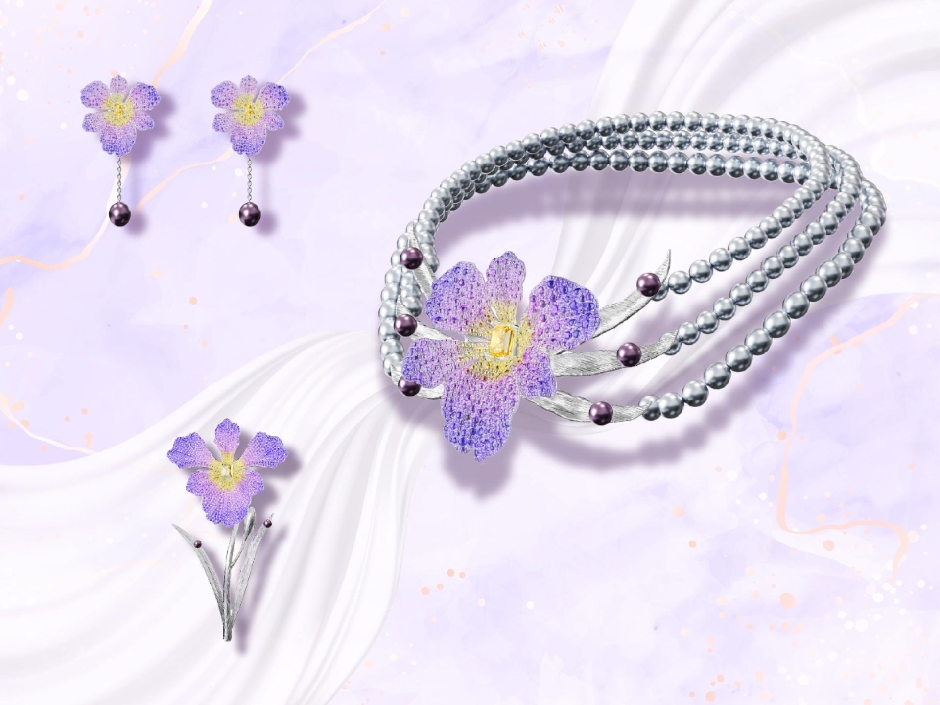 This exquisite jewelry set, inspired by the timeless elegance of the iris flower, includes a necklace, a pair of earrings, and a brooch. Crafted with meticulous attention to detail, the collection features a stunning combination of colored gemstones, pearls, and platinum, capturing the graceful essence of nature in a modern, luxurious form.
