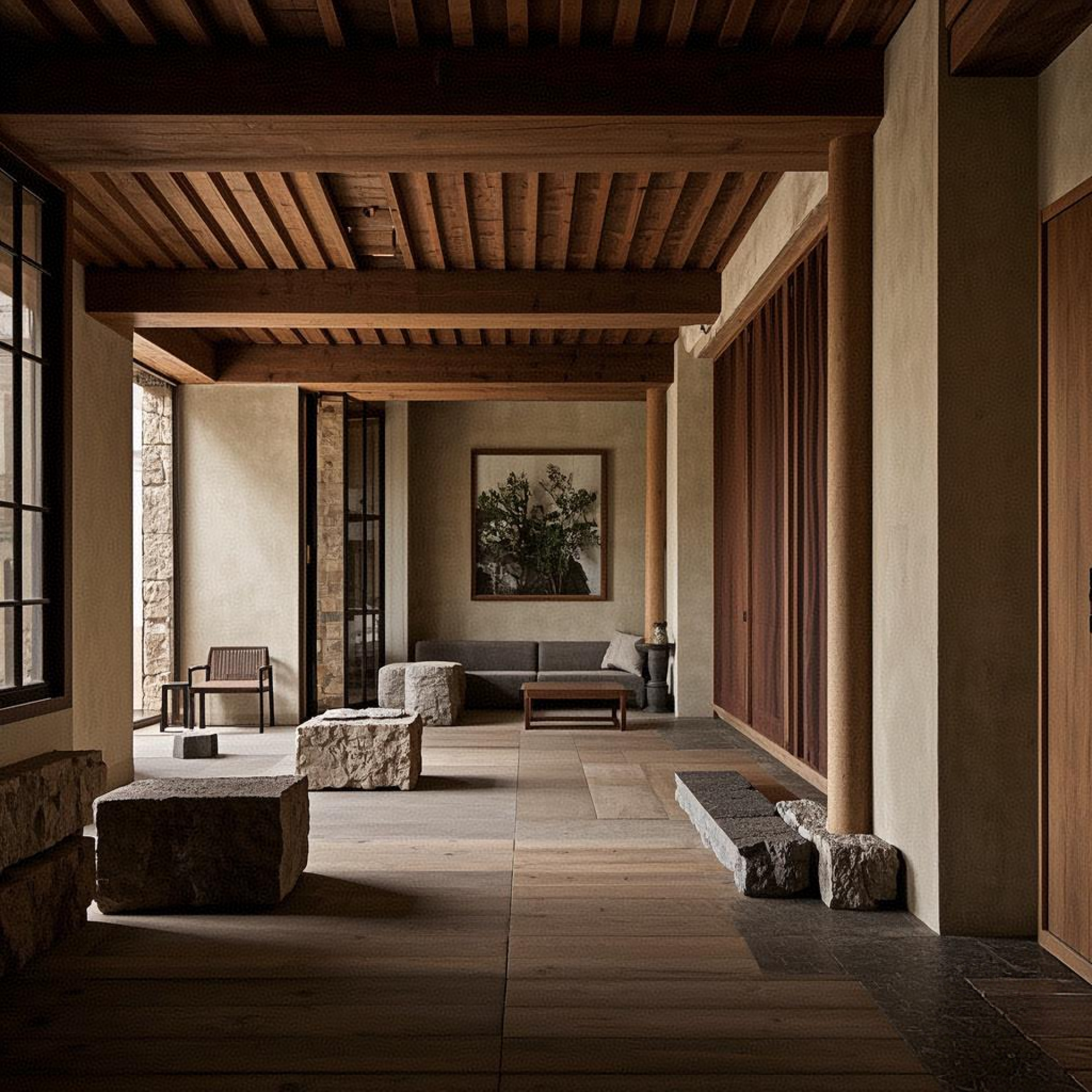 The design prioritizes preserving the original brick and stone walls along with the timber beams, honoring the residence’s historical essence. It also embraces the Wabi-Sabi aesthetic—a philosophy that finds beauty in imperfection—by incorporating vintage elements like terracotta jars and door panels as decorative pieces. These are thoughtfully combined with modern artistry, creating an atmosphere that feels like a journey through time.