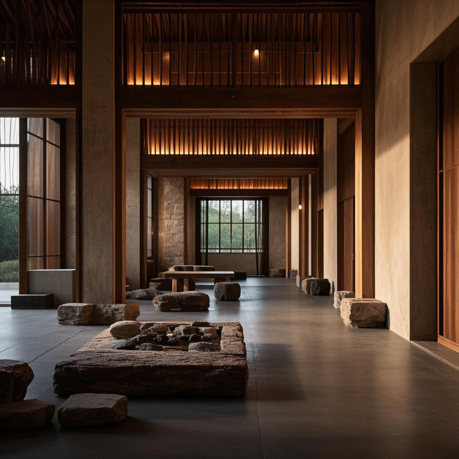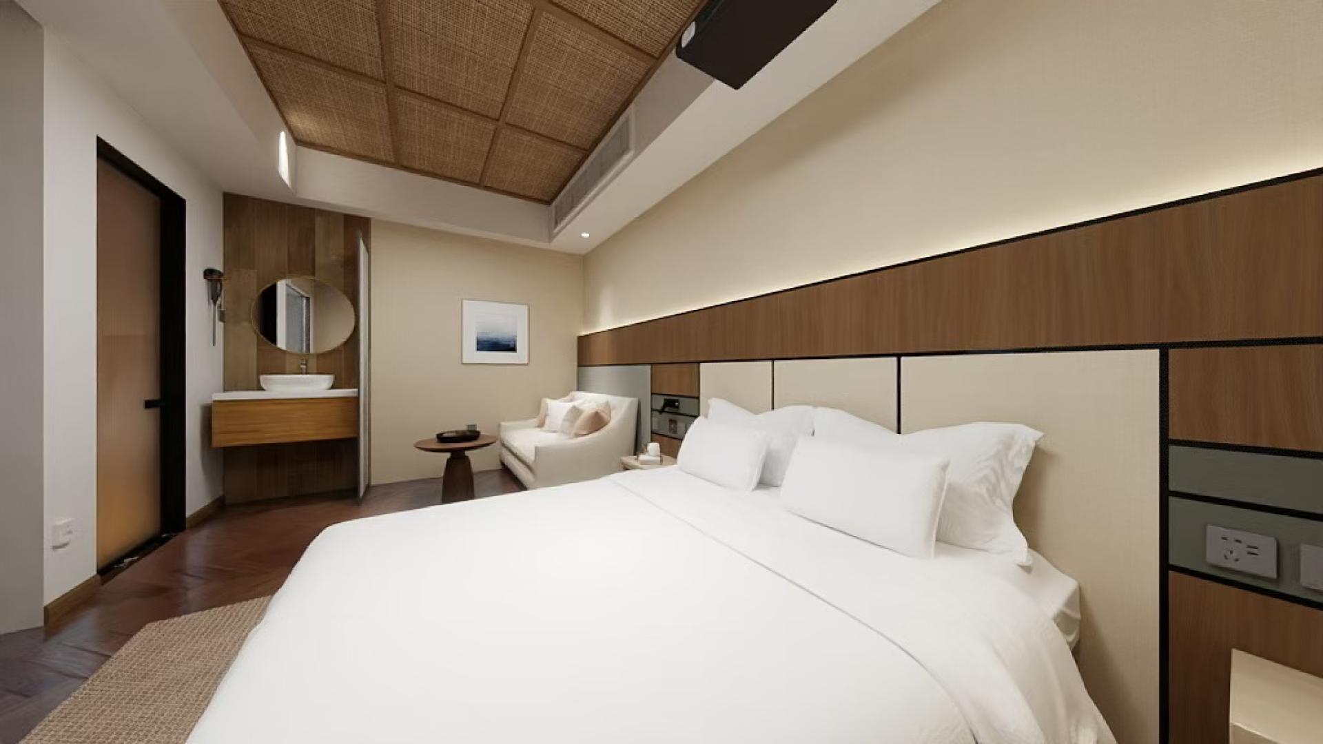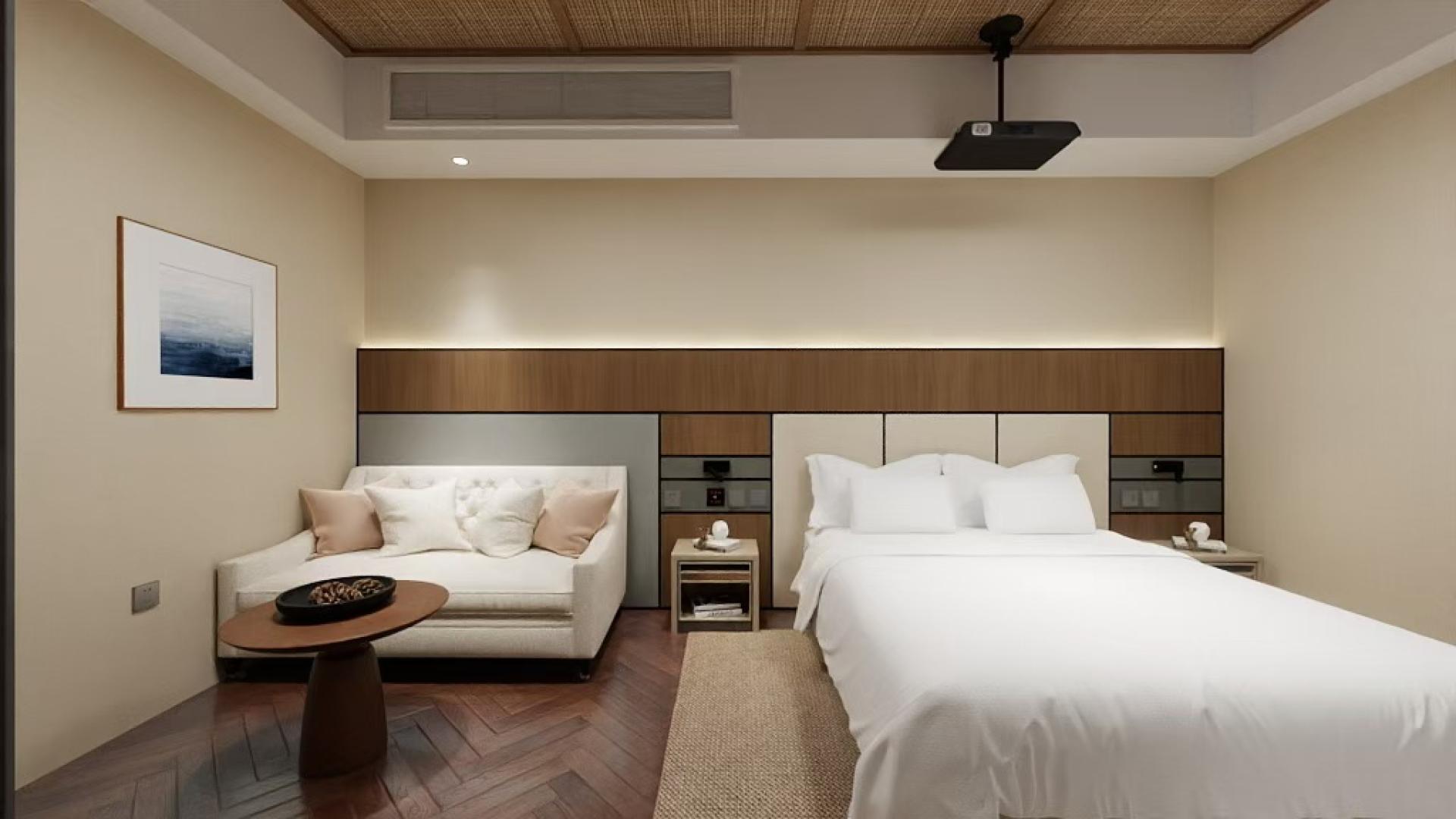 In the common areas, the ancient rammed earth walls have been restored with modern fiber materials while keeping the original stone slabs unchanged. Beneath ancient trees in the front courtyard, traditional stone benches are harmoniously arranged alongside chic outdoor sofas, reflecting the theme of past meeting present. The lobby features a lofty and open design, with raw wood used extensively—from the exposed beams to the furniture. The authentic wooden texture and aesthetic evoke the rustic simplicity of the ancient residence. The centerpiece here is a solid stone fireplace, whose simple and unadorned appearance perfectly complements the rustic wooden elements, fostering a warm and nostalgic ambiance.