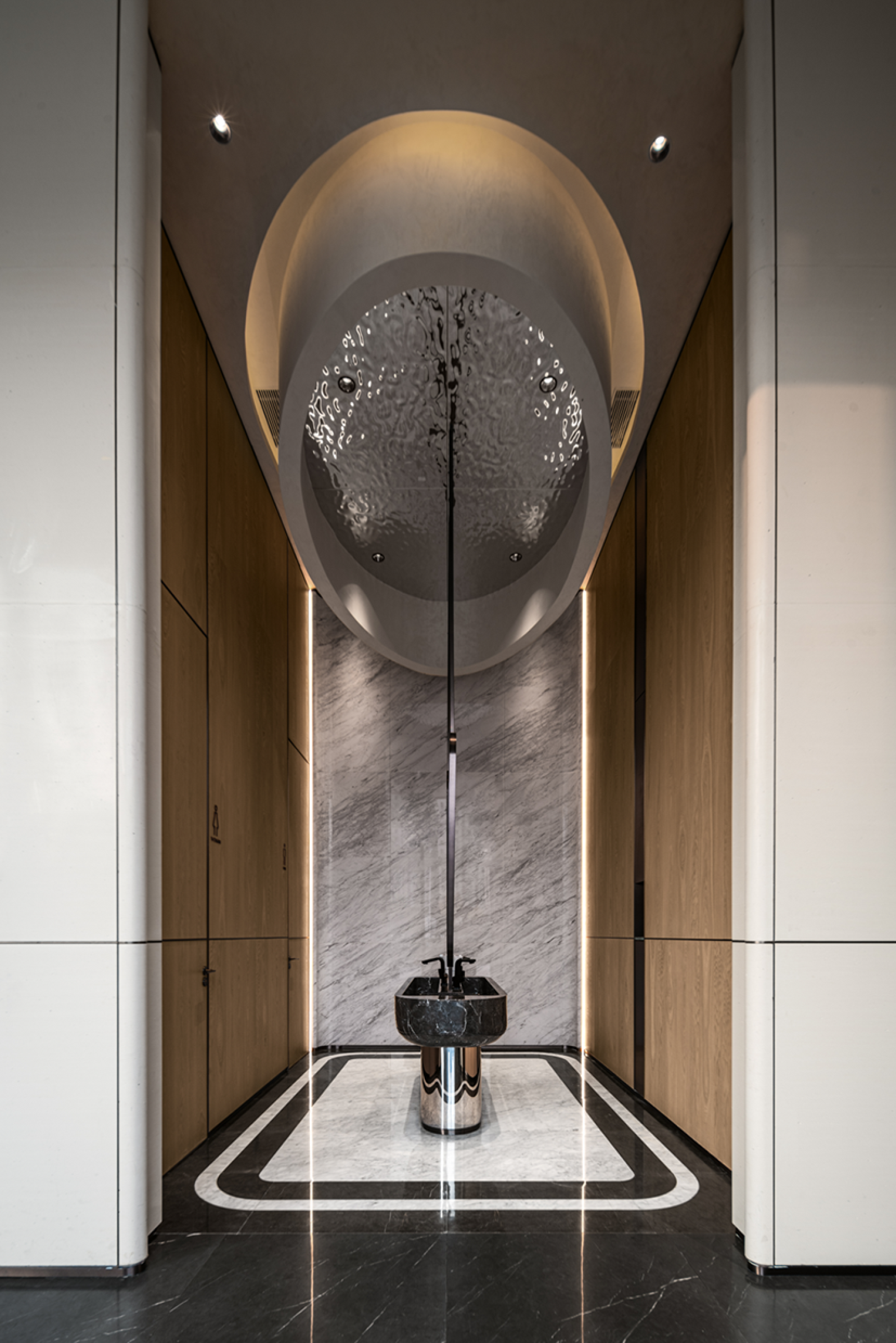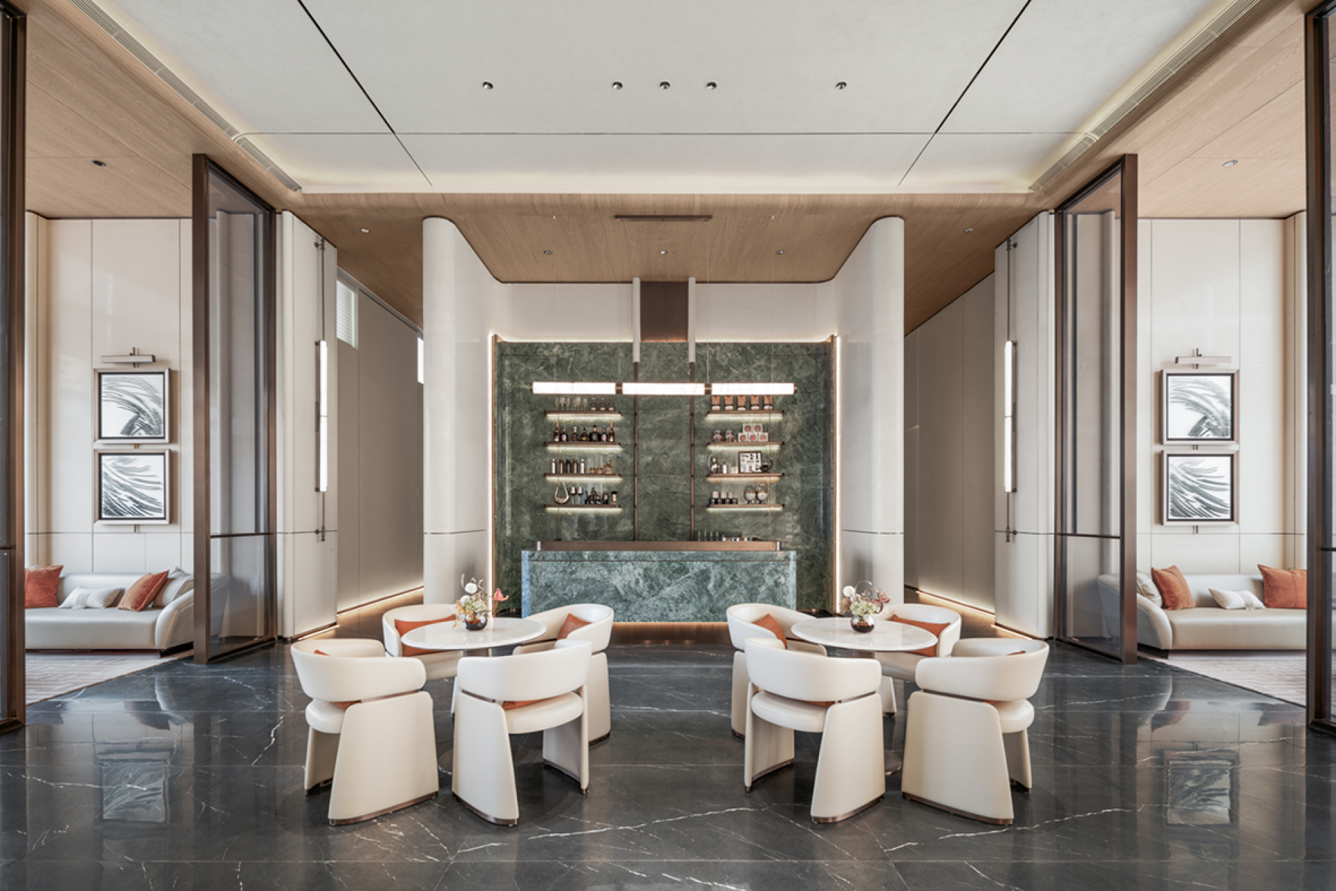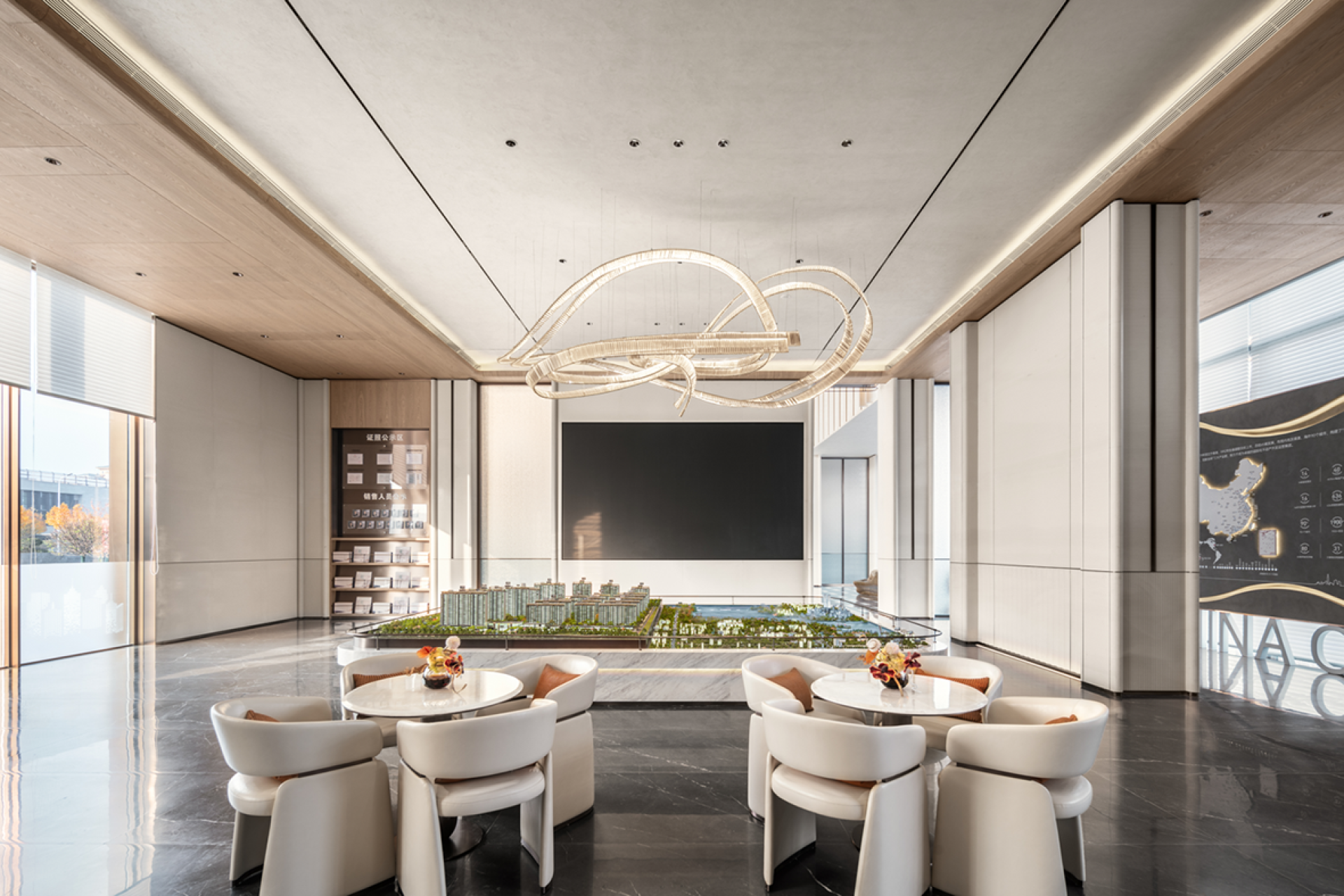 The majestic Helan Mountain stands still, and the rolling Yellow River water flows endlessly. Take a cup of water from the sky and build a dream for this project. Built by the lake, born from the water. The design clues come from the natural lake "Yuehai Lake" in the project.We will take "Yuehai Lake" as the core, use nature to tell the story of health, and pay tribute to tradition with modernity. The water ripples layer by layer, and the rippling lake water interprets rhythm and inclusiveness. The freely rising buildings stand on the lake shore like sails, interpreting the shape of the wind and purifying the spirit and connotation from the intangible lake water, which runs through the entire project. Extract the form and symbols of architecture, lake water, and derive changes for use in indoor spaces.Entering the lobby, one is greeted by a curved wall with rippling water waves, combined with lighting, resembling layers of progressive water waves.The large area of the wall is made of clean inorganic stones, which is both environmentally friendly and distinctive. The semi-circular column corners are exquisite and delicate, and the artistic top surface runs through the curved elements of the building and water throughout the entire space. The use of new materials such as the gradient lake blue water ripple stainless steel reception desk and the gradient lake blue artistic glass screen makes this space both unique and visually impactful.The combination of curved water splashes in the background of the lobby is beautiful and full of ceremony. The background is carved with liquid copper patterns, with the upper half depicting the towering peaks of Helan Mountain and the lower half depicting the rippling blue waves of Yuehai Lake. Incorporate the culture of Yinchuan into this project.The sand table and negotiation area complement each other, breaking the traditional spatial form and connecting the sand table with the top surface of the negotiation area, making the sense of extension of the space stronger.The wall continues the spatial composition of the lobby, with a large area of clean inorganic stones used on the walls. The top surfaces on both sides of the negotiation area are decorated with wooden veneers, enhancing the functionality of these two areas and improving the spatial atmosphere of the negotiation area.The sales office space is not just a functional container, but also inclusive, carrying, and open-minded. The technique of design is embodied in it, which is a poetic expression.