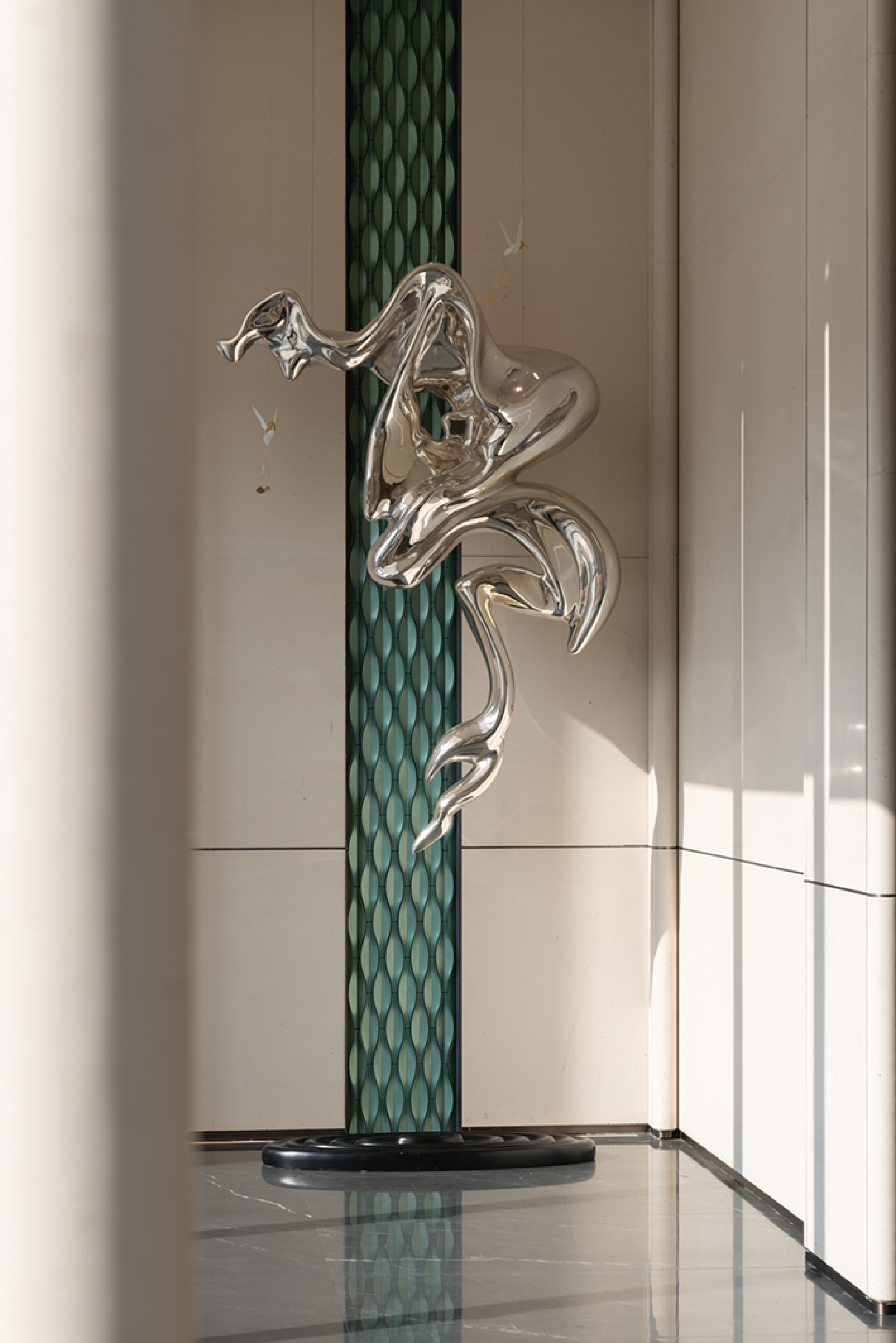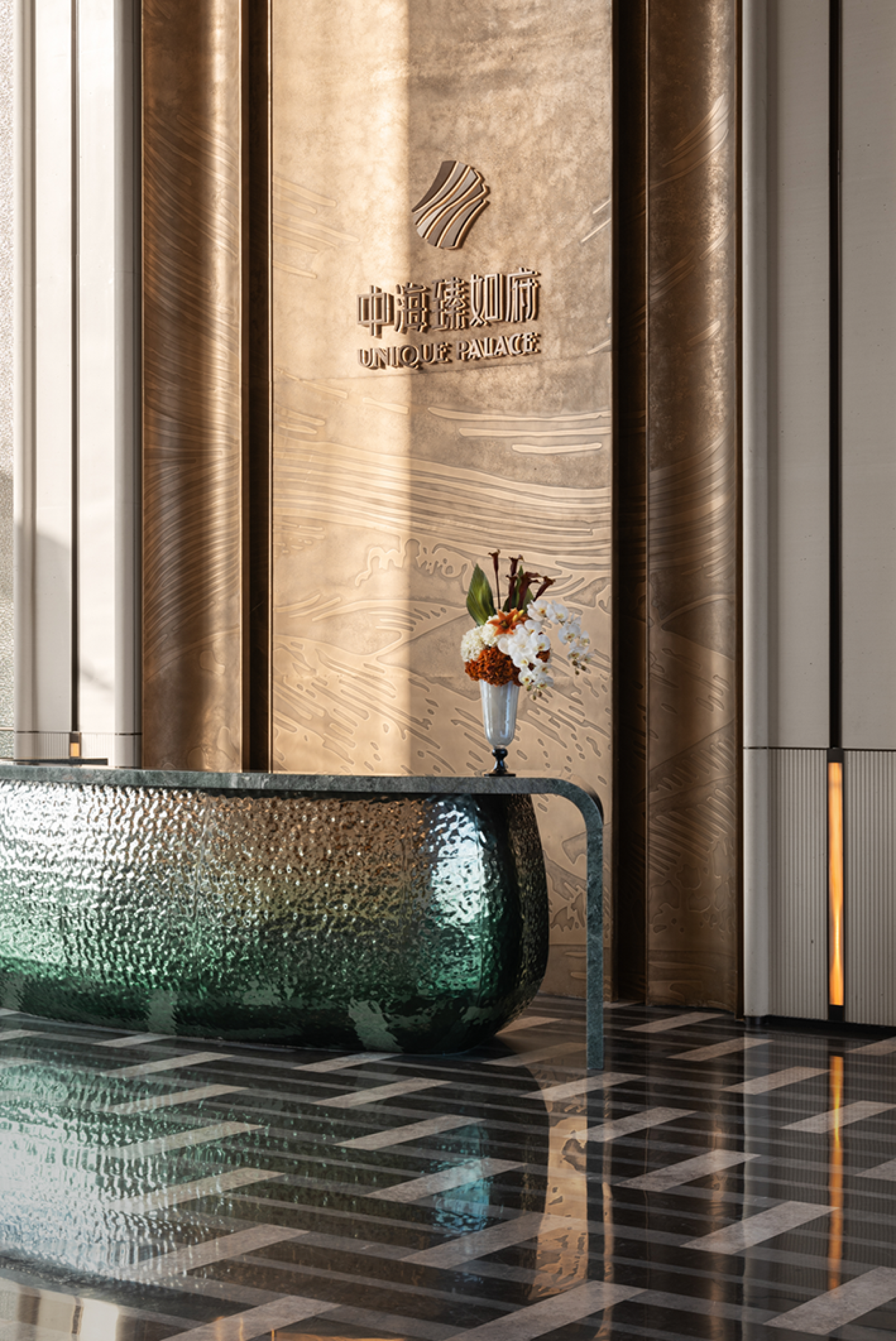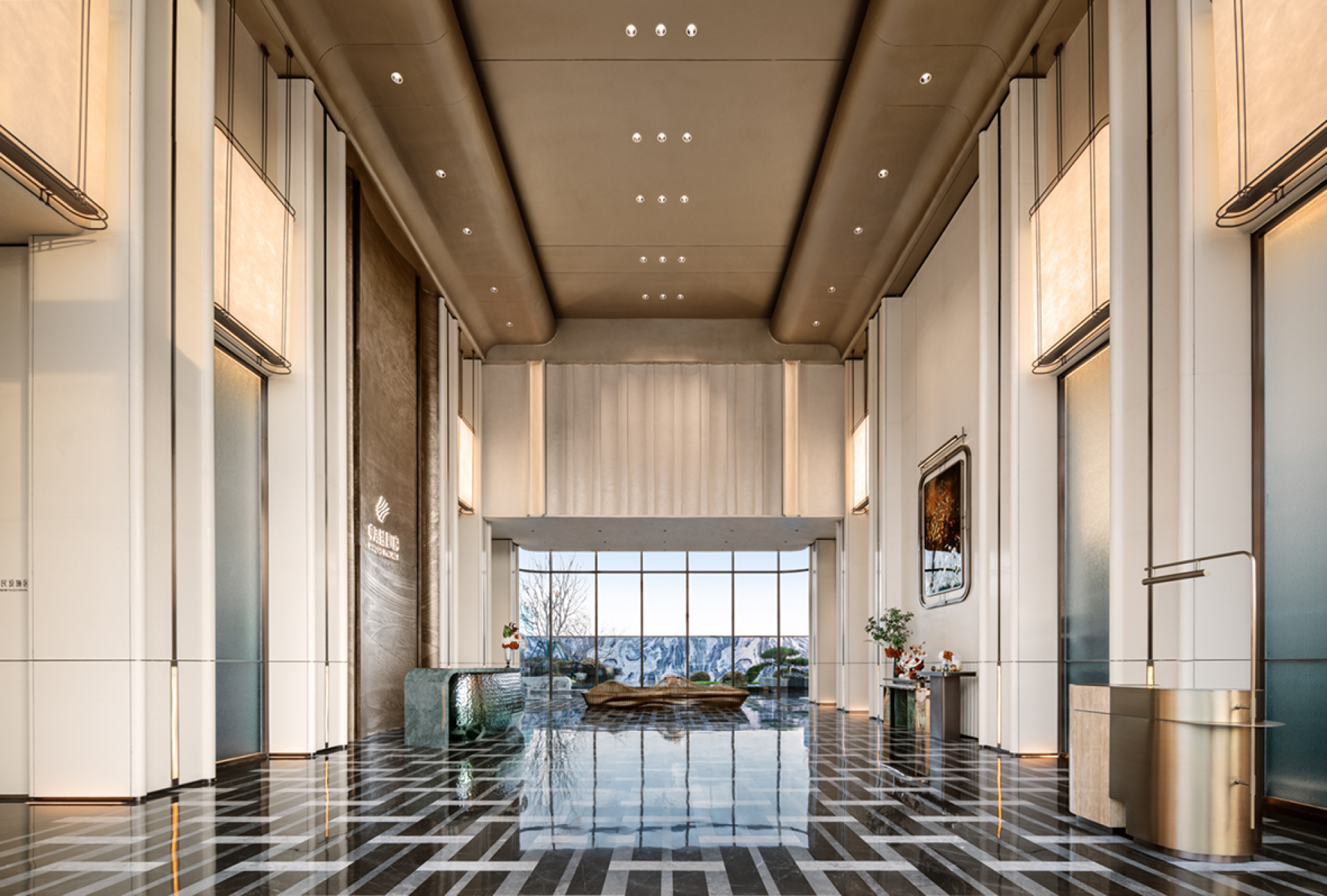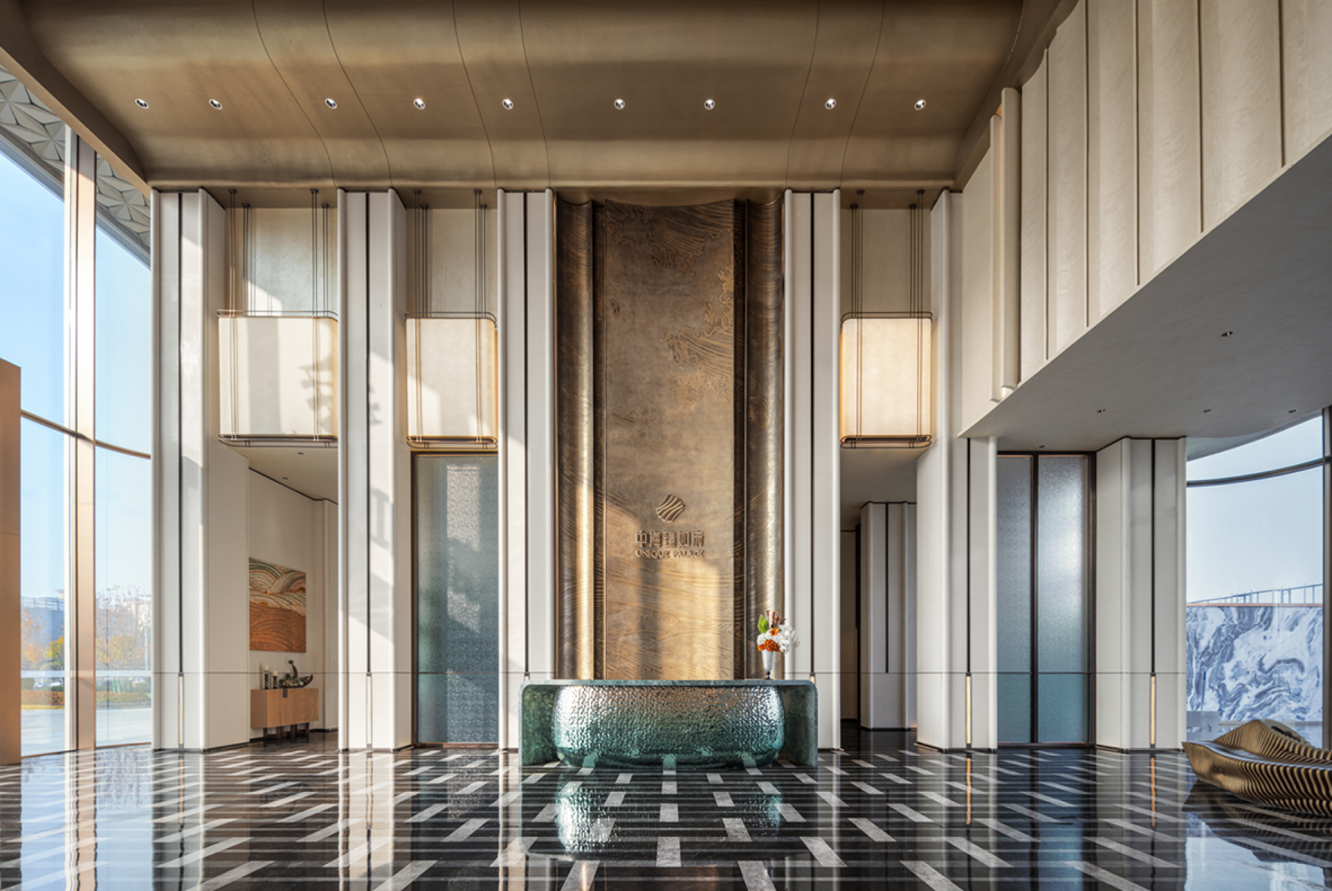 The majestic Helan Mountain stands still, and the rolling Yellow River water flows endlessly. Take a cup of water from the sky and build a dream for this project. Built by the lake, born from the water. The design clues come from the natural lake "Yuehai Lake" in the project.We will take "Yuehai Lake" as the core, use nature to tell the story of health, and pay tribute to tradition with modernity. The water ripples layer by layer, and the rippling lake water interprets rhythm and inclusiveness. The freely rising buildings stand on the lake shore like sails, interpreting the shape of the wind and purifying the spirit and connotation from the intangible lake water, which runs through the entire project. Extract the form and symbols of architecture, lake water, and derive changes for use in indoor spaces.Entering the lobby, one is greeted by a curved wall with rippling water waves, combined with lighting, resembling layers of progressive water waves.The large area of the wall is made of clean inorganic stones, which is both environmentally friendly and distinctive. The semi-circular column corners are exquisite and delicate, and the artistic top surface runs through the curved elements of the building and water throughout the entire space. The use of new materials such as the gradient lake blue water ripple stainless steel reception desk and the gradient lake blue artistic glass screen makes this space both unique and visually impactful.The combination of curved water splashes in the background of the lobby is beautiful and full of ceremony. The background is carved with liquid copper patterns, with the upper half depicting the towering peaks of Helan Mountain and the lower half depicting the rippling blue waves of Yuehai Lake. Incorporate the culture of Yinchuan into this project.The sand table and negotiation area complement each other, breaking the traditional spatial form and connecting the sand table with the top surface of the negotiation area, making the sense of extension of the space stronger.The wall continues the spatial composition of the lobby, with a large area of clean inorganic stones used on the walls. The top surfaces on both sides of the negotiation area are decorated with wooden veneers, enhancing the functionality of these two areas and improving the spatial atmosphere of the negotiation area.The sales office space is not just a functional container, but also inclusive, carrying, and open-minded. The technique of design is embodied in it, which is a poetic expression.