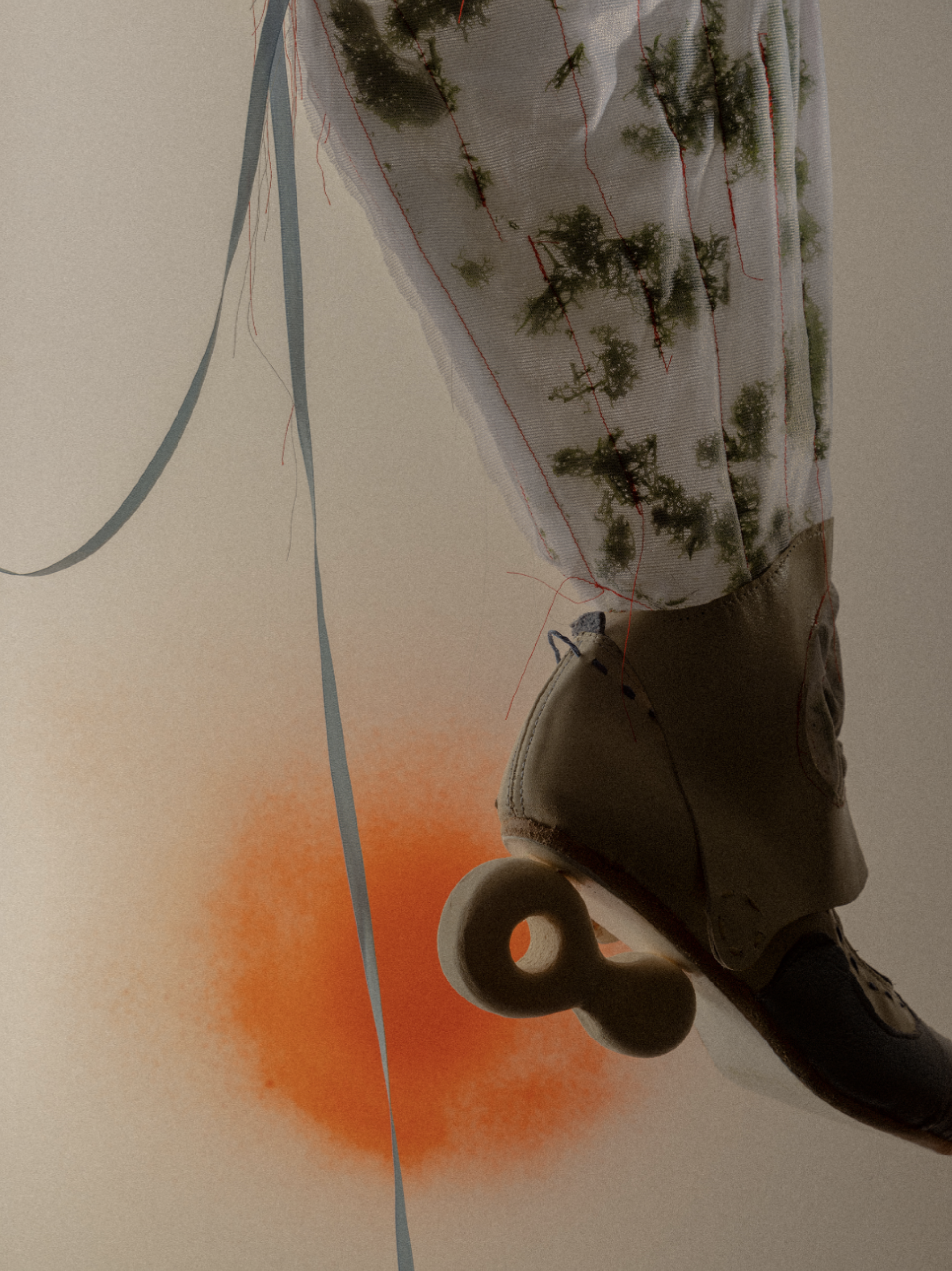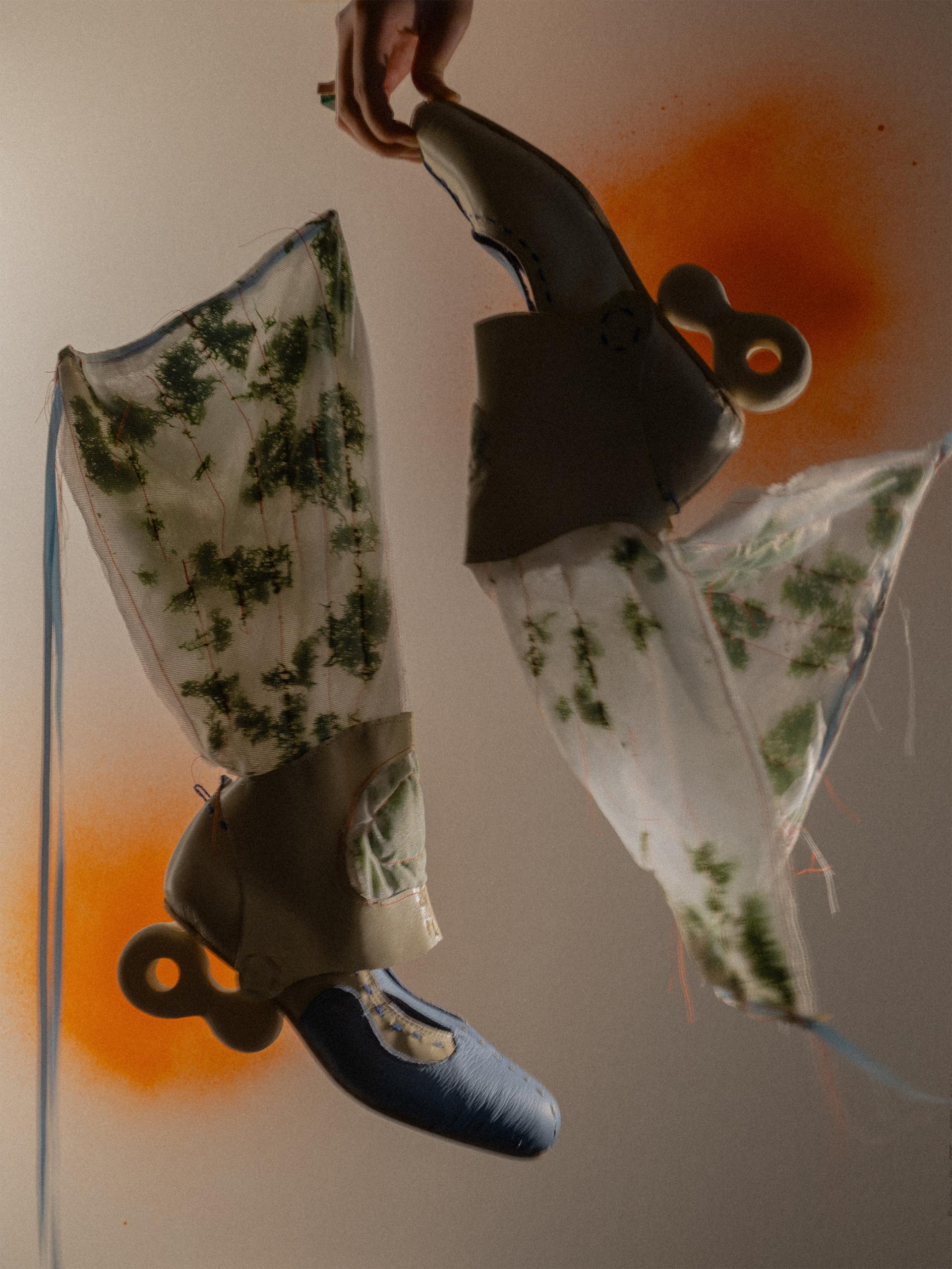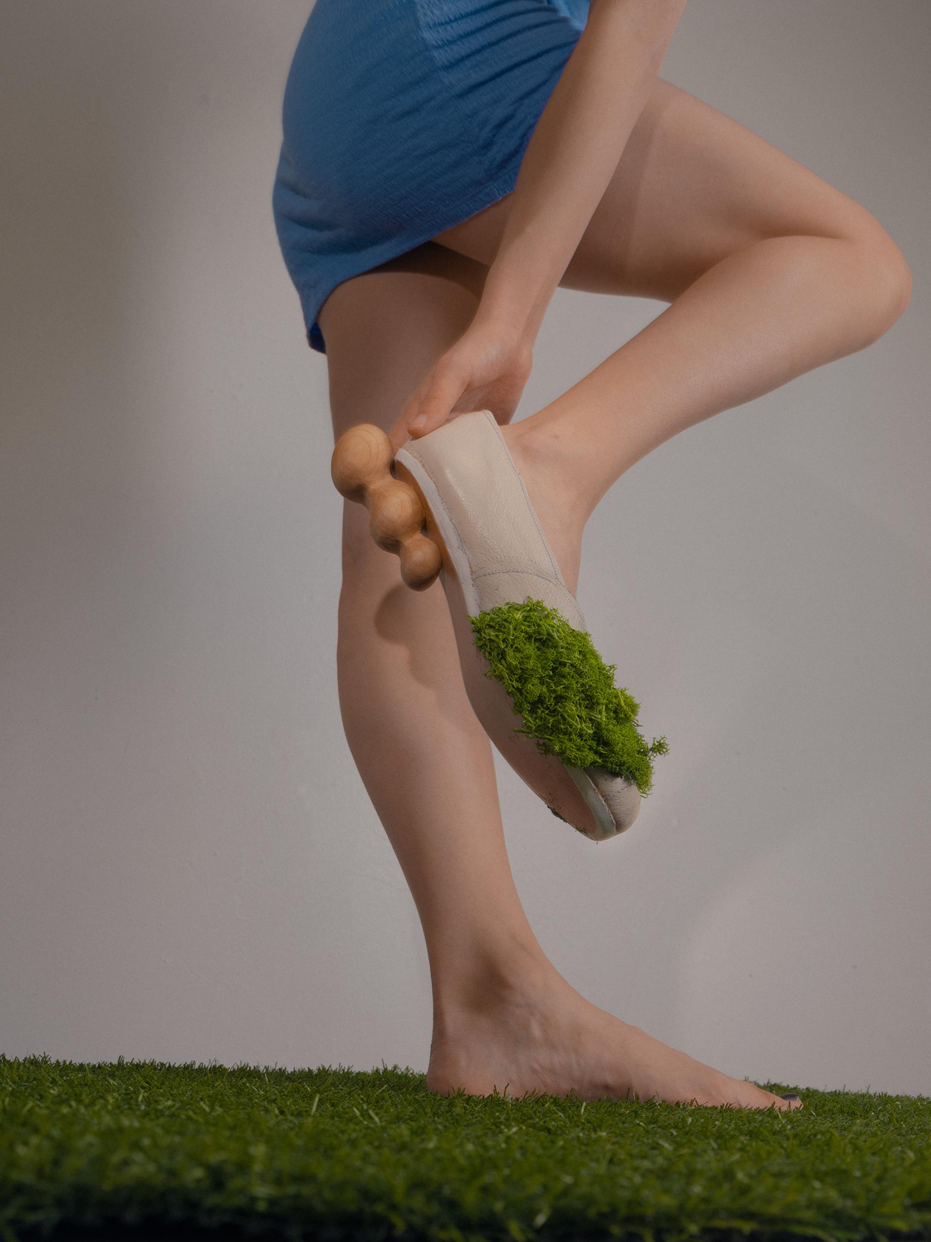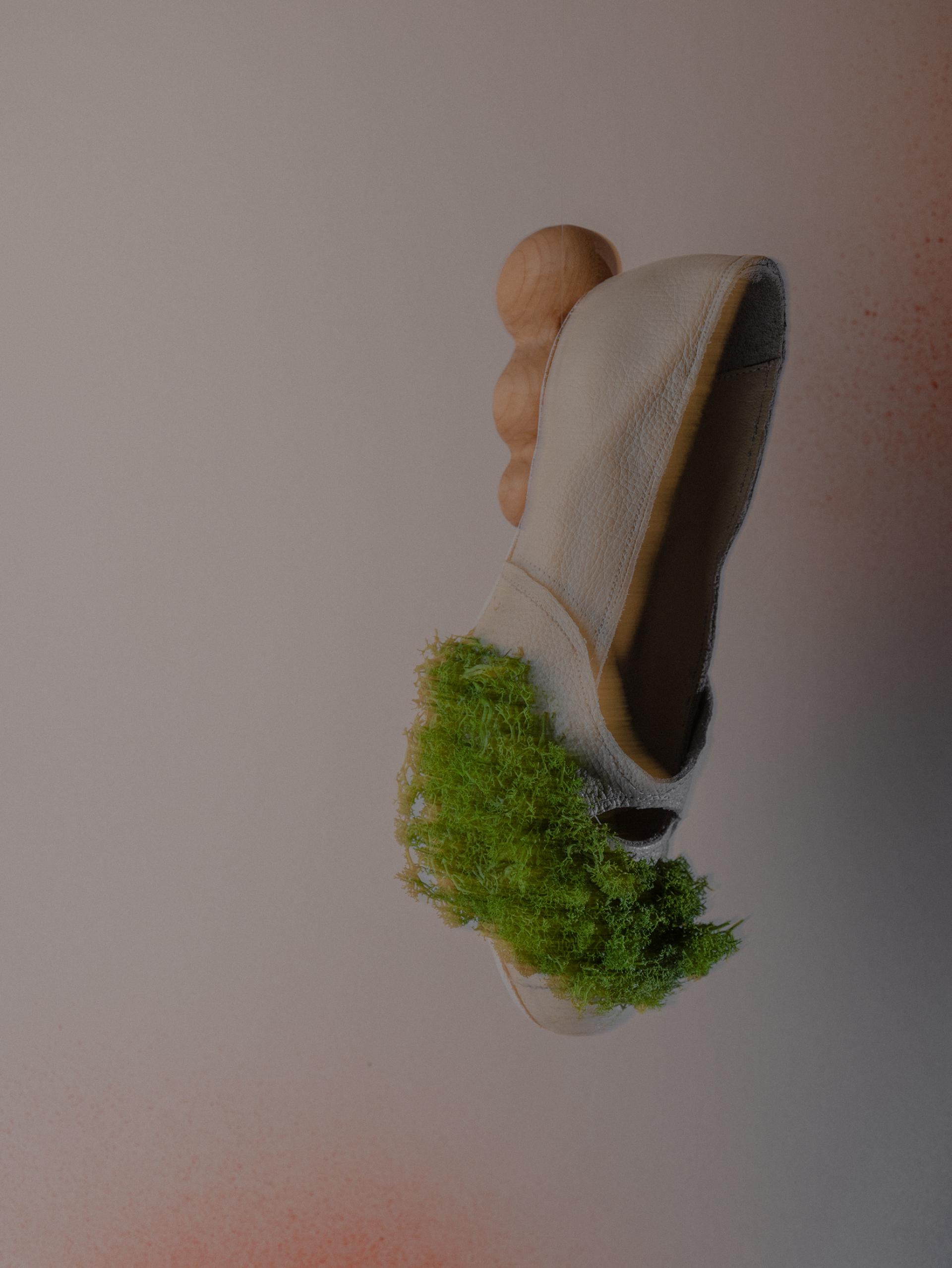 Summer Moss is a high heel shoe design collection that embodies the sensation of being half-awake. For me, designing wearables feels akin to sleep talking, accompanied by a gentle breeze that carries the scent of grass. I find that half-awake memories are some of the most vivid, allowing me to capture the soft and moist scenes lingering in my subconscious. In dreams, I soar over water and land within moments, where overlapping thoughts and imaginations gradually immerse me in the essence of summer. This collection translates the romantic imagery from my unconscious into something tangible and poetic, achieved through the interplay of leather, mesh, wood, and moss. By weaving these ephemeral experiences into my designs, I create a poetic connection that bridges memory and the present through each pair of shoes.