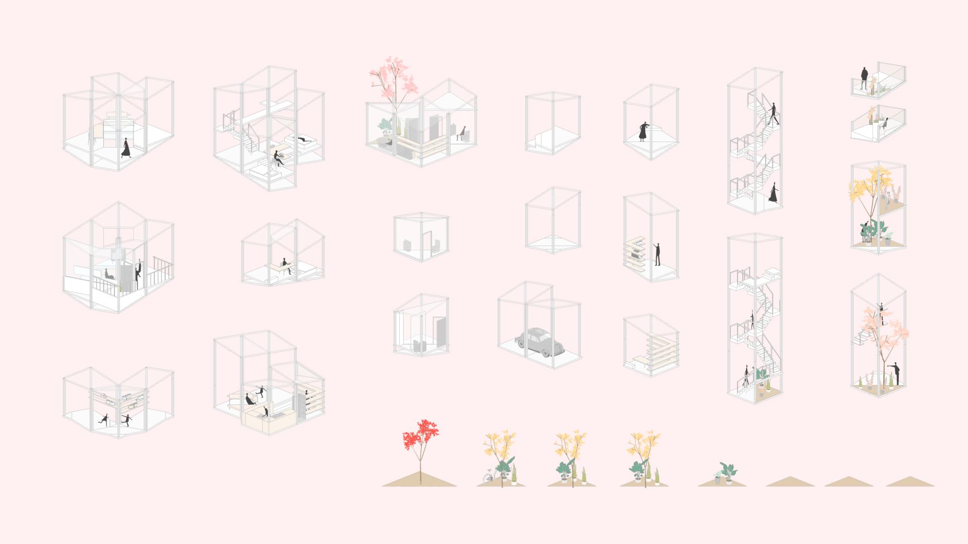 A home originates from individual needs and is shaped by relationships with others. It should not consist of isolated rooms but rather a composition of functional spaces. A home emerges when human activities connect these spaces, making it more dynamic and fluid. Instead of relying on walls to define spaces, this concept envisions “home” as a collection of functional areas differentiated by varying slopes and heights. This approach simultaneously creates a sense of separation and connection, using varying distances to enrich spatial relationships.