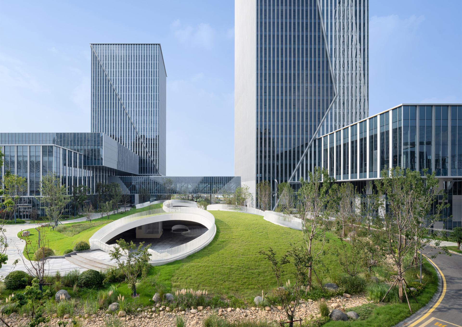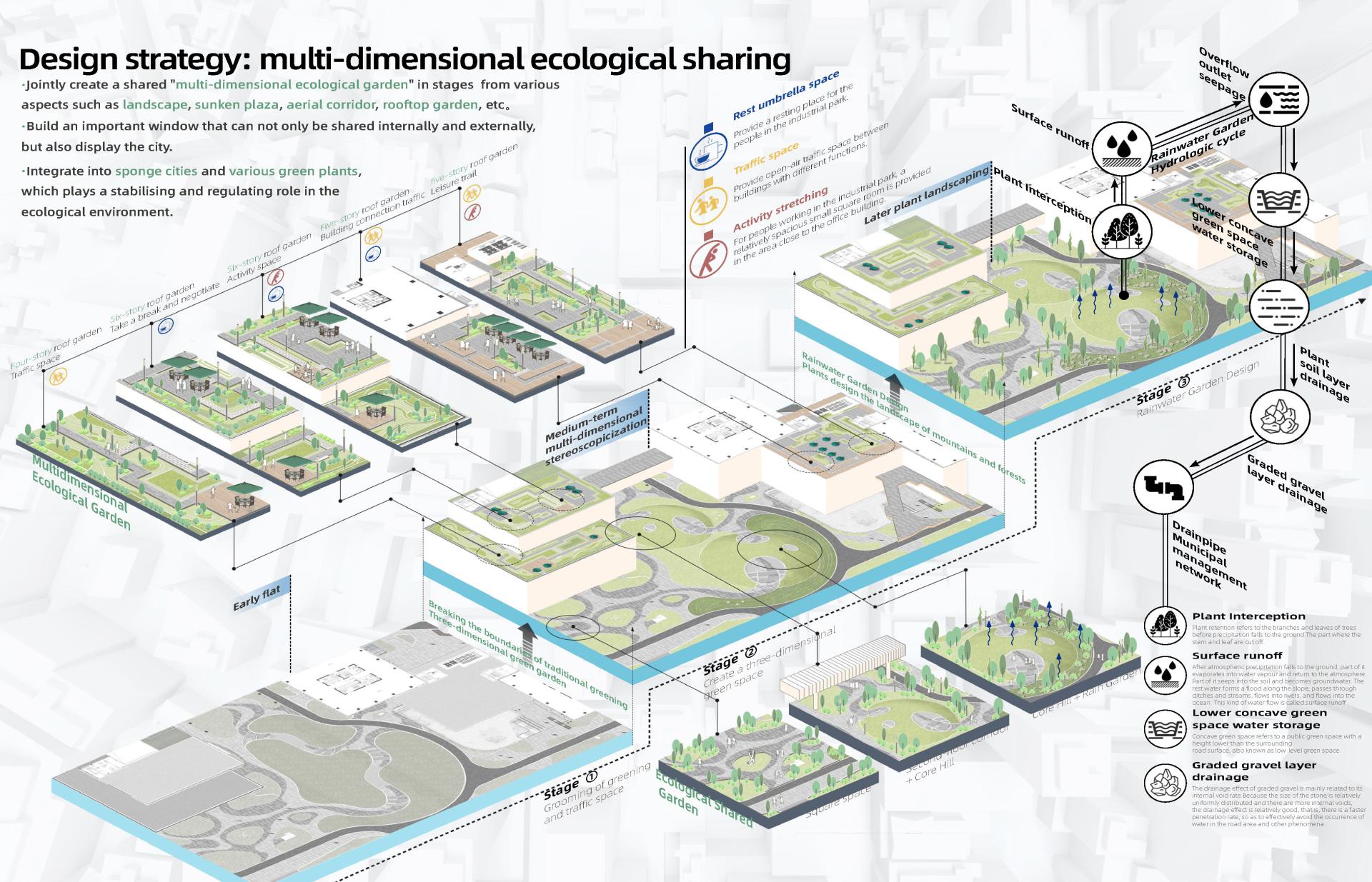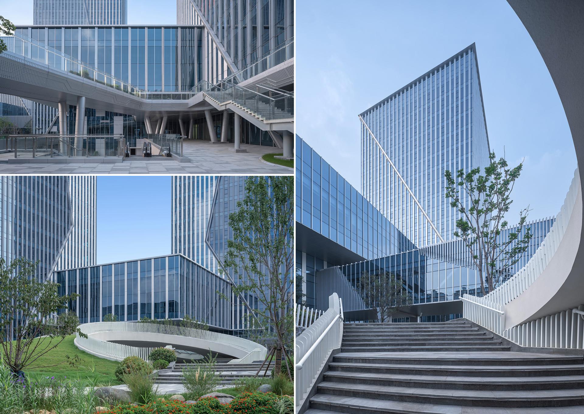 The site adopts an enclosed layout, connecting various functional blocks through the sunken square, central green space, air corridor and roof garden, creating a multi-level landscape space, providing more accessibility for the site, promoting the communication between enterprises and customers, and realizing multi-dimensional ecological sharing.