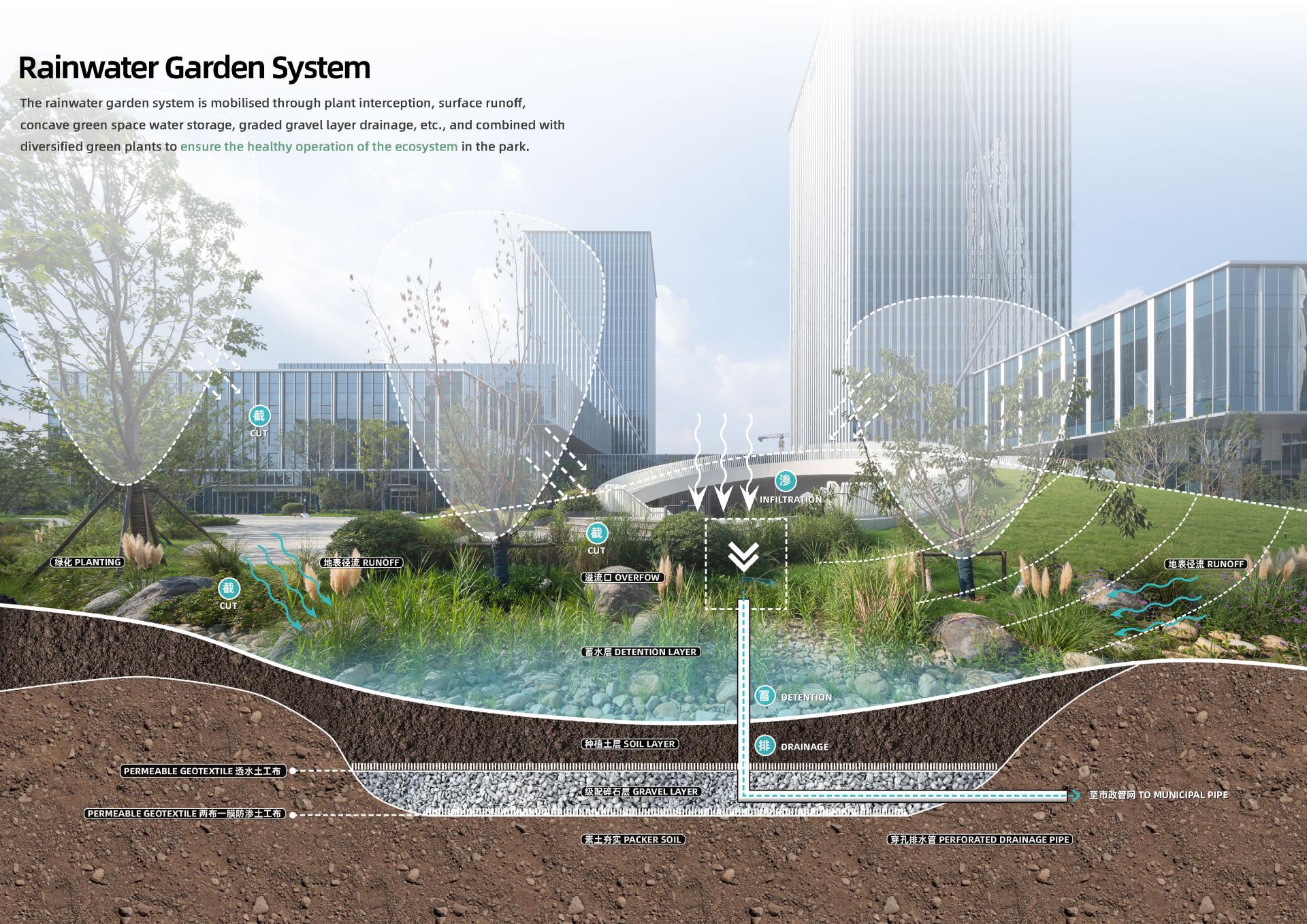 At the same time, it also integrates sponge city and various greening plants, perfectly combines "core hill" with rainwater garden, and builds the park into a sustainable "ecological garden", which makes it possible to regulate and store rainwater, improve the micro-environment and create a low-carbon and energy-saving park environment.