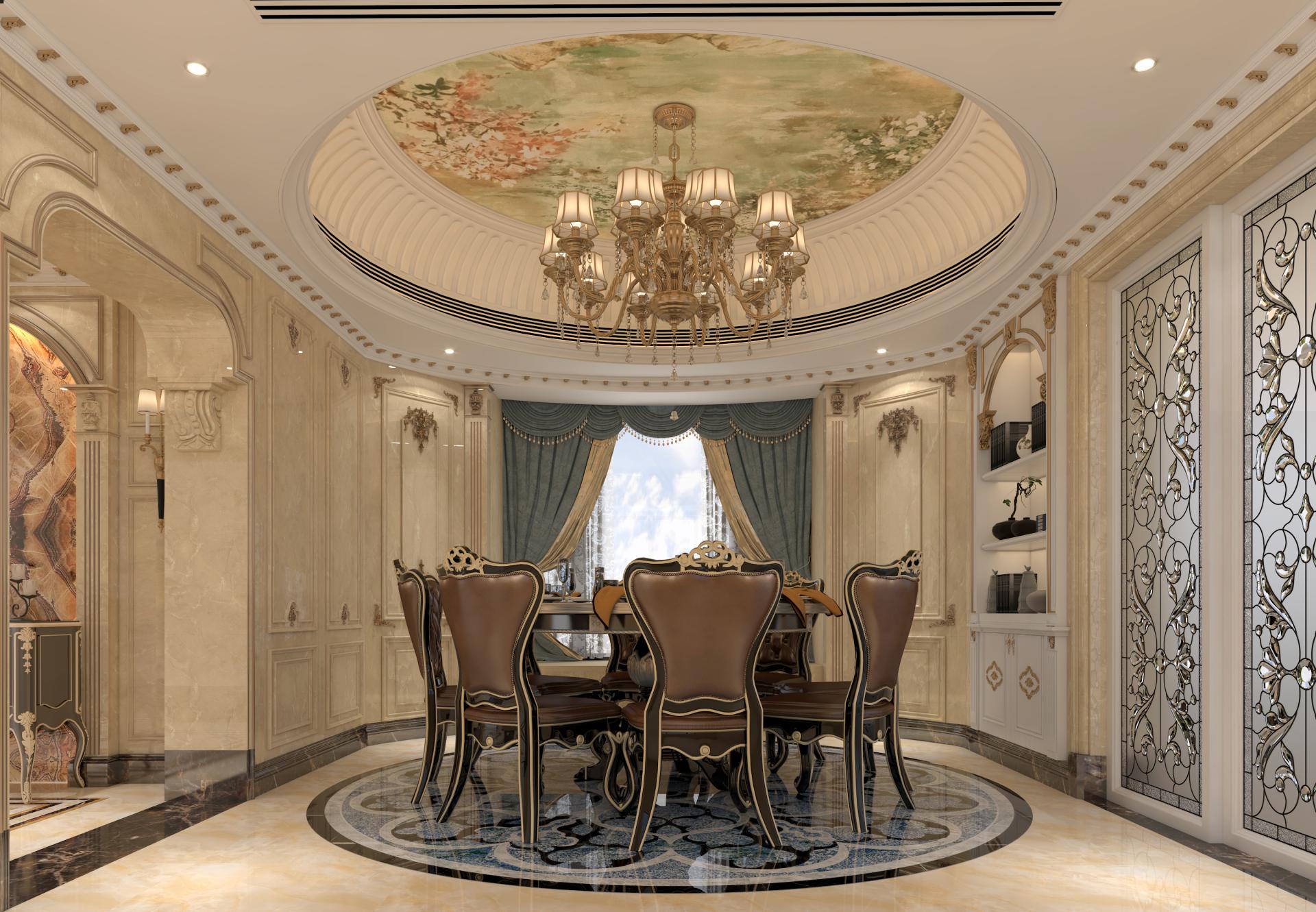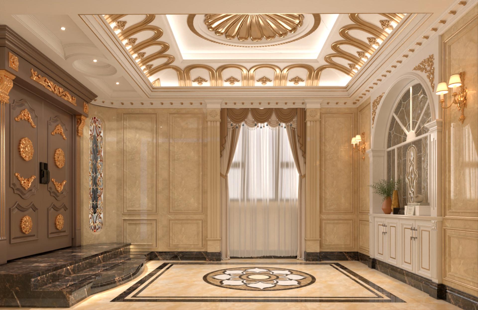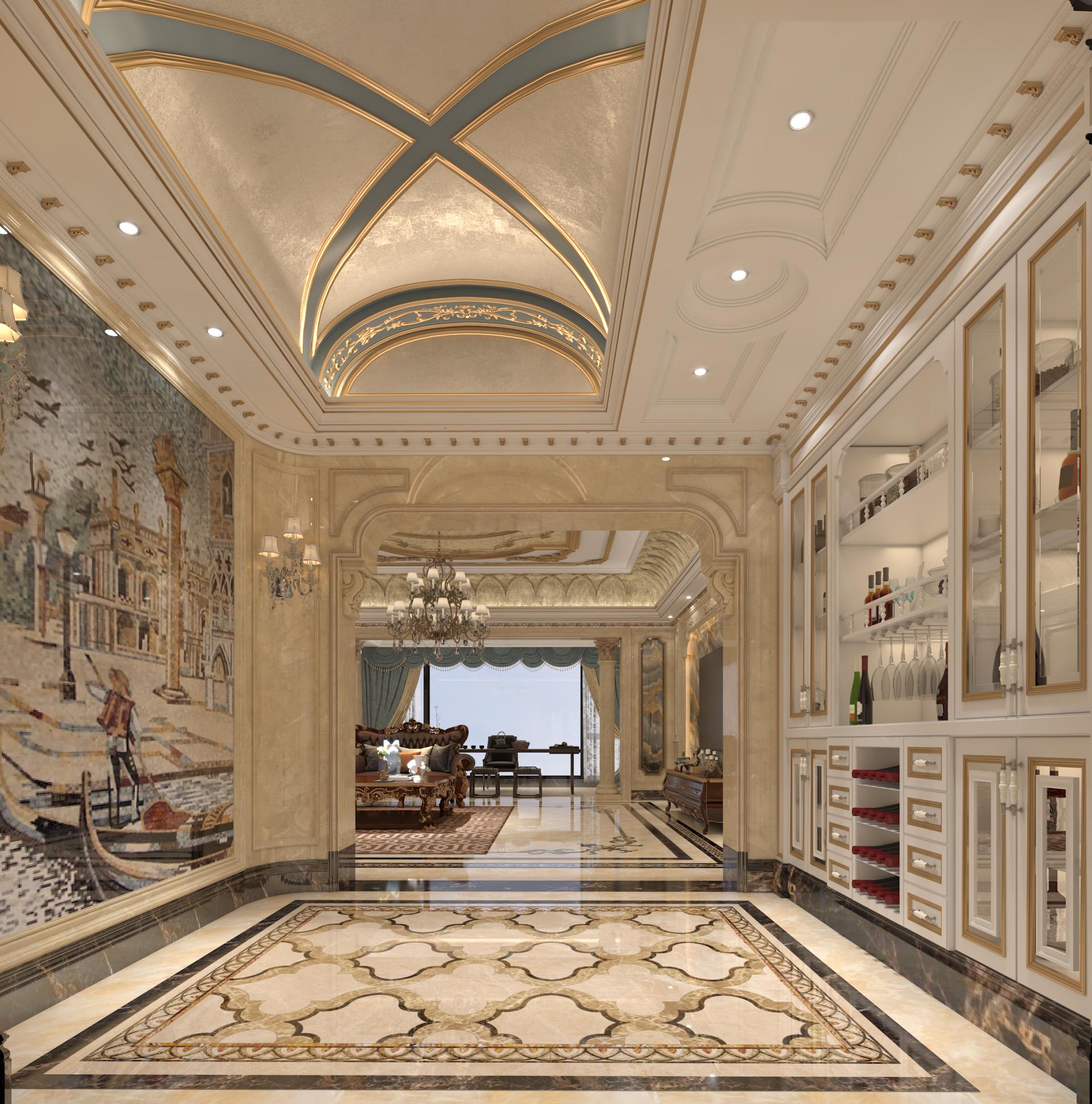 Key spaces like the elevator lobby, entrance hall, leisure area, and living room are carefully curated to provide both function and beauty. The elevator lobby is designed for privacy and convenience, featuring elegant materials like white magnolia stone and Saint Laurent marble thresholds. The entrance hall serves as a graceful transition between public and private spaces, with beautiful geometric ceiling details and exquisite lighting fixtures that enhance the overall grandeur.