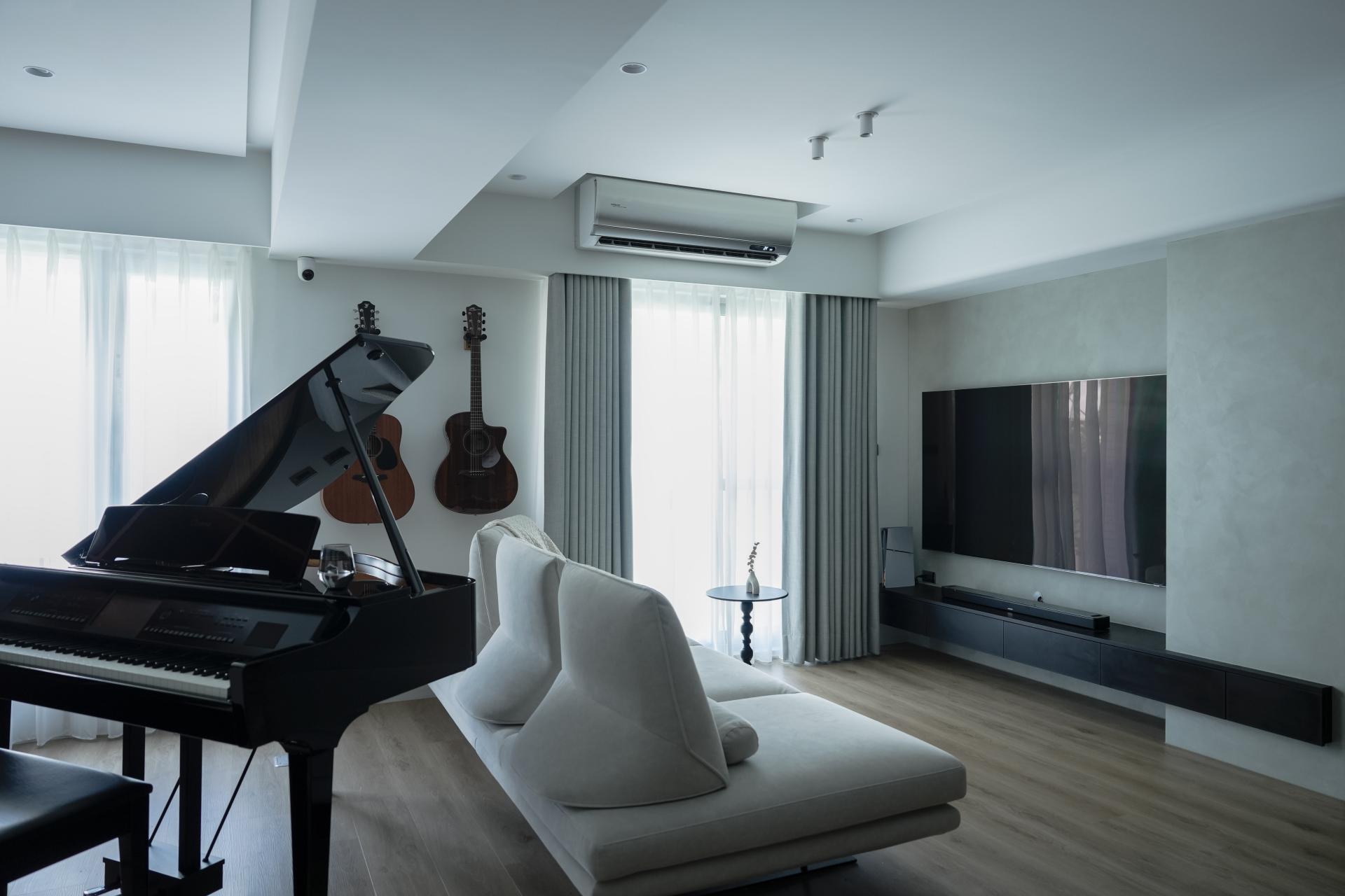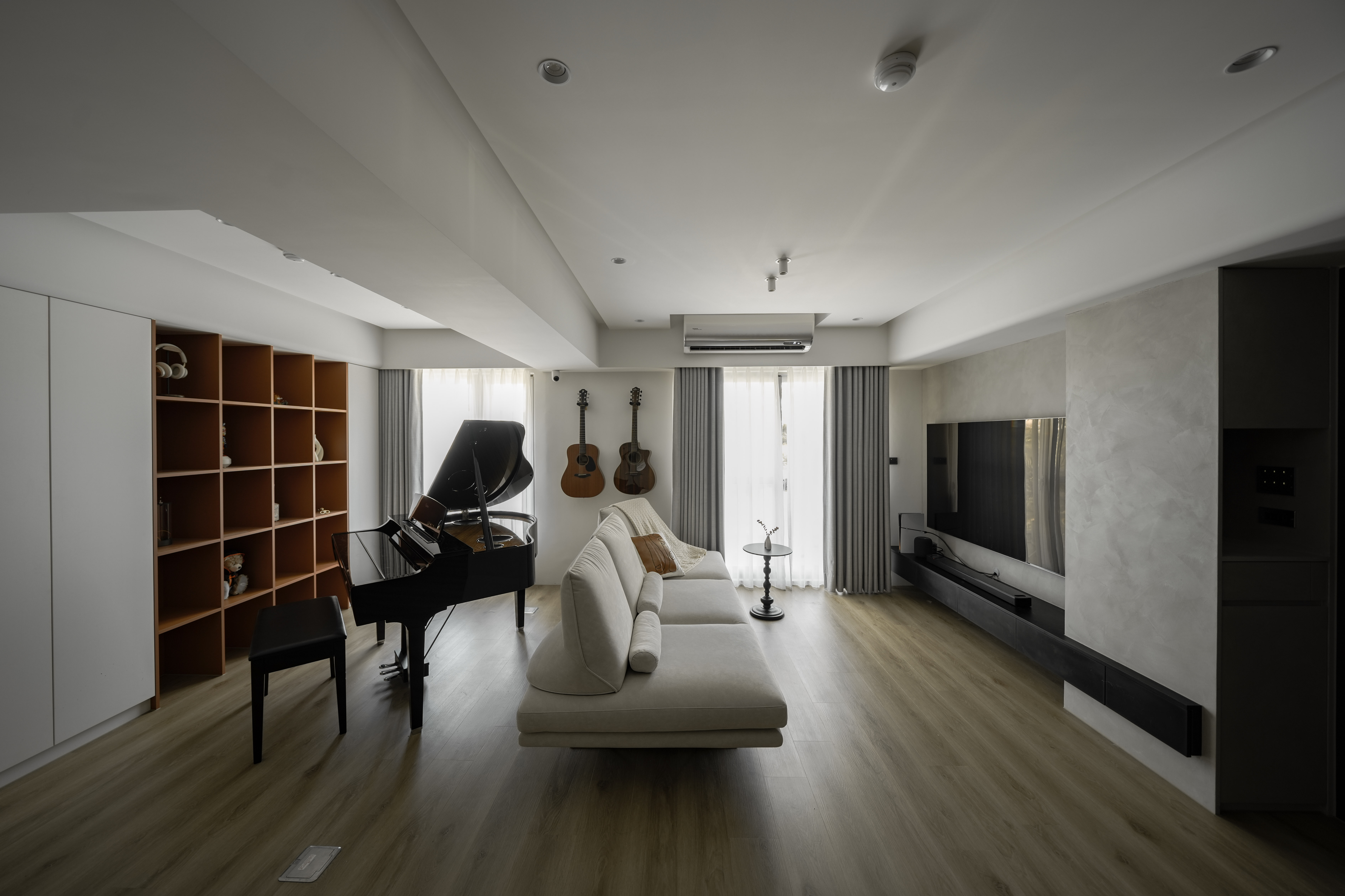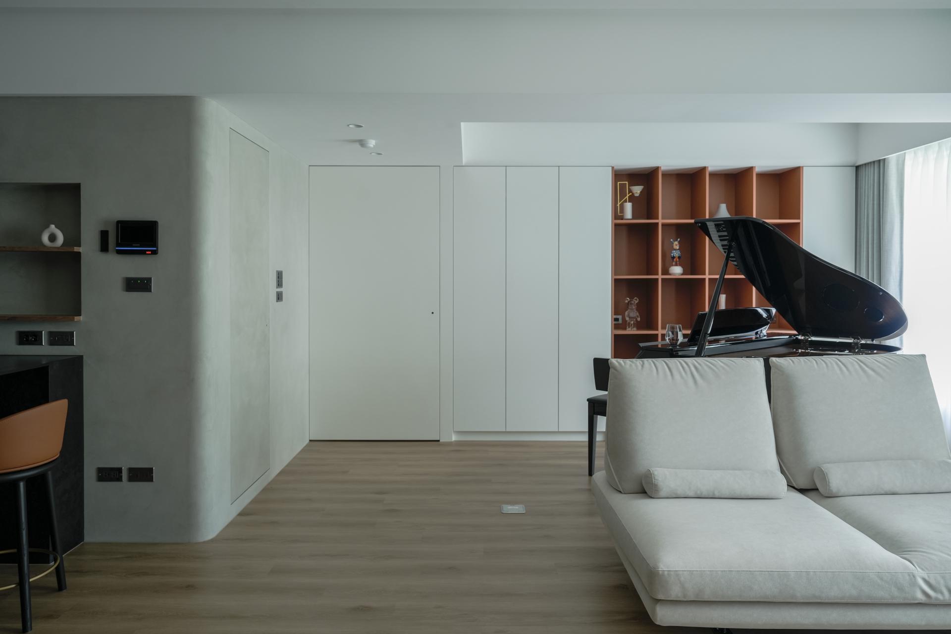The project mainly applies to chromatic schemes, setting a sleek and dignified style to respond to the homeowners' minimalist preferences. Furthermore, the designer manifests the homeowners' favorable red color schemes on throw pillows, ottomans, open shelving in the music room, and the master bedroom ceiling. Those vivid and flashing colors create a dynamic vibe while staging personal artistic tastes.