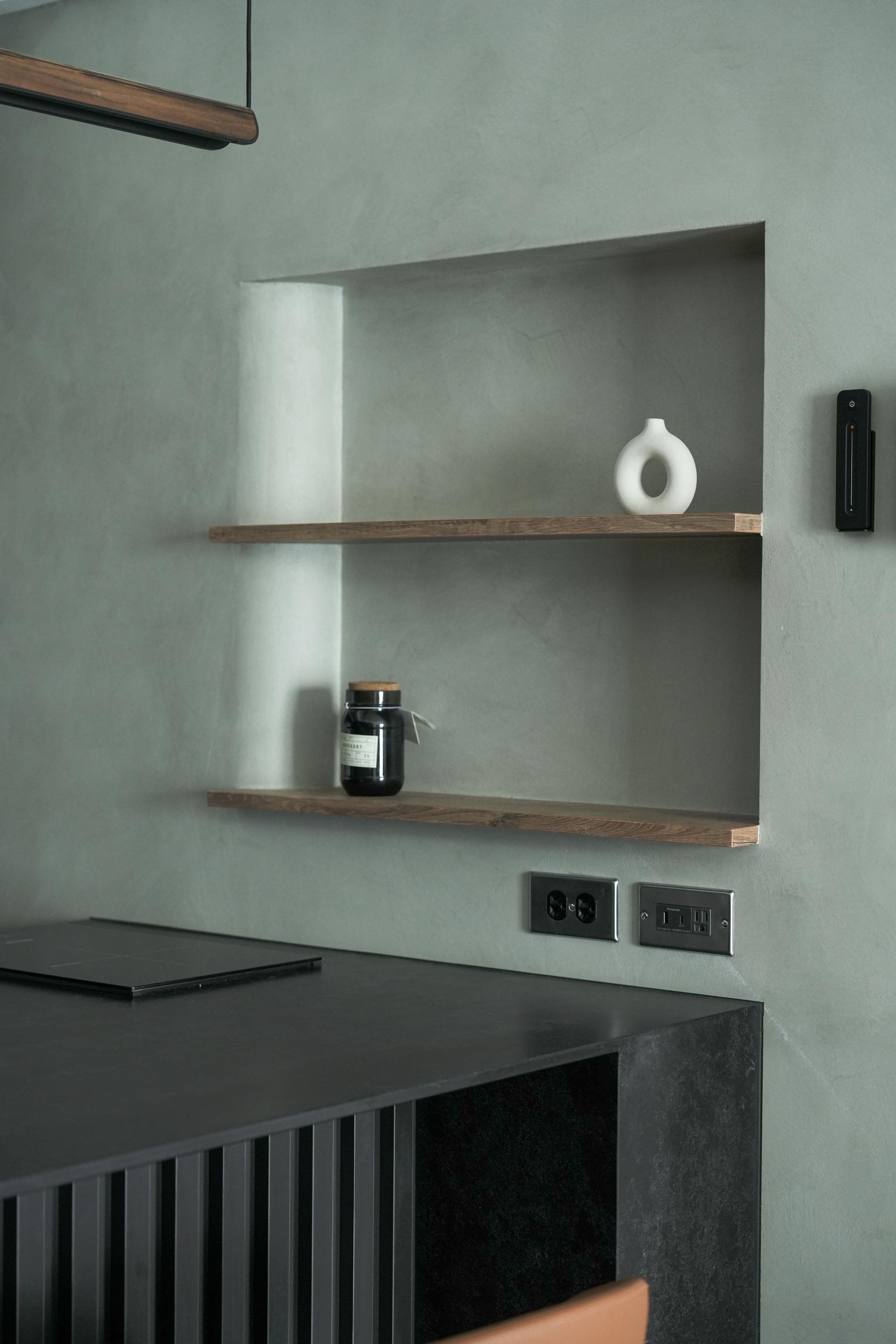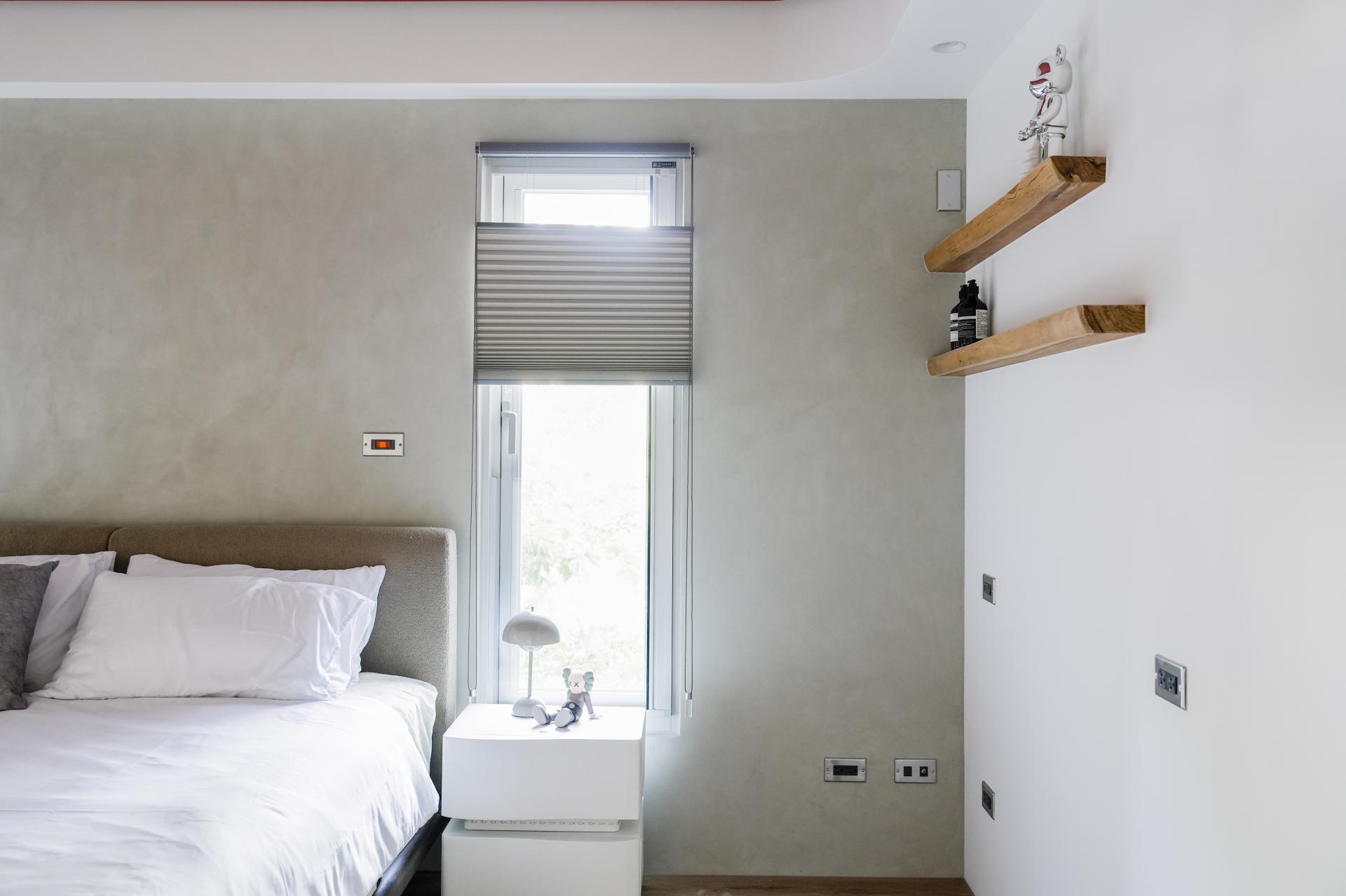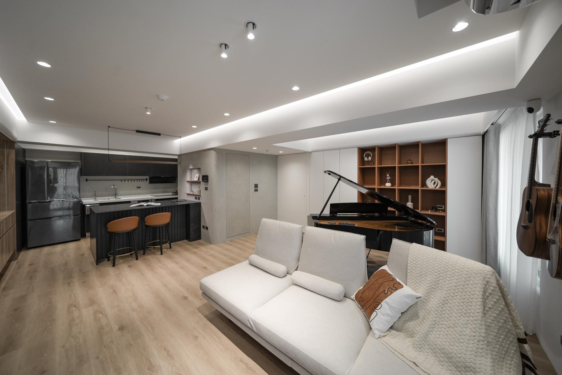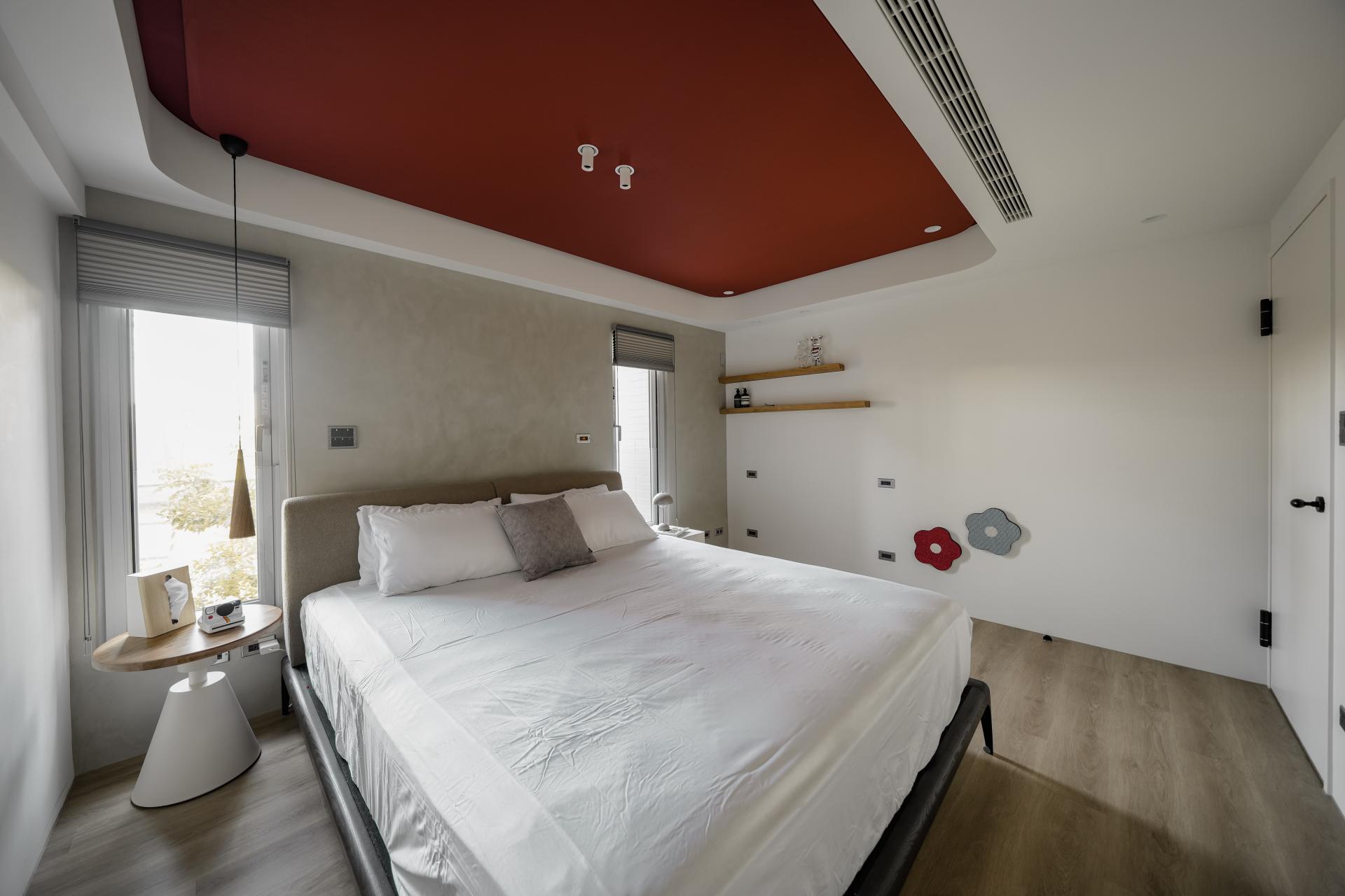 The project mainly applies to chromatic schemes, setting a sleek and dignified style to respond to the homeowners' minimalist preferences. Furthermore, the designer manifests the homeowners' favorable red color schemes on throw pillows, ottomans, open shelving in the music room, and the master bedroom ceiling. Those vivid and flashing colors create a dynamic vibe while staging personal artistic tastes.