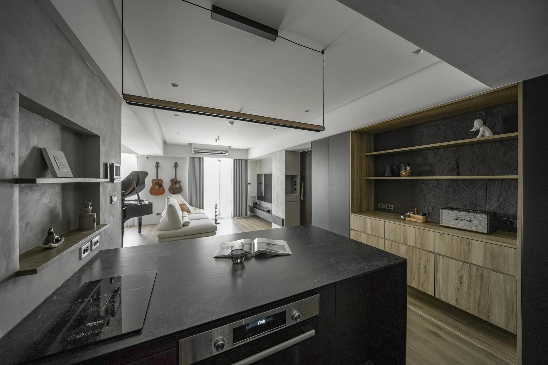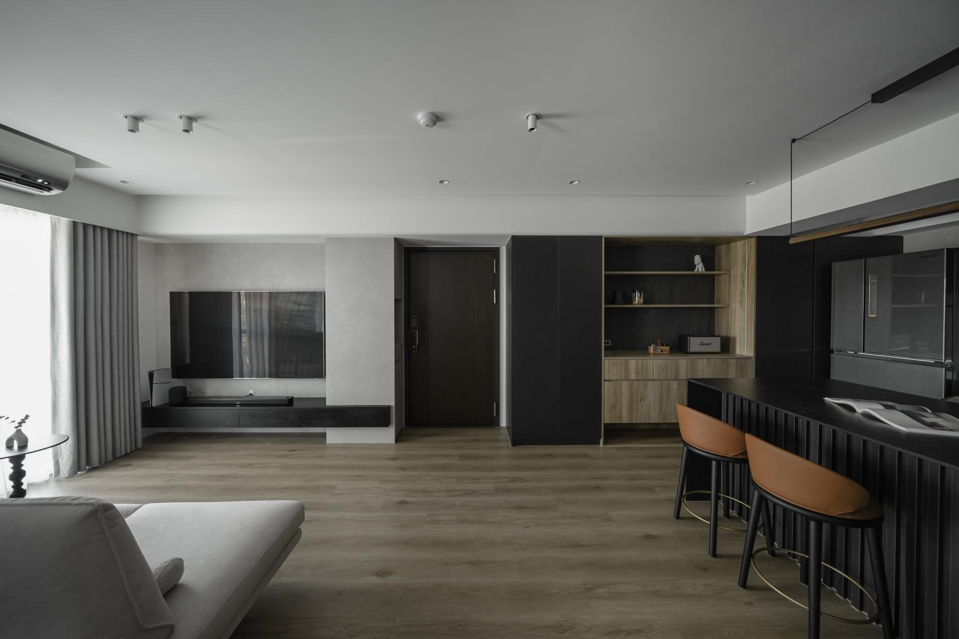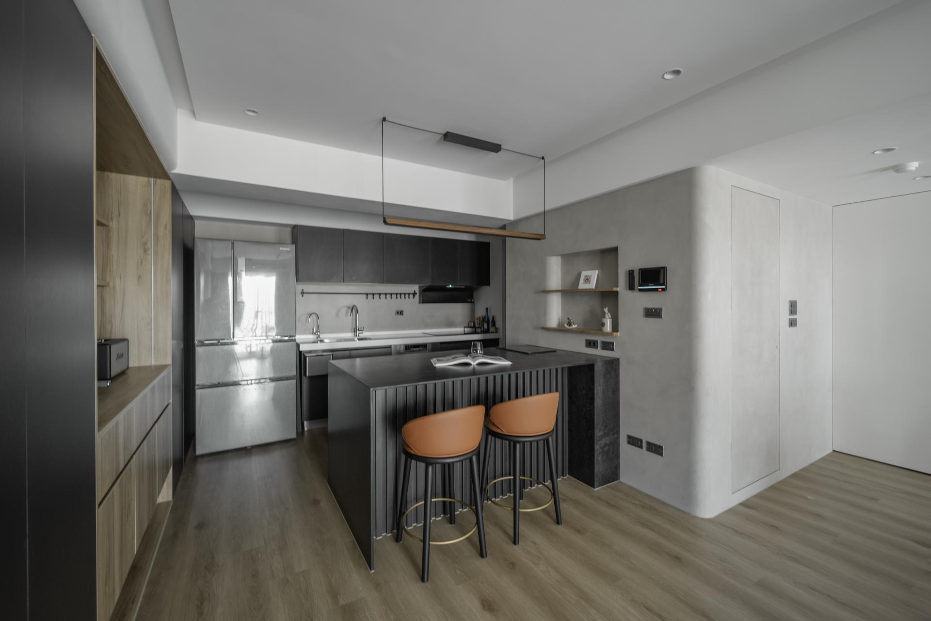 The designer implemented a sleek, imposing visual with understated dark tones in the living and dining spaces. Besides, tactile and solid building materials such as wood and stone reveal a natural vibe, allowing residents to soothe their bodies and minds and have an excellent living experience. Furthermore, the renovation reconfigured the original three-room layout, combined the original multifunction room with the public area, and associated pristine white with orange-red to line the surfaces. These bright and active color palettes create a striking focal point and stark contrast with the living room and dining space. At the same time, the concealed master bedroom echoes the vivid coloring design, differentiating the activeness of entertainment and work from a relaxing zone of repose.