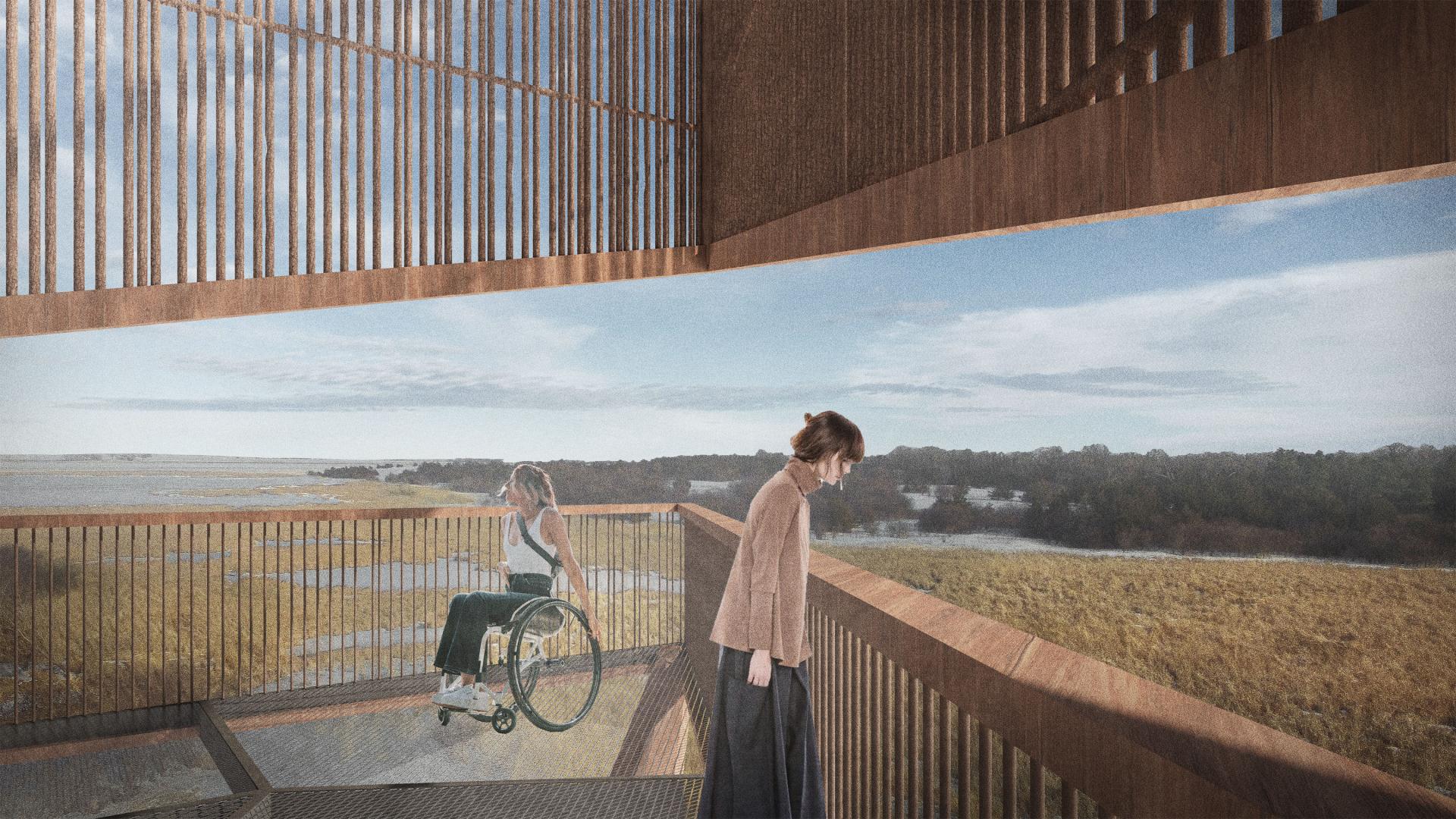 The crowning viewing platform integrates a latticed wooden screen composed of interwoven slats. Beyond providing shade, this screen enhances the tower’s visibility from adjacent transit routes and serves as a habitat-enhancing feature, offering perches for avian species. Such dual functionality underscores the project’s commitment to ecological integration.