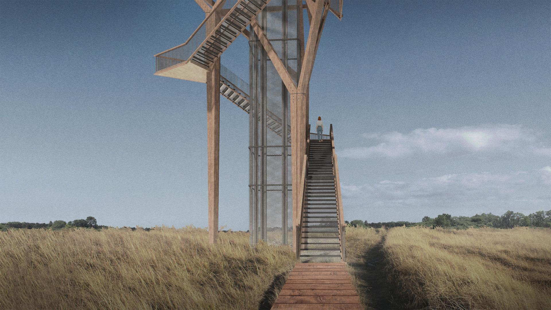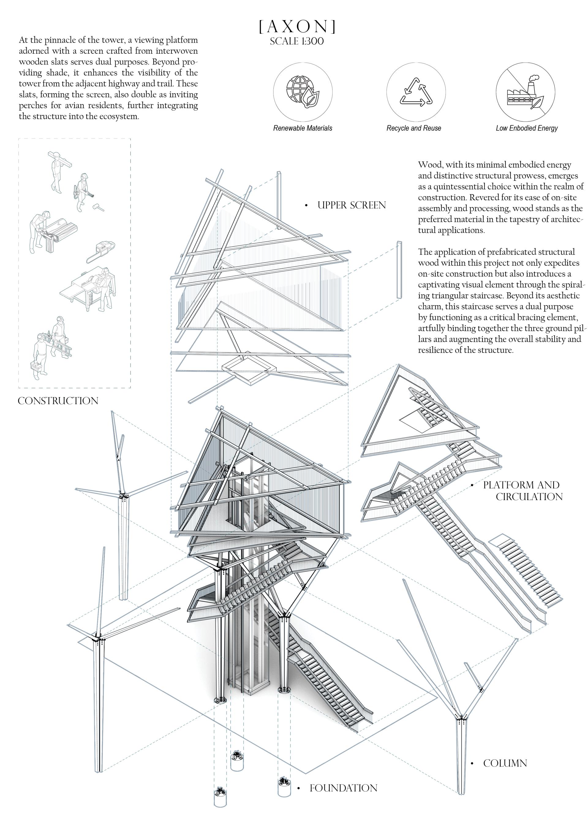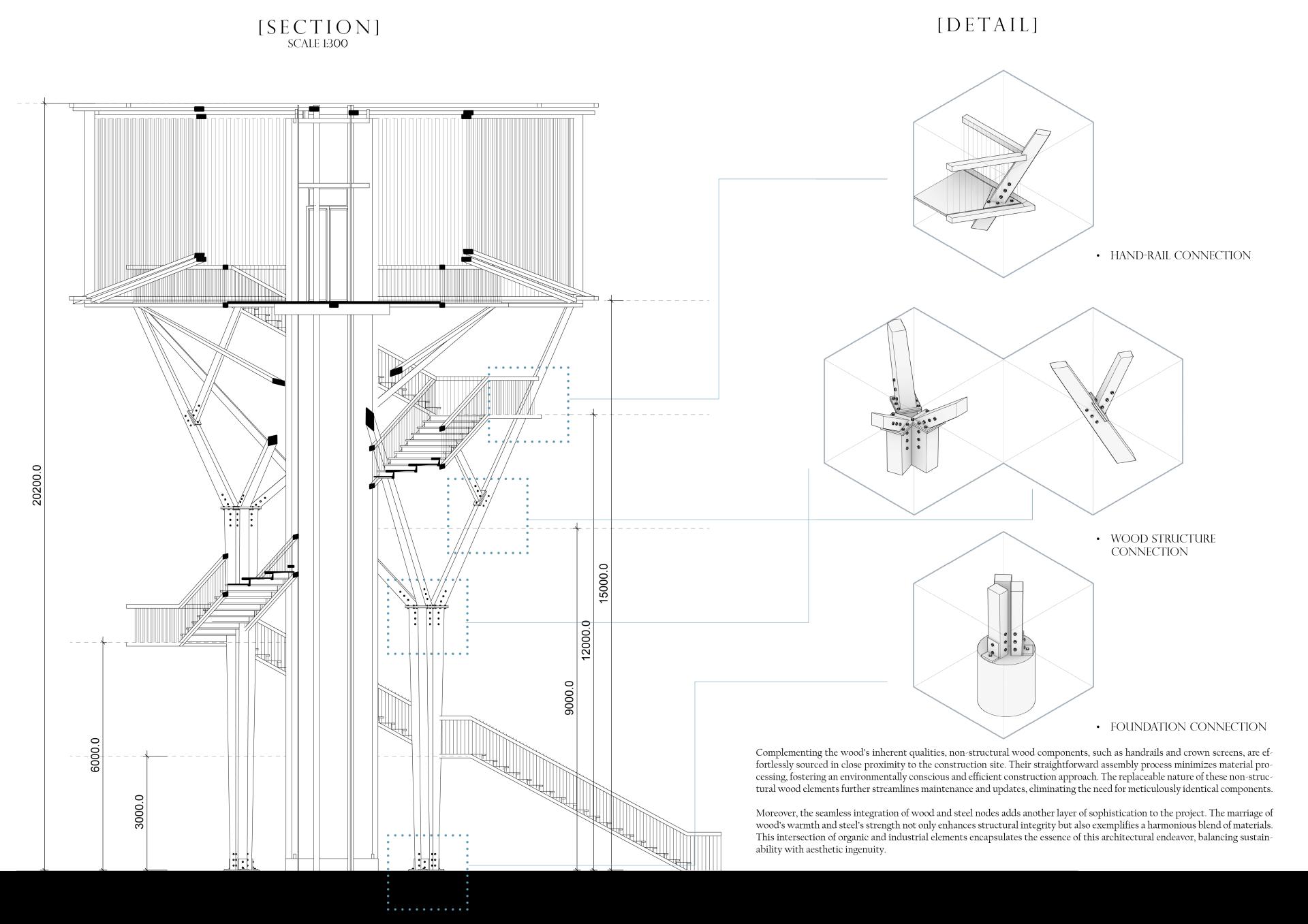 Situated within a landscape of ecological fragility and historical resonance, the proposed observation tower embodies a symbiotic relationship between architecture and context. Prioritizing minimal environmental disruption and cultural reverence, the design adopts wood as its primary material, aligning with the site’s ecological ethos while evoking historical continuity.