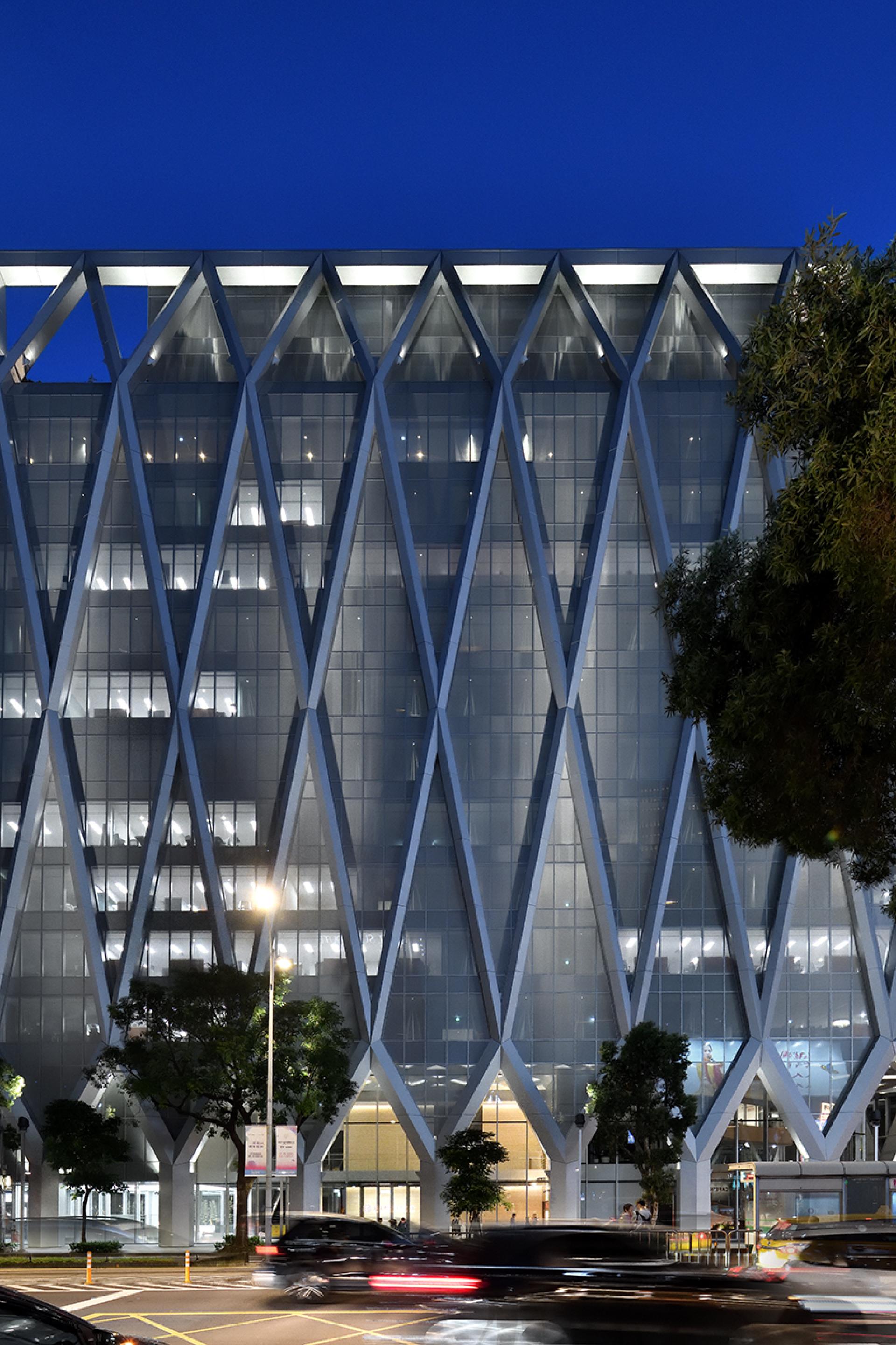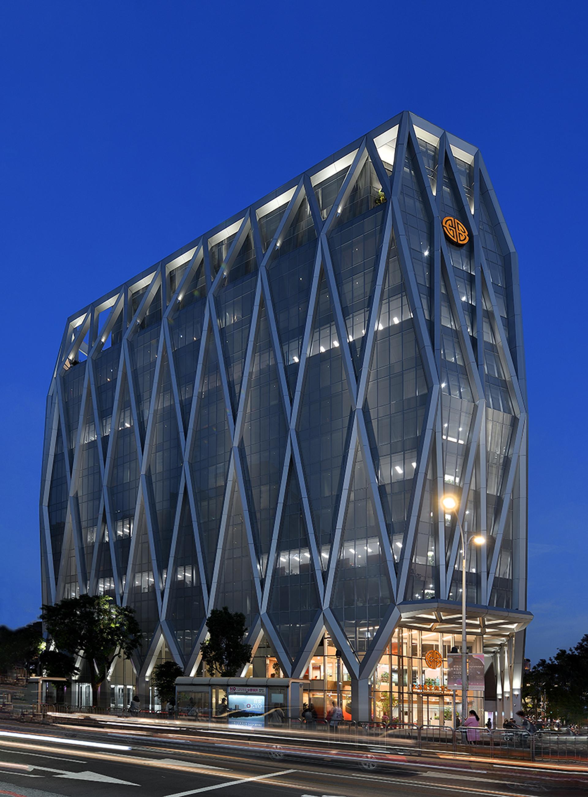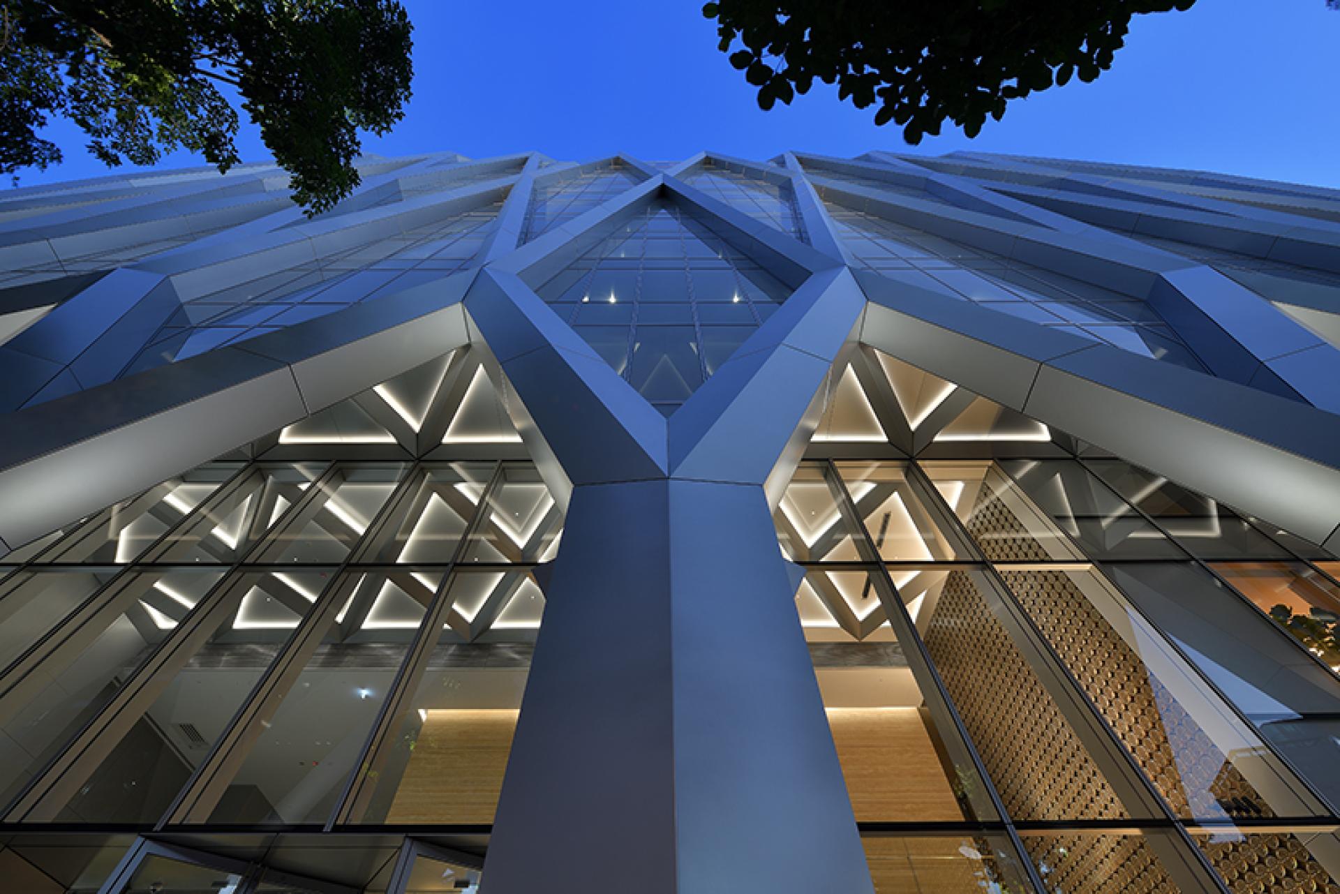 The architect envisioned this headquarters as a diamond, a unique landmark in the city. Surround with the concept, the architect develops intersecting geometric, light-colored metal mesh and glass to create a renovation, futuristic facade.