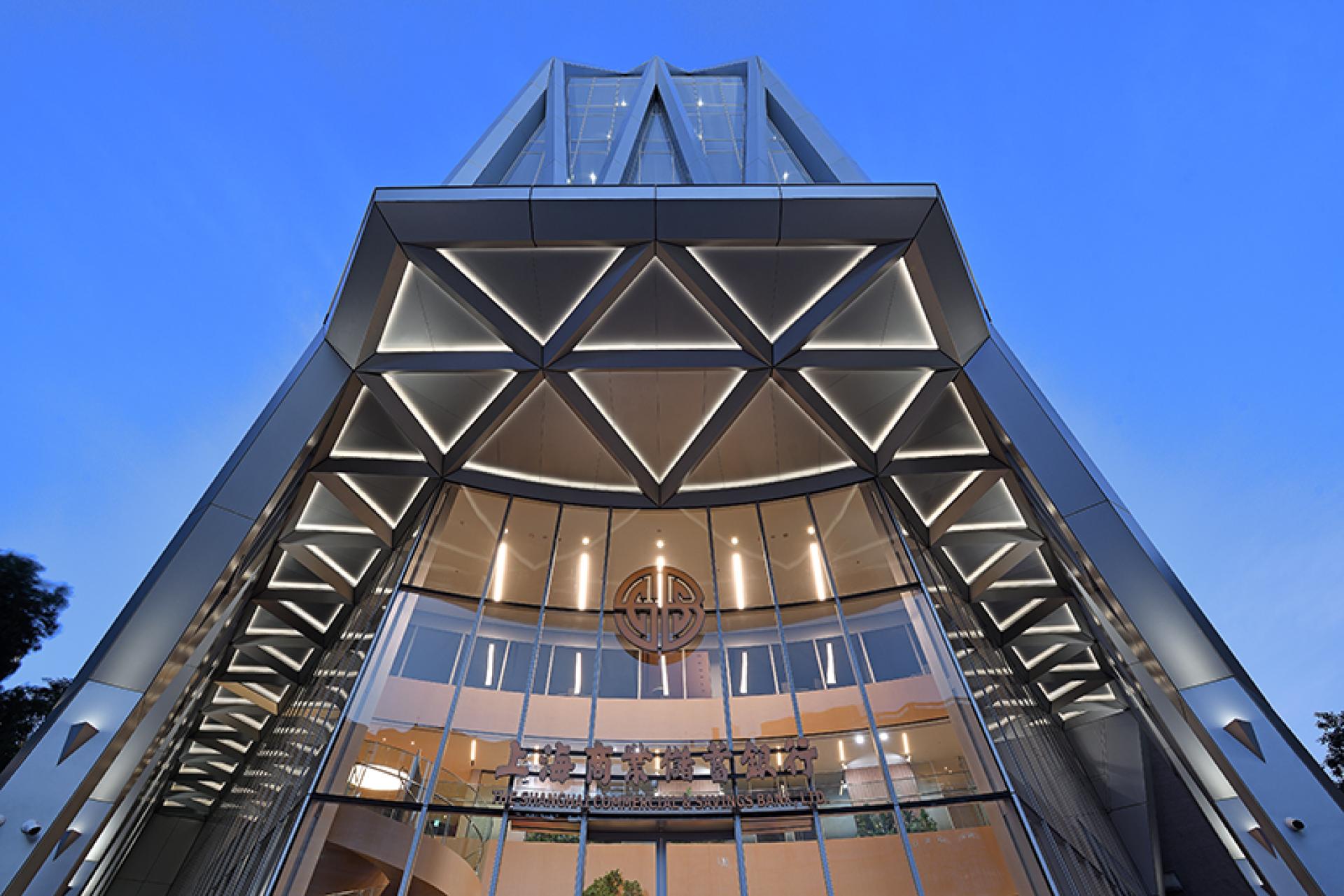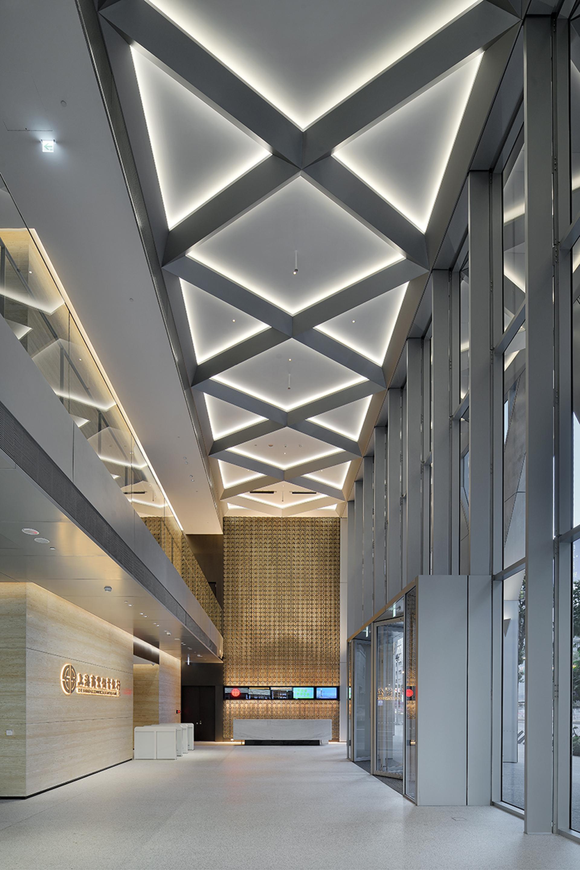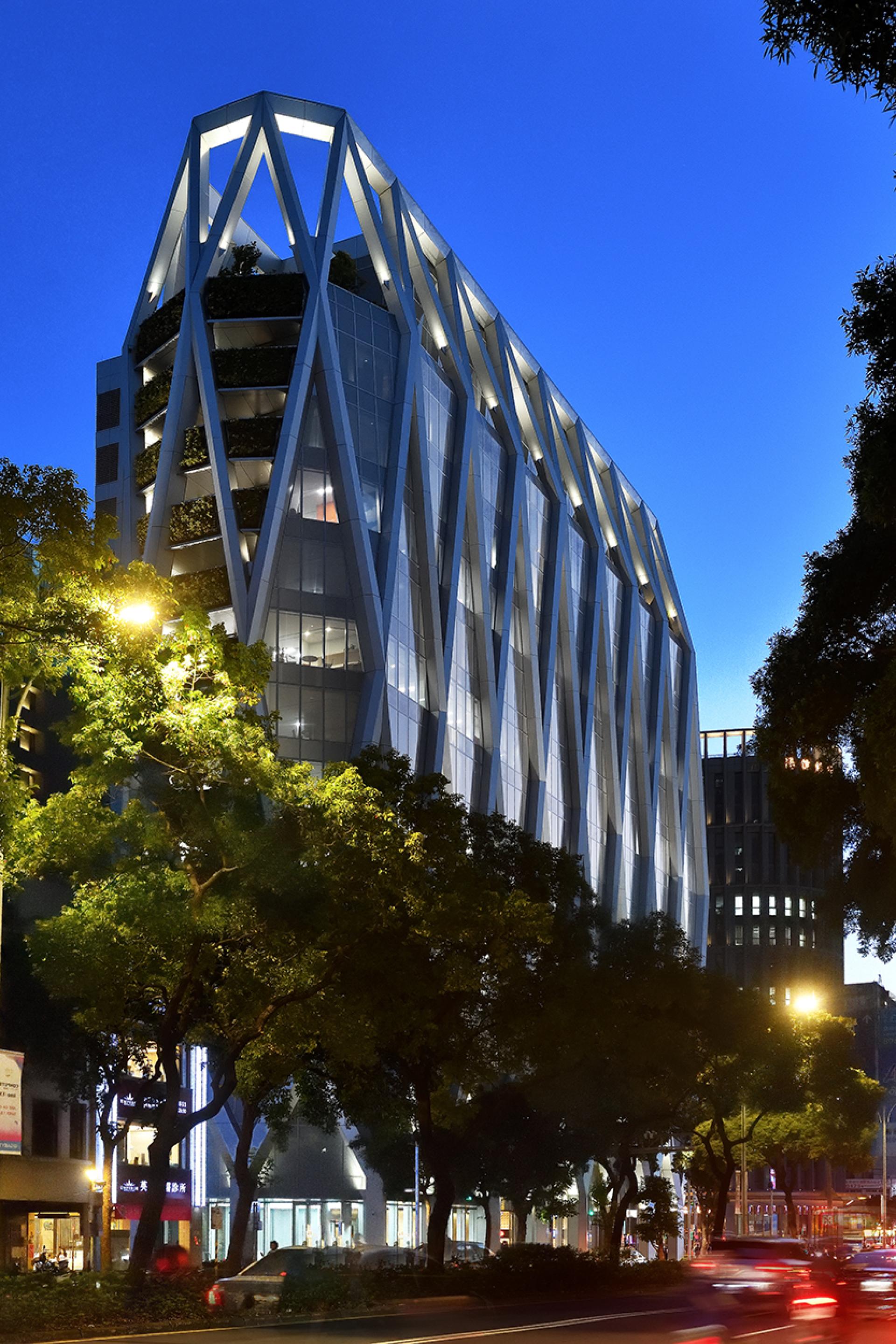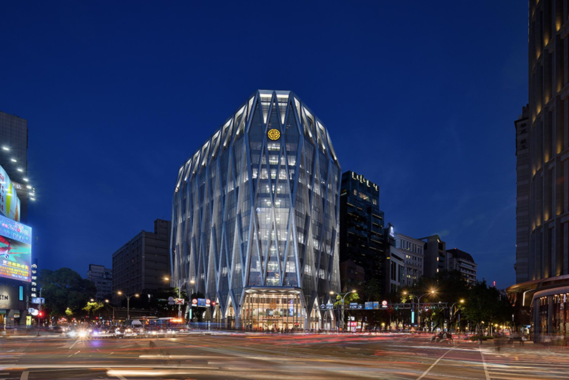 The architect envisioned this headquarters as a diamond, a unique landmark in the city. Surround with the concept, the architect develops intersecting geometric, light-colored metal mesh and glass to create a renovation, futuristic facade.