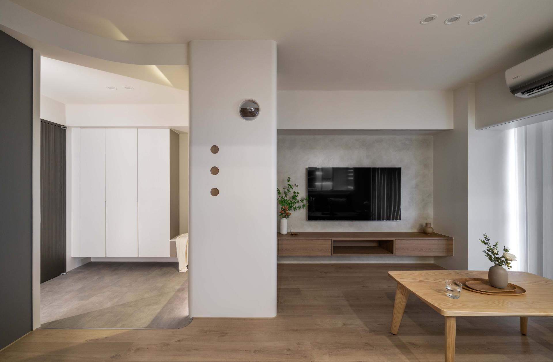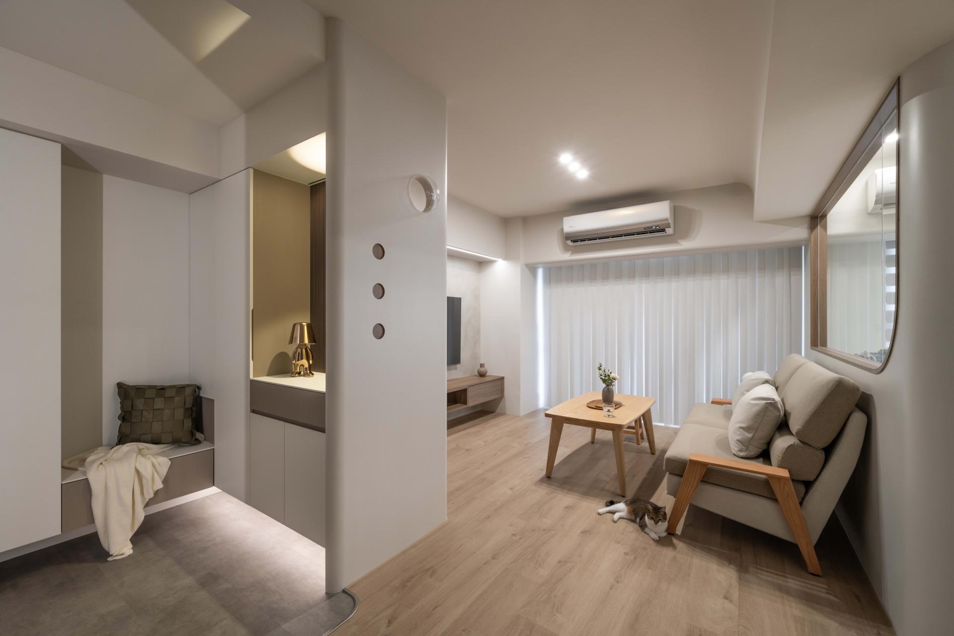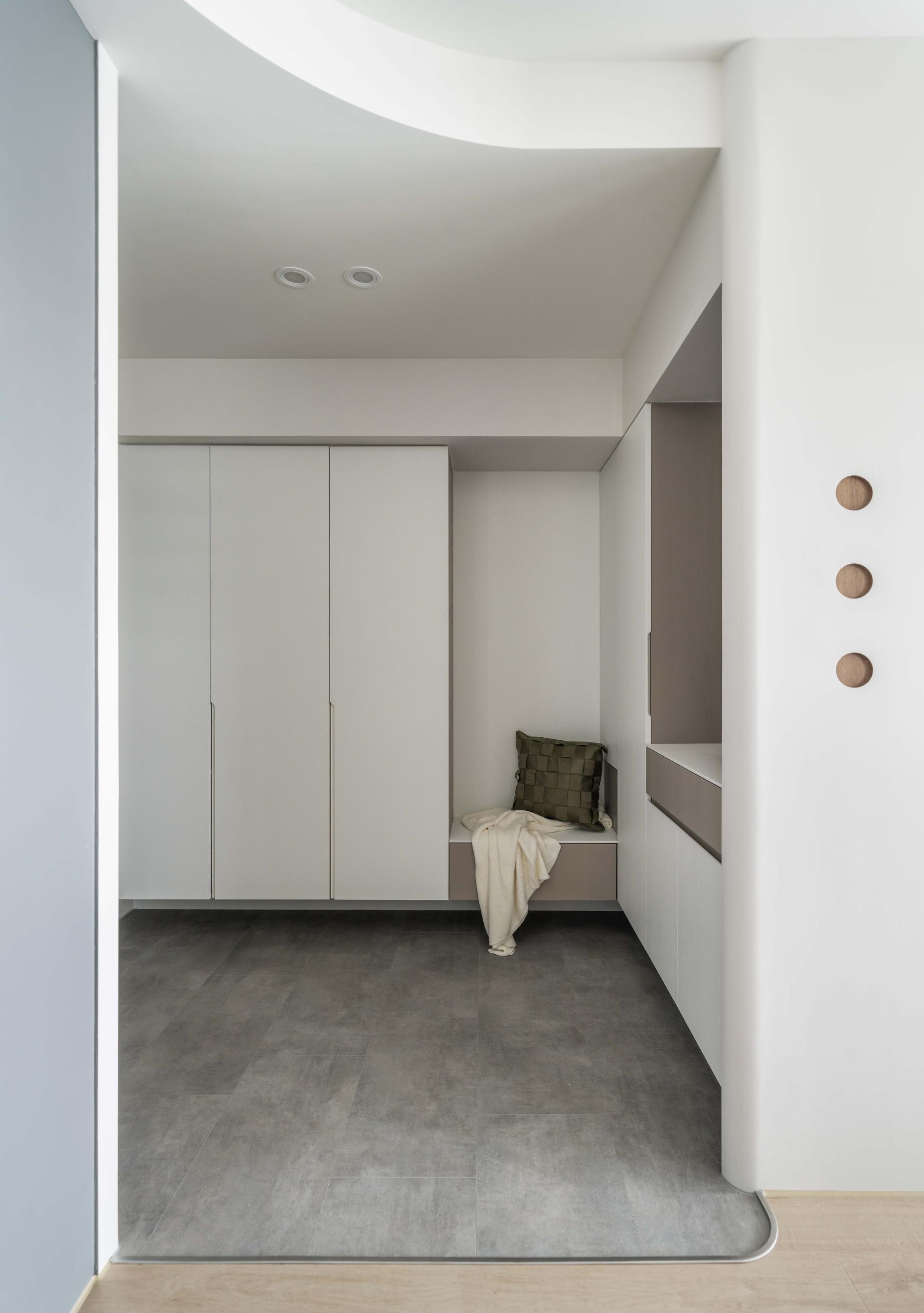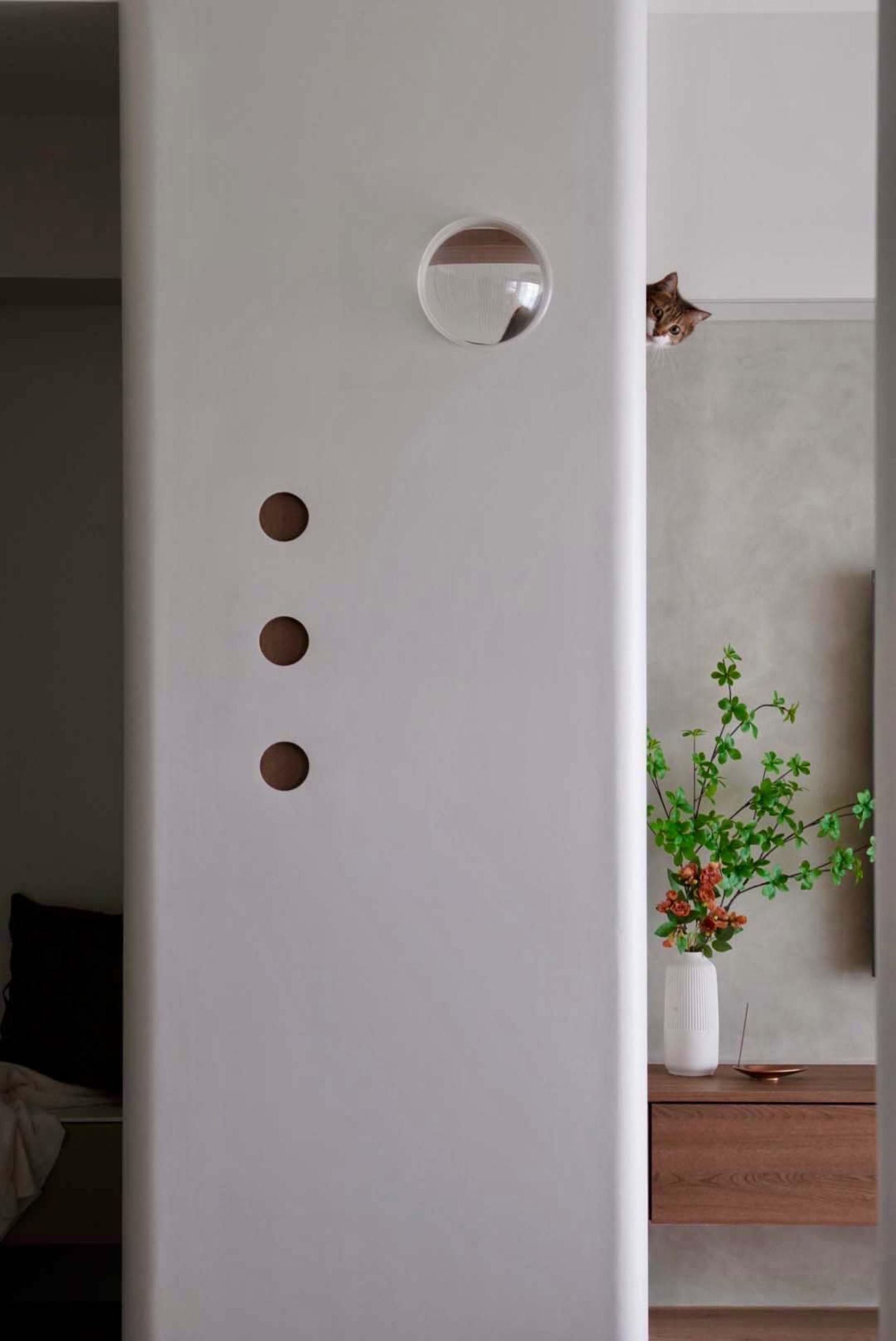In the design of Serene Arc Residence, special consideration has been given to both pet-friendly features and spatial practicality. The cat-friendly walls are coated with scratch-resistant paint, ensuring durability against daily pet activities while maintaining a clean and refined appearance. Additionally, magnetic paint is applied to the walls, allowing homeowners to effortlessly display daily reminders, notes, or cherished photos of their cats, adding both convenience and a touch of fun to daily life.