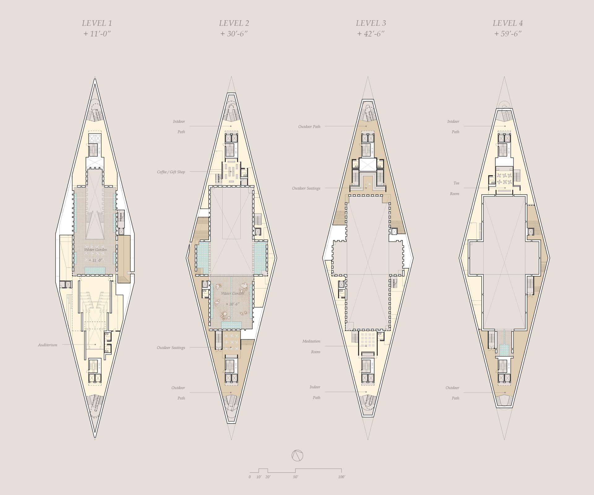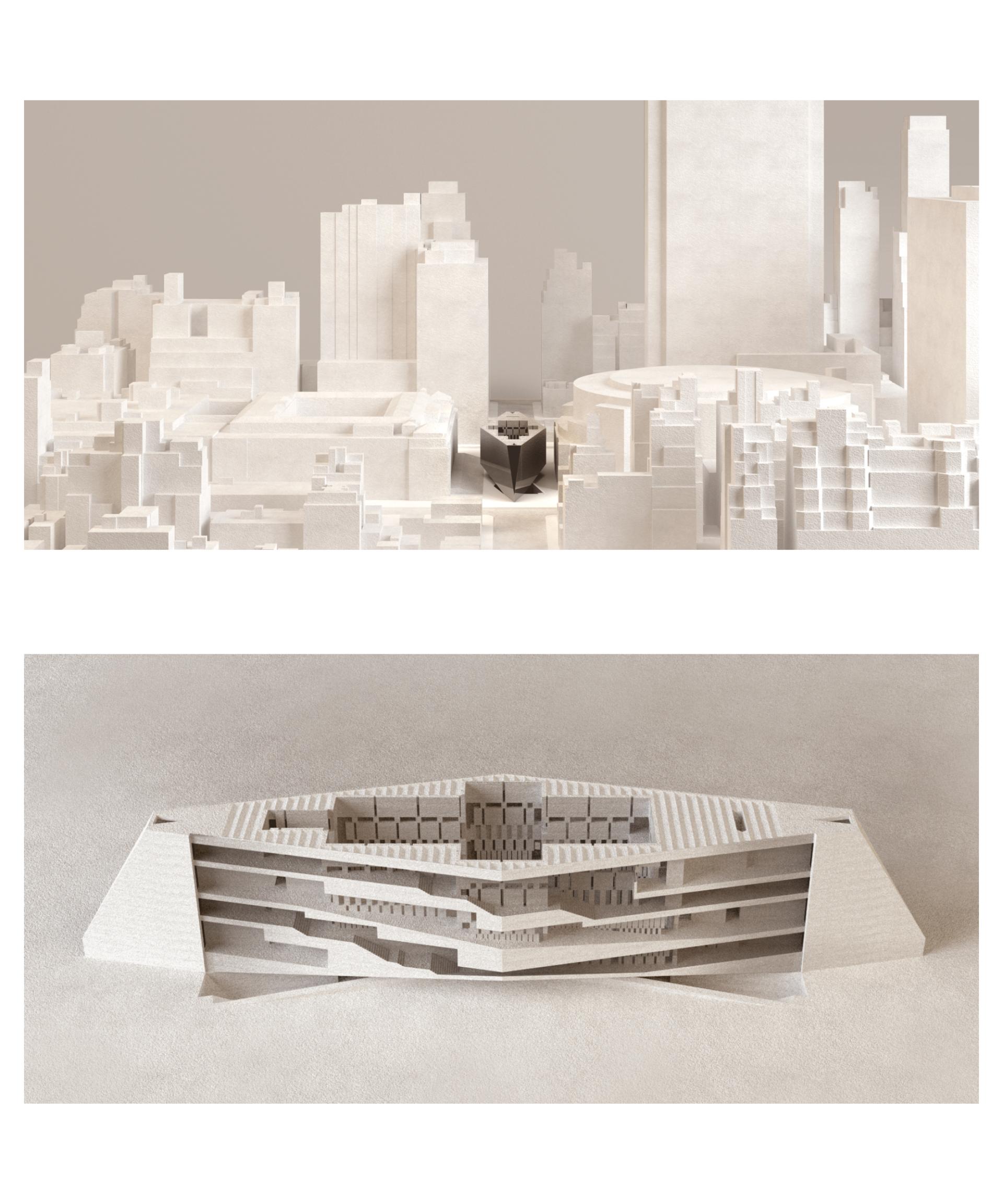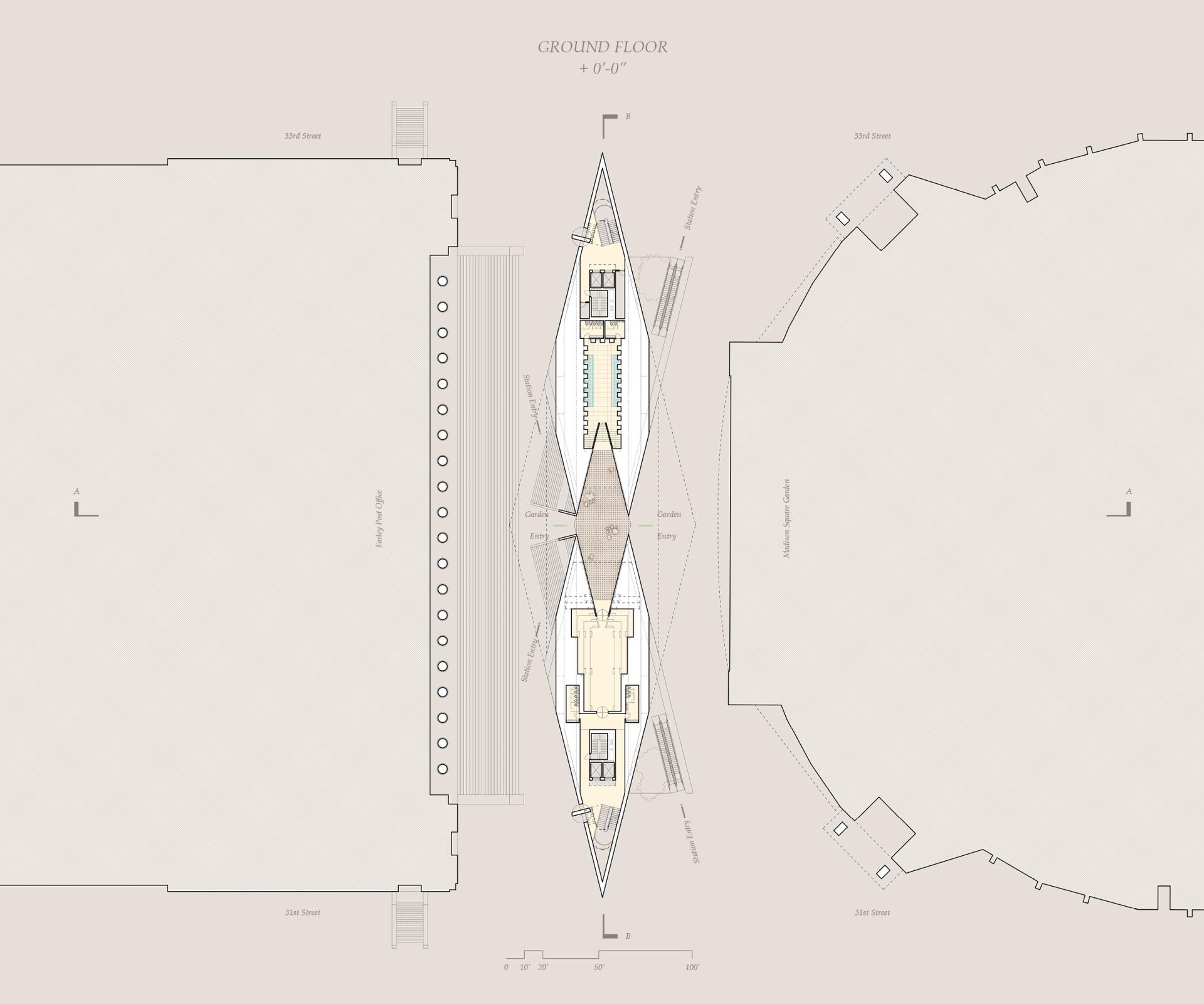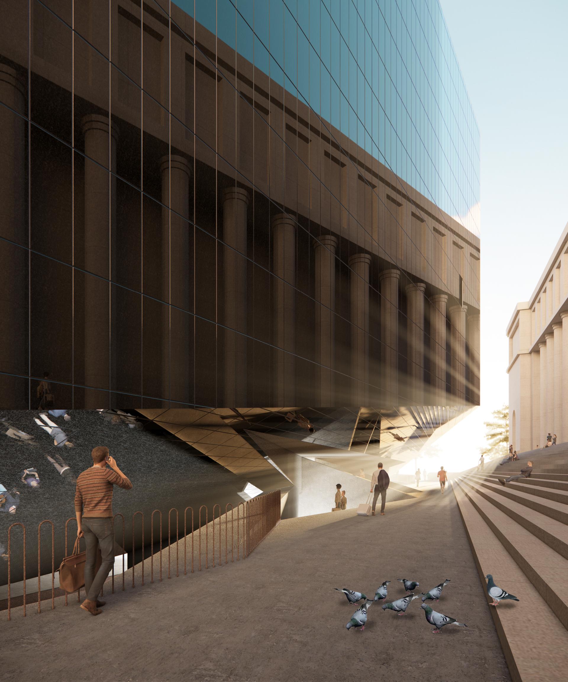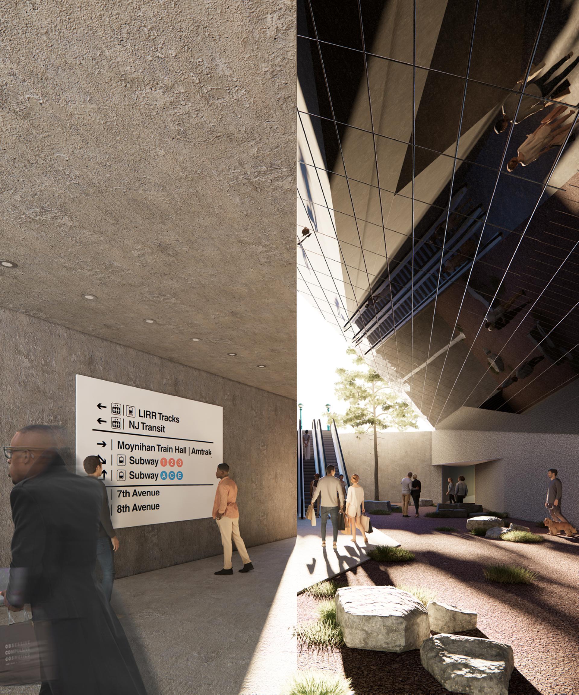 The memorial is a freestanding, diamond-like structure clad in black granite, a material traditionally reserved for monuments. Its reflective surface visually unites Madison Square Garden and the Farley Post Office, transforming into an evolving archive of the city's changing landscape. The structure is permeable, allowing public access while bridging past and present. Beneath it, an open concourse restores lost connectivity and grandeur, with angled surfaces enhancing visual and physical links to lower levels.