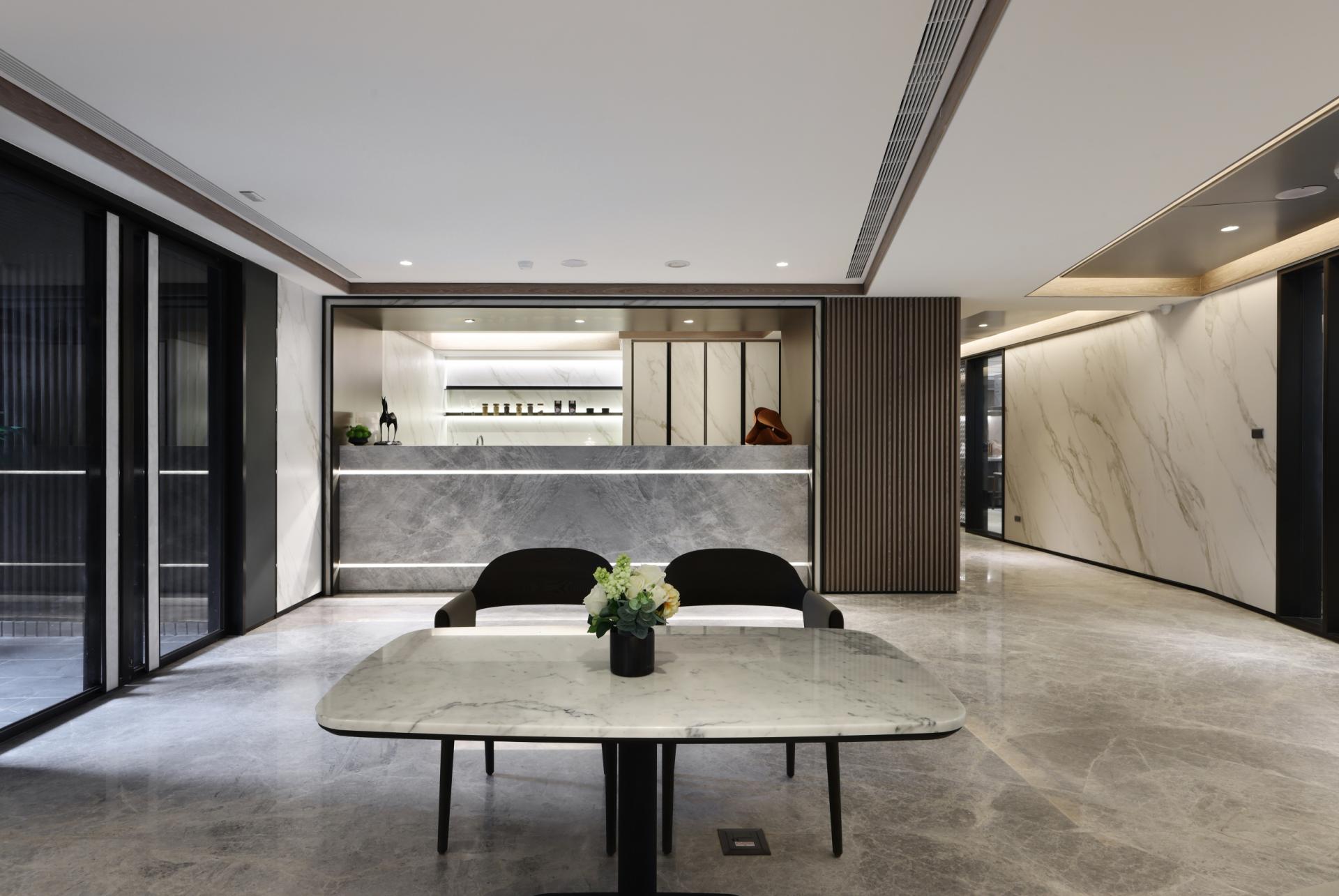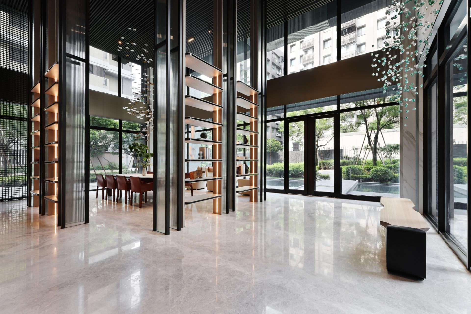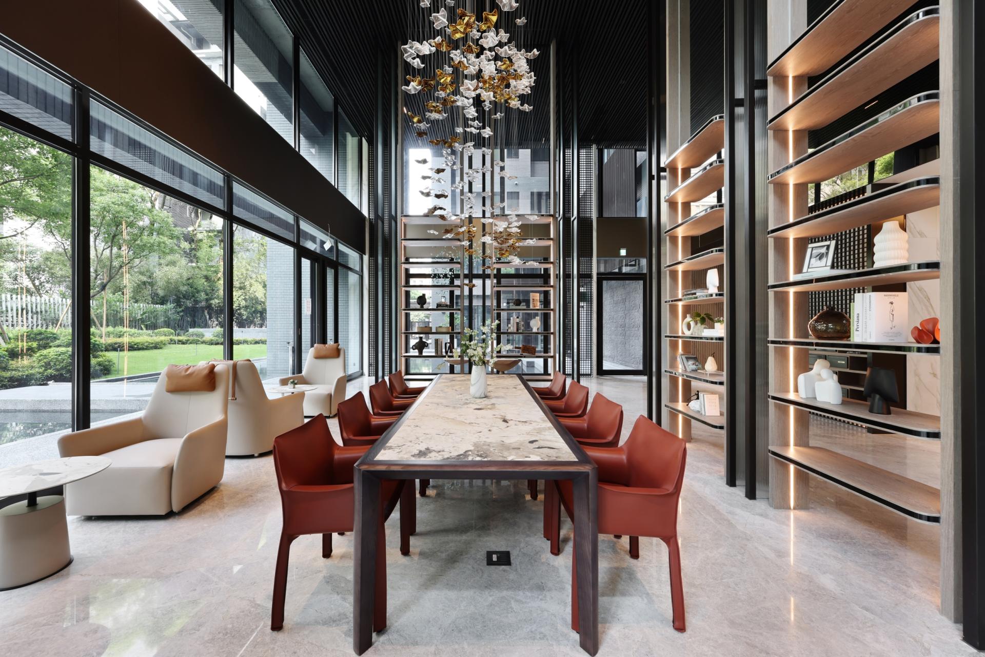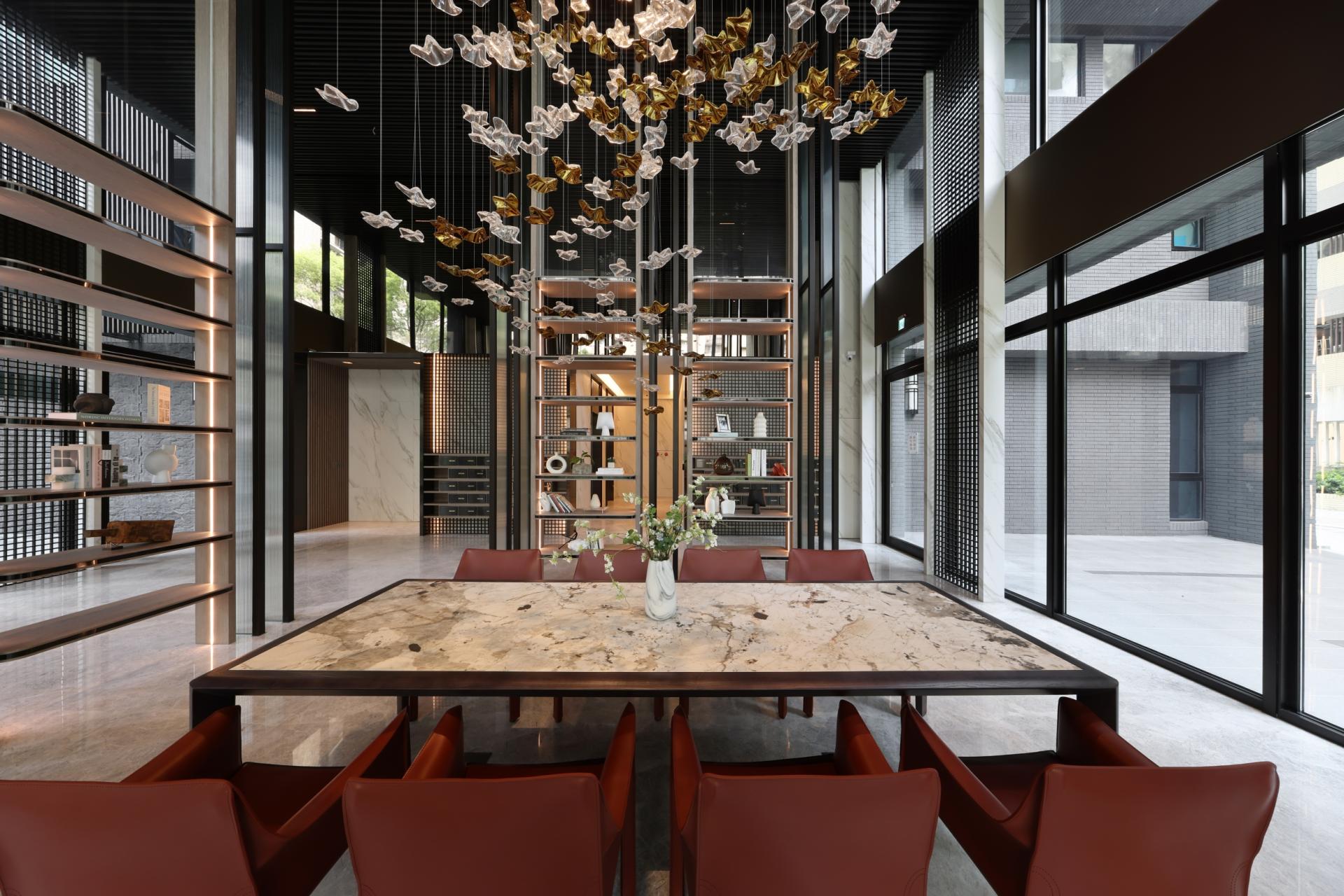 The overall design presents a striking interplay between macroscopic symmetrical forms and intricate microscopic details, captivating the senses. In the main space, the design team skillfully crafted an open layout that seamlessly unites the reception area, lounge, and meeting spaces. Employing a sophisticated screen shelf design, they effectively delineated each functional area while ensuring a harmonious visual flow across the entire room. Furthermore, the ambiance is further elevated by expansive floor-to-ceiling windows that flood the space with natural light, fostering a deep connection between the indoor environment and the surrounding outdoor landscape. These window frames serve as artistic borders, transforming the vibrant greenery, shimmering water, and changing light outside into a dynamic, immersive piece of artwork. This not only enhances the aesthetic appeal but also fosters a dialogue between nature, the architectural space, and its inhabitants.