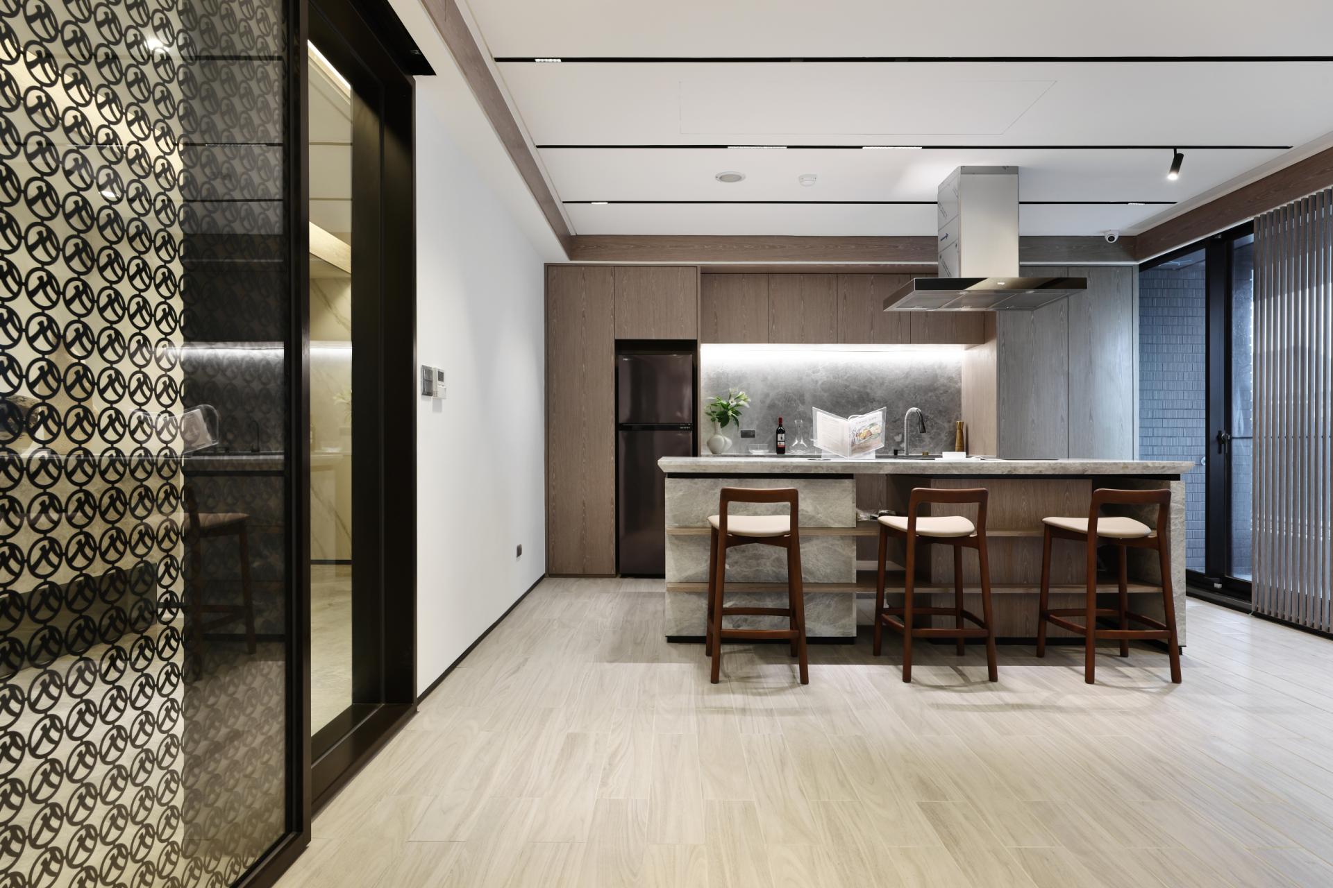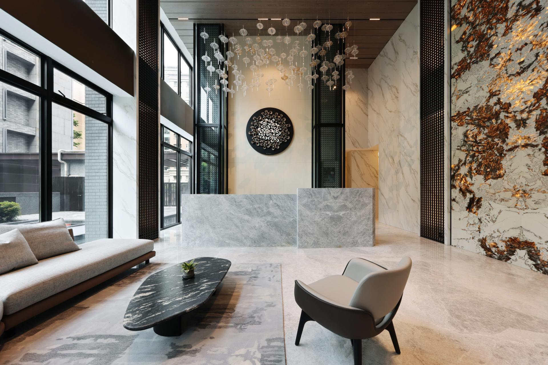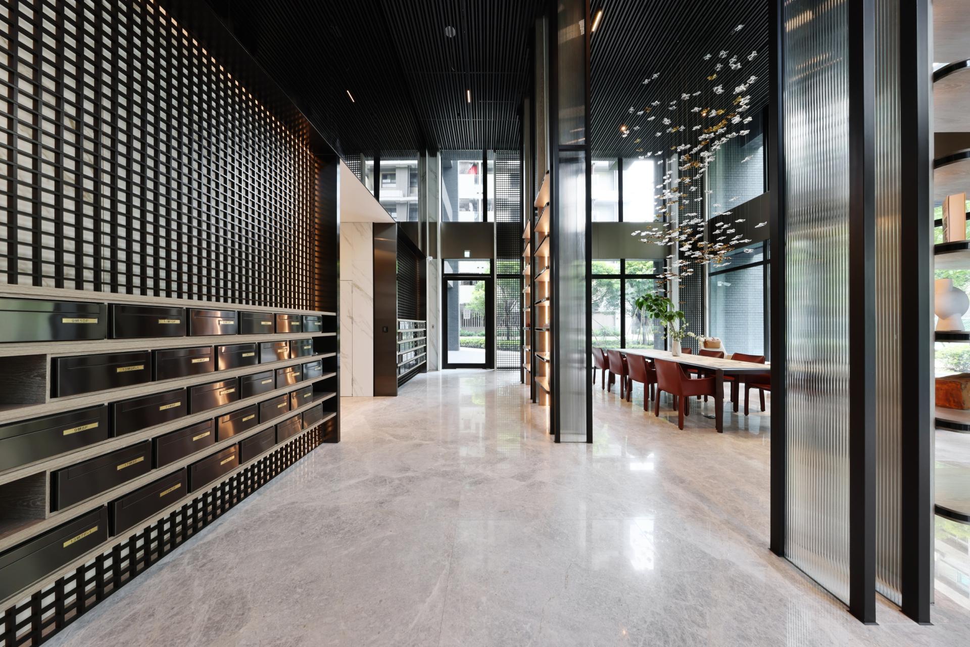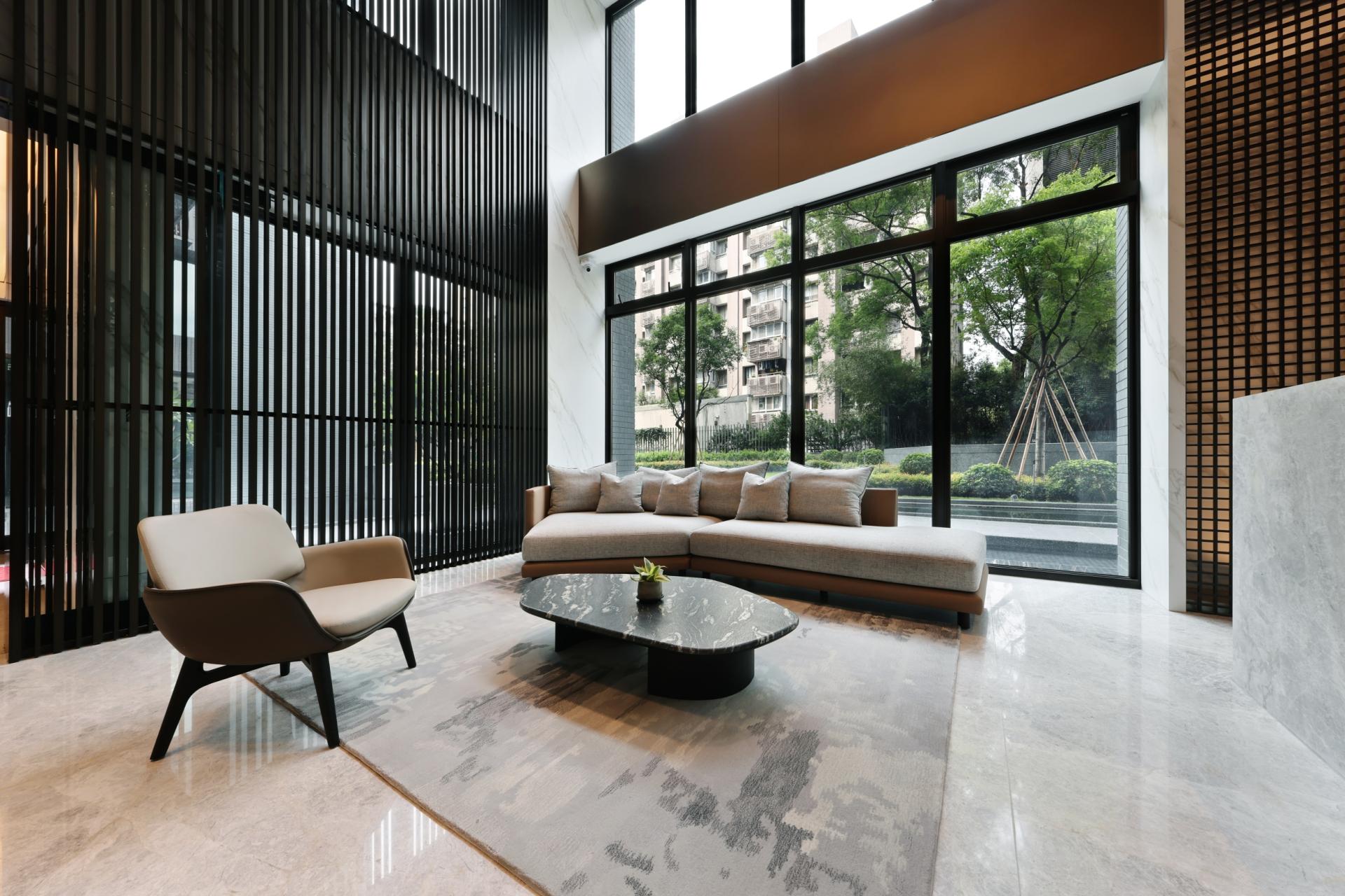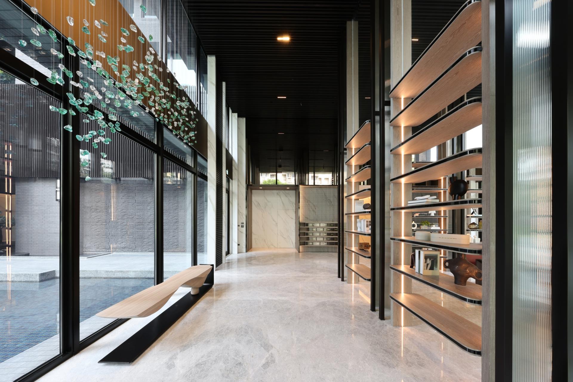 The overall design presents a striking interplay between macroscopic symmetrical forms and intricate microscopic details, captivating the senses. In the main space, the design team skillfully crafted an open layout that seamlessly unites the reception area, lounge, and meeting spaces. Employing a sophisticated screen shelf design, they effectively delineated each functional area while ensuring a harmonious visual flow across the entire room. Furthermore, the ambiance is further elevated by expansive floor-to-ceiling windows that flood the space with natural light, fostering a deep connection between the indoor environment and the surrounding outdoor landscape. These window frames serve as artistic borders, transforming the vibrant greenery, shimmering water, and changing light outside into a dynamic, immersive piece of artwork. This not only enhances the aesthetic appeal but also fosters a dialogue between nature, the architectural space, and its inhabitants.