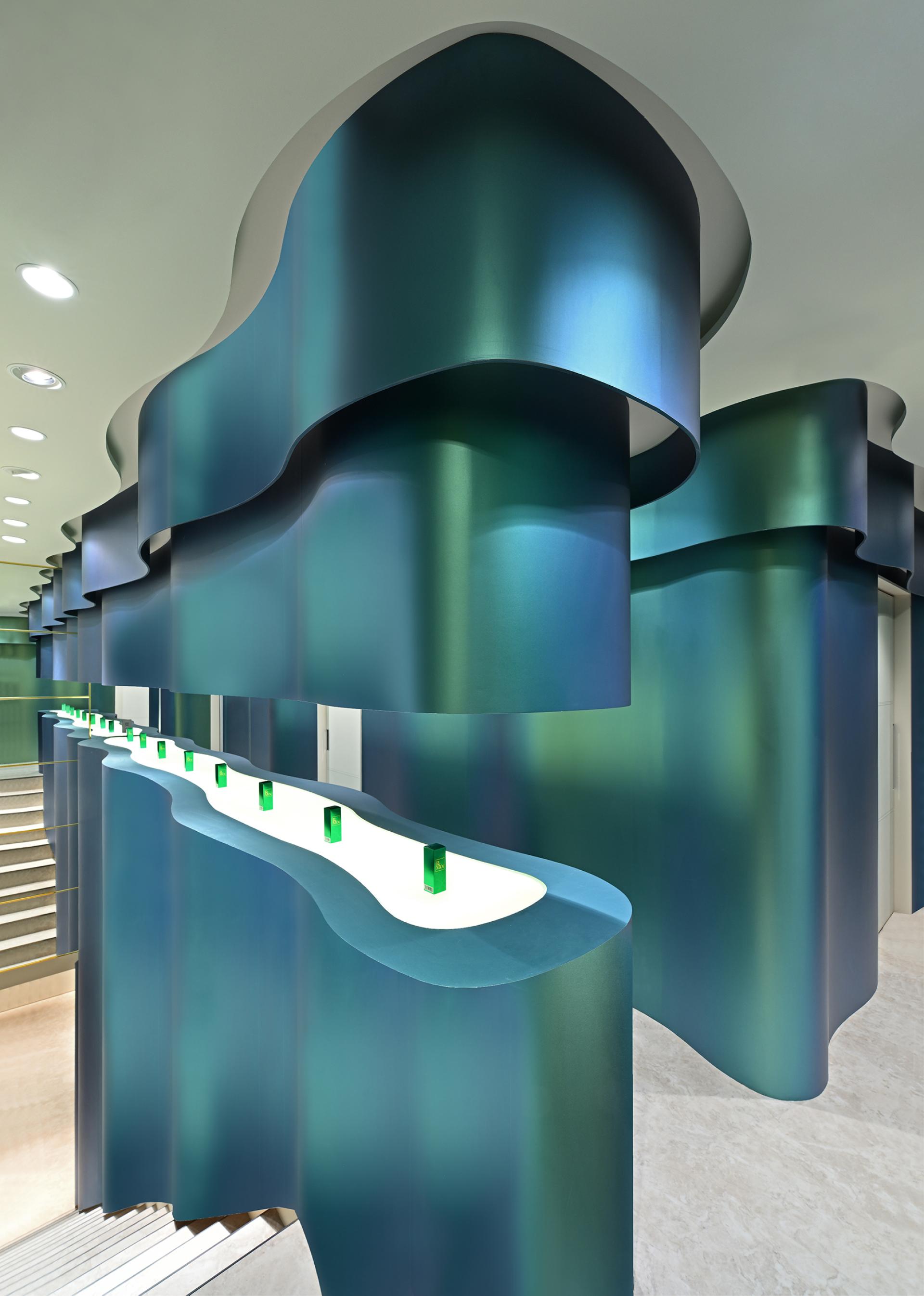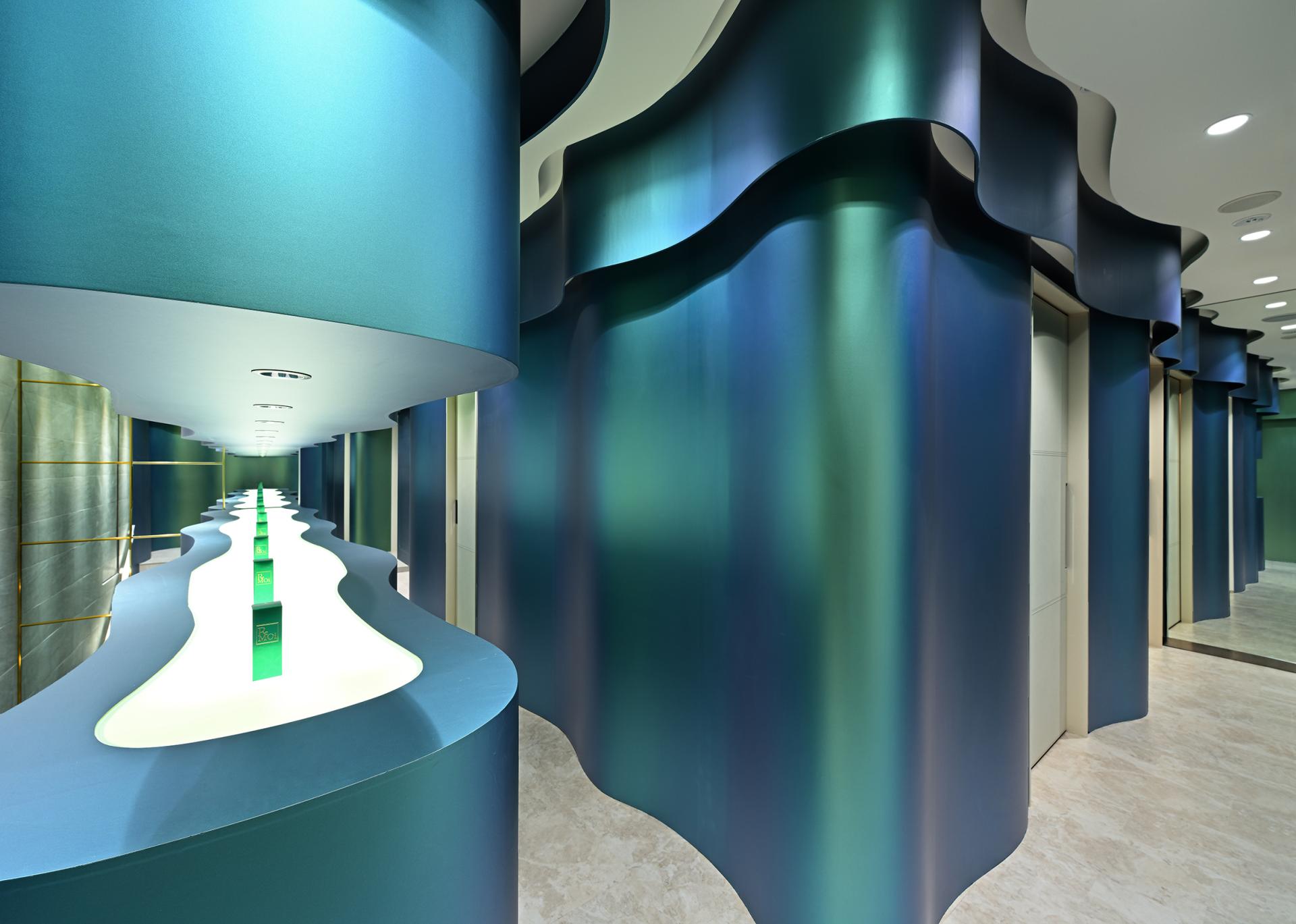 The design concept is "undulation" and we express the current of the times with the curvy walls and counter of metallic green. It is a homage to those executives who worked hard and contributed to the society. By using DI-NOC polarizing film of metallic green made the design dynamic and gives people nice quality of impact. Each private room has different concept like “Japanese Setting” “Small Undulation” “Imagining door” and “White Rose,” and we designed each room based on each concept.