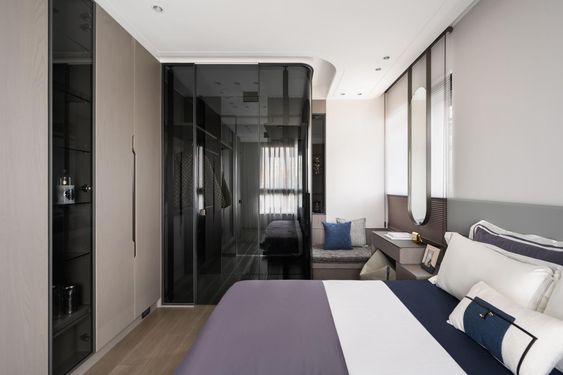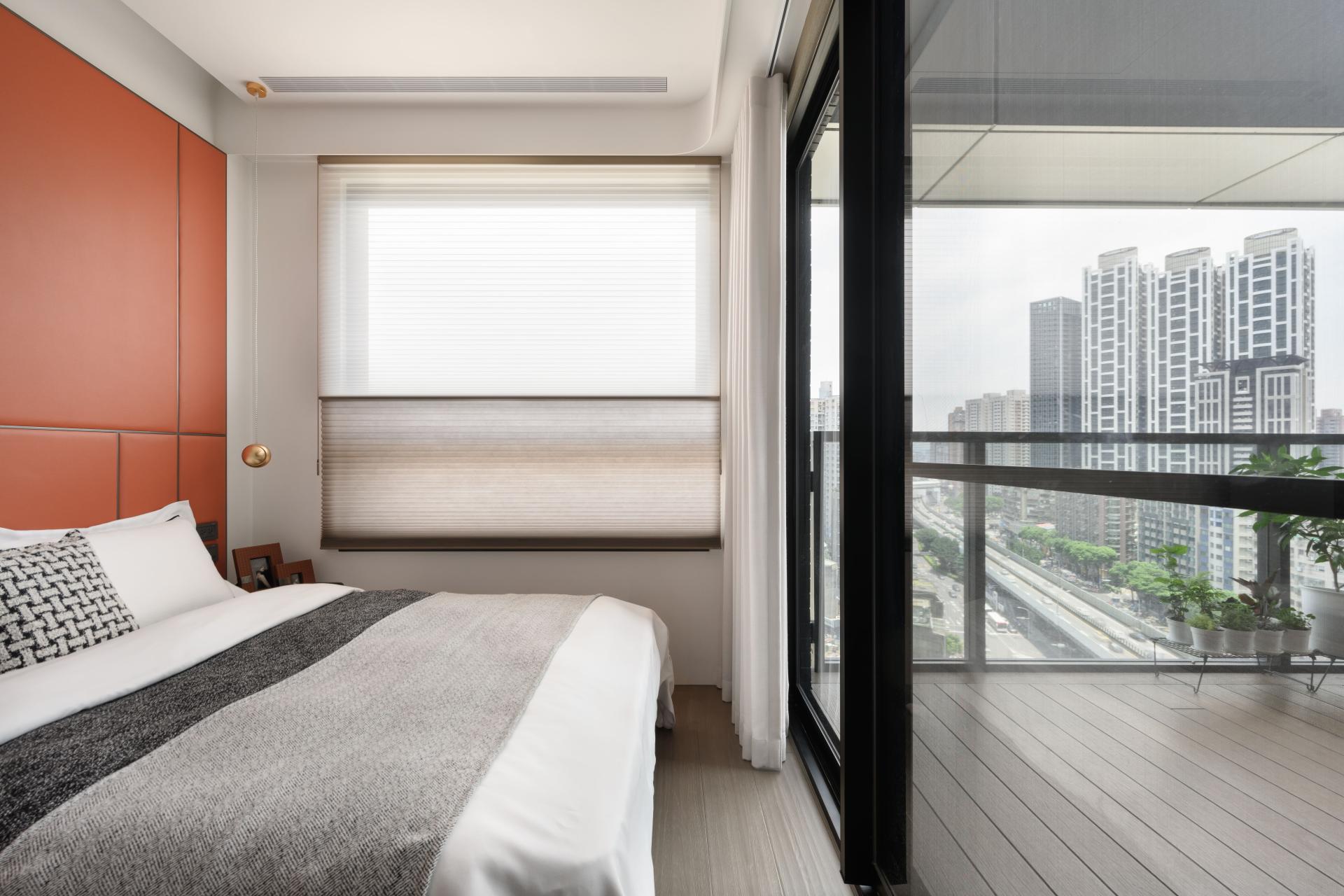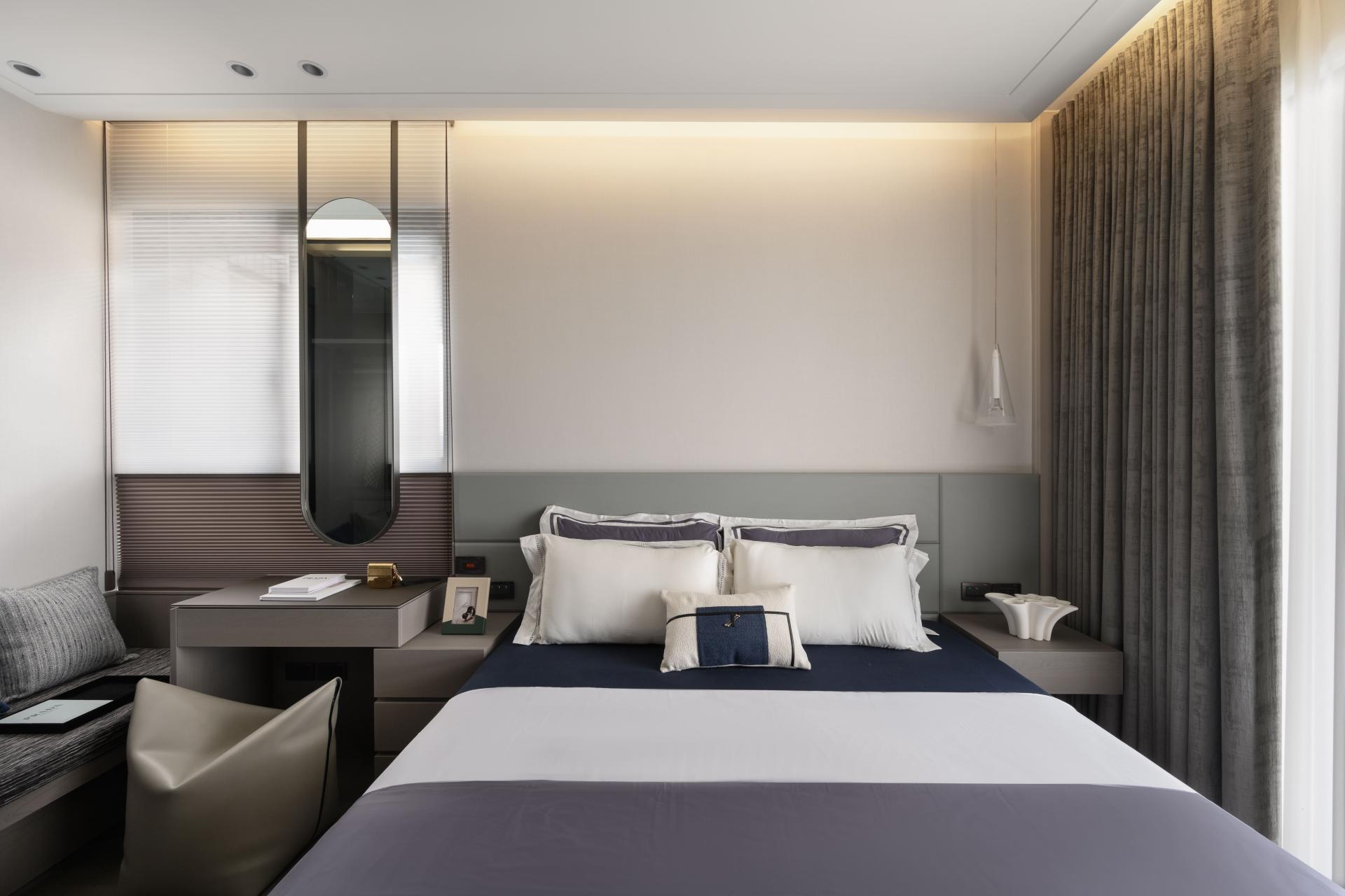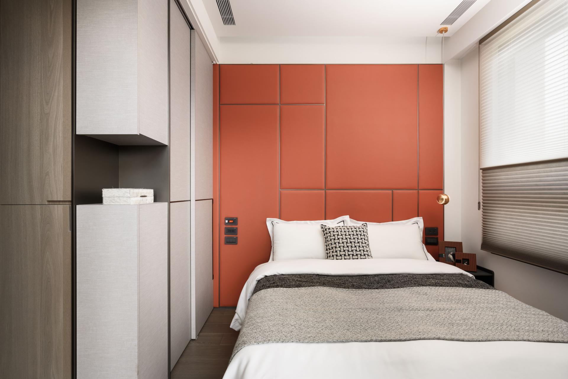 Beyond personal style, the design integrates emotional connections to family. While the homeowner desires a calm and elegant atmosphere, he also considers his mother, who occasionally stays over. To accommodate her, a guest bedroom features an Hermès orange accent wall, adding warmth and vibrancy to the space. This striking contrast with the apartment’s overall subdued palette introduces depth and visual interest, symbolizing the balance between rationality and sentiment. The design not only reflects the homeowner’s refined aesthetic but also preserves a welcoming ambiance for family. Meanwhile, the master bedroom embraces a more understated approach, utilizing clean lines and rich textures to cultivate a tranquil and sophisticated retreat, offering the perfect personal sanctuary.