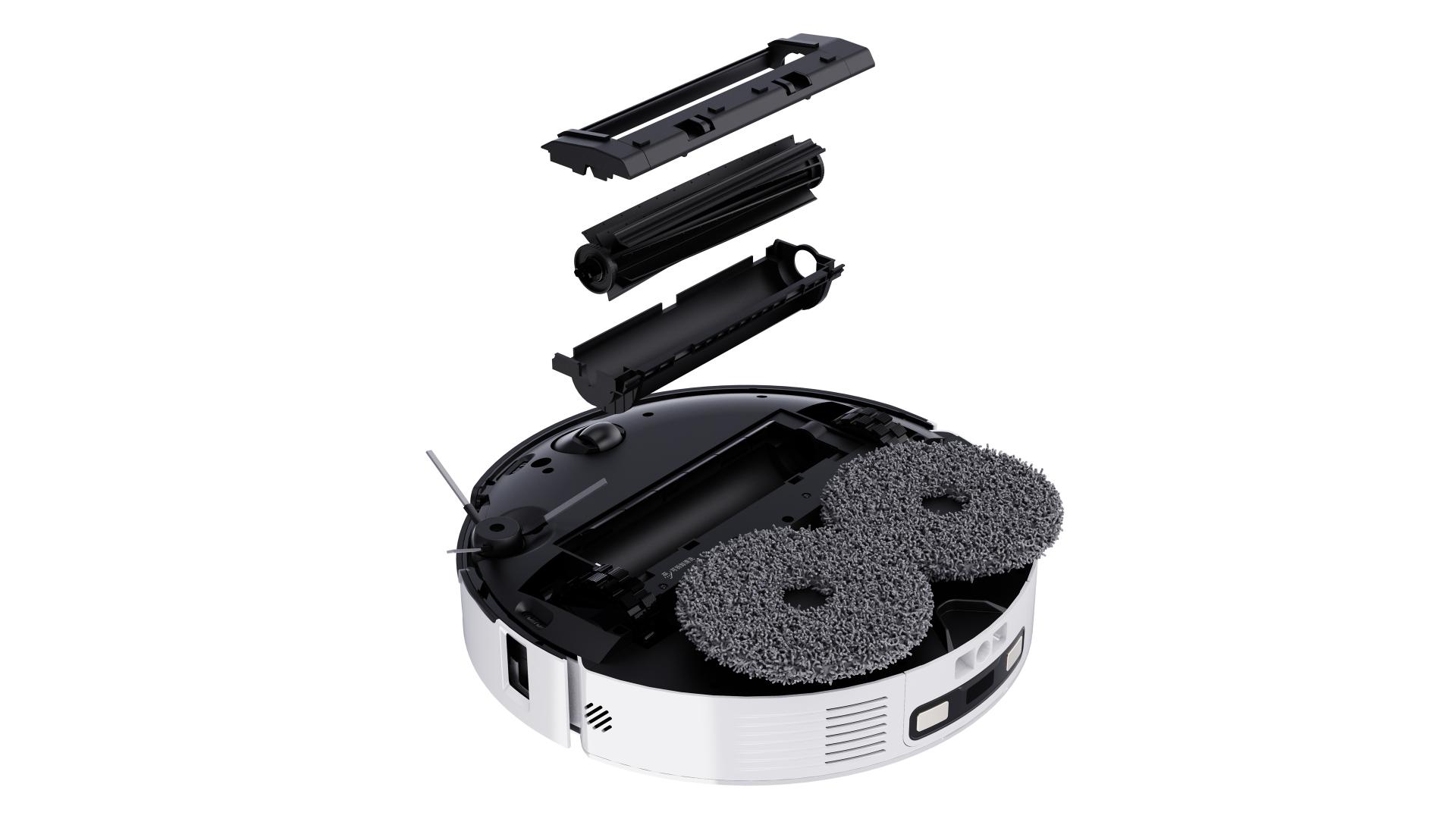 The product’s exterior is crafted using Boolean geometric principles, integrating operations such as intersection, subtraction, and union to create a distinctive brand identity. Both the main unit and base station feature symmetrical gradient surfaces and sharp edge detailing, achieving a sleek, geometric, and futuristic aesthetic. The bold, angular lines enhance the product’s technological appeal while reinforcing brand recognition, perfectly aligning with the Boolean cloud brand philosophy.Detachable Main Brush Chamber: A pioneering design in the robotic vacuum industry, allowing users to remove the brush chamber easily. This prevents dirt accumulation that could impact performance, significantly improving maintenance convenience.