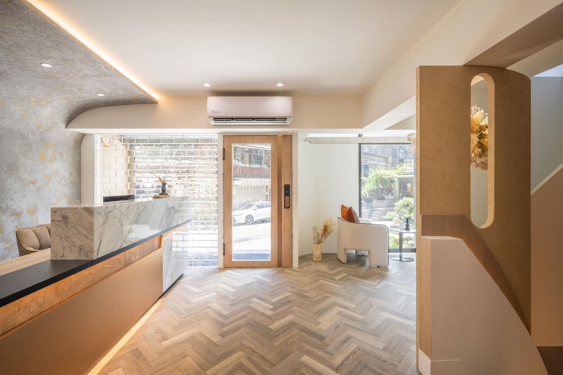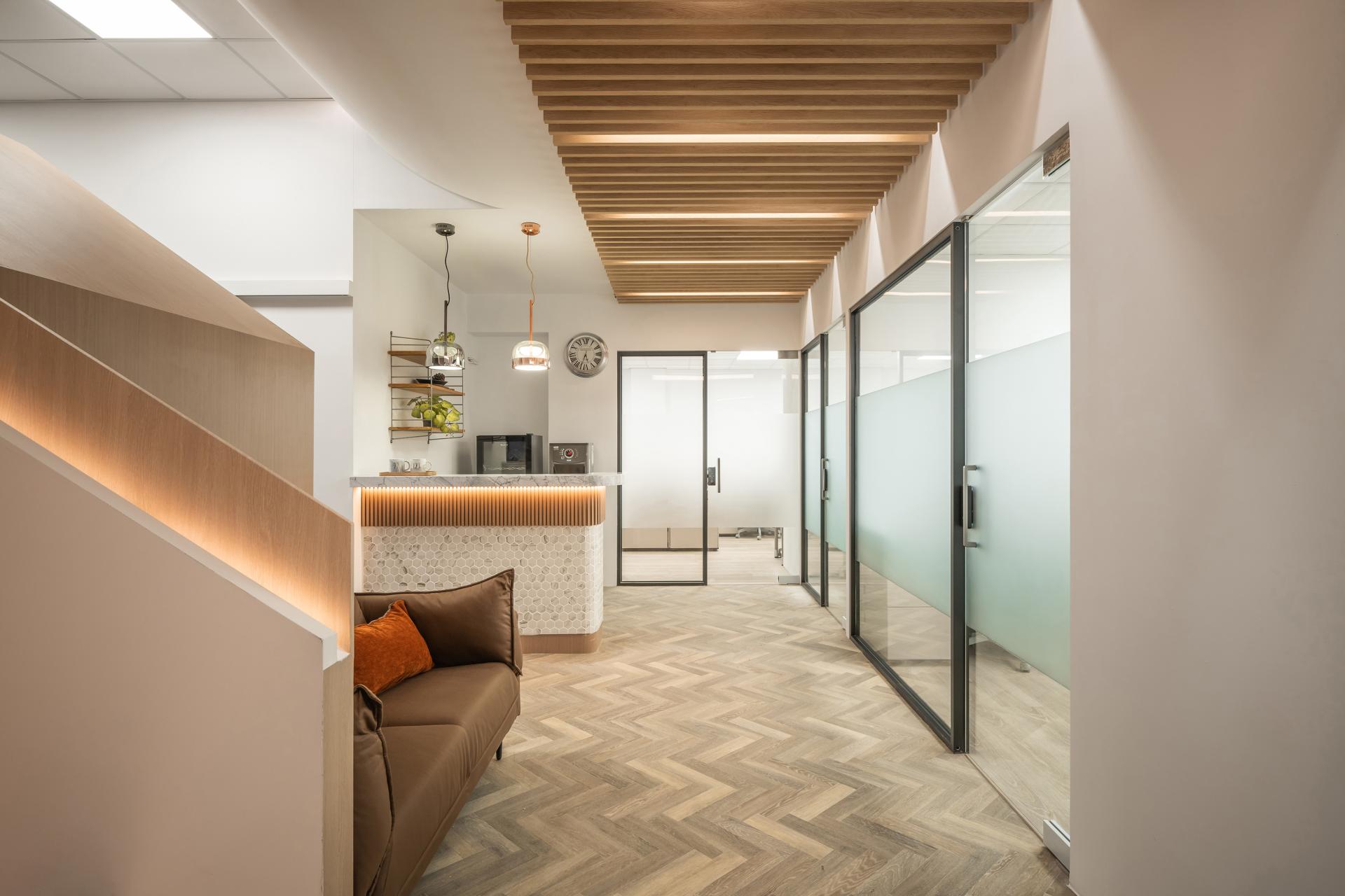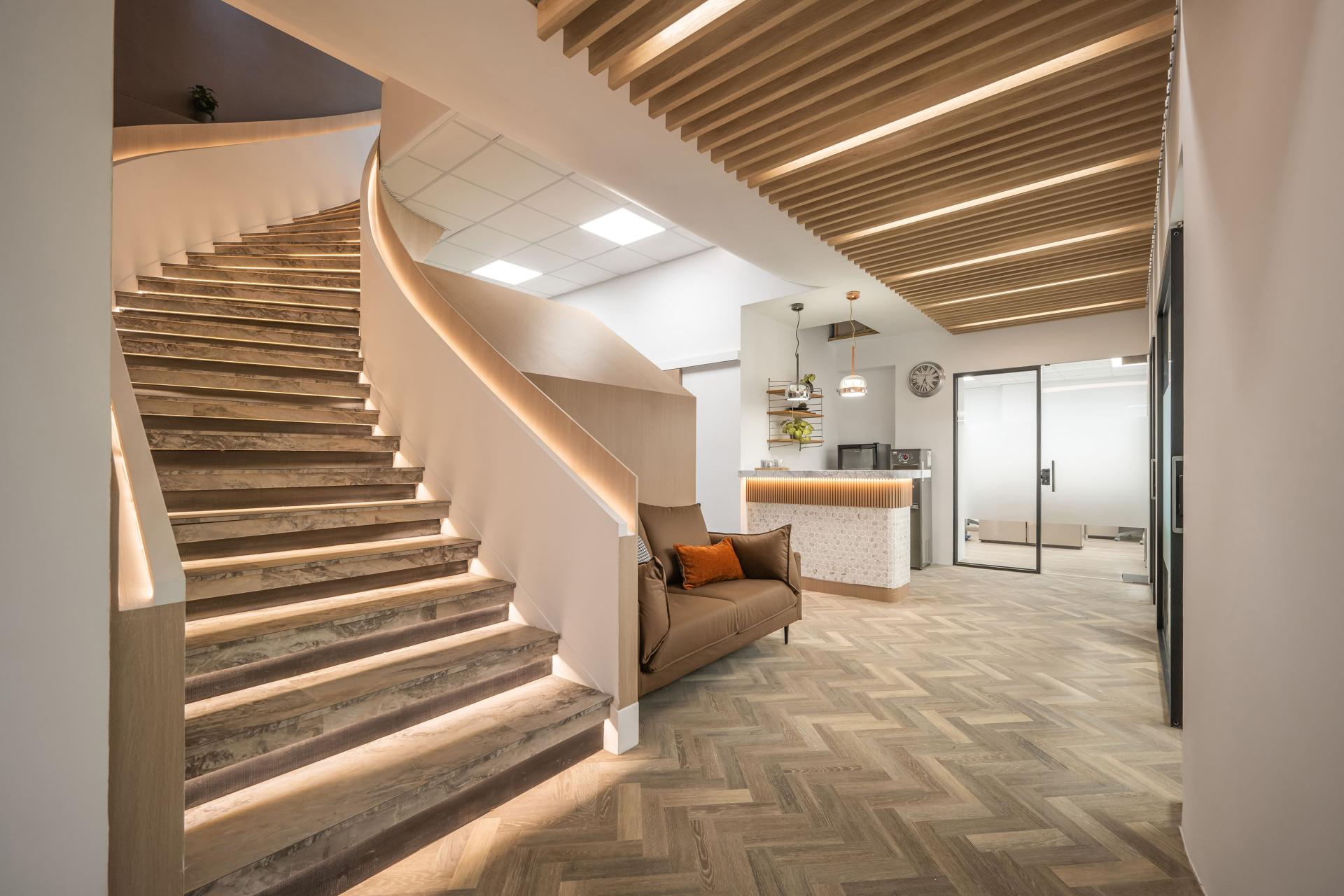 The public area combines independent office and collaboration areas, and is divided into areas by suspended square arc lights, making the space open and orderly. The spiral staircase is like a flowing trajectory, connecting the floors and extending the sense of space. The reception area uses warm wood, matte metal and translucent materials to create a restrained and restrained modern aesthetic.