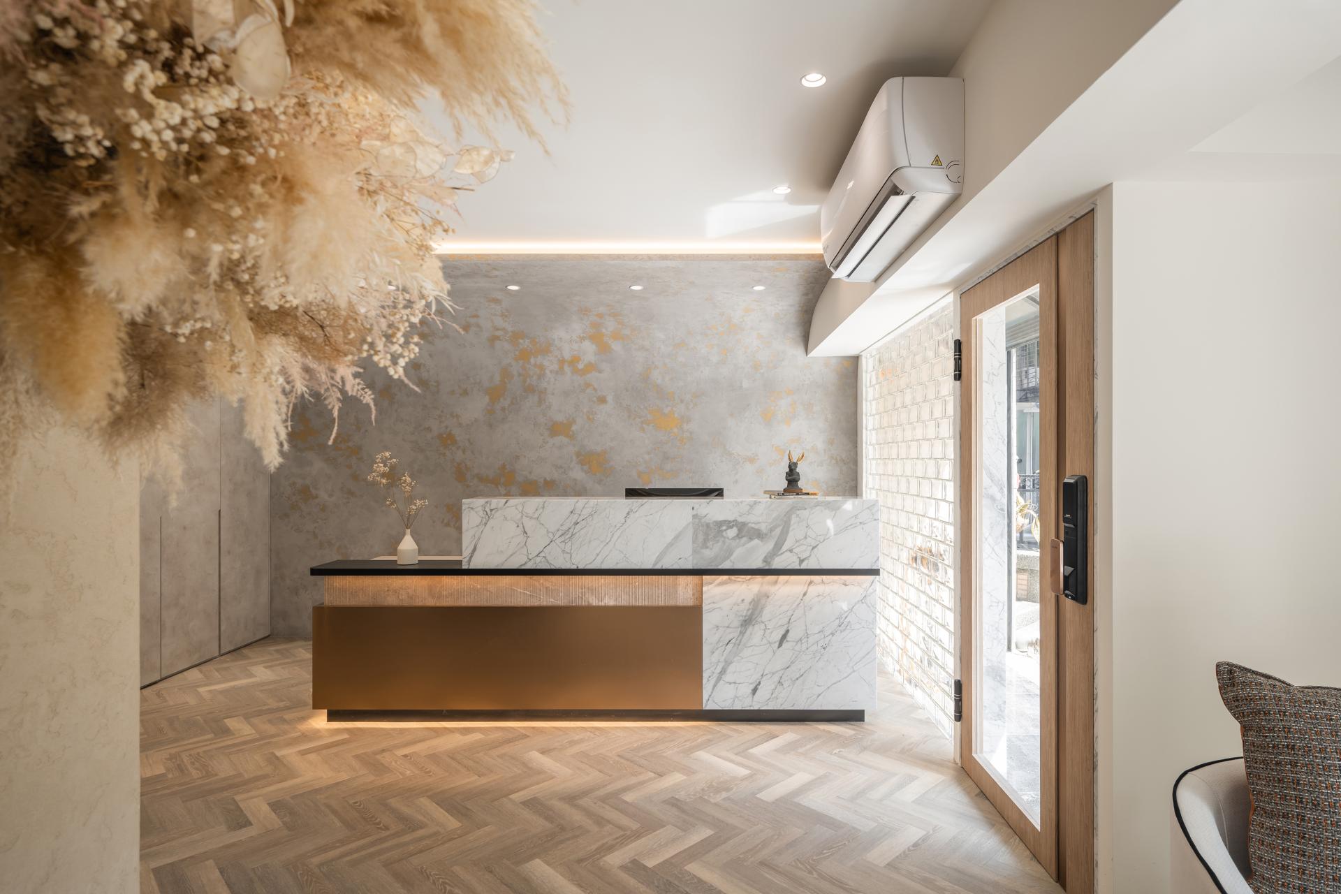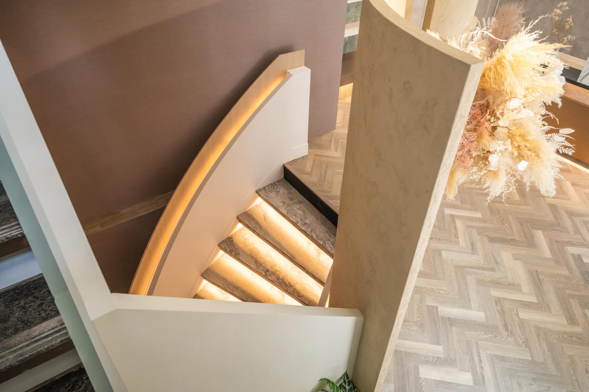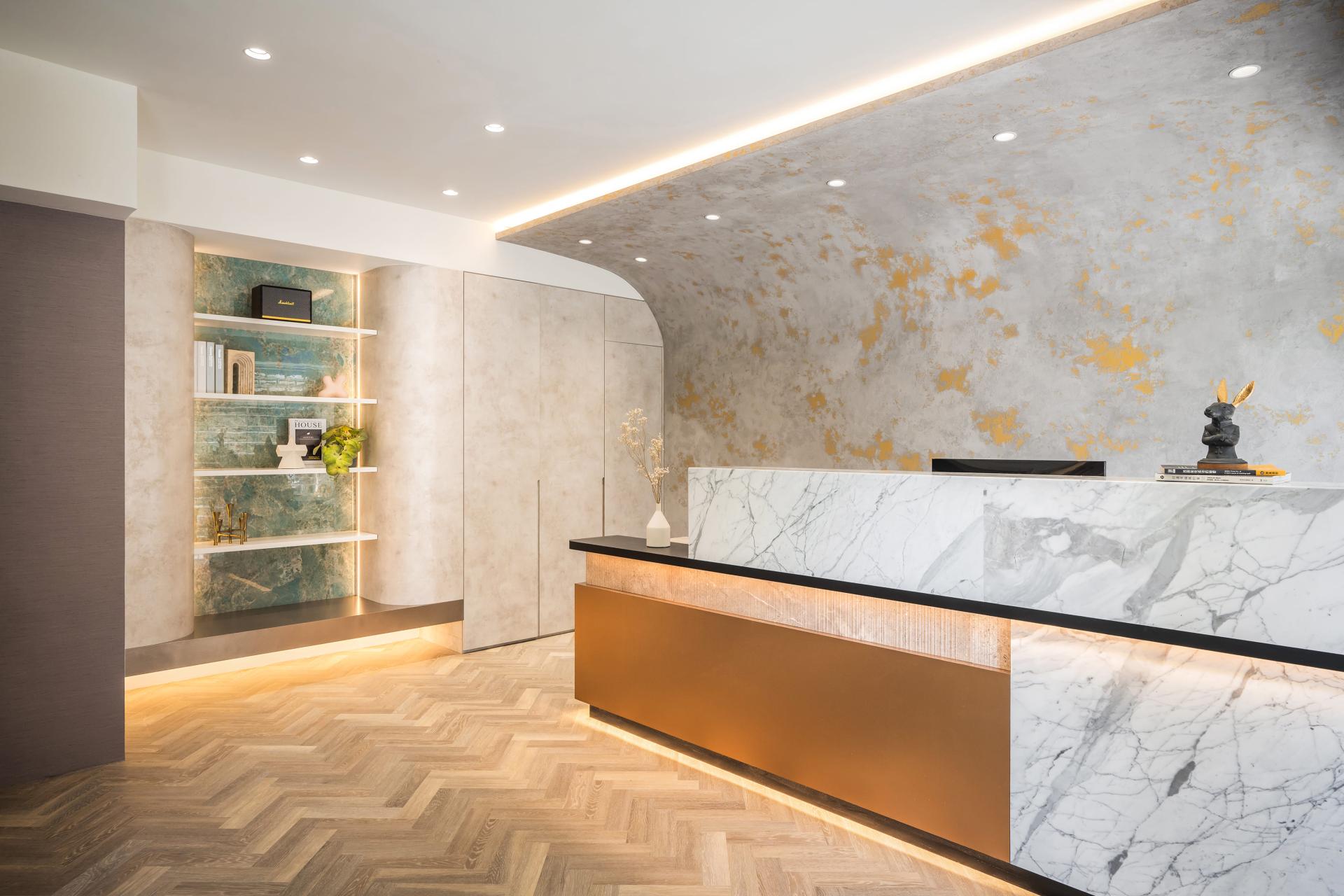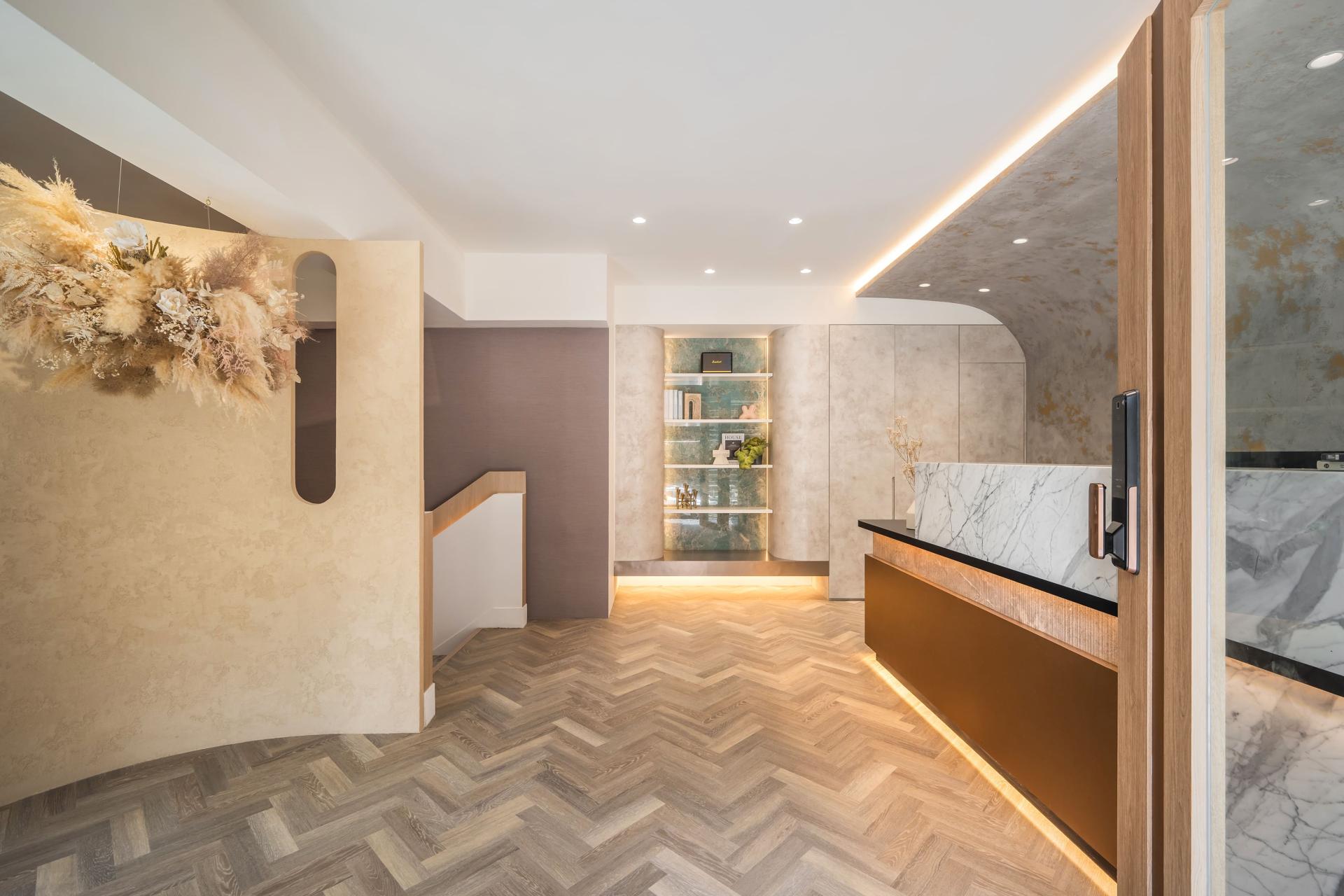 The public area combines independent office and collaboration areas, and is divided into areas by suspended square arc lights, making the space open and orderly. The spiral staircase is like a flowing trajectory, connecting the floors and extending the sense of space. The reception area uses warm wood, matte metal and translucent materials to create a restrained and restrained modern aesthetic.