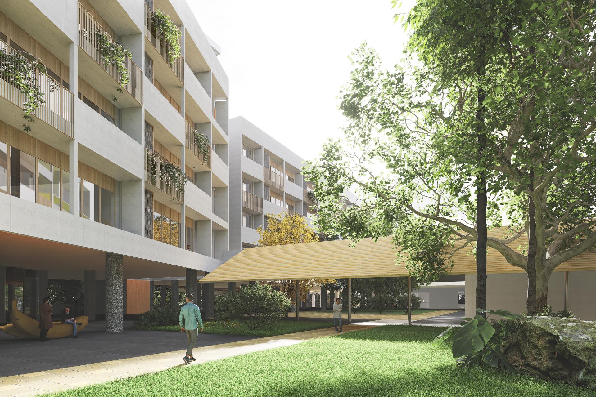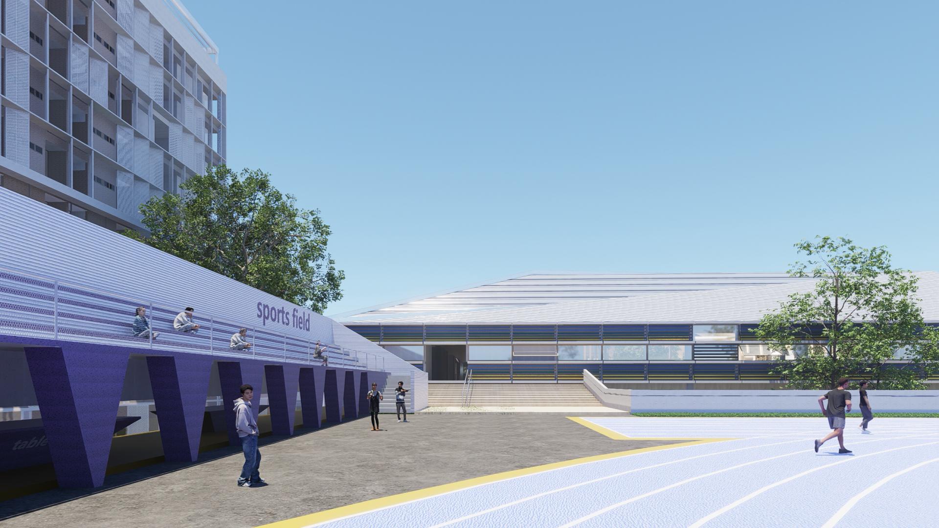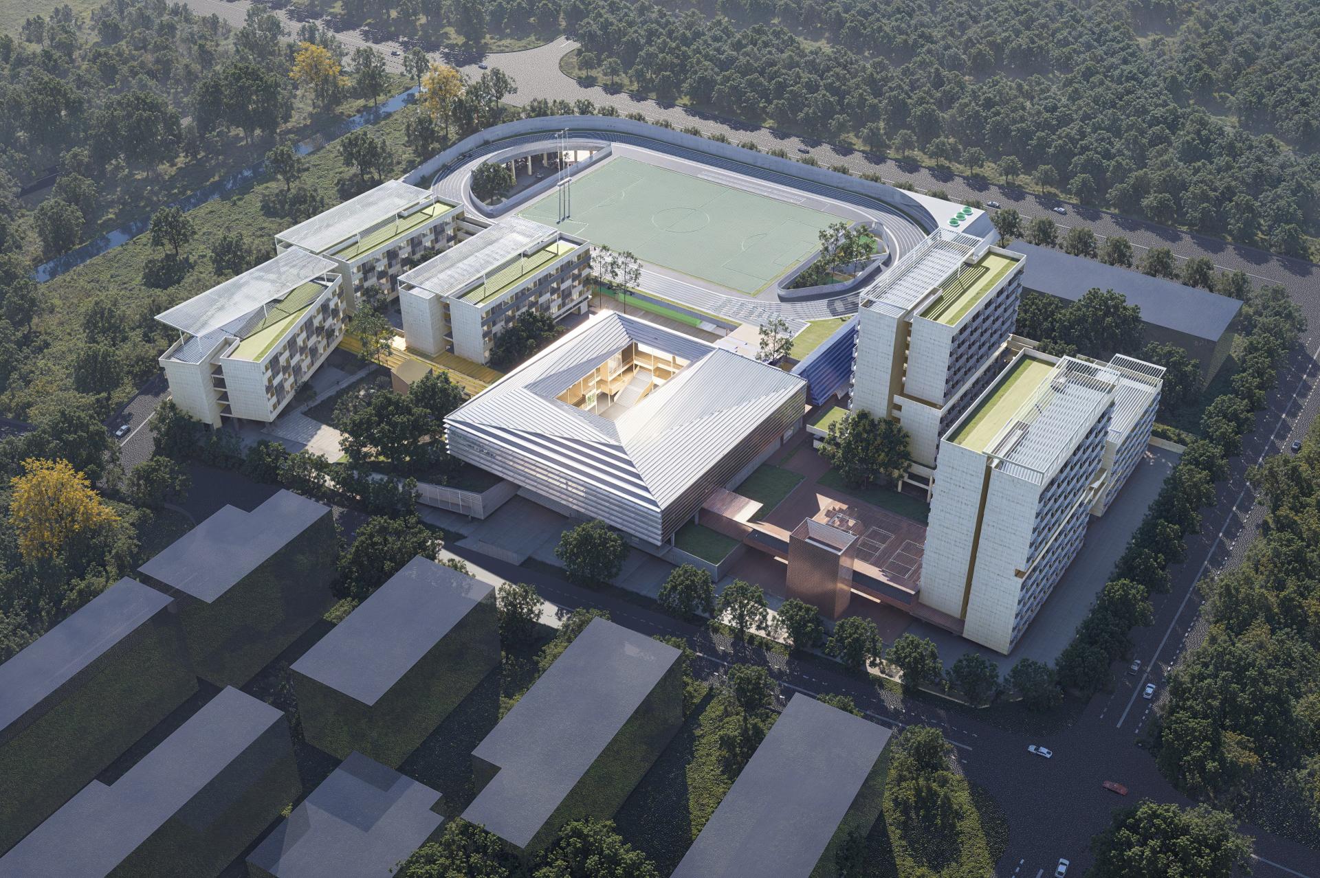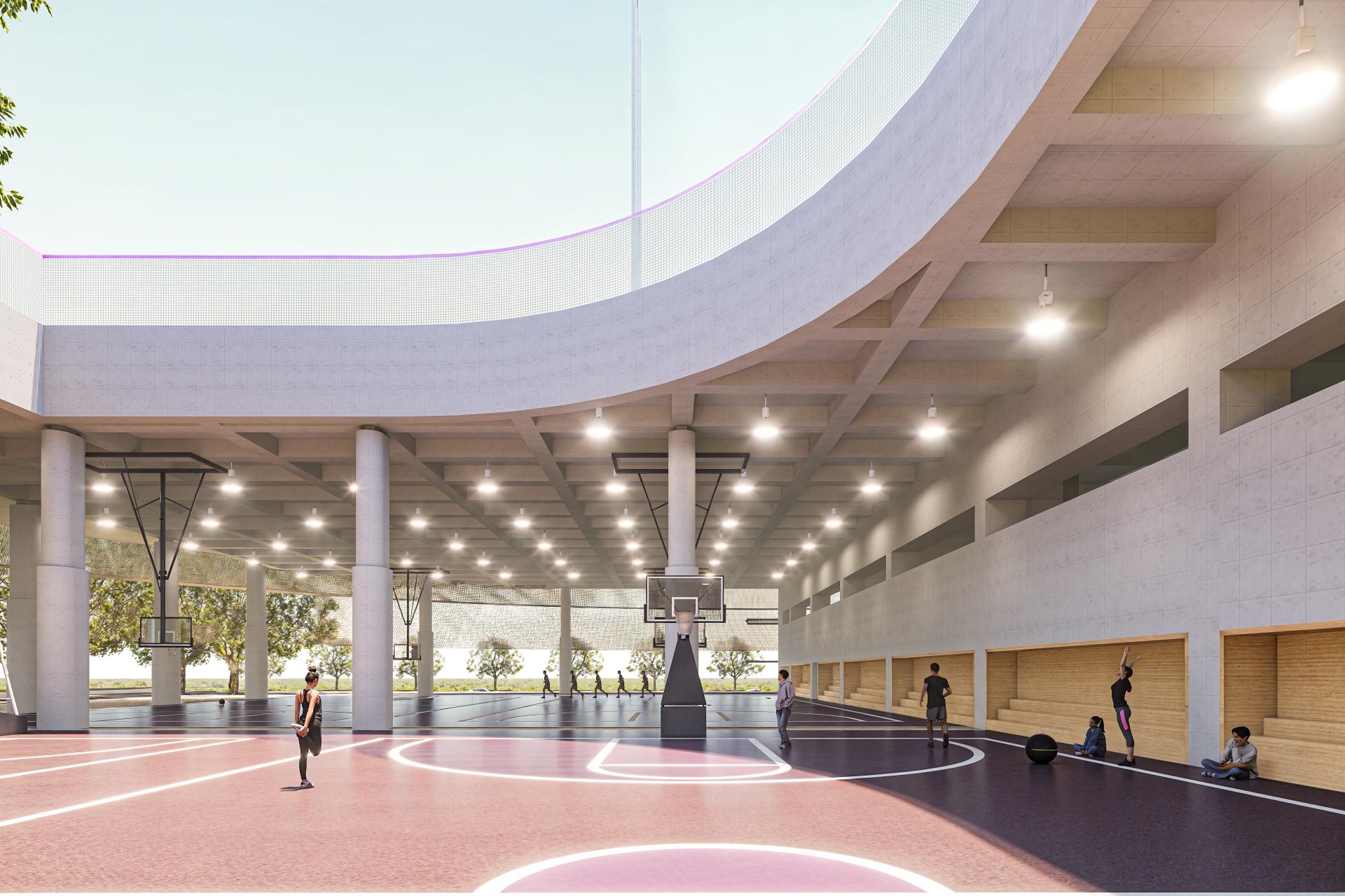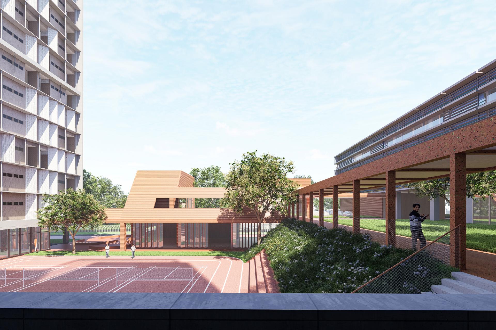 Encircling the Digital Knowledge Nexus, the Learning Hub and Living Commons provide structured spaces for focused learning and residential life, ensuring a balanced and nurturing environment. Meanwhile, the Creative Arts-Athletics Complex, with a multifunctional gymnasium, sunken sports court, and landscaped fitness zones, promotes holistic well-being. It also includes dedicated art studios, and performance spaces, encouraging creative expression and artistic collaboration alongside physical development.