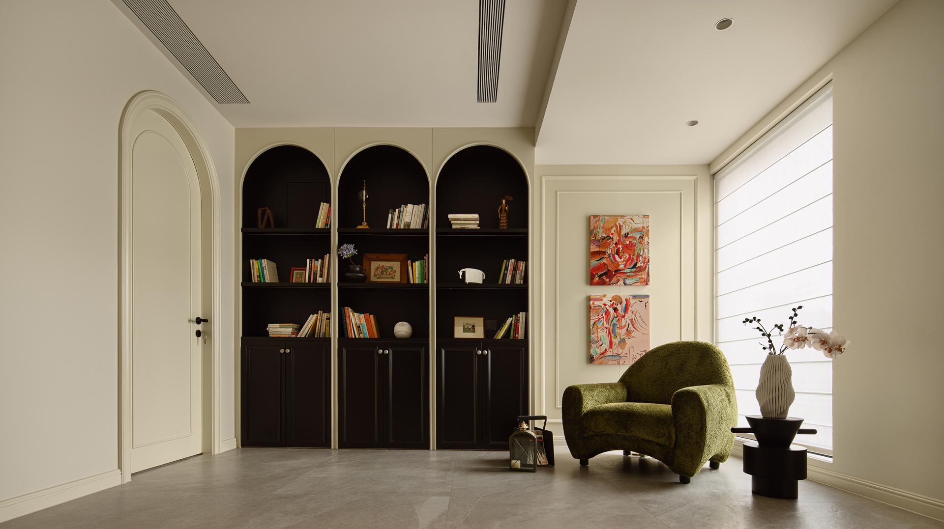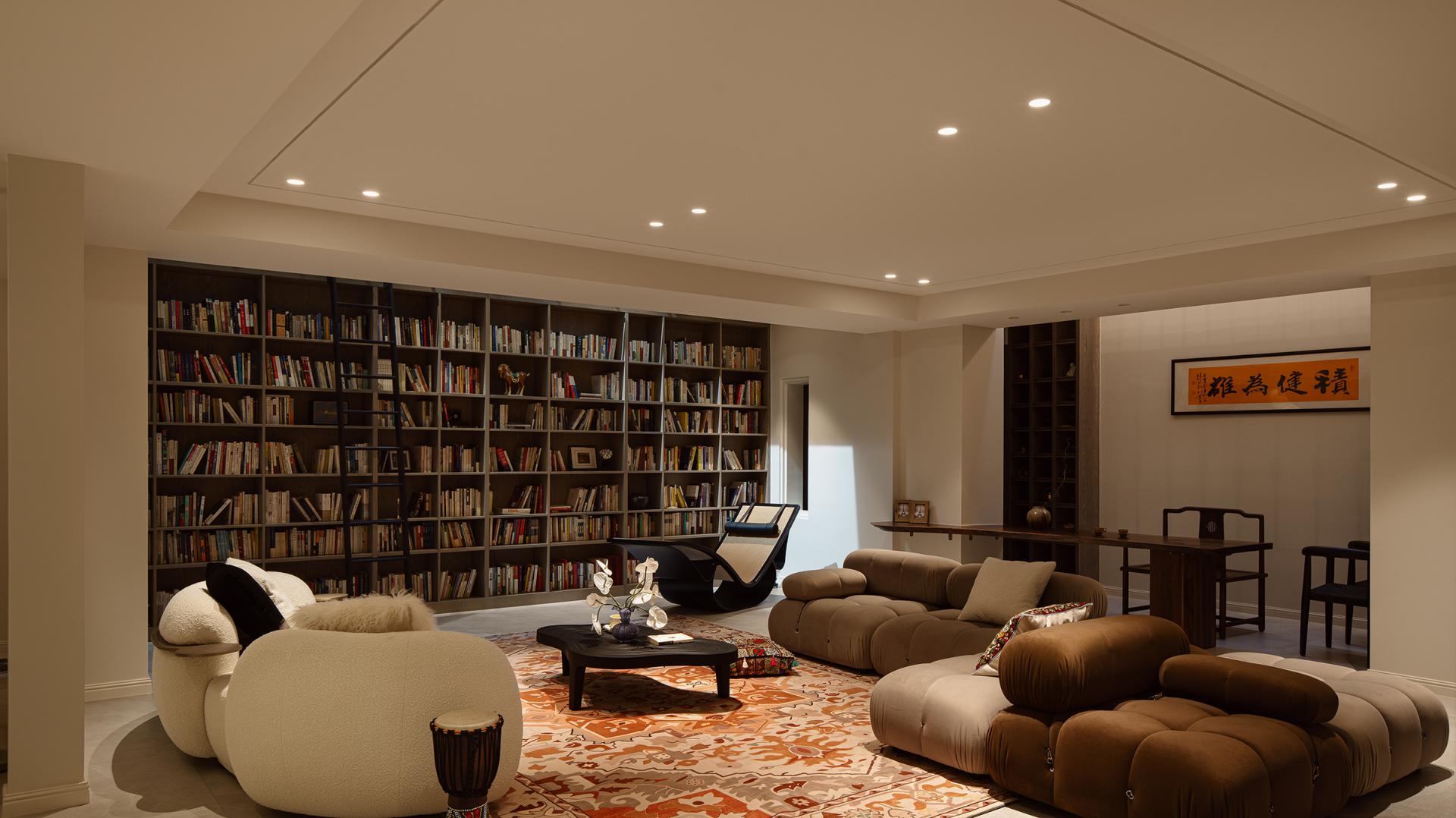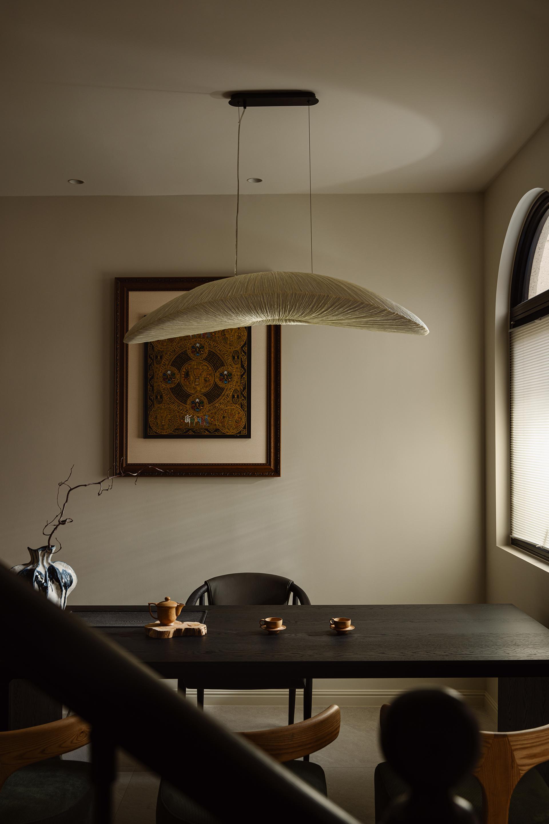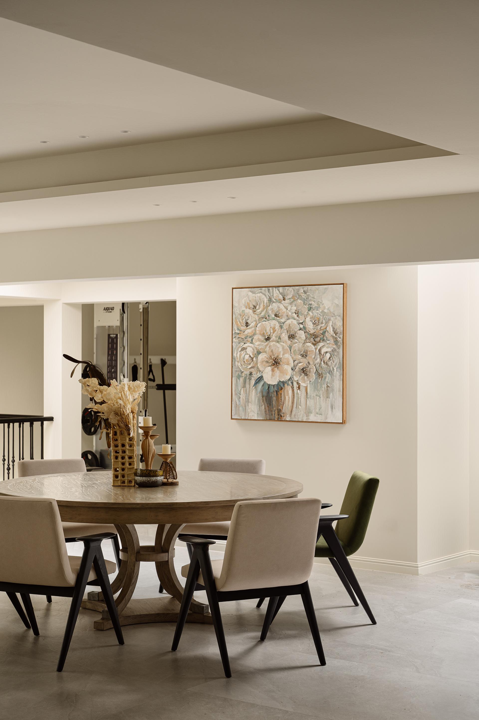 The design should aim not only to meet the functional needs of daily life but also to create an aesthetic domain that corresponds to the client’s personality preferences. The living room, located on the first floor, serves as the core public area of the family. The interior design employs a mix of techniques: a cream-colored linen L-shaped sofa, a solid wood coffee table with a forked design, and a painting featuring ink wash landscapes. Together, these elements create an interesting collision of materials, colors, and aesthetics. The tea room in the garden is like a hidden, fairy-tale space. As you enter, a tranquil aesthetic world gradually unfolds. The construction of space requires inspiration and aesthetics as starting points, but the fundamental motivation must stem from the practical aspects of life and usage. In this context, the kitchen and dining area have once again become the focal point for family interaction. Whether it’s brewing morning coffee or toasting bread, family conversations during meals, gatherings with friends and relatives, or even the female homeowner’s occasional flower arrangement workspace—this space embodies family life. The open-plan kitchen and dining area features a central round wooden dining table, accompanied by comfortable white and green linen dining chairs. This setting provides a pleasant dining atmosphere, integrating the warmth of daily family life. The subtle traces of everyday living suggest a content and leisurely family routine. Life can be understood as a collection of independent scenes. The second basement level is designed as a family social area, with a double-sided sofa at the center, connecting the rest of the space. At the far end, an entire wall is embedded with a display bookshelf, and an oversized tea table serves as both the center for family interaction and a social venue. The flexible and free layout enhances the space’s “wandering” feel. Life is like tea; one can calmly observe the ups and downs of the world and find peace within it. In this small corner, the essence of simplicity is fully displayed.