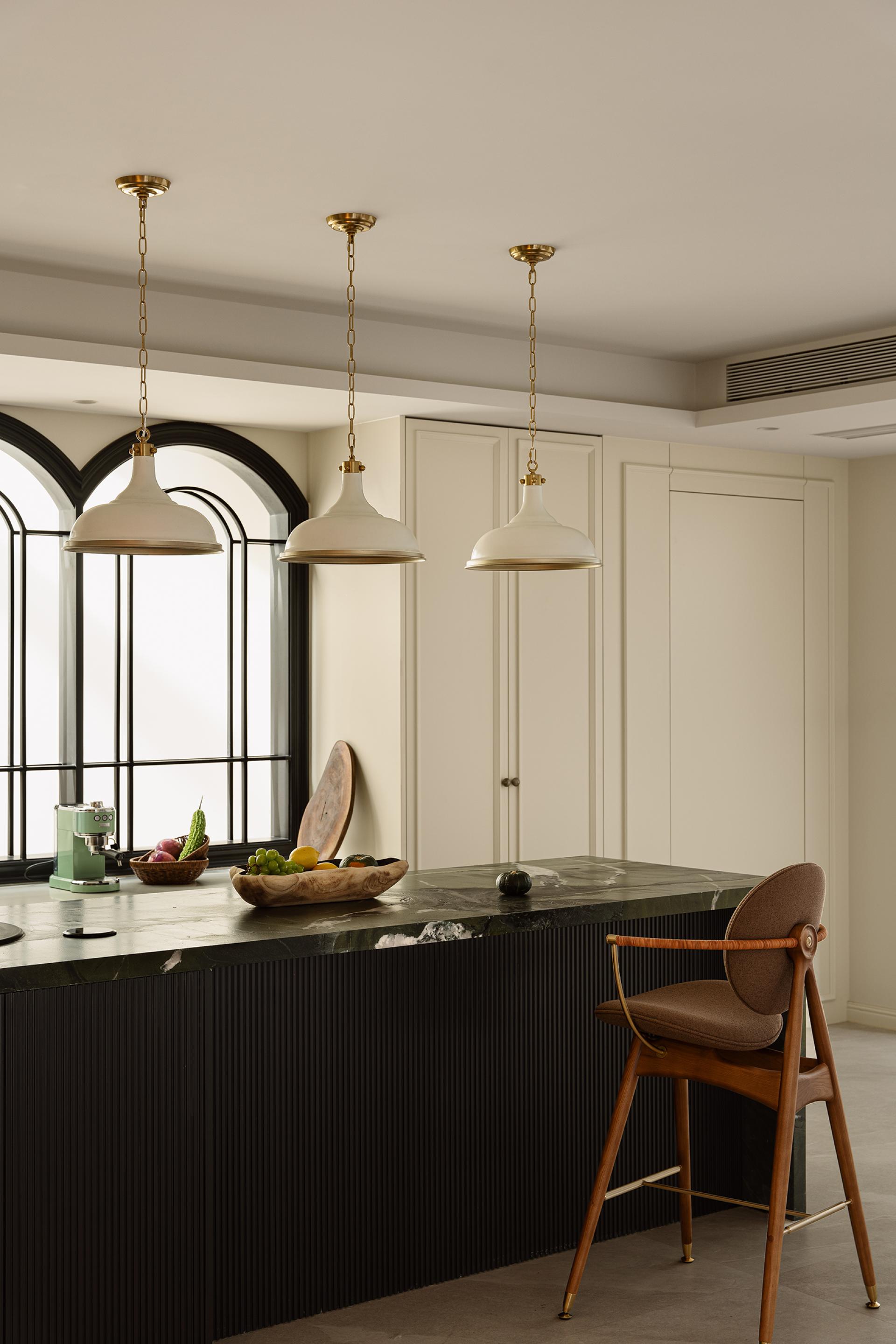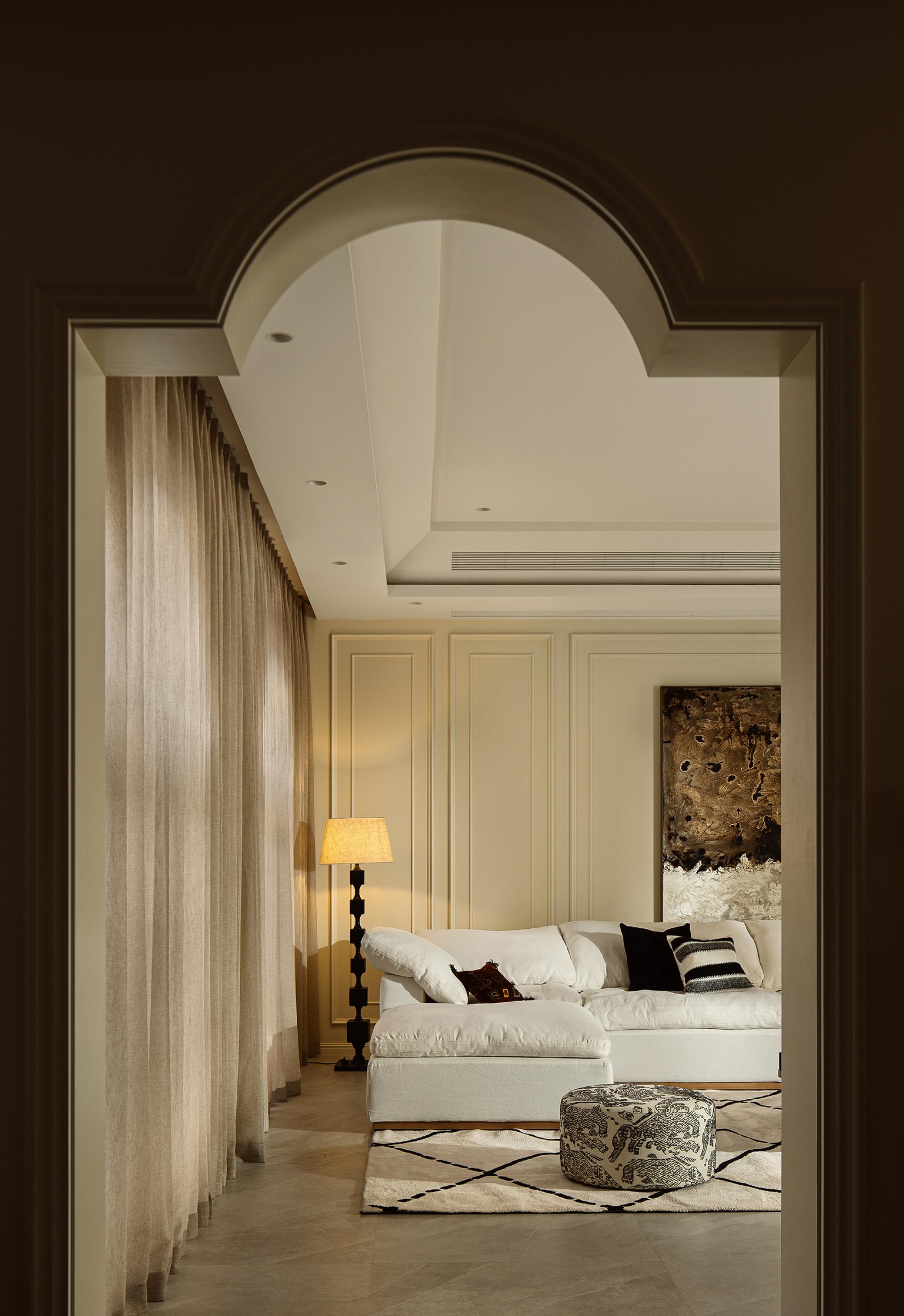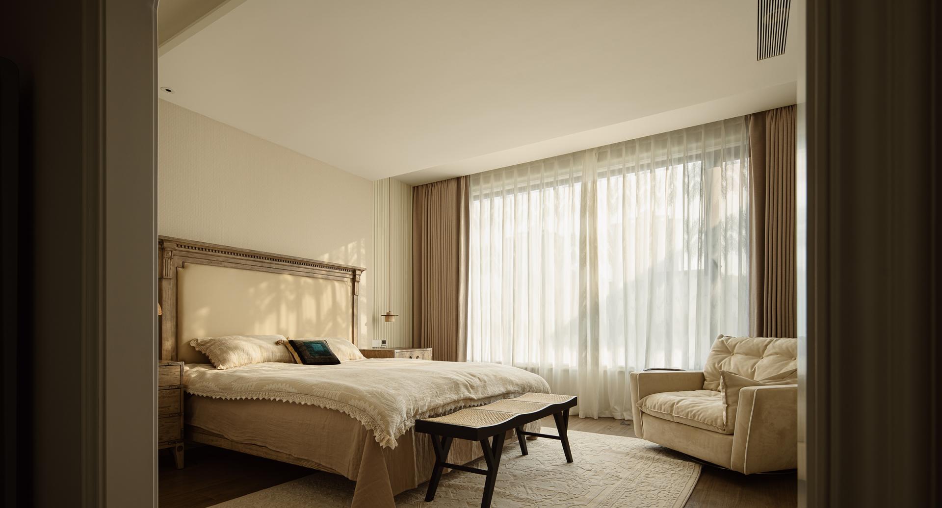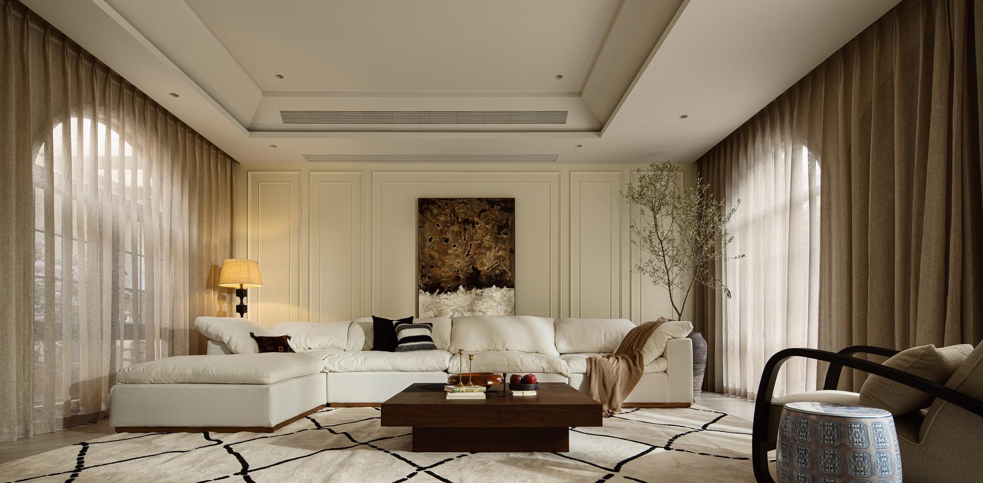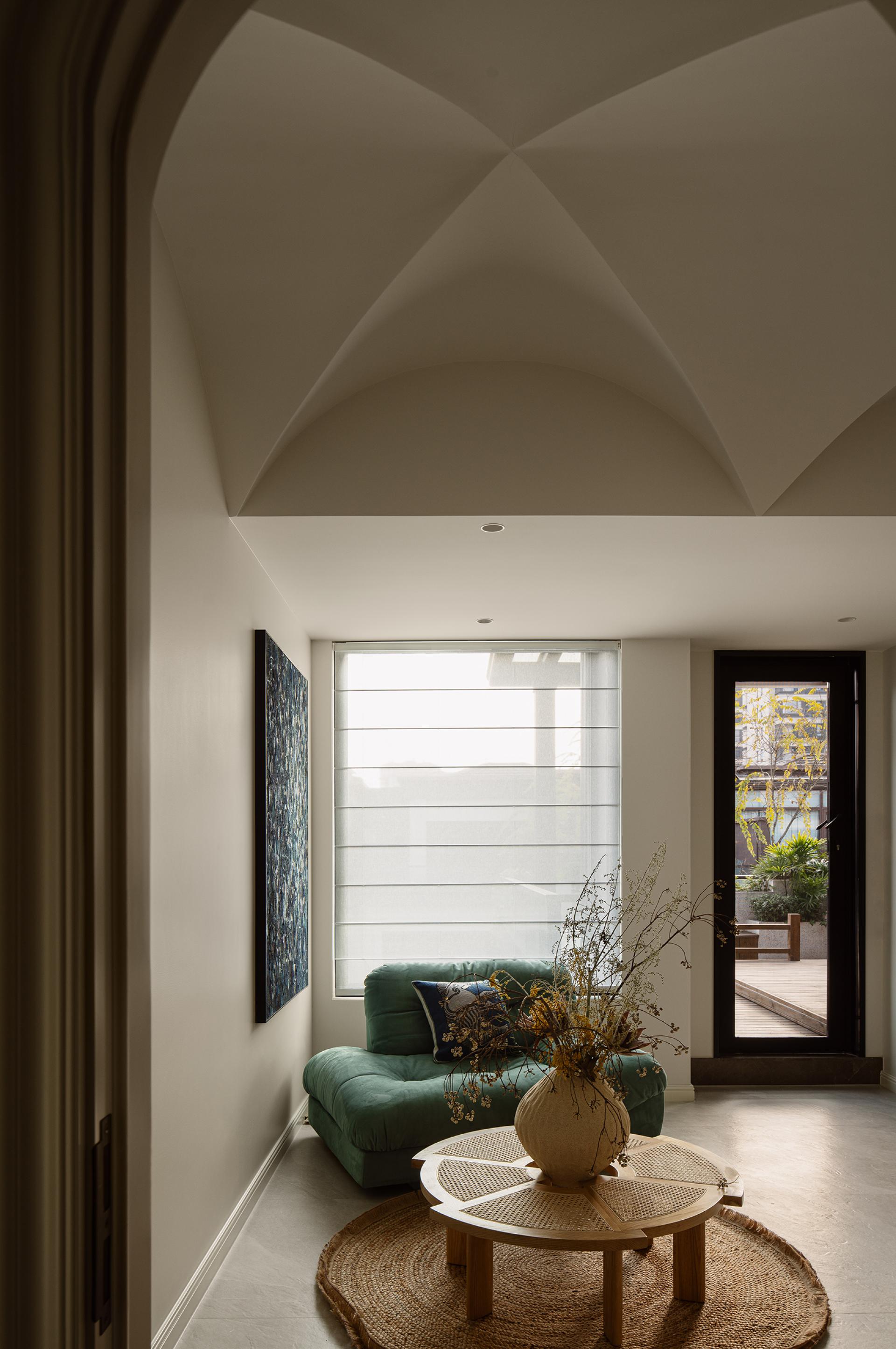 The design should aim not only to meet the functional needs of daily life but also to create an aesthetic domain that corresponds to the client’s personality preferences. The living room, located on the first floor, serves as the core public area of the family. The interior design employs a mix of techniques: a cream-colored linen L-shaped sofa, a solid wood coffee table with a forked design, and a painting featuring ink wash landscapes. Together, these elements create an interesting collision of materials, colors, and aesthetics. The tea room in the garden is like a hidden, fairy-tale space. As you enter, a tranquil aesthetic world gradually unfolds. The construction of space requires inspiration and aesthetics as starting points, but the fundamental motivation must stem from the practical aspects of life and usage. In this context, the kitchen and dining area have once again become the focal point for family interaction. Whether it’s brewing morning coffee or toasting bread, family conversations during meals, gatherings with friends and relatives, or even the female homeowner’s occasional flower arrangement workspace—this space embodies family life. The open-plan kitchen and dining area features a central round wooden dining table, accompanied by comfortable white and green linen dining chairs. This setting provides a pleasant dining atmosphere, integrating the warmth of daily family life. The subtle traces of everyday living suggest a content and leisurely family routine. Life can be understood as a collection of independent scenes. The second basement level is designed as a family social area, with a double-sided sofa at the center, connecting the rest of the space. At the far end, an entire wall is embedded with a display bookshelf, and an oversized tea table serves as both the center for family interaction and a social venue. The flexible and free layout enhances the space’s “wandering” feel. Life is like tea; one can calmly observe the ups and downs of the world and find peace within it. In this small corner, the essence of simplicity is fully displayed.
