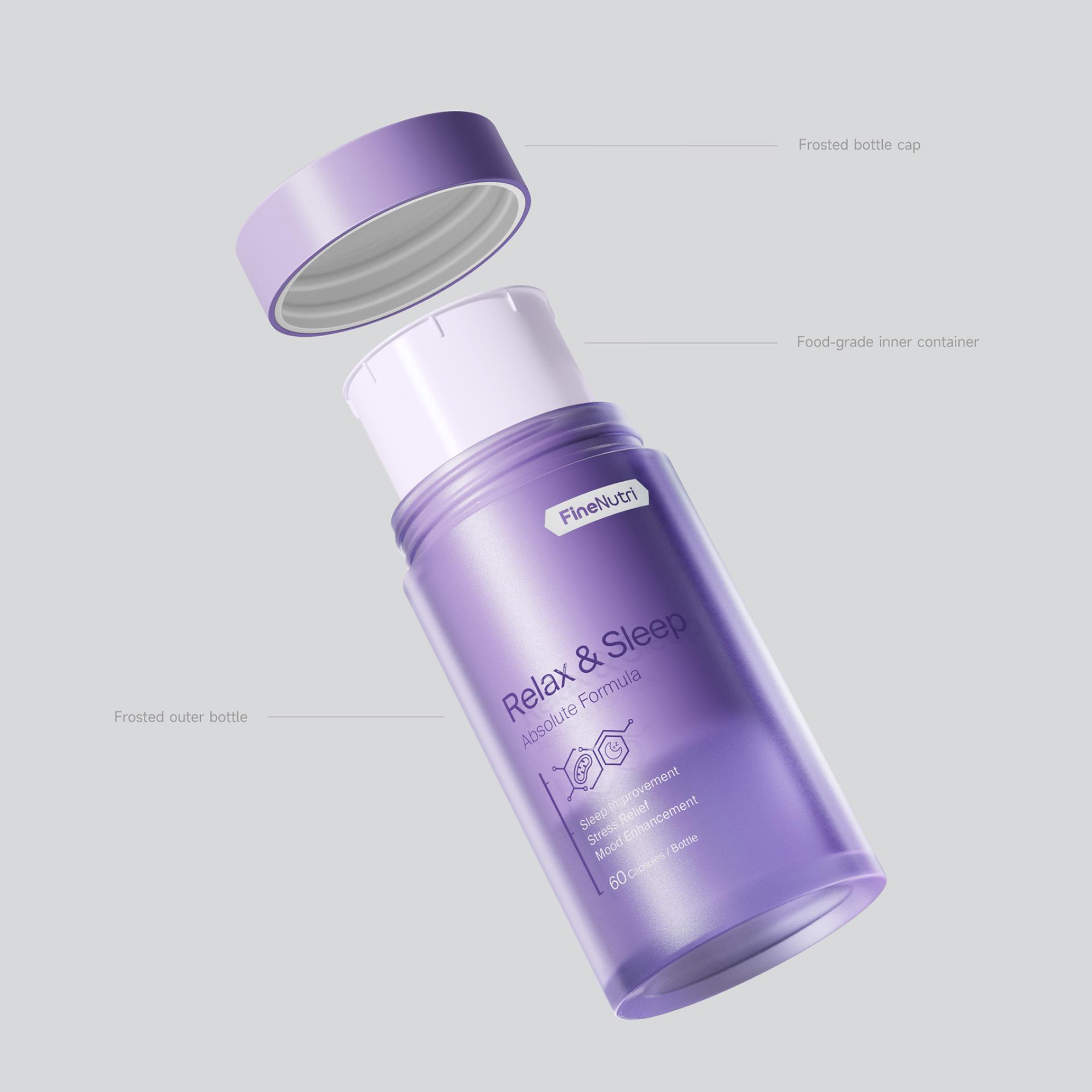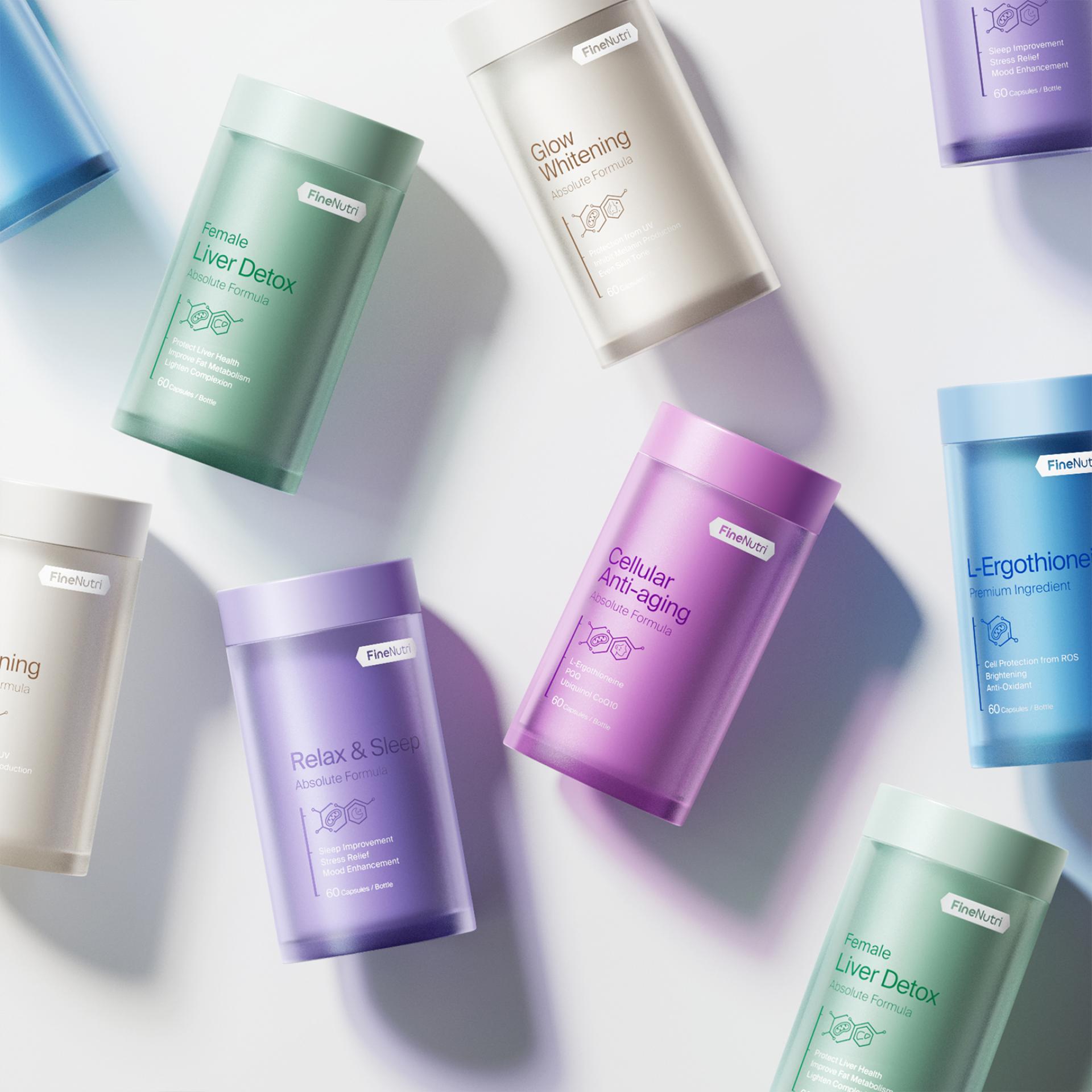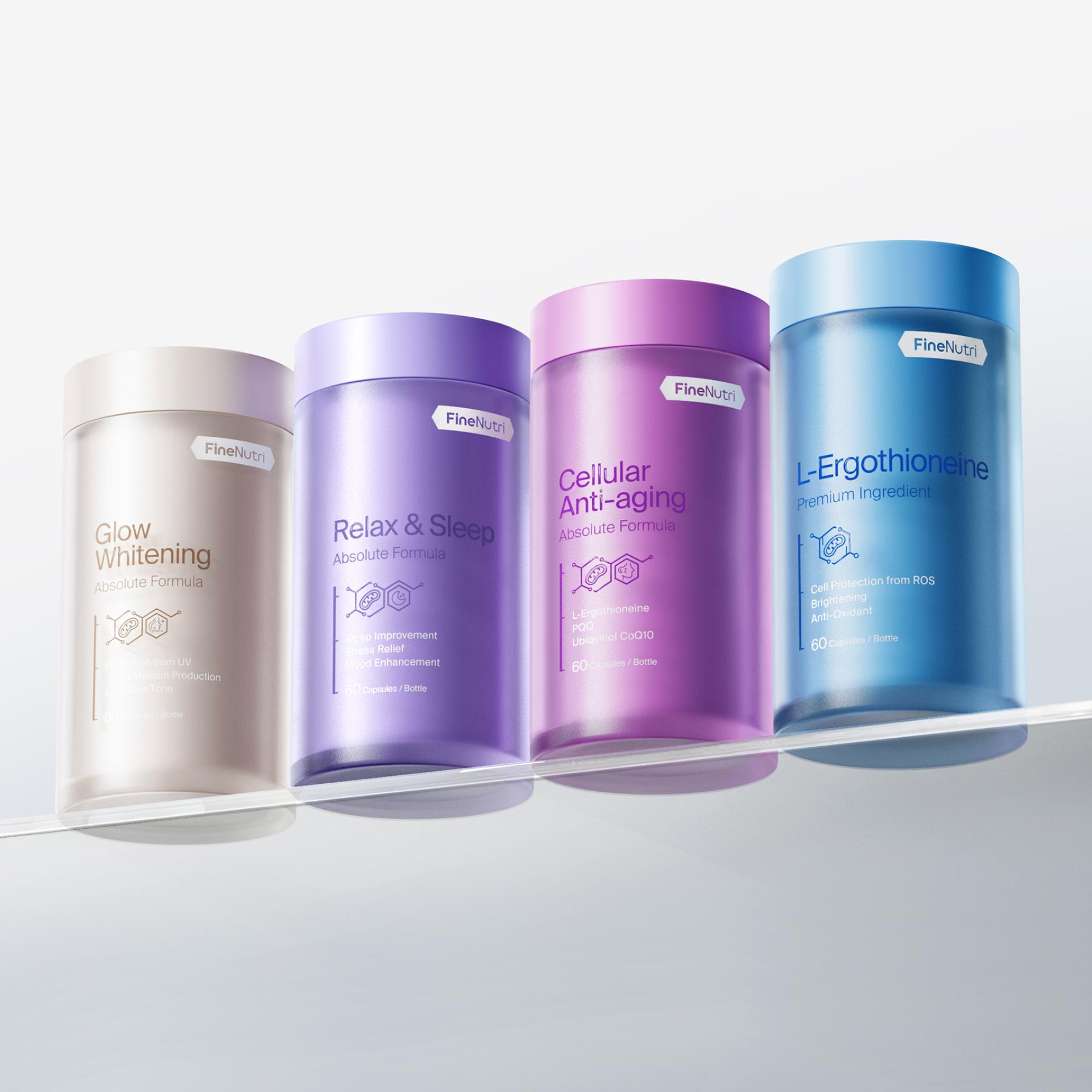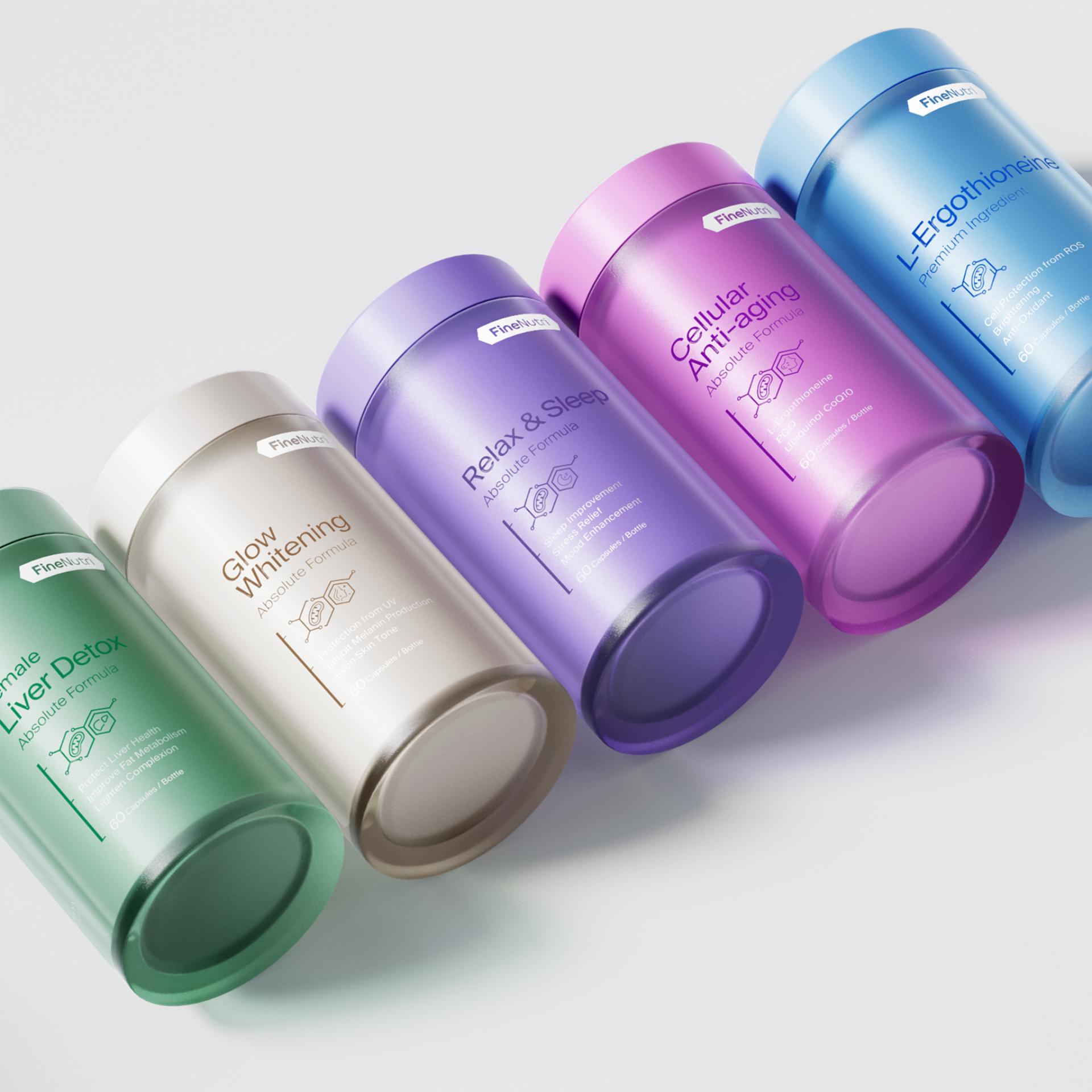 FineNutri is a scientific anti-aging nutritional supplement brand developed specifically for women over 25 years old. It is committed to breaking the impression that traditional health care product packaging looks like "medicine".Developed a minimalist bottle design with smooth, organic lines using PETG eco-friendly material. The dual-layer structure combines a frosted outer shell with a food-grade inner container. The outer shell features finely textured matte finish through advanced sandblasting, achieving sophisticated elegance while creating subtle visual depth with mysterious translucency. This construction enables light-blocking storage that preserves active ingredients. Clean typography and focused iconography highlight product efficacy, balancing scientific precision with consumer-friendly information hierarchy for quick comprehension.Distinctive colors are designed for different products, some are fresh and elegant, some are vibrant and bright, just like the diverse charm of young women, making the brand image younger and more fashionable, more in line with the aesthetic taste of young women and standing out among many products.