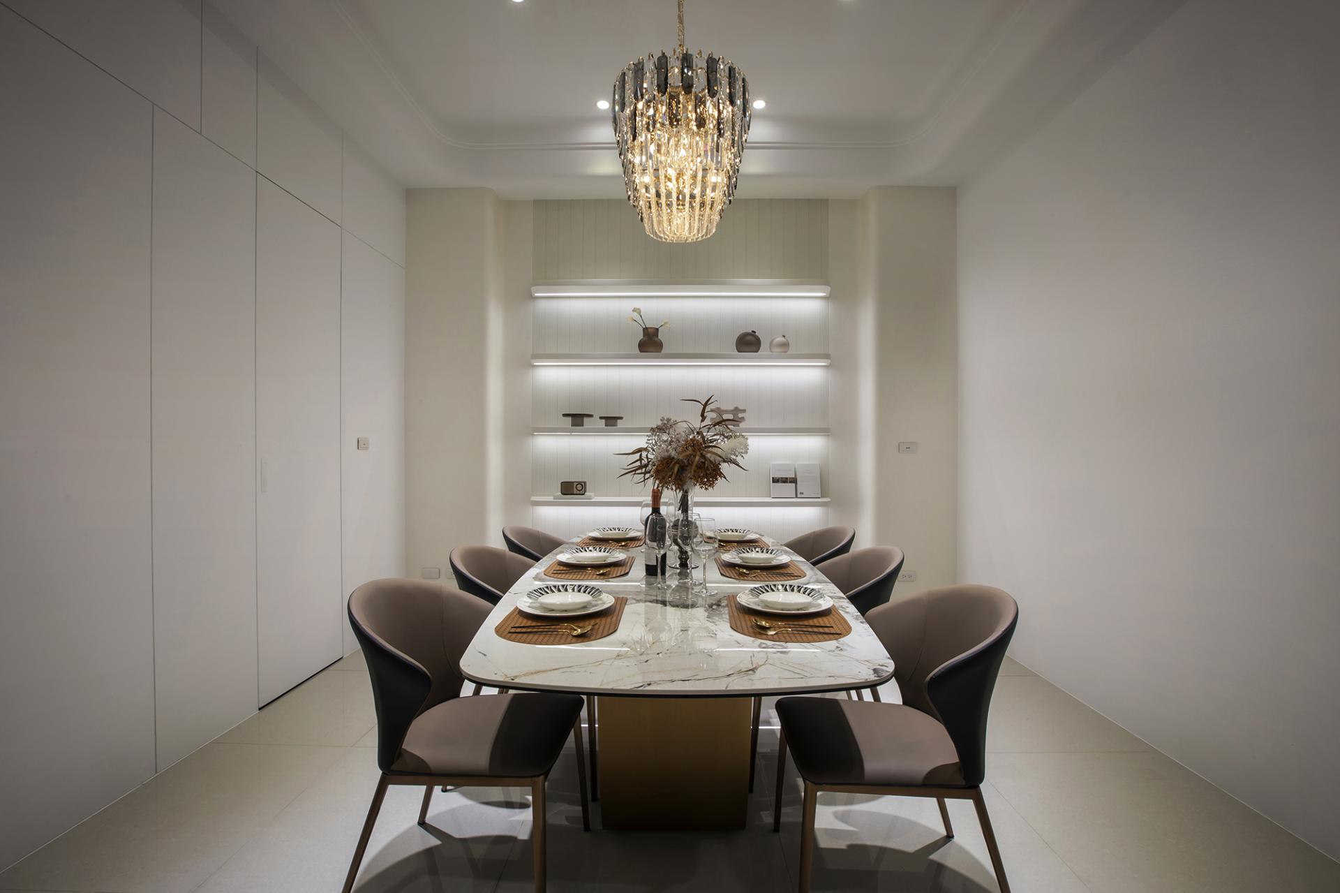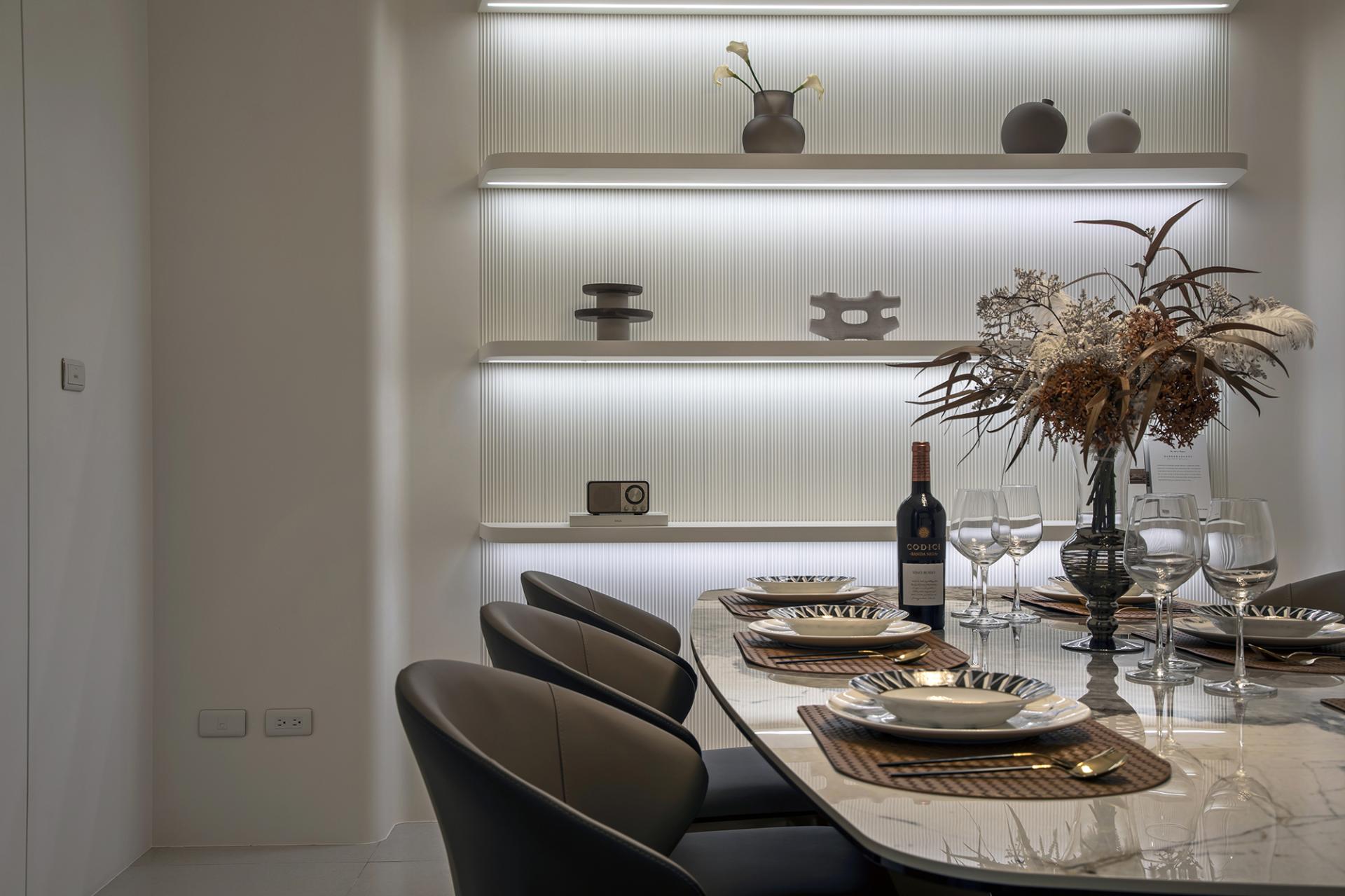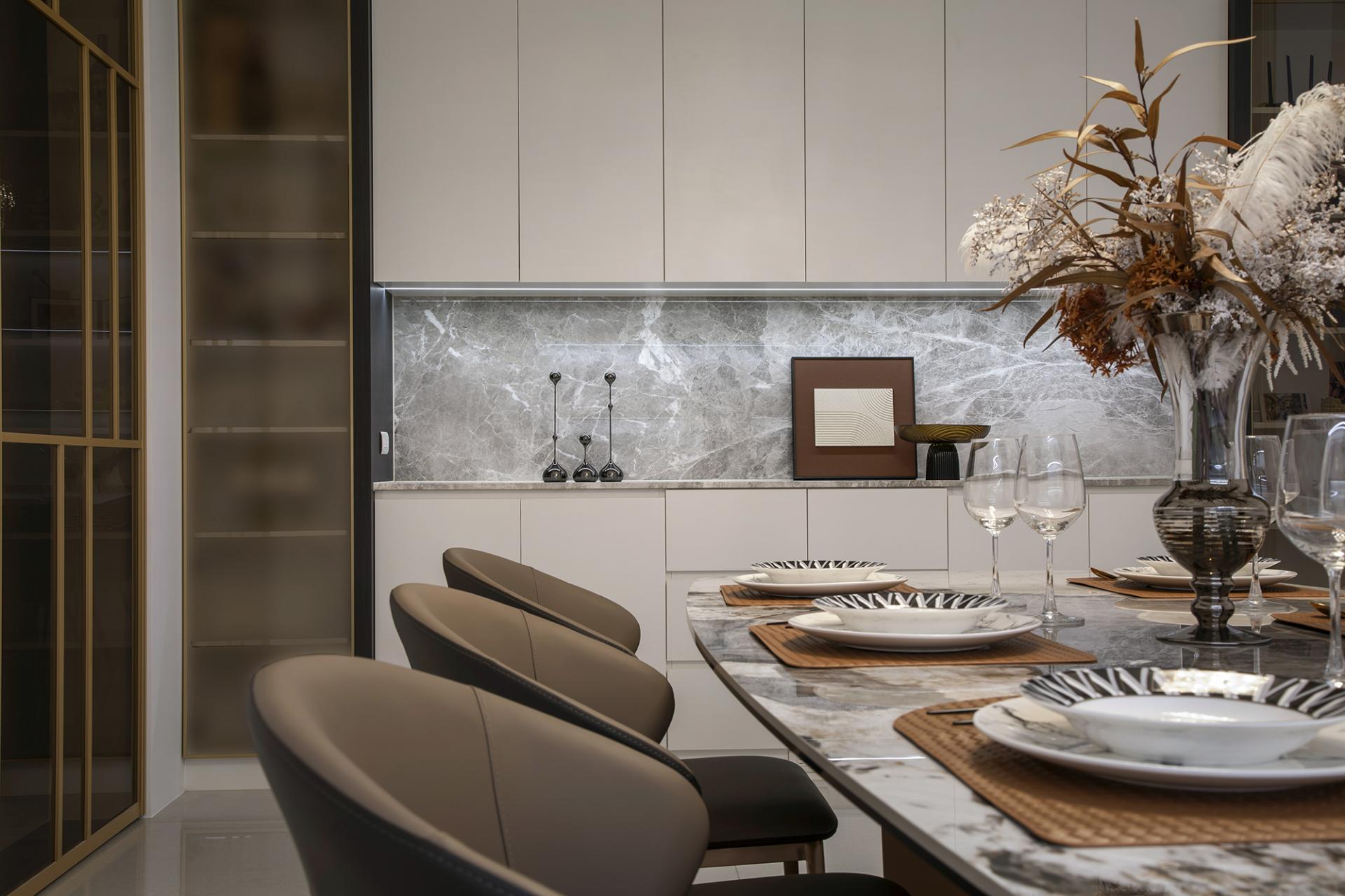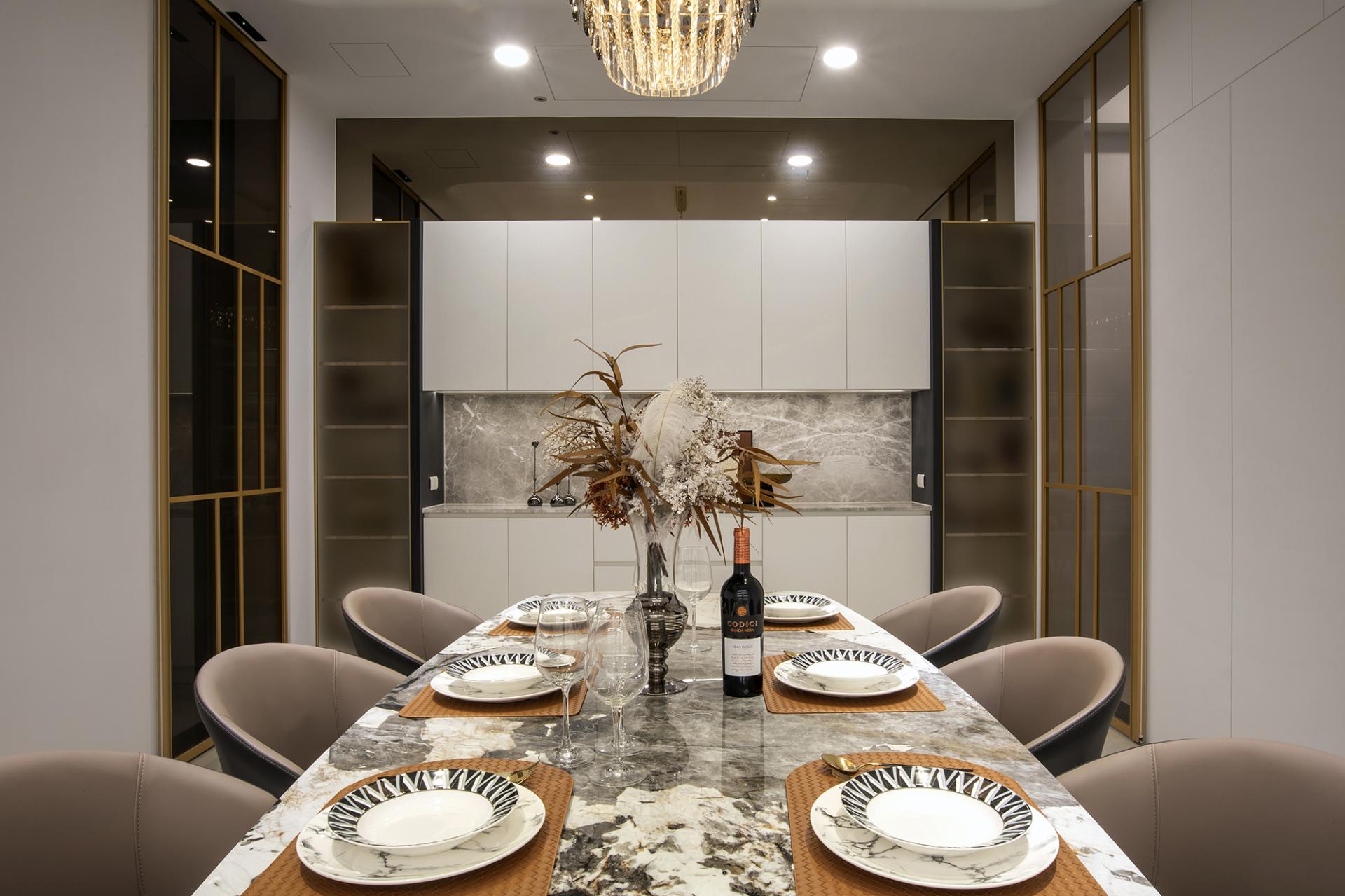 One of the room's most striking features is its varied stylistic approach at each end of the dining room. One end boasts a minimalist and refined arrangement of sleek shelves and linear lighting, promoting an air of understated elegance. In stark contrast, the other end showcases opulent marble surfaces and metallic accents, creating an intriguing visual juxtaposition that adds depth and interest.