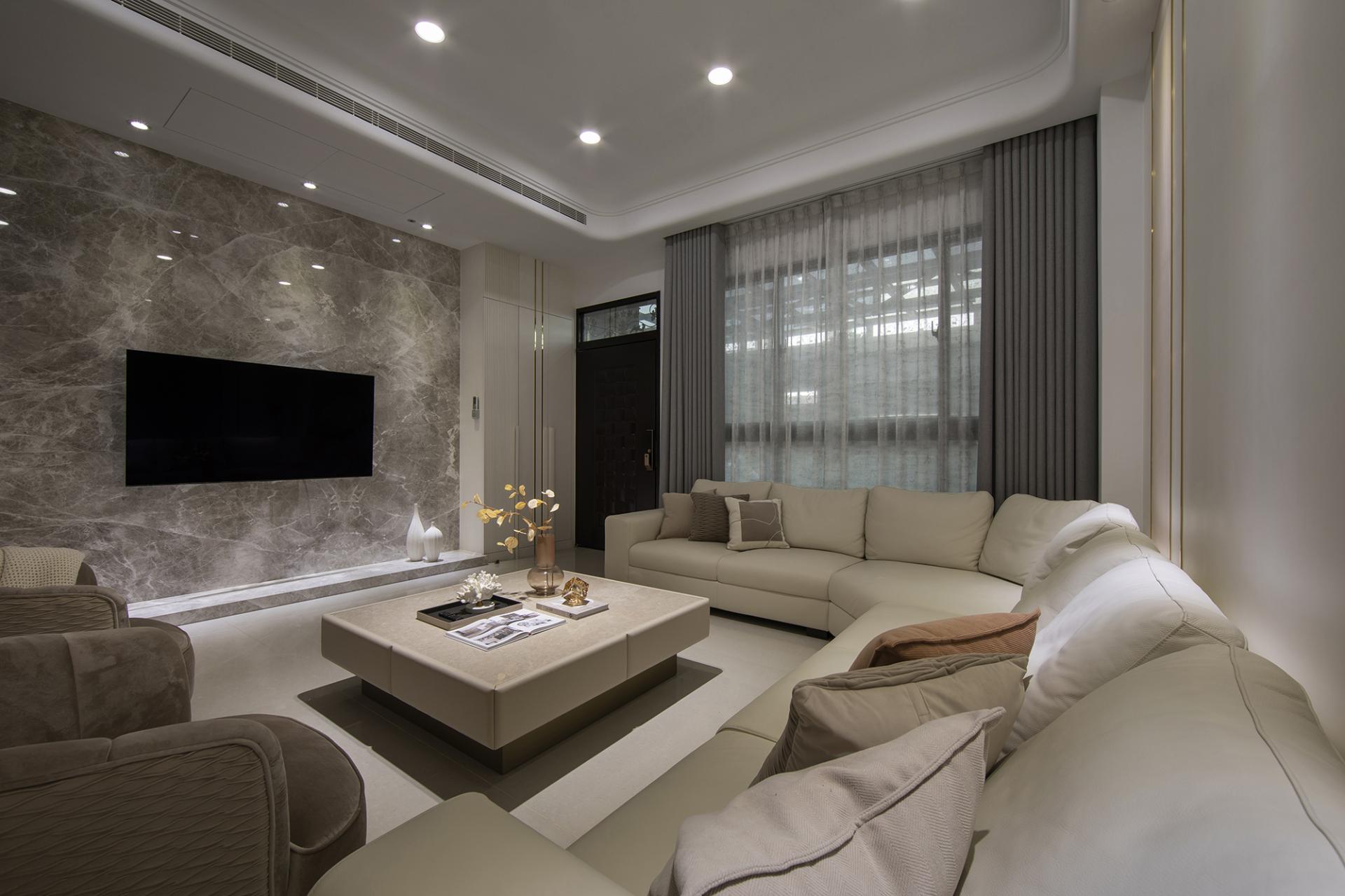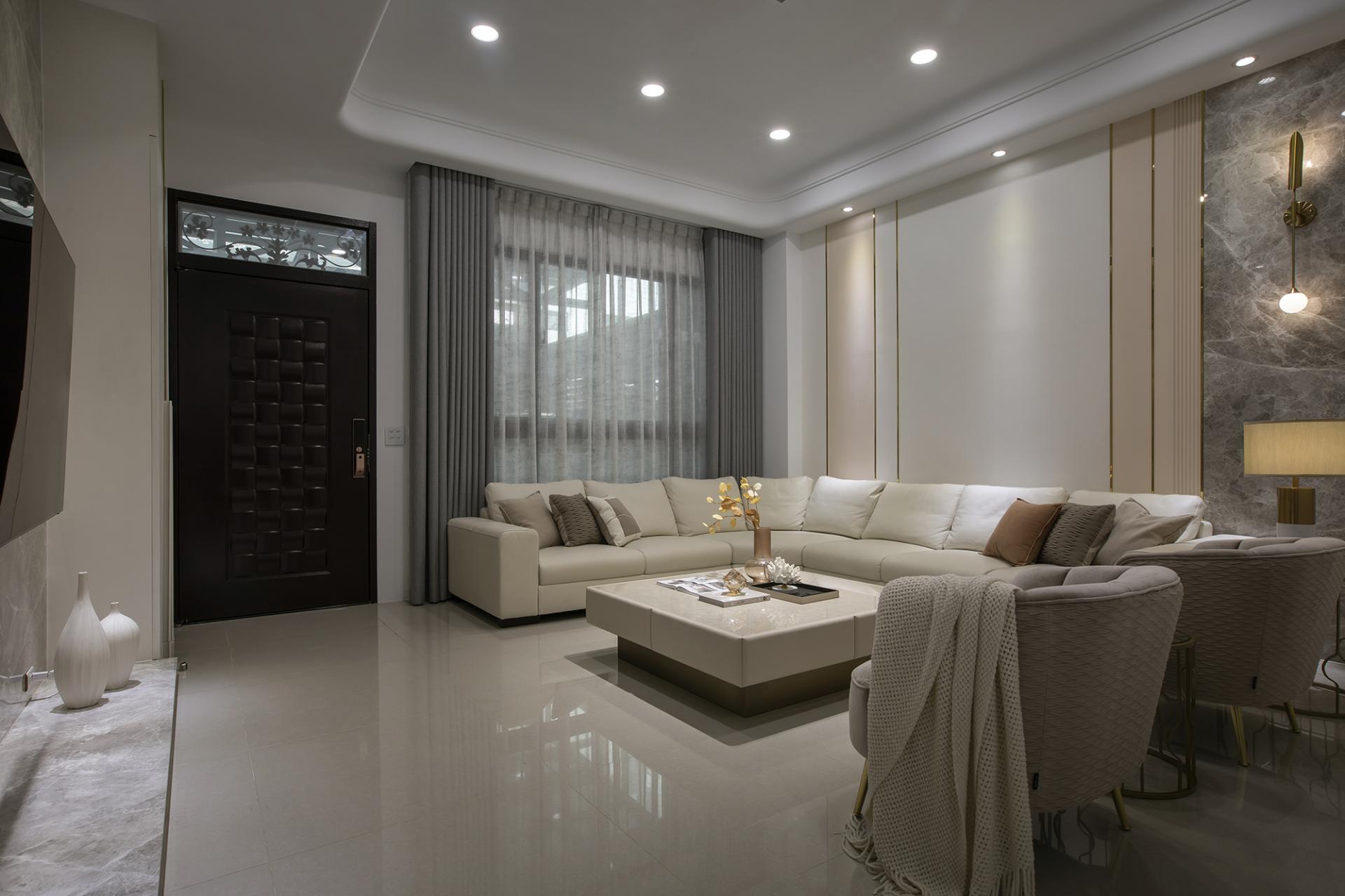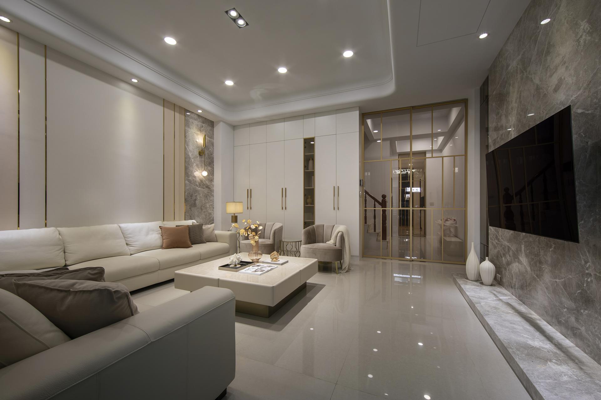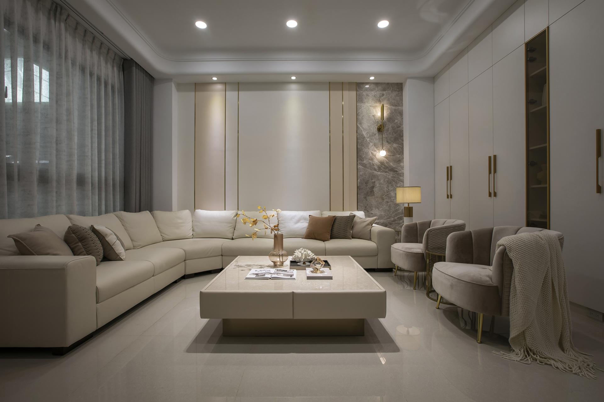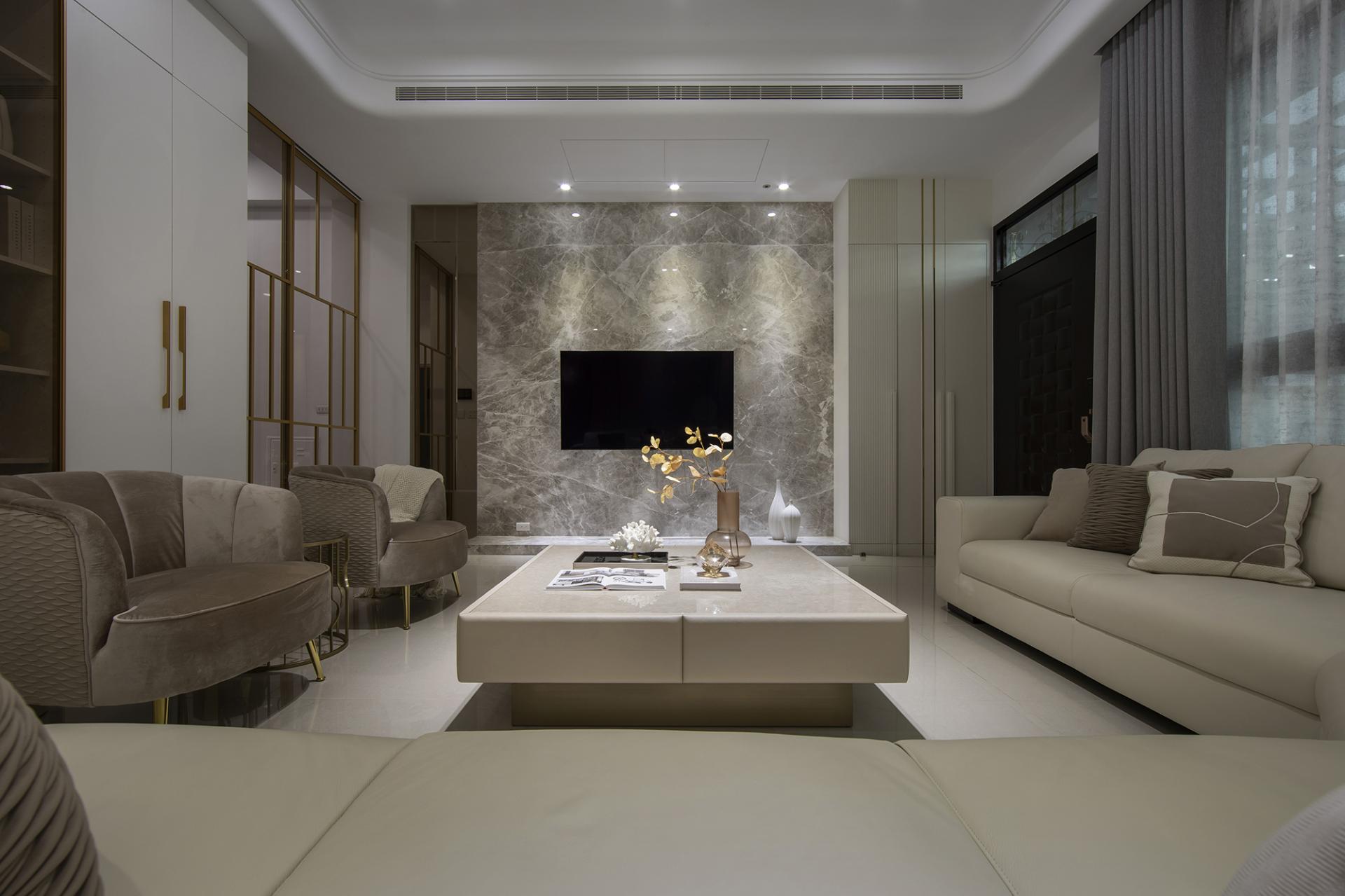 Upon entering the living room, guests will be immediately enveloped by a palette of soft, low-saturation colors that create a serene and sophisticated atmosphere. This foundational color scheme is elegantly enhanced by the inclusion of marble and titanium-plated metal elements, which collectively establish a modern and stylish aesthetic while reflecting the owner's discerning taste.