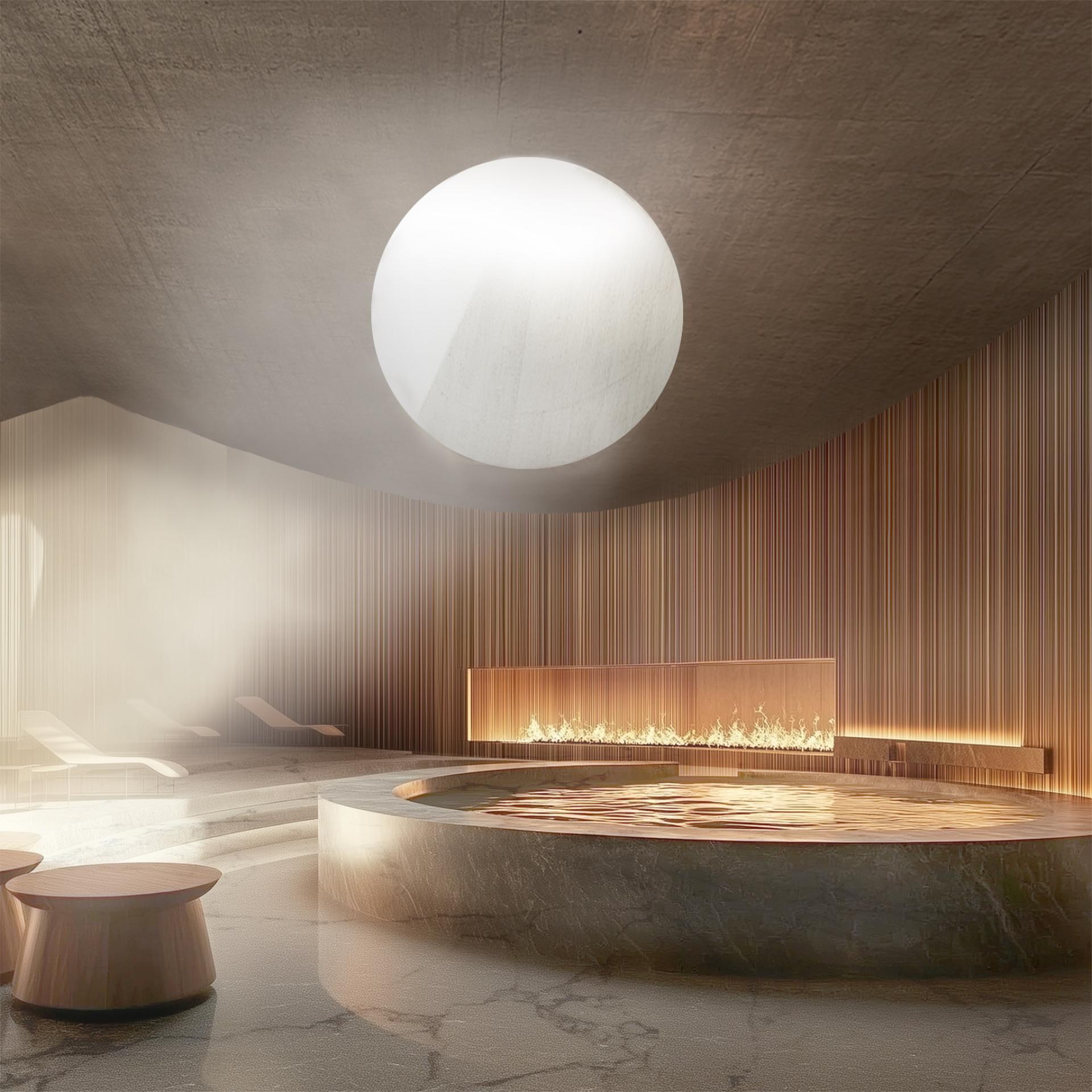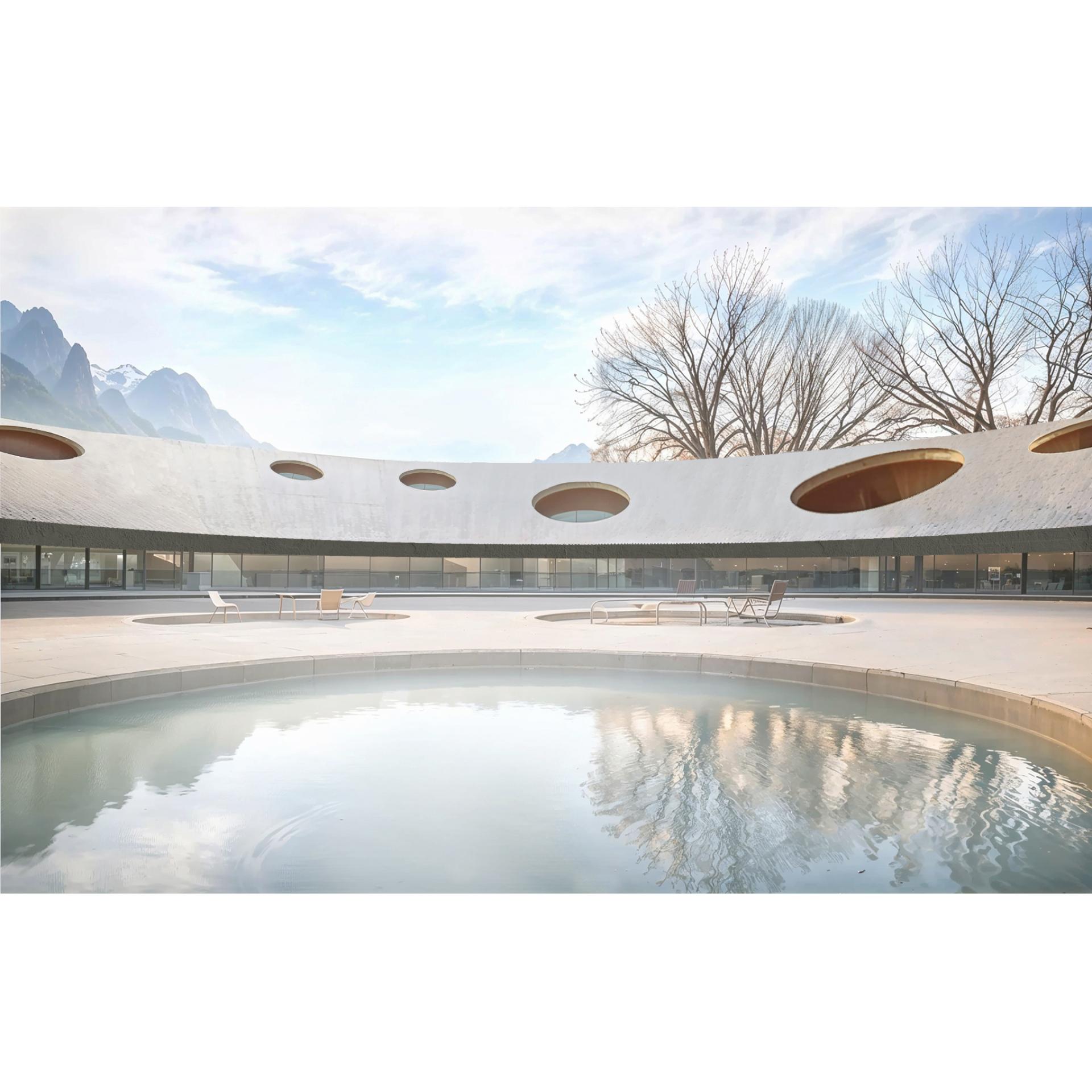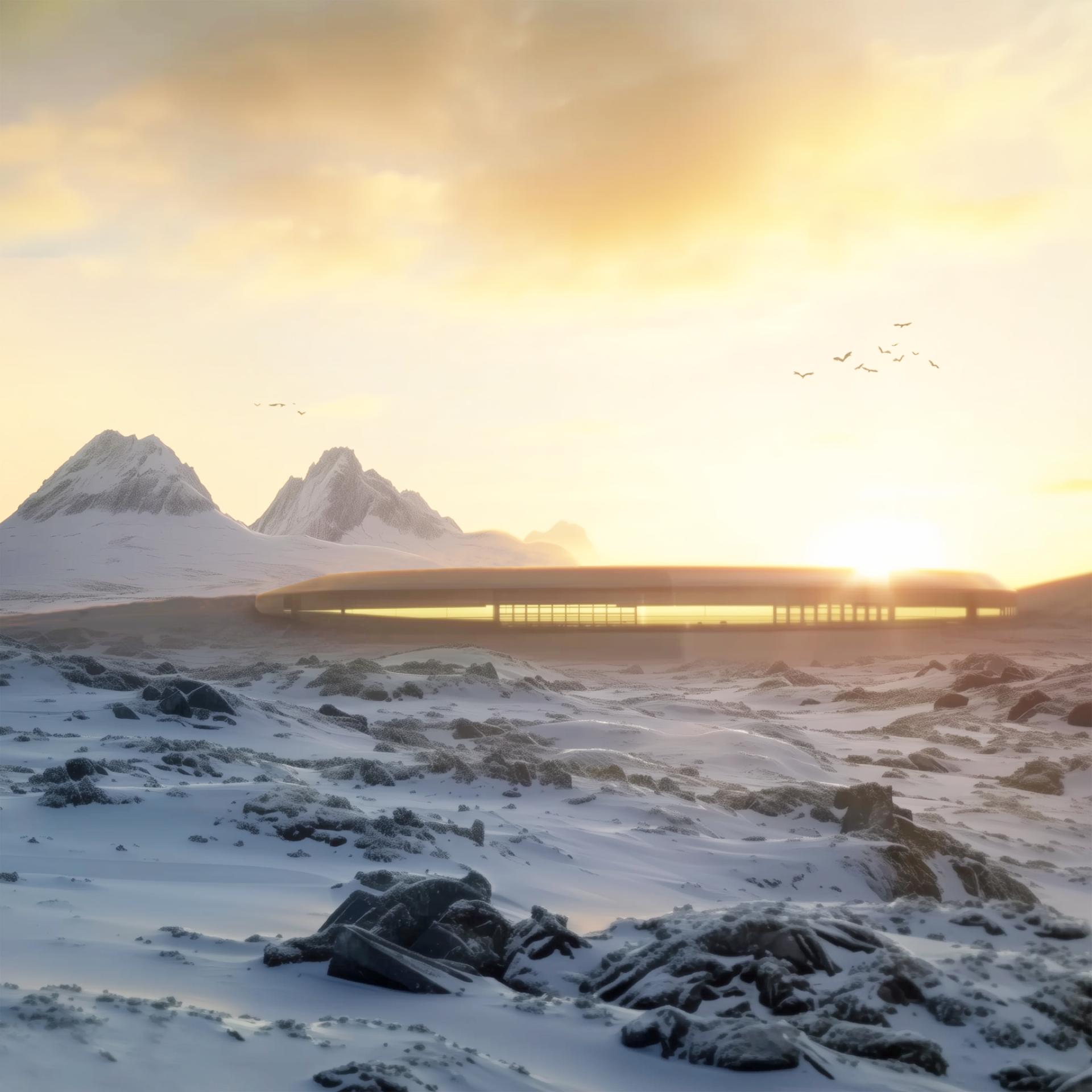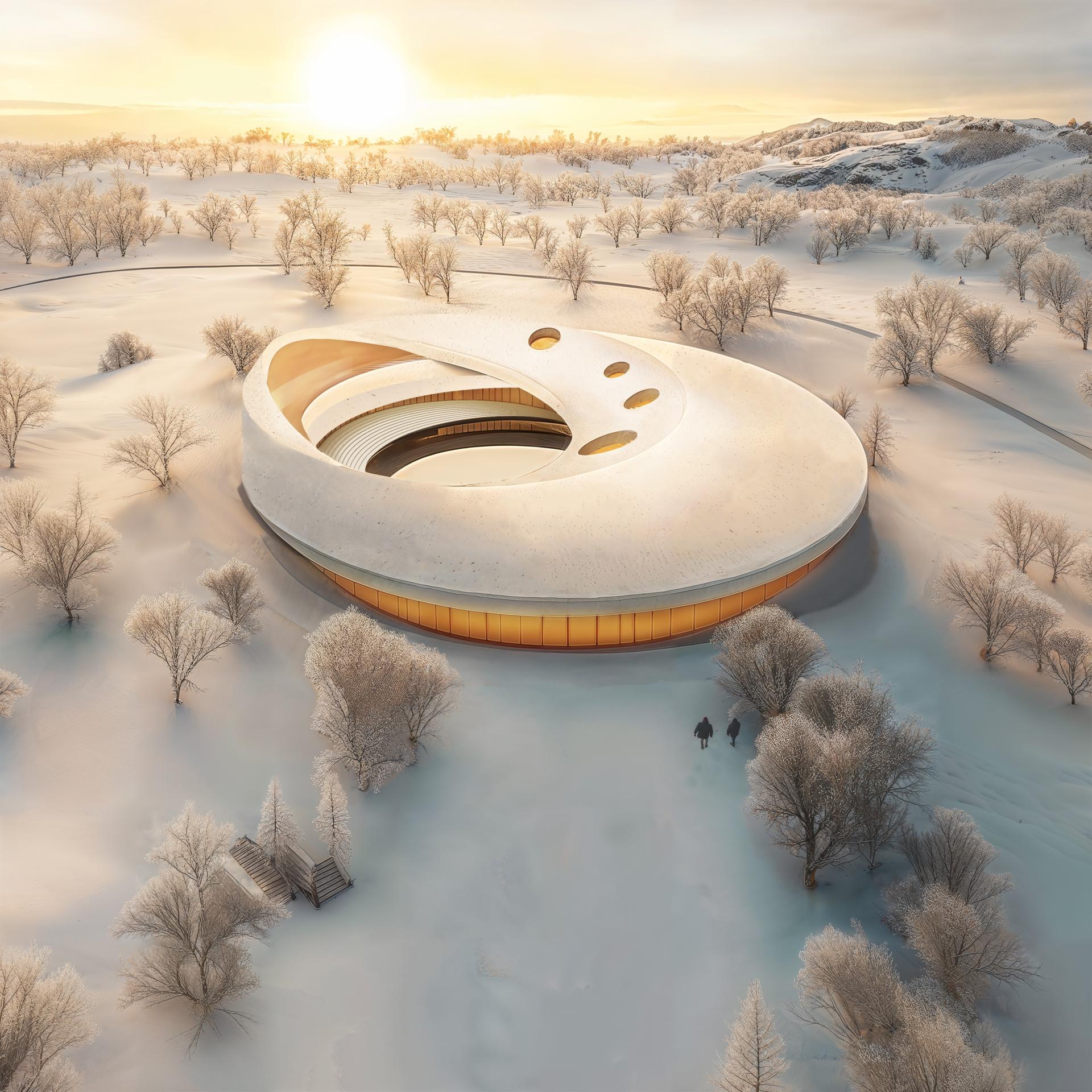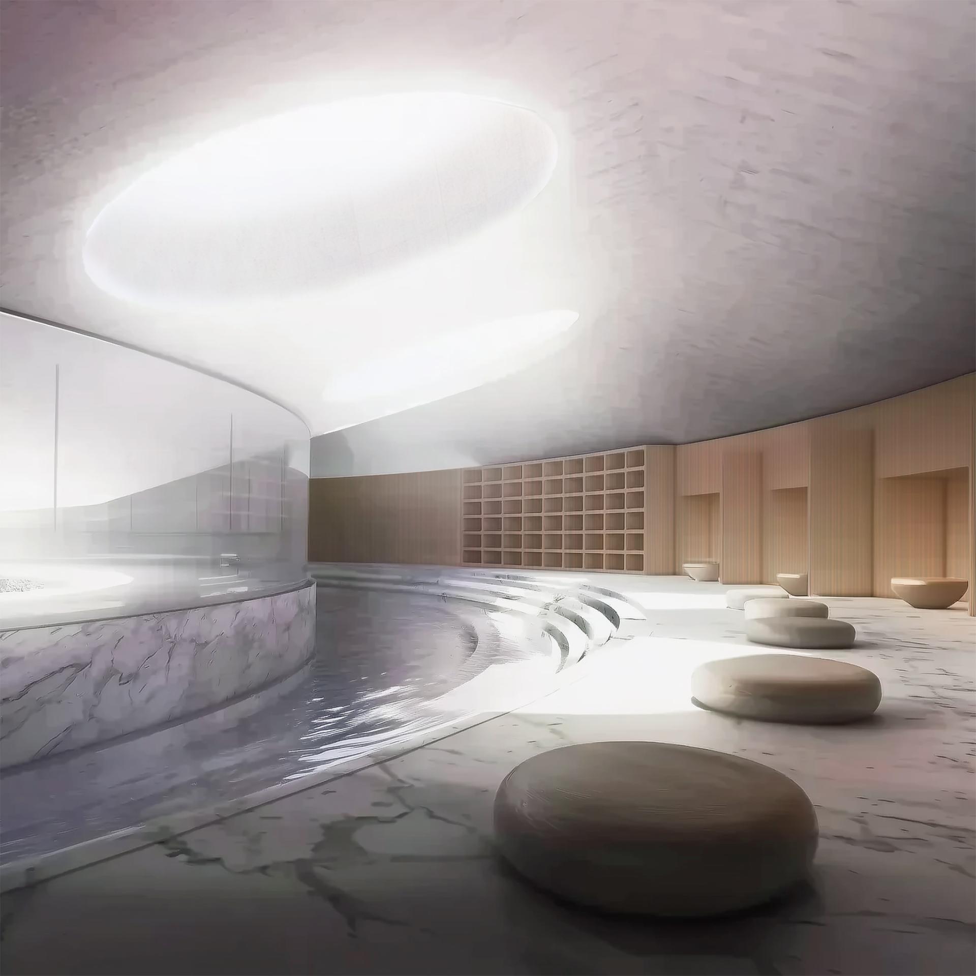 The Arctic Bathhouse is an eco-friendly spa, bathhouse, and guest retreat set in Bergen's mineral-rich countryside. Inspired by the aurora in the Arctic sky, the design filters the external world into an inner sanctuary through a fluid, flowing form. Following a simple circular geometry, the spaces transition from open and communal to increasingly private, creating an intimate and human-scaled experience. The project embraces the concepts of fluidity and flow, allowing water to move continuously throughout the bathhouse. The circulation path follows this natural movement, shaping the building into a circular form. Its simple geometry creates an inner sanctuary, filtering the outside world into a tranquil retreat. Emerging seamlessly from the landscape, the structure features skylights that open up to the sky, offering direct views of the aurora. At the heart of the design, a central courtyard holds a more static water feature, establishing a serene connection between the exterior and interior spaces.