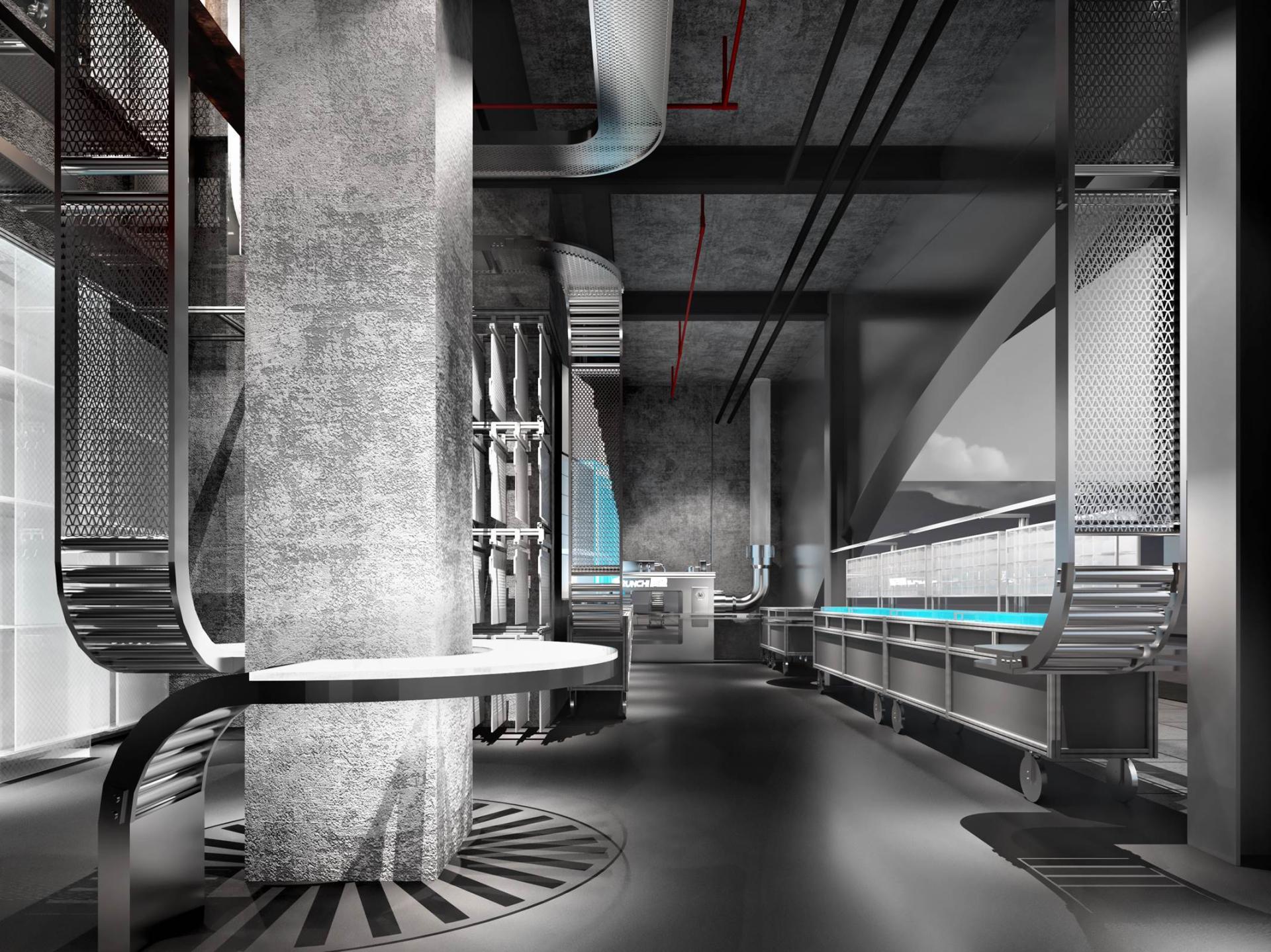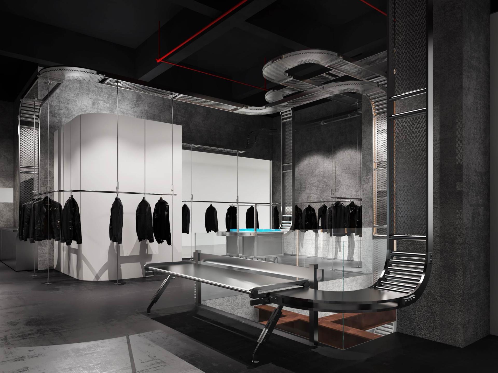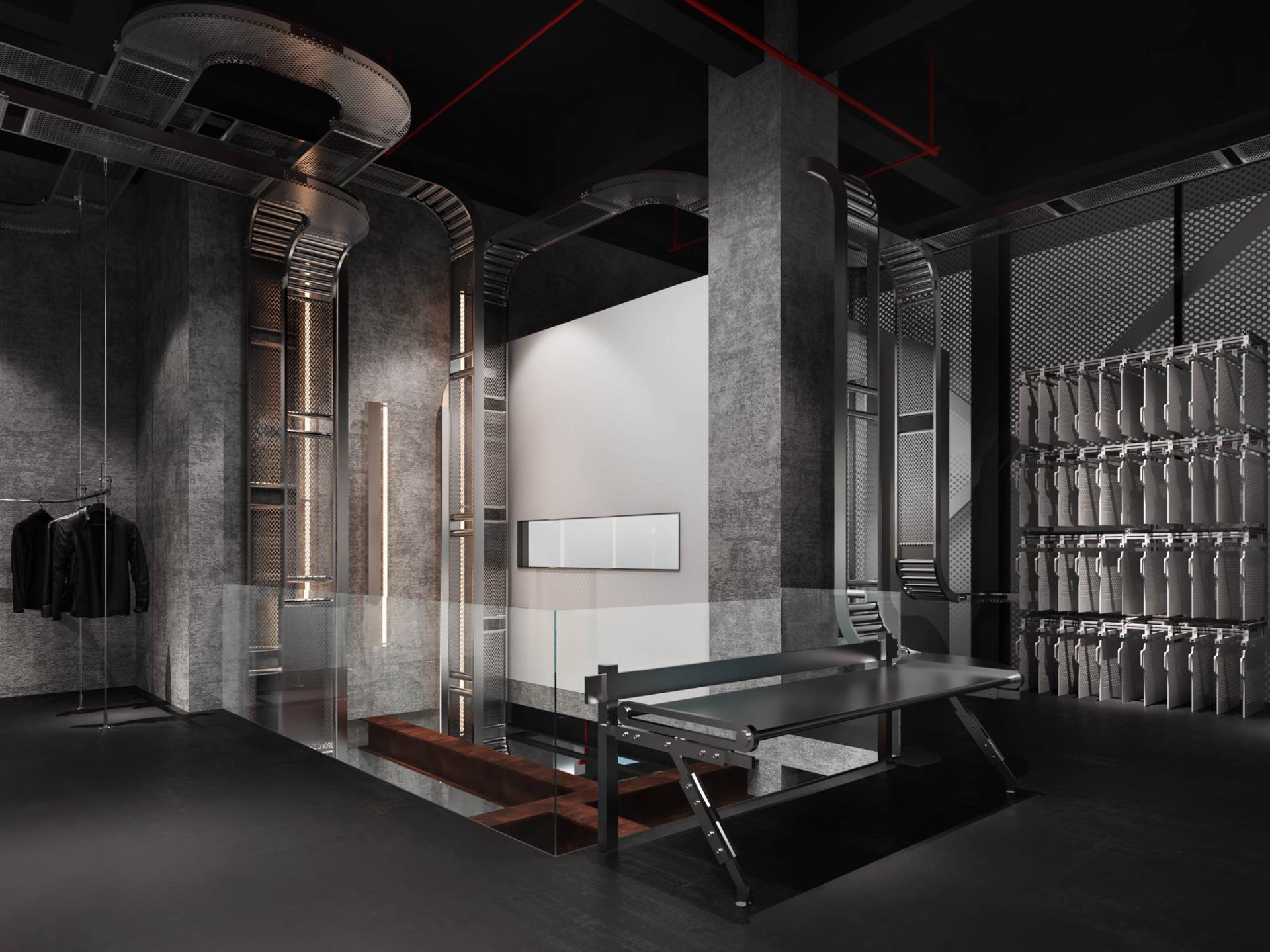 Architecturally, the space employs raw concrete as its foundational material, creating a canvas of industrial authenticity. A striking metal conveyor belt, strategically spanning both levels, serves as both a physical and visual connector, seamlessly integrating various product zones while injecting a sense of kinetic energy. This innovative design element not only establishes a cohesive industrial aesthetic but also subtly guides visitors through the space, enhancing the overall journey.