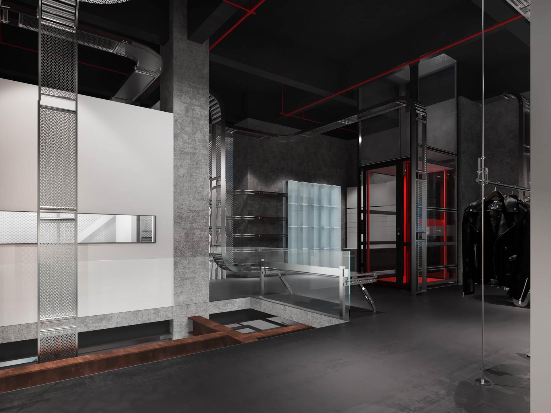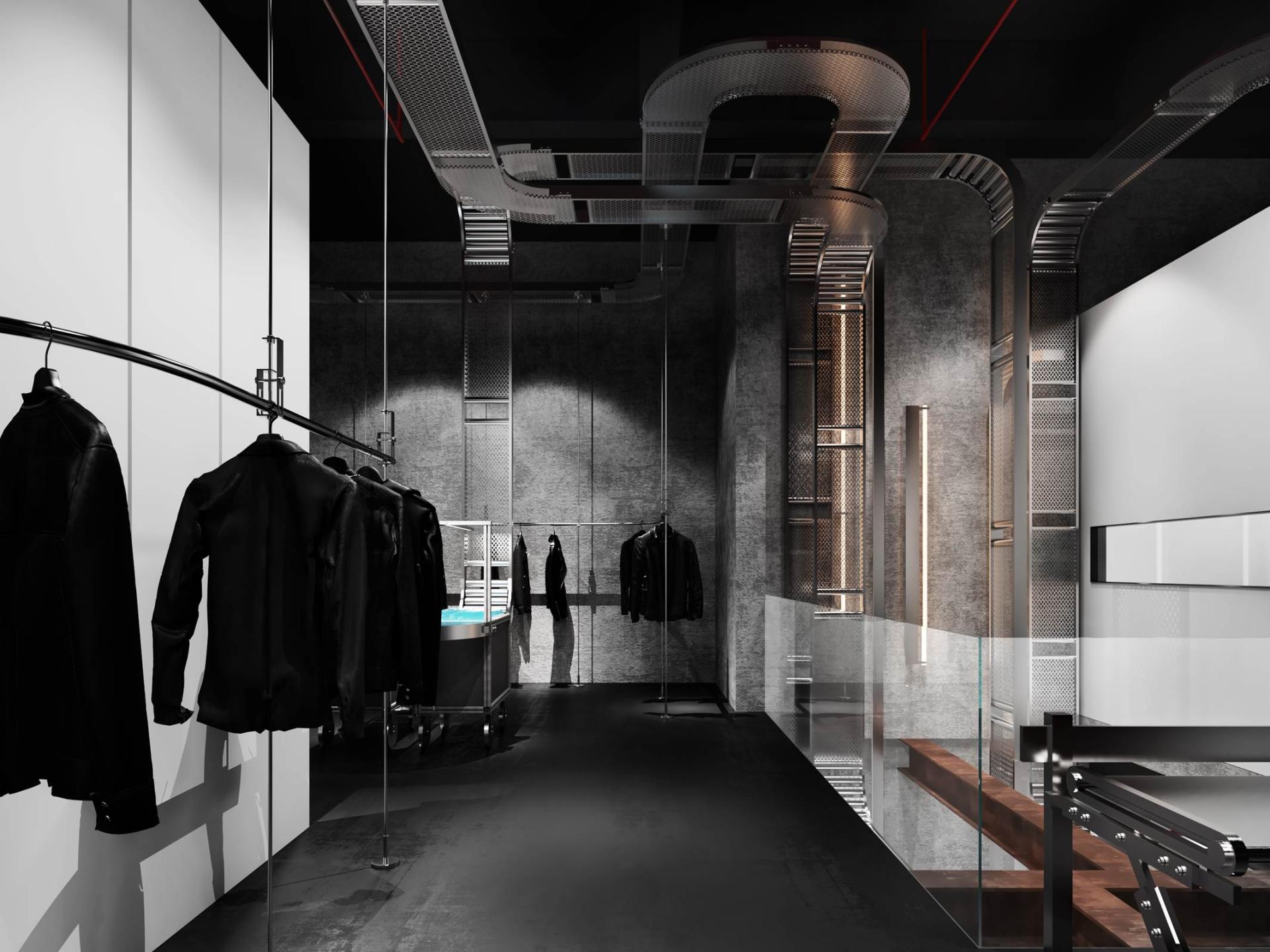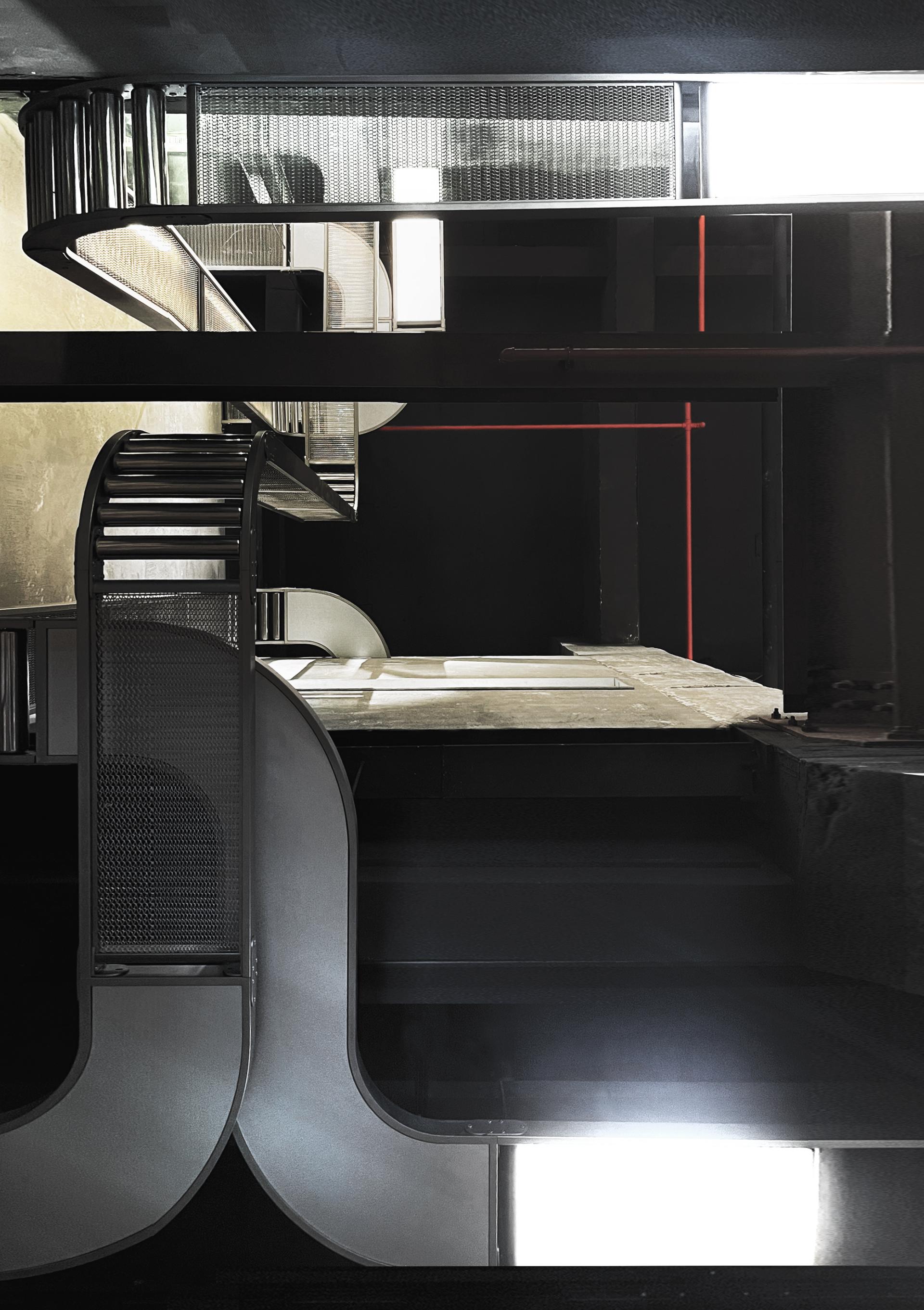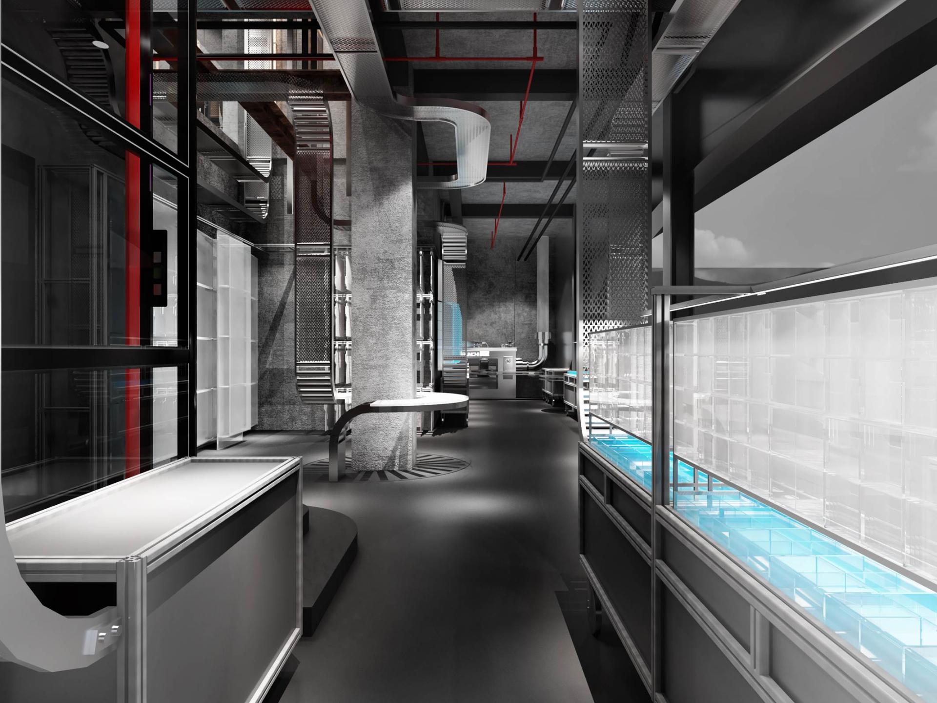 Architecturally, the space employs raw concrete as its foundational material, creating a canvas of industrial authenticity. A striking metal conveyor belt, strategically spanning both levels, serves as both a physical and visual connector, seamlessly integrating various product zones while injecting a sense of kinetic energy. This innovative design element not only establishes a cohesive industrial aesthetic but also subtly guides visitors through the space, enhancing the overall journey.