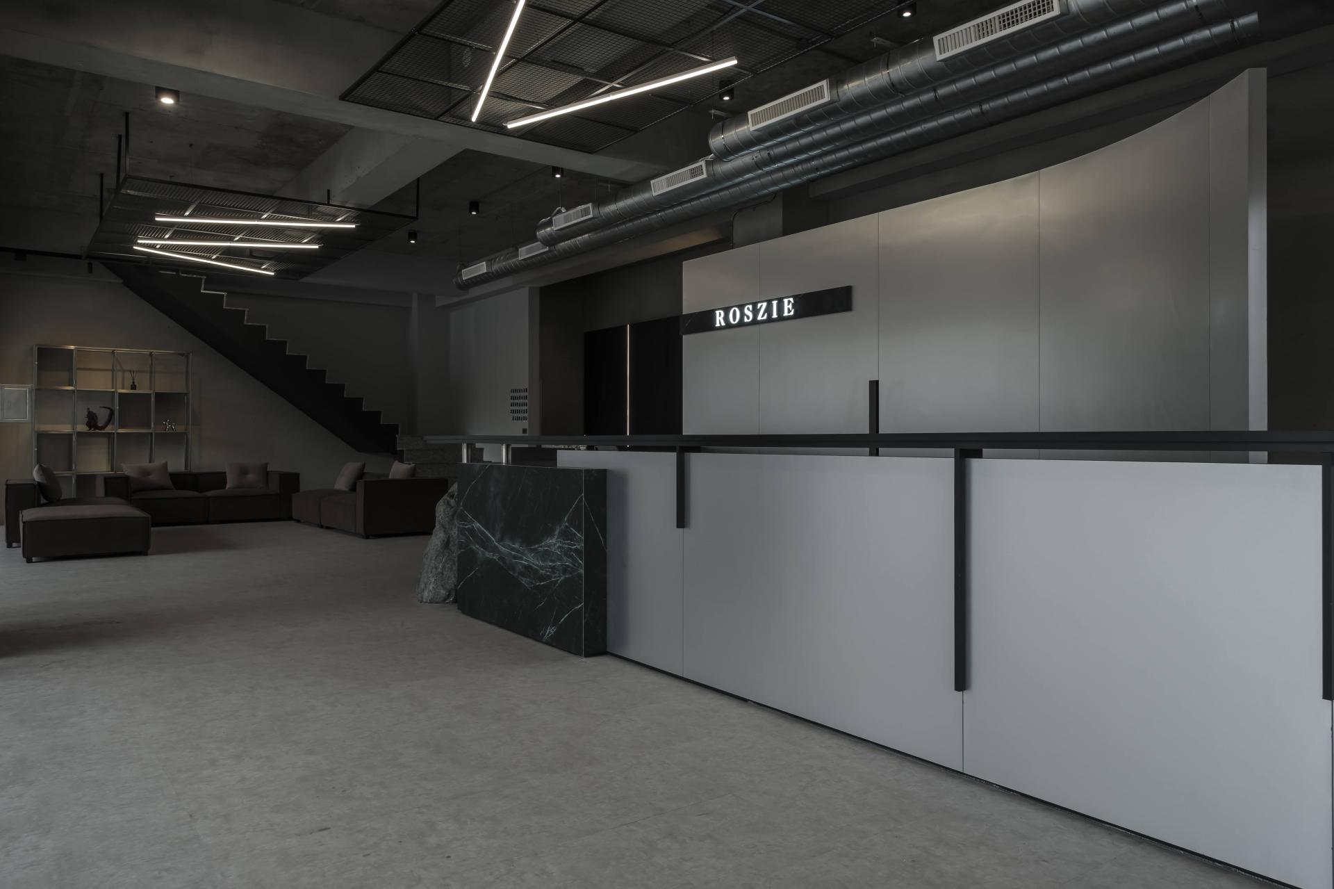 A metal grid ceiling paired with the intersecting profiles of staircases creates a spatial vocabulary defined by contrasting rigidity and softness. A floating staircase and open partitions extend the visual boundaries, rendering the area both understated and full of tension.