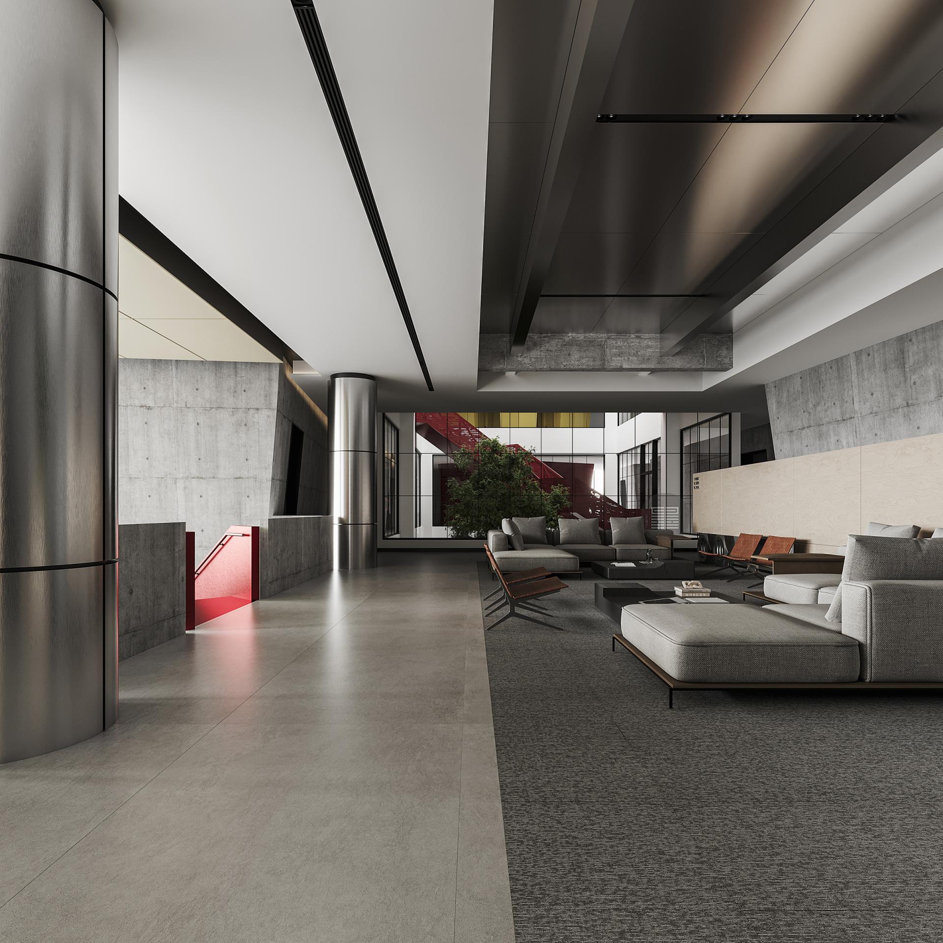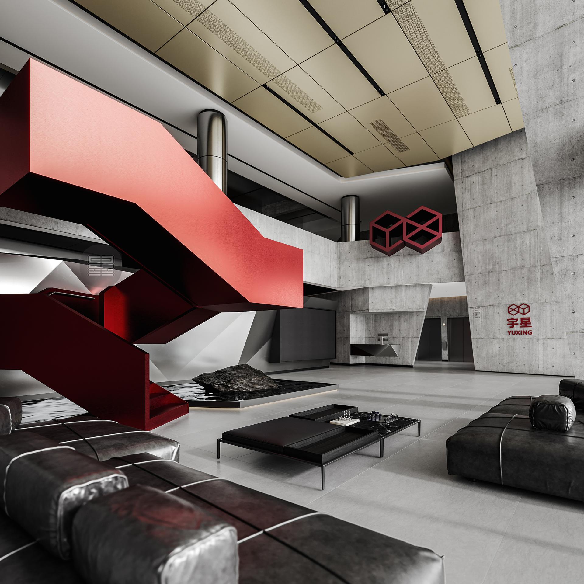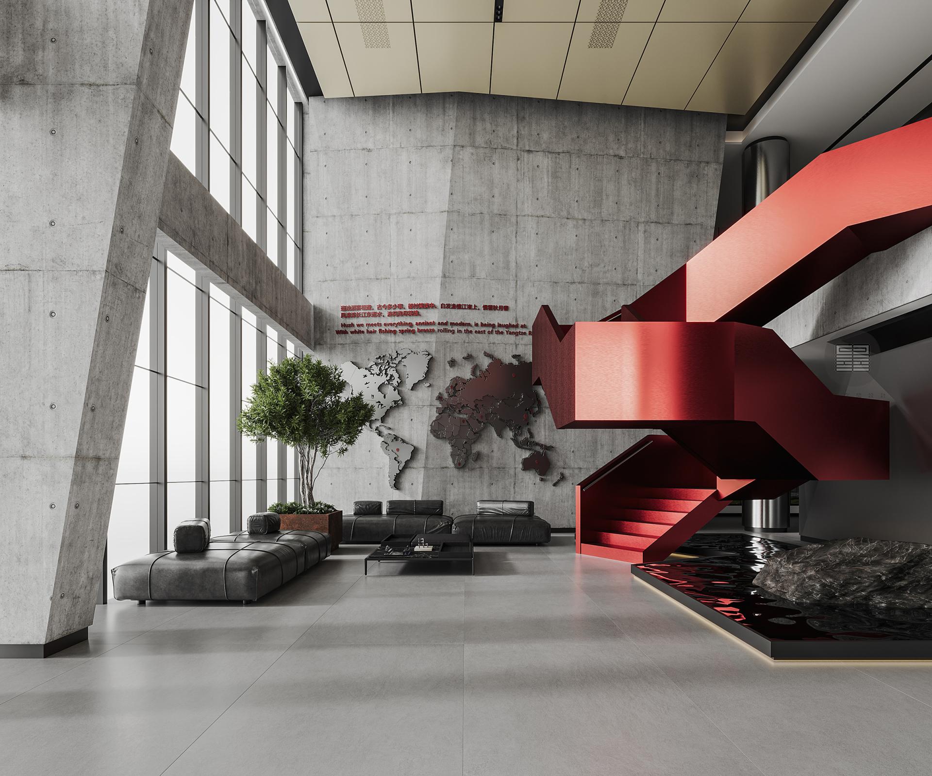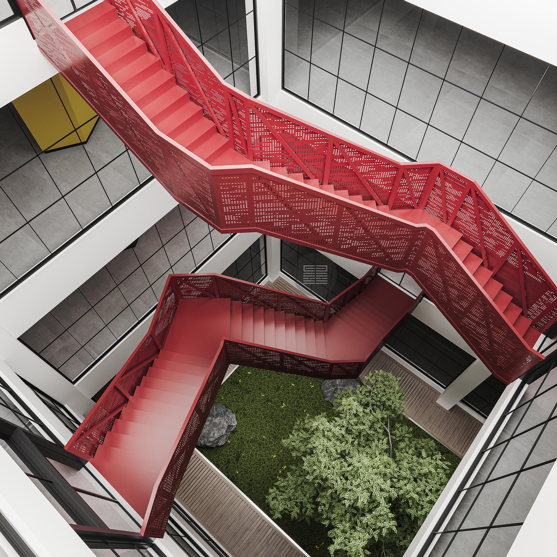 The project reconfigures the interior of the building to increase the flexibility of flow. It is more open and dynamic than the original. The design of the office building takes into account the company's specific work processes and organizational structure, so that the office building is flexible enough to meet the needs of the company at every stage of its development. Each office cubicle and the open working environment of the building are harmonized with each other to create synergies between the various departments. The office building adopts structural design, horizontal lines and irregular stairs highlight the open and transparent building characteristics. The company's products as the theme of the wall as a window scene, strengthen the image of the company at the same time, the landscape and interior space on the first floor. The design of the building is simple and generous. Through the clever layout, make each floor efficiently use as far as possible, and strive to arrange the office room while creating an open office landscape. The simple structure of the building and the atrium in the center of the building not only enhance the connection between floors, but also increase the contact between employees. The beauty of the architectural design of the office building is mainly reflected in the staggered space design of the red steel staircase, and the bright and open areas around the staircase are used in different floors as company directors, office and conference rooms on different floors. The top floor is available for the chairman. In order to meet the reception of visitors, office at the same time in the space layout planning office living and Buddhist niche room. Adopt the main tone of the wooden texture seat space that emphasizes the color system, and add the metal material ornament to make the space more stable. The roof terrace space is decorated with rich water features and plants, and the roof is equipped with an automatic solar curtain presenting a kind of natural and artificial coupling of poetry.