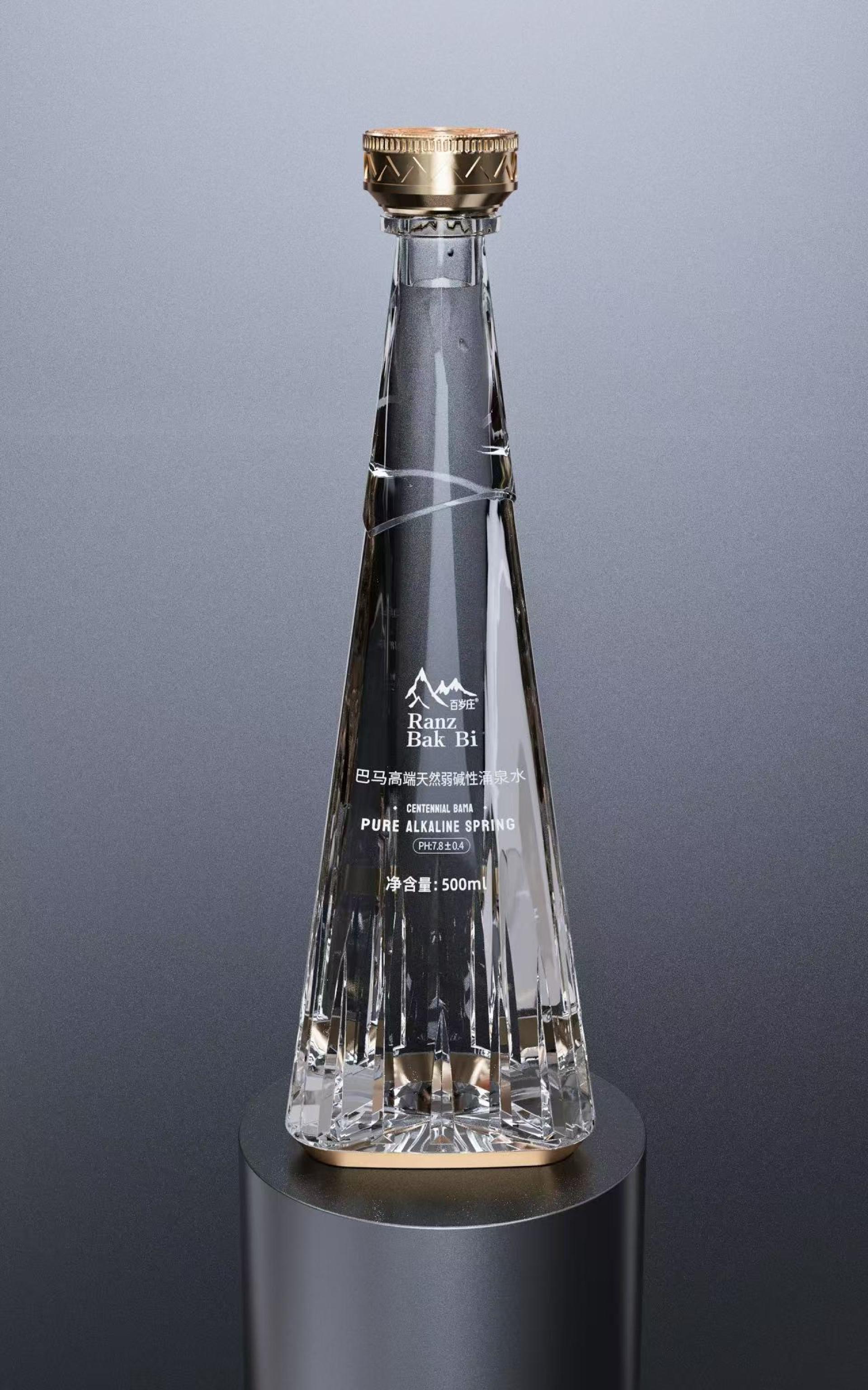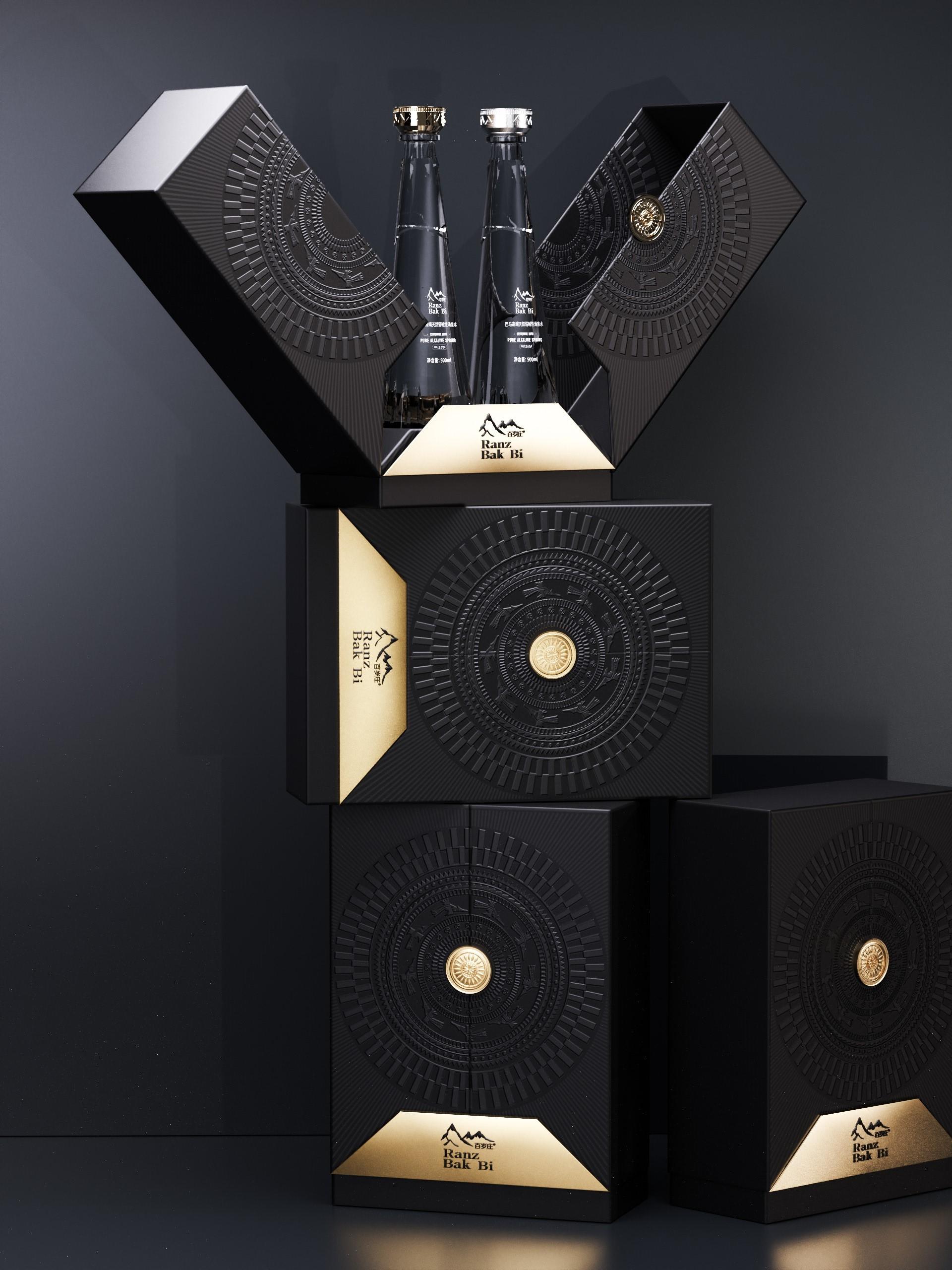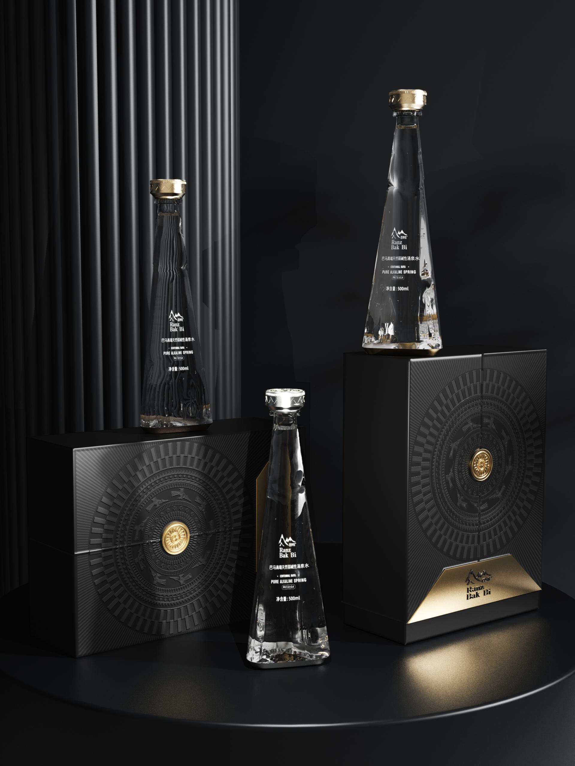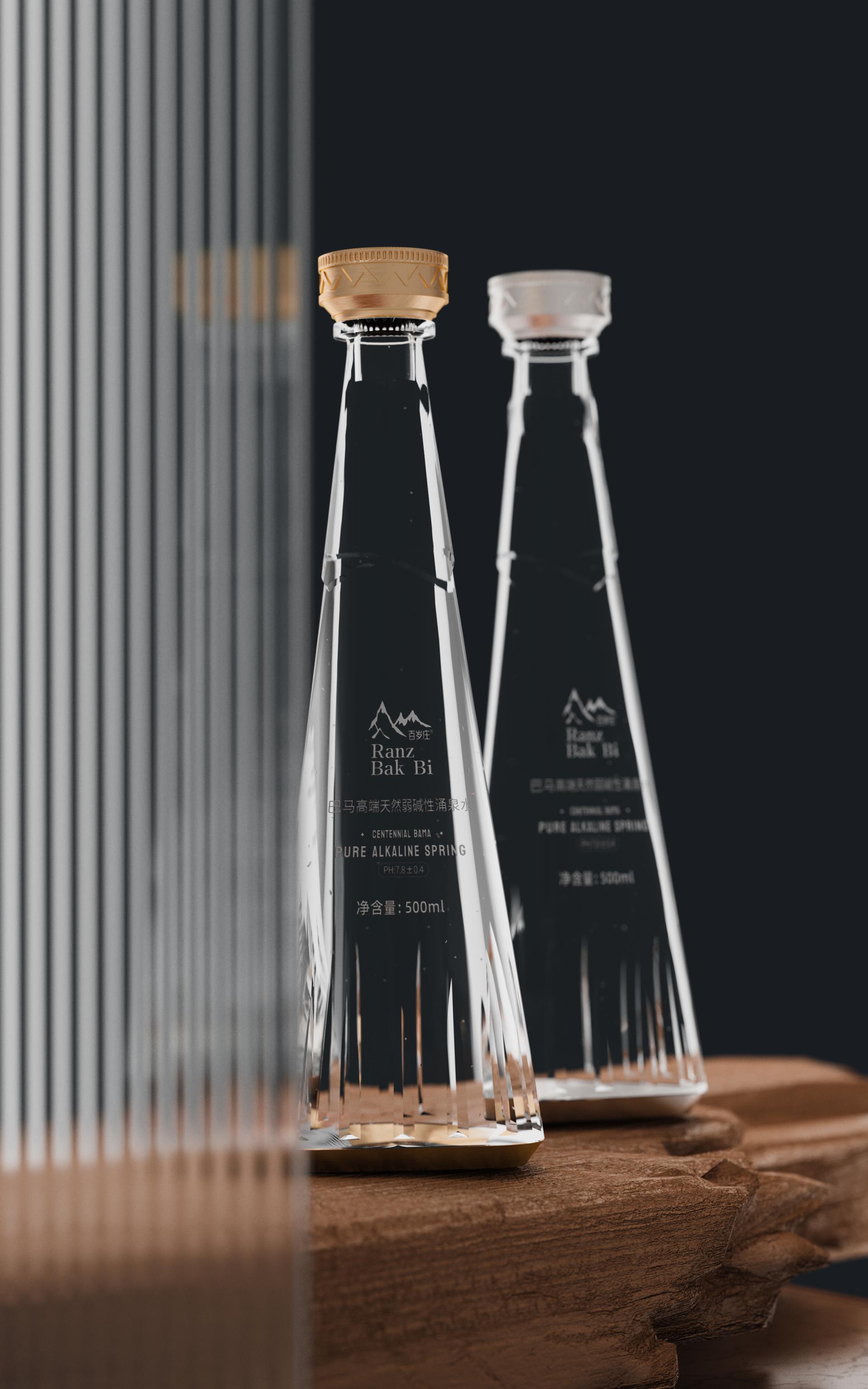 Ranz Bak Bi is a premium natural spring water sourced from Bama, a region renowned for longevity. The packagingintegrates cultural and natural elements, including the Zhuang ethnic bronze drum, sunlight, tree rings, and waterpatterns, emphasizing its origin. A refined color palette of gold, silver, charcoal, and white highlights its premiumpositioning. The packaging design balances tradition and modern aesthetics, with engraved patterns and structured labelsensuring clarity. The bottle and gift box enhance the product's presentation, making it suitable for high-end dinning andgifting.