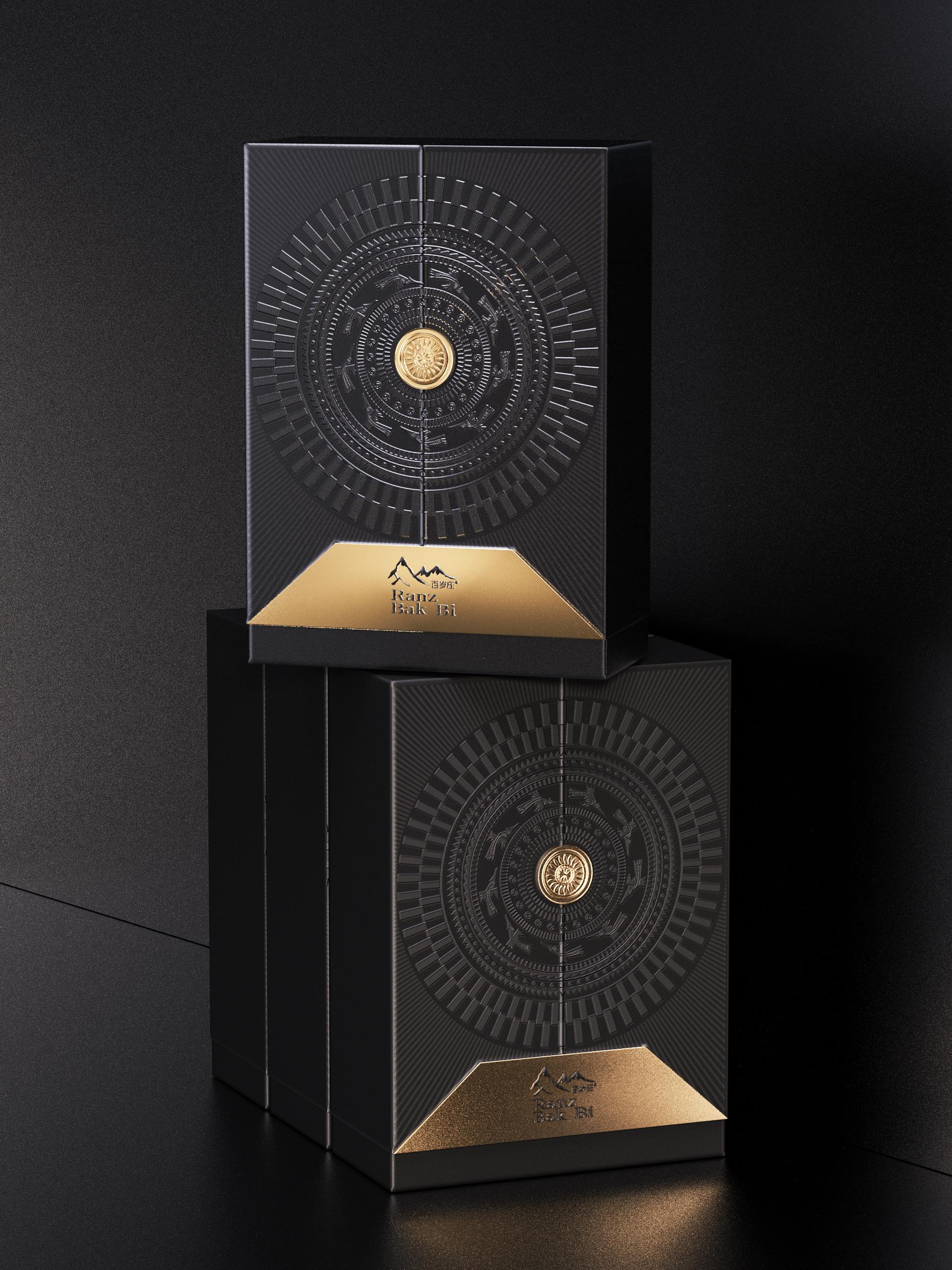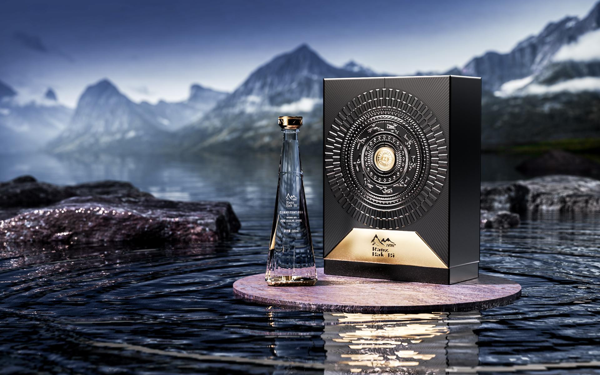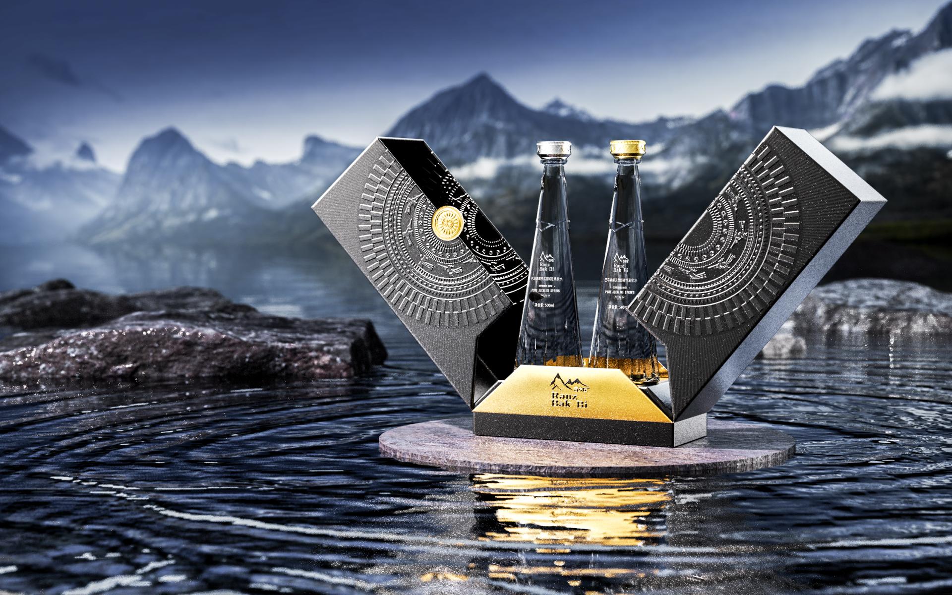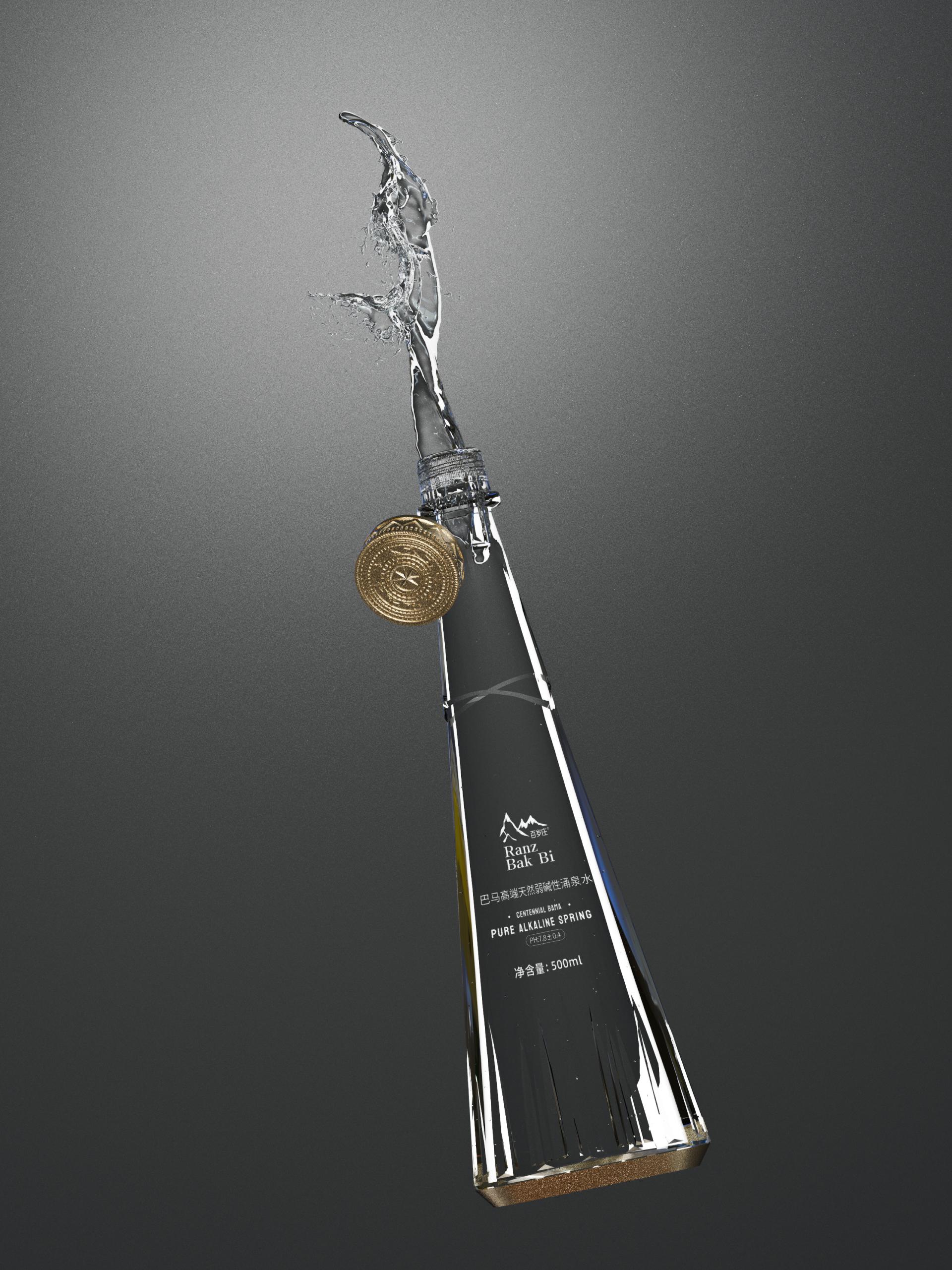 Ranz Bak Bi is a premium natural spring water sourced from Bama, a region renowned for longevity. The packagingintegrates cultural and natural elements, including the Zhuang ethnic bronze drum, sunlight, tree rings, and waterpatterns, emphasizing its origin. A refined color palette of gold, silver, charcoal, and white highlights its premiumpositioning. The packaging design balances tradition and modern aesthetics, with engraved patterns and structured labelsensuring clarity. The bottle and gift box enhance the product's presentation, making it suitable for high-end dinning andgifting.