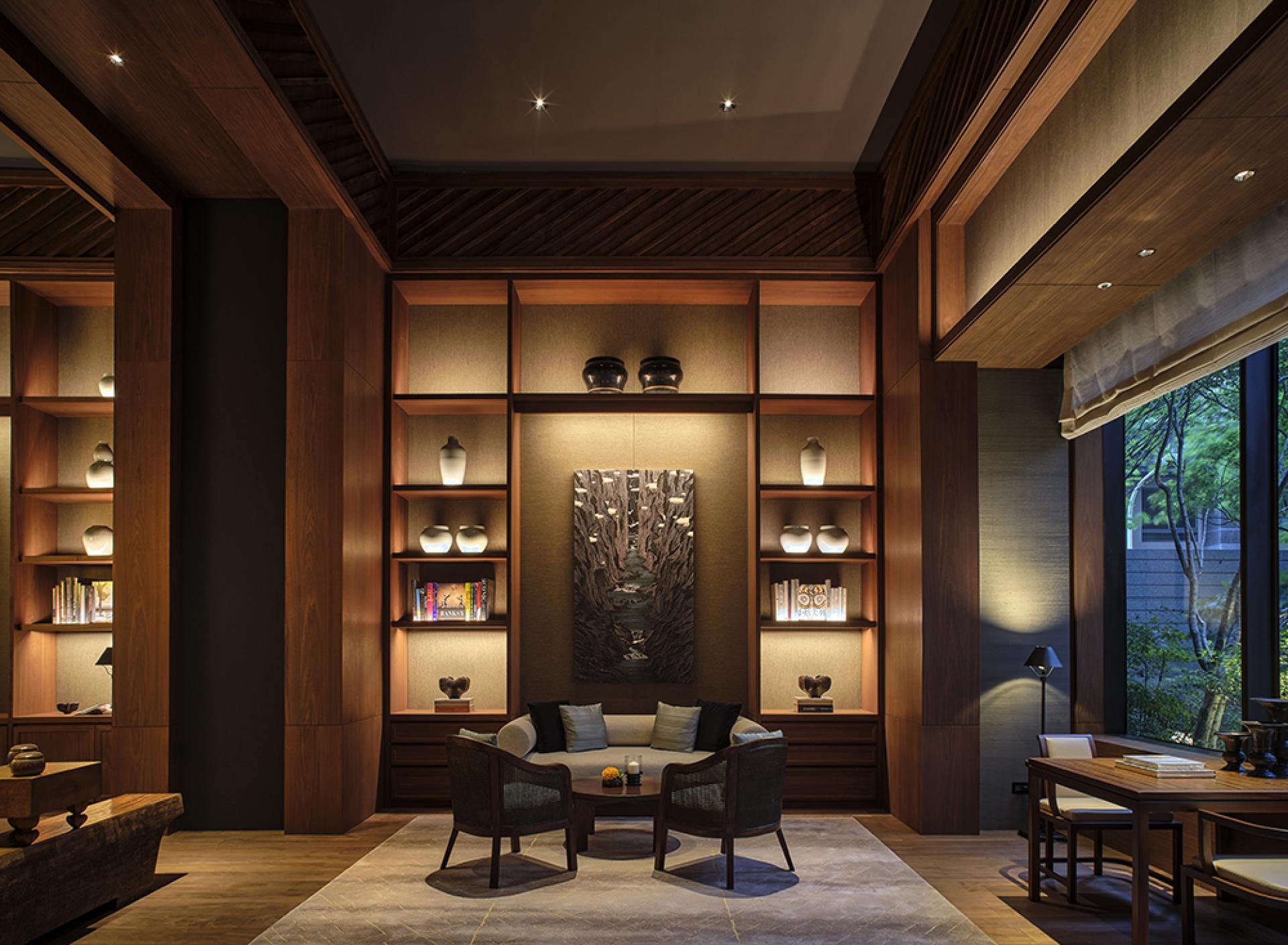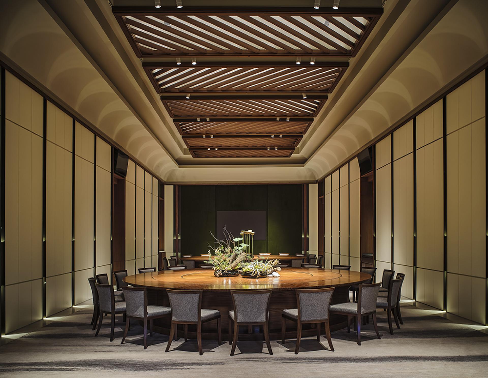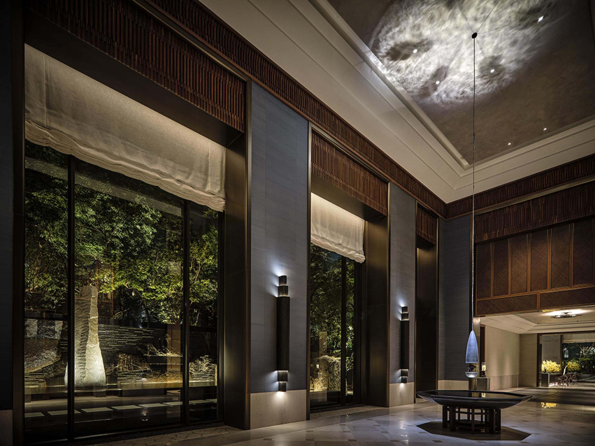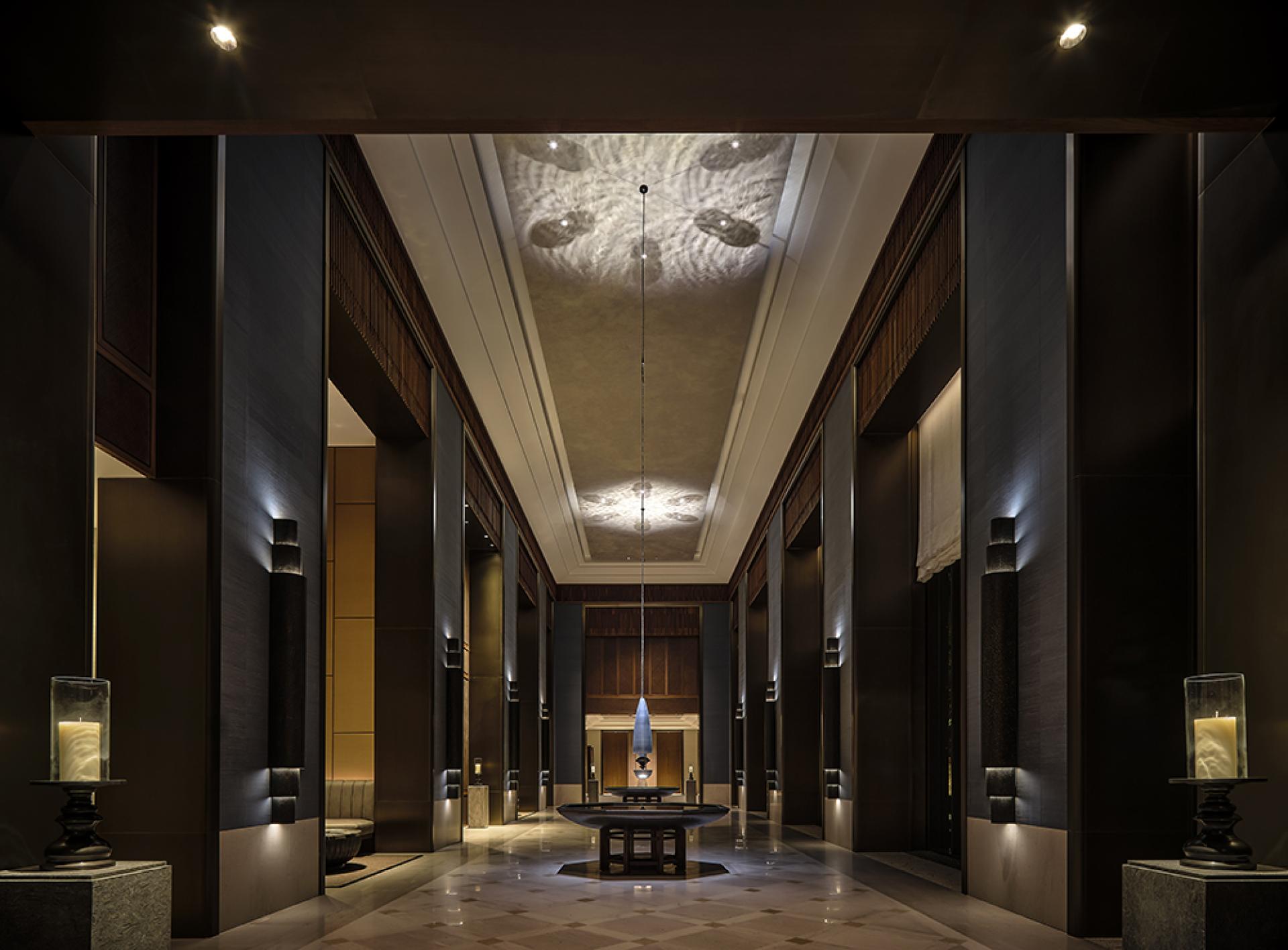 The 7.5-meter-high lobby is the culmination of the journey. Two bespoke sound installations are at the heart of this building. The sound waves from the hanging objects cause the water disc to vibrate. Then the recessed spotlight fixtures above create rippled reflections on the ceiling. The cold white spotlights (5000K) are applied to simulate daylight during the daytime, and make the installations distinct from the warm lighting environment at night. The interactive process between people in the room, the sound, water and light effect transforms this lobby into a tranquil place for contemplation and reflection.